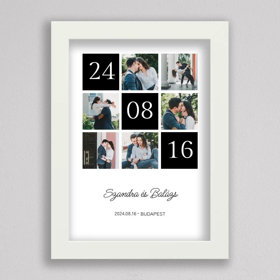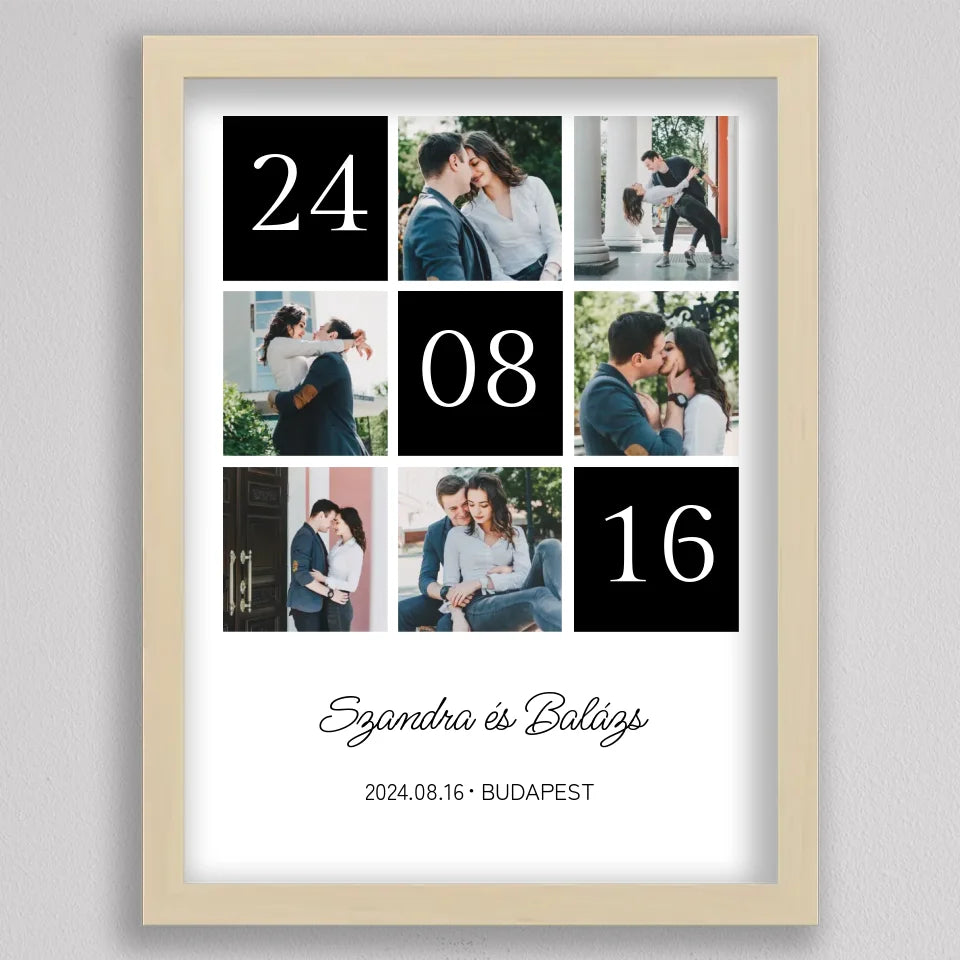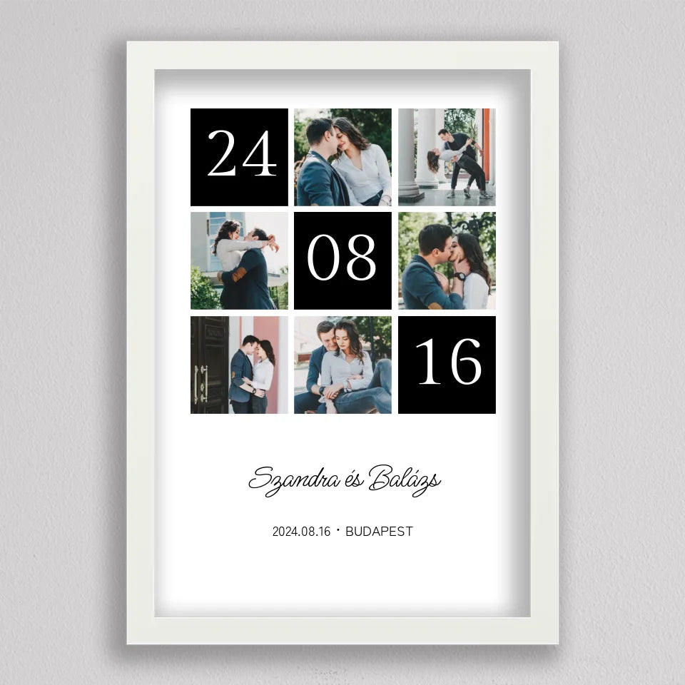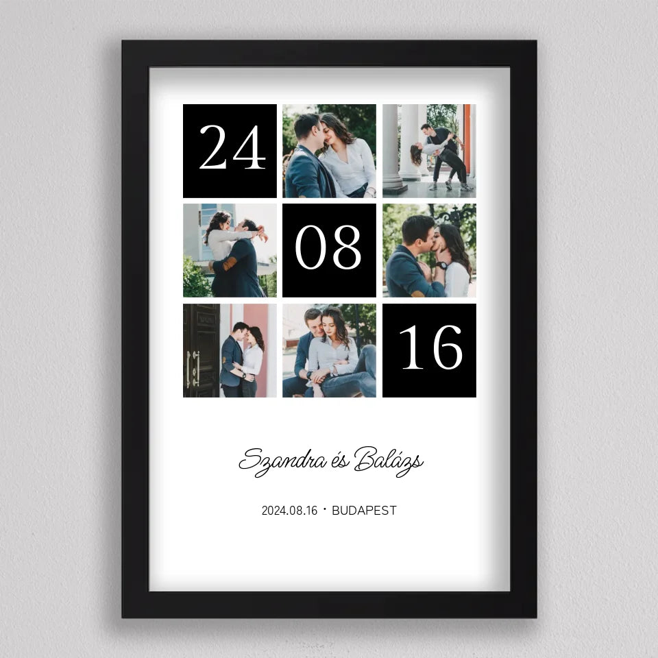 A Különleges Dátum Évforduló fotó kollázs  egyedülálló módon ünnepli meg azokat a fontos dátumokat és emlékeket, amelyek meghatározóak a kapcsolatotokban. Ez a fotó kollázs hat kedvenc képeteket öleli fel, amelyek tökéletesen illusztrálják közös utazásotokat. Az elrendezés különlegessége, hogy a dátum számai látványosan kiemelkednek a képek között, így az ajándék nemcsak esztétikus, hanem mély jelentéssel is bír. Az alján található nevetek és a fontos dátum elegánsan személyre szabható, így ez az ajándék igazi emlékezetes meglepetés lehet évfordulóra, eljegyzésre vagy akár esküvőre.