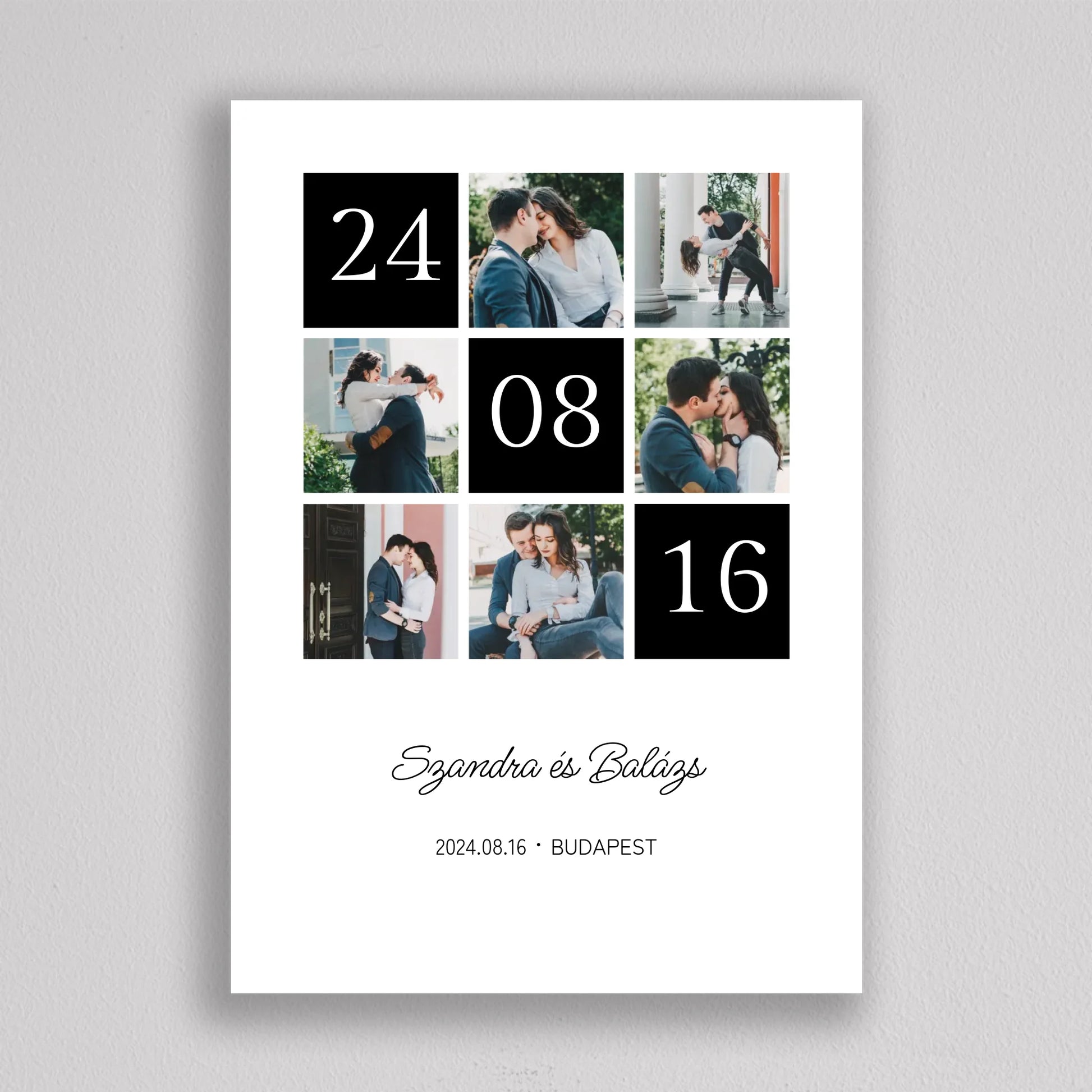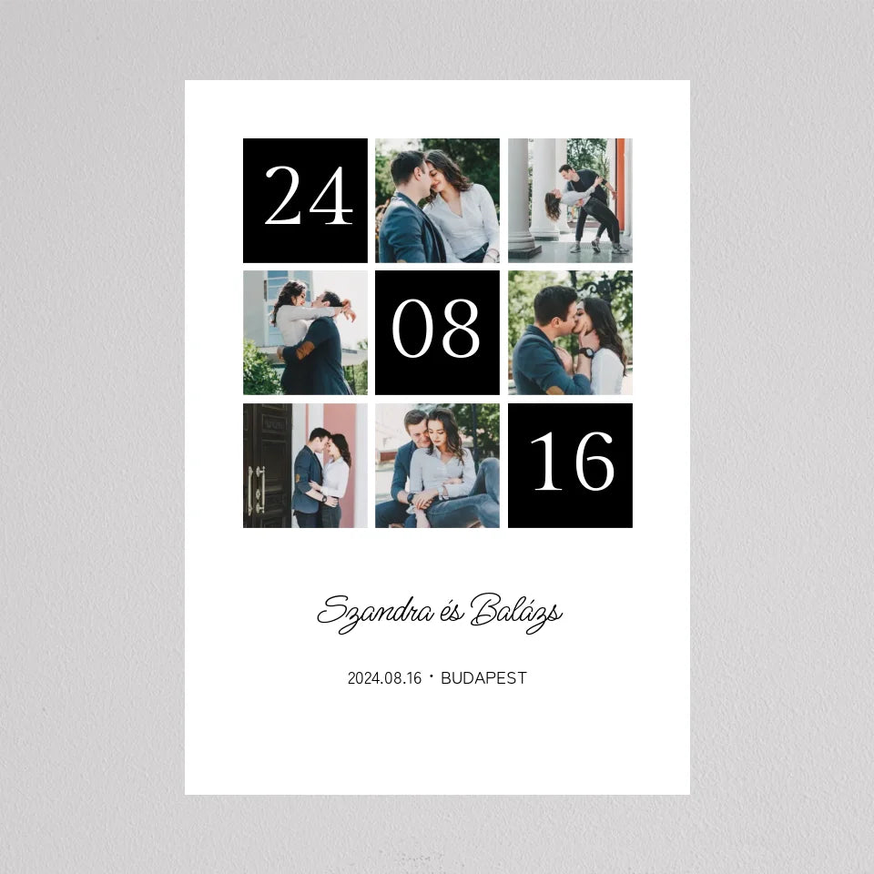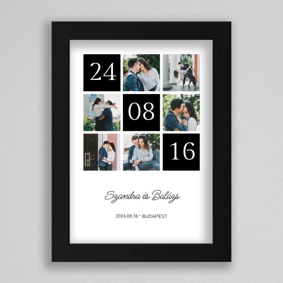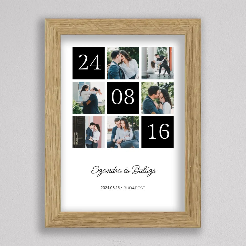 A Különleges Dátum Évforduló fotó kollázs  egyedülálló módon ünnepli meg azokat a fontos dátumokat és emlékeket, amelyek meghatározóak a kapcsolatotokban. Ez a fotó kollázs hat kedvenc képeteket öleli fel, amelyek tökéletesen illusztrálják közös utazásotokat. Az elrendezés különlegessége, hogy a dátum számai látványosan kiemelkednek a képek között, így az ajándék nemcsak esztétikus, hanem mély jelentéssel is bír. Az alján található nevetek és a fontos dátum elegánsan személyre szabható, így ez az ajándék igazi emlékezetes meglepetés lehet évfordulóra, eljegyzésre vagy akár esküvőre.