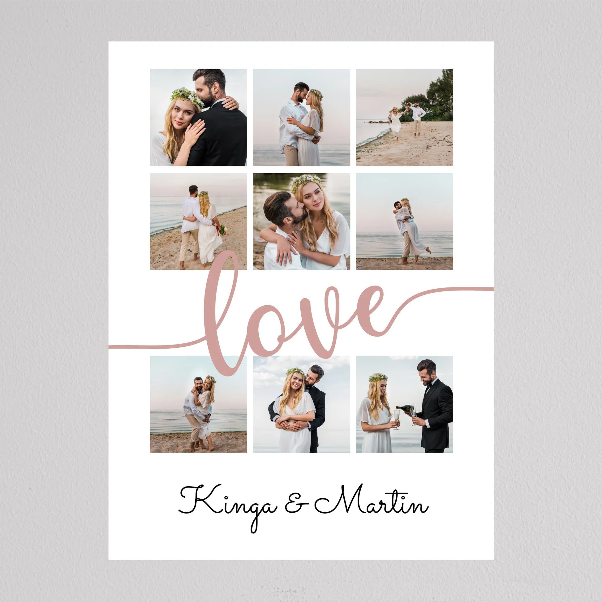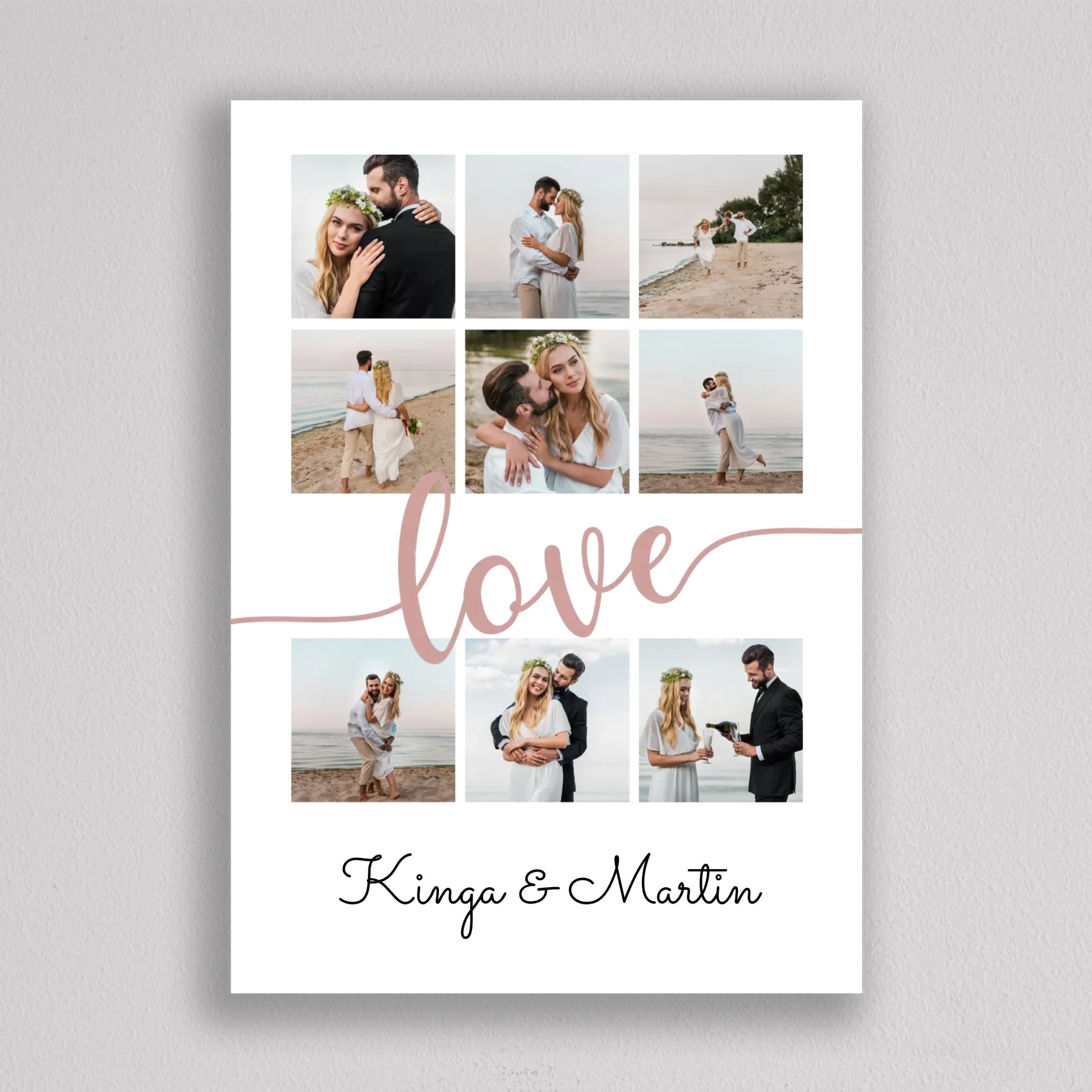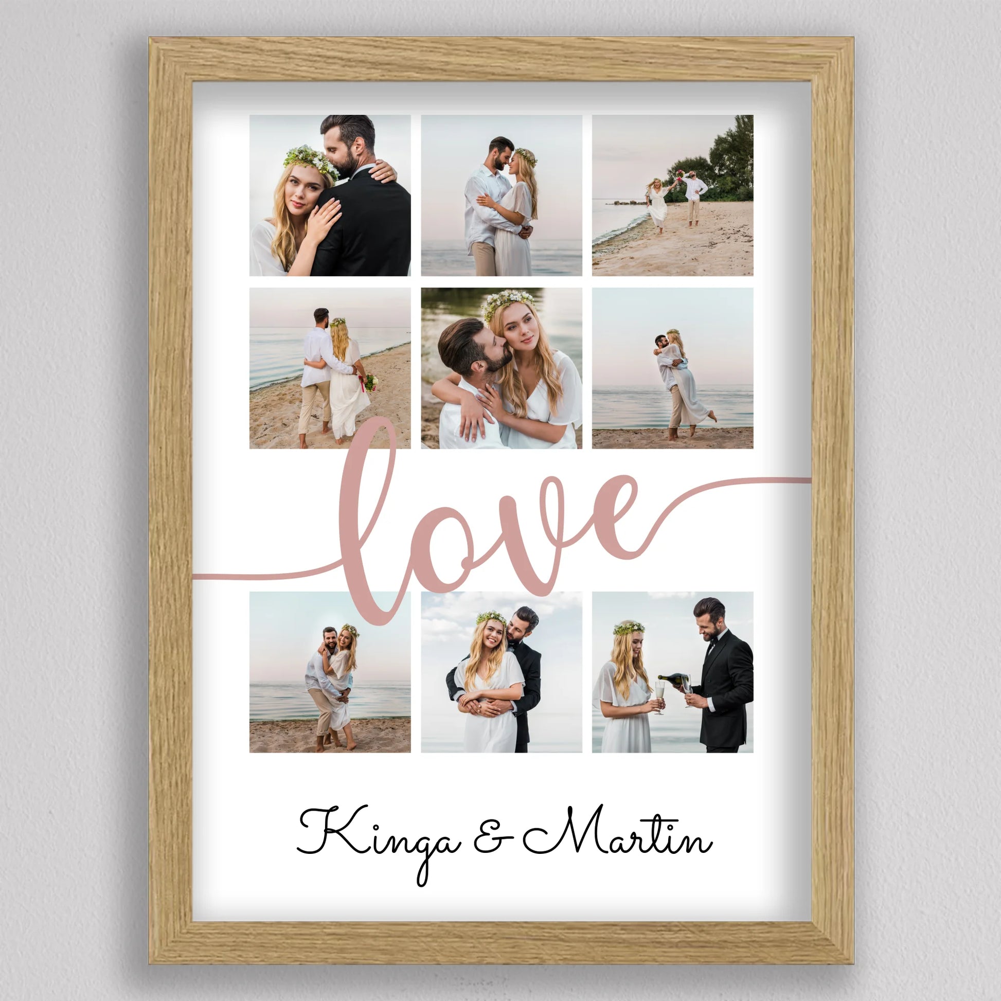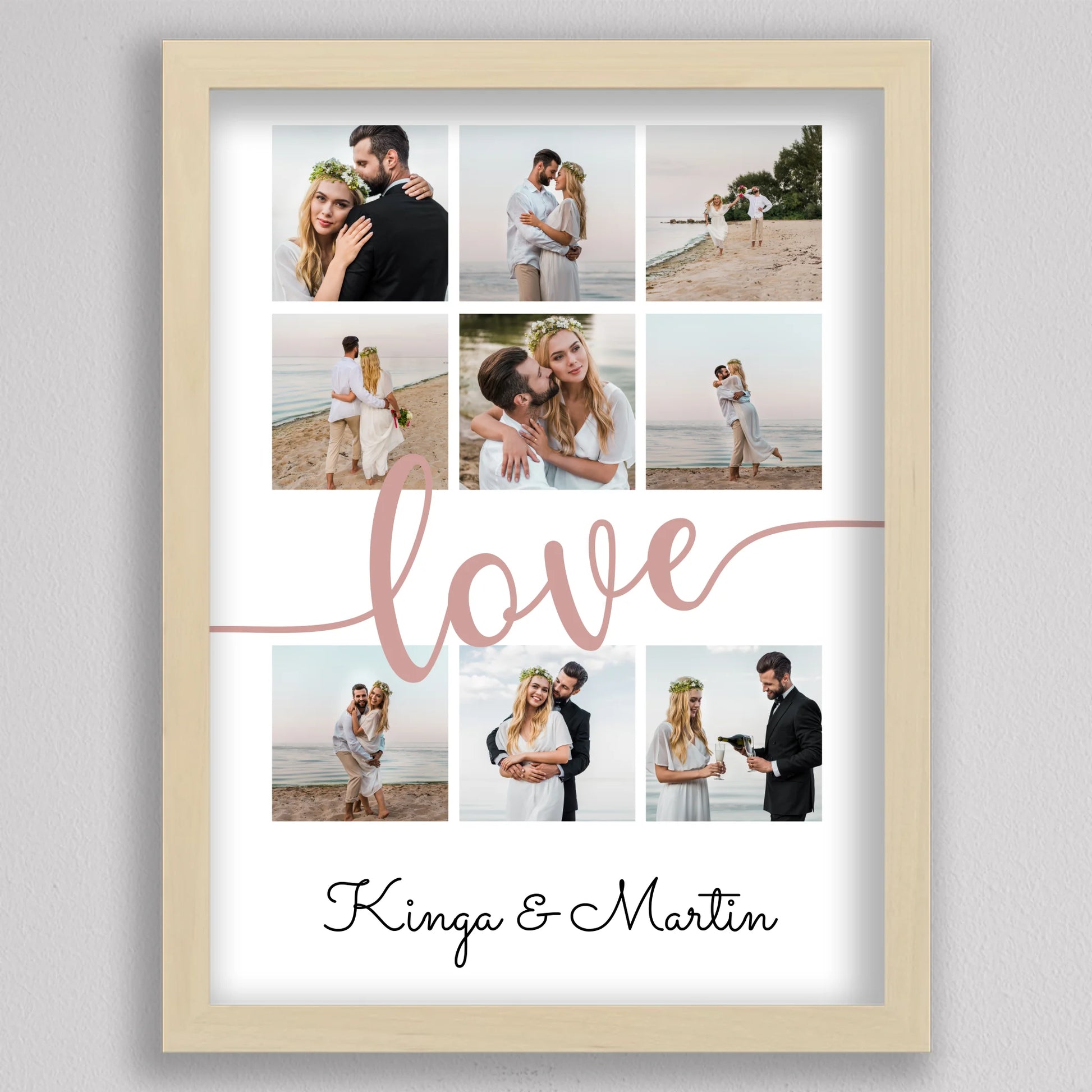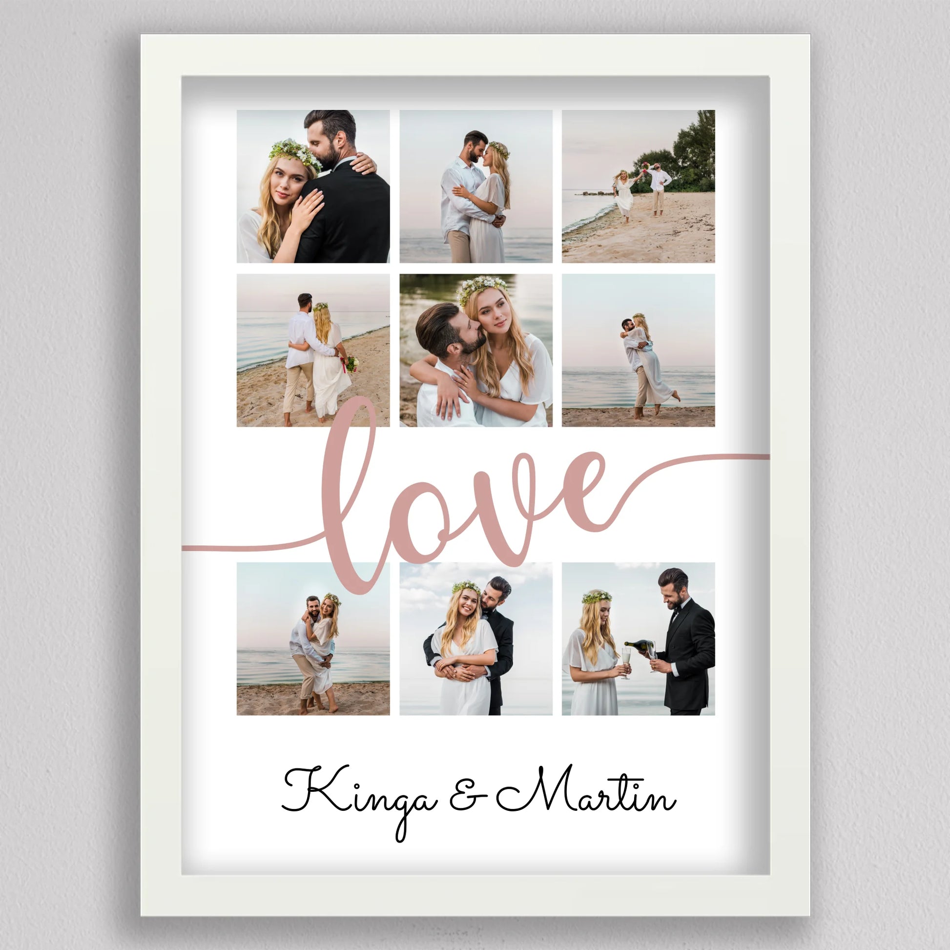 A Szerelmünk Pillanatai Fotó kollázs egy gyönyörű és személyre szabható dekoráció, amely tökéletesen megörökíti a legszebb közös pillanatokat. Ez a kollázs több fotót tartalmaz, egy elegáns „love” felirat köré rendezve, amely szimbolizálja az összetartozást és a szeretetet. A fotó kollázs modern és letisztult stílusban készült, így tökéletes választás lehet évfordulókra, esküvőkre, vagy bármilyen különleges alkalomra. A termék teljesen egyedi és személyre szabható, lehetőséget biztosítva, hogy a saját képeitekkel és nevetekkel tegyétek különlegessé a dekorációt. Ez a kollázs tökéletes ajándék minden romantikus lélek számára, akik szeretnék megőrizni szerelmük legszebb pillanatait.