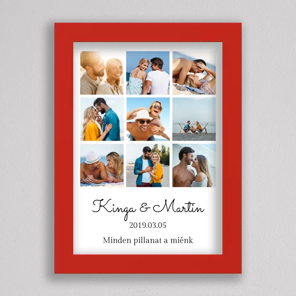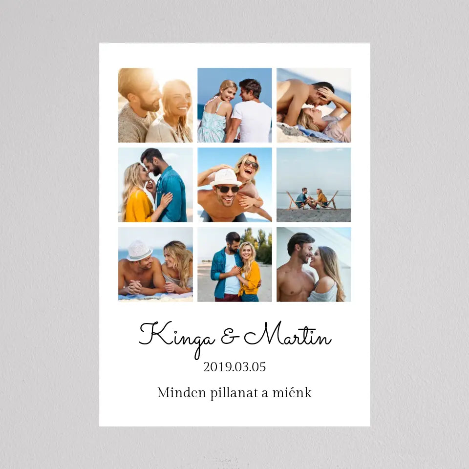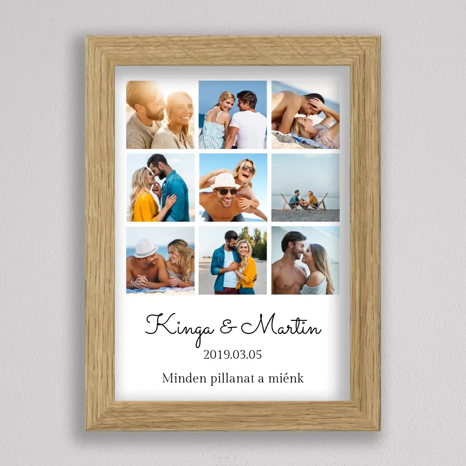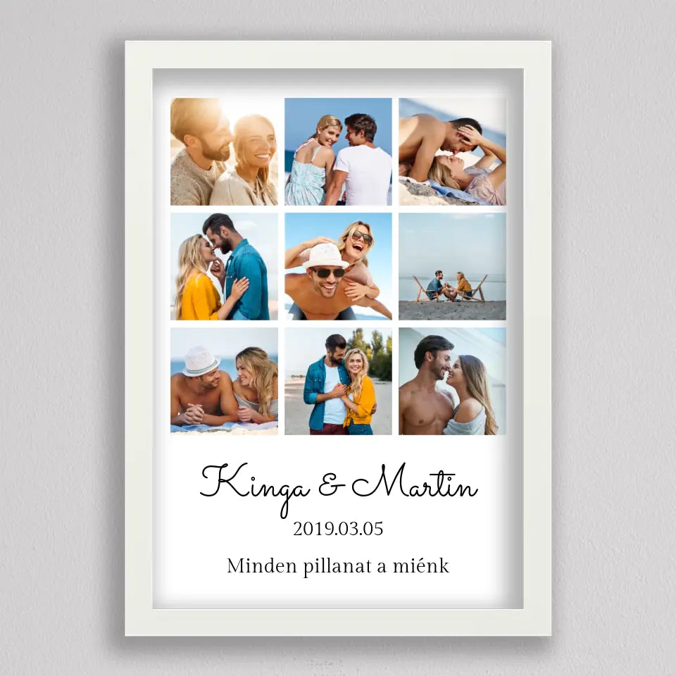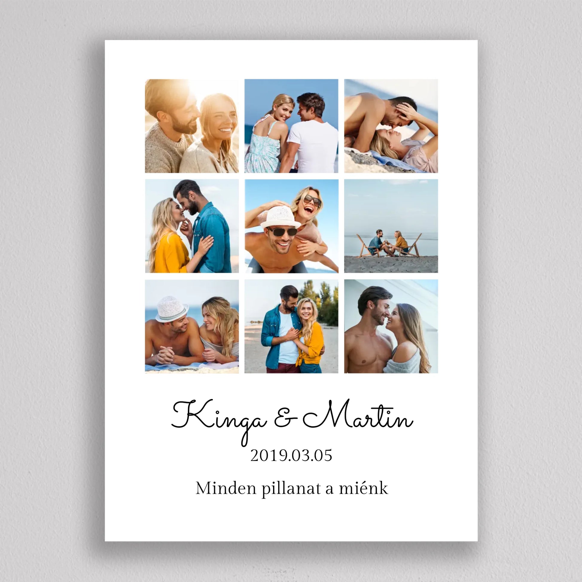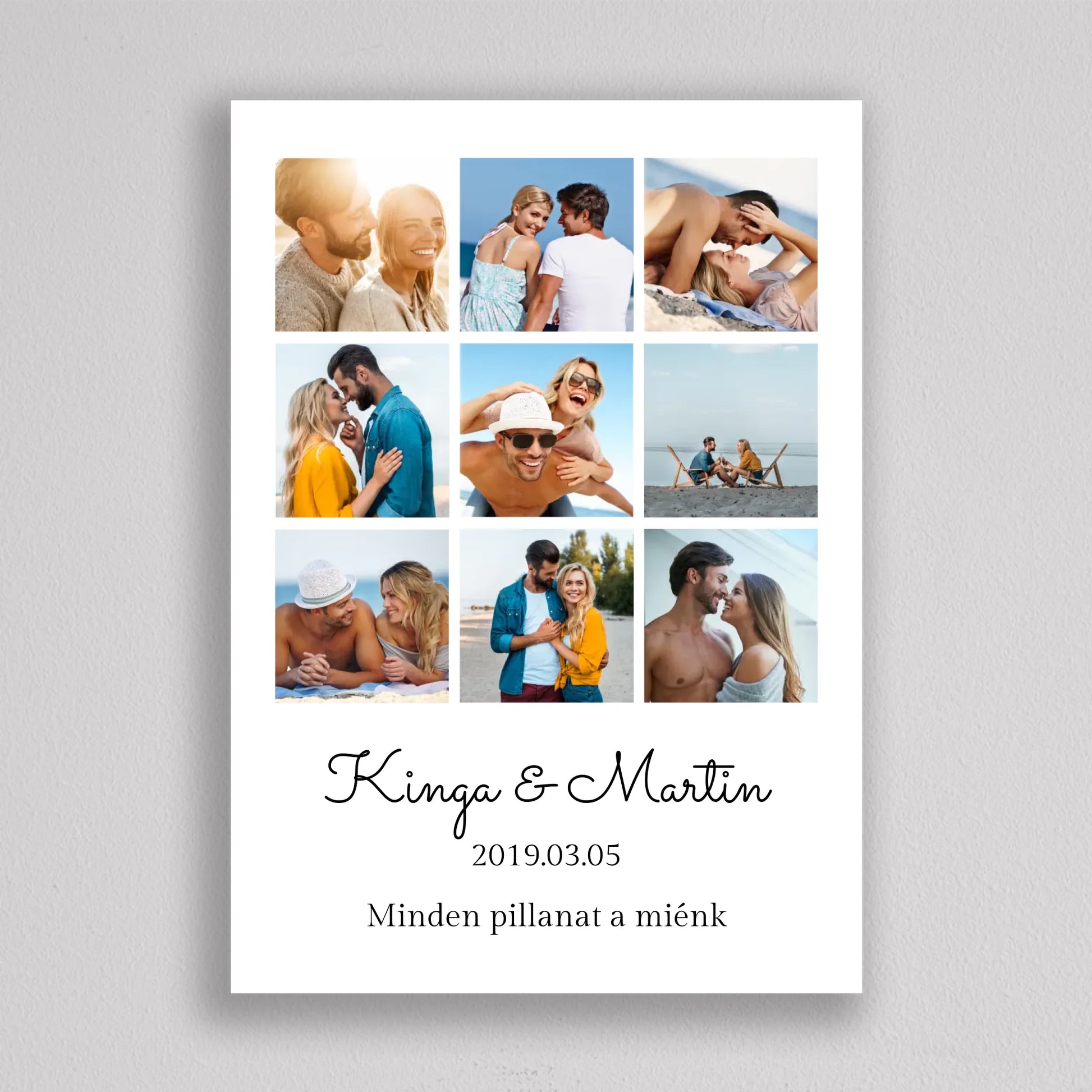 Az Évfordulós és szerelmes fotó kollázs egy tökéletes választás, ha különleges és személyre szabott ajándékkal szeretnéd meglepni a párodat. Ez az elegáns fotó kollázs kilenc különböző pillanatot ötvöz egy gyönyörű kompozícióban, kiemelve kapcsolatotok legszebb emlékeit. A kollázs középpontjában a nevek és az évforduló dátuma áll, ami egyedivé és személyessé teszi ezt a dekorációt. Ideális választás évfordulókra, Valentin-napra vagy bármilyen romantikus alkalomra, amikor szeretnéd kifejezni mély érzelmeidet. Az esztétikus és modern kialakításának köszönhetően ez a fotó kollázs bármilyen otthon stílusához illeszkedik, és egy életre szóló emlék marad.