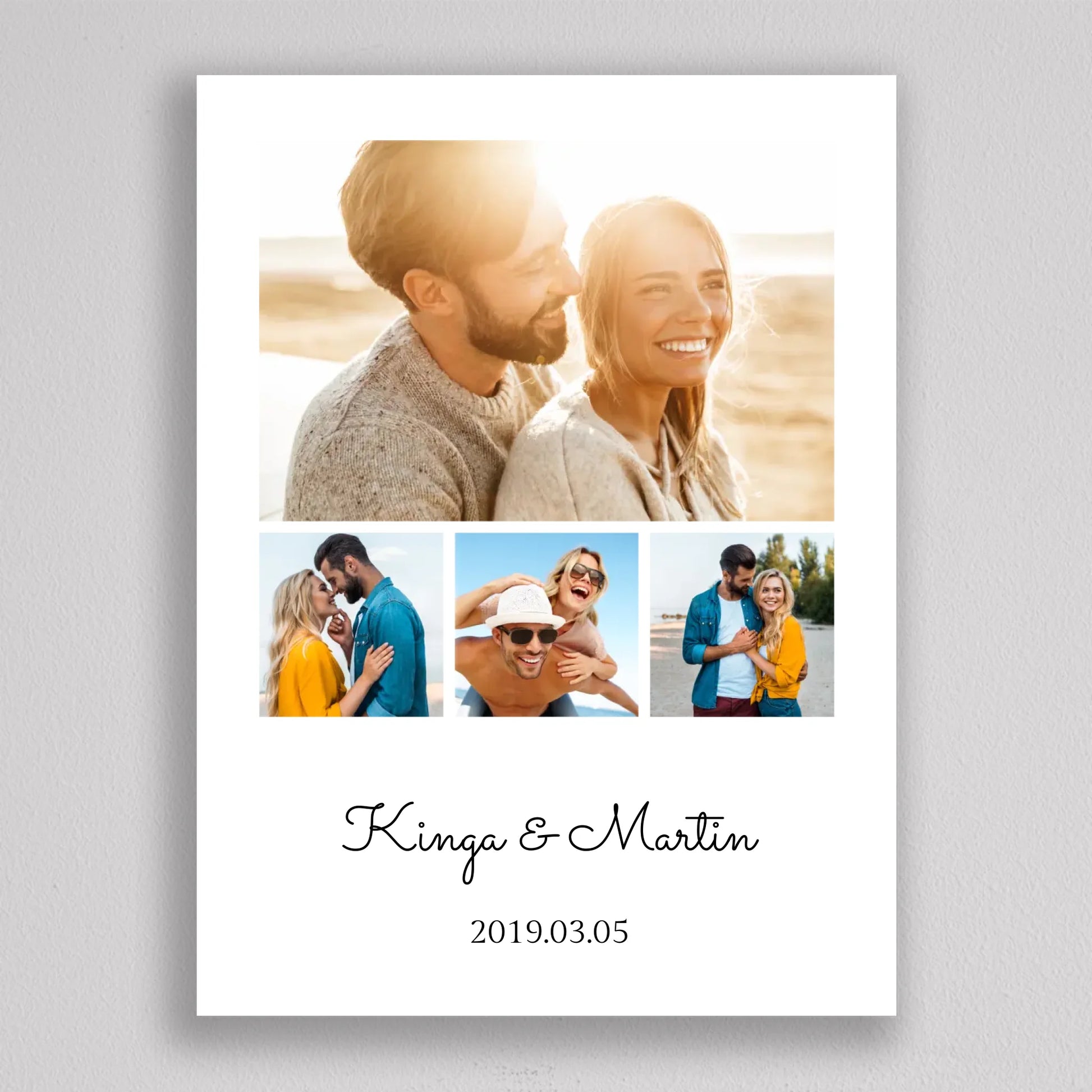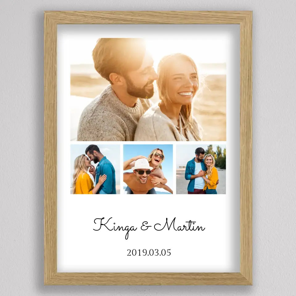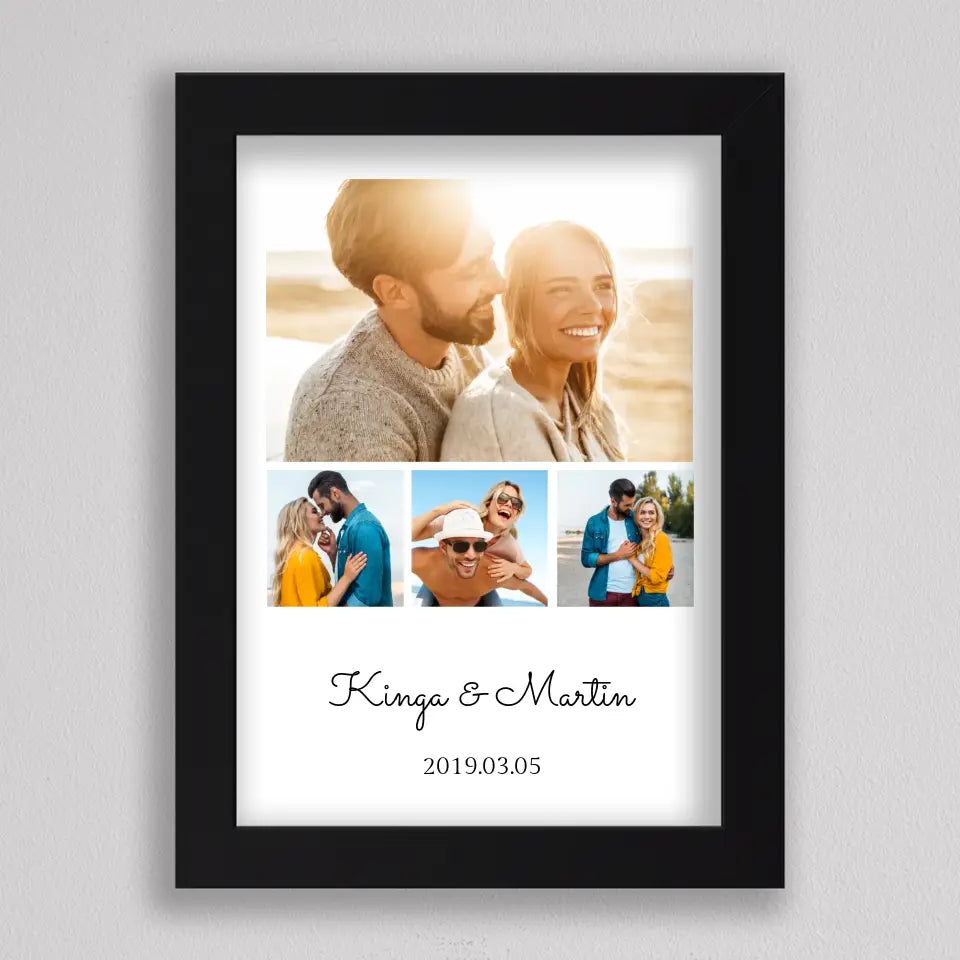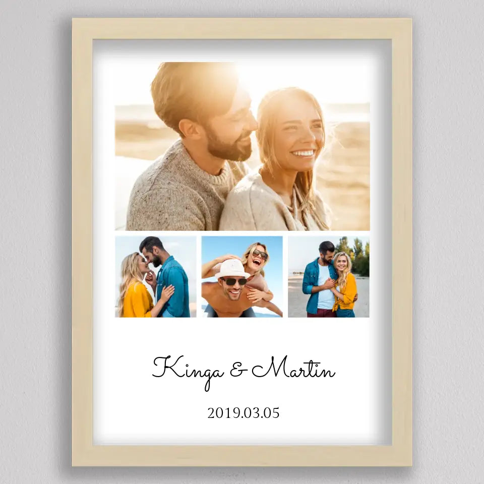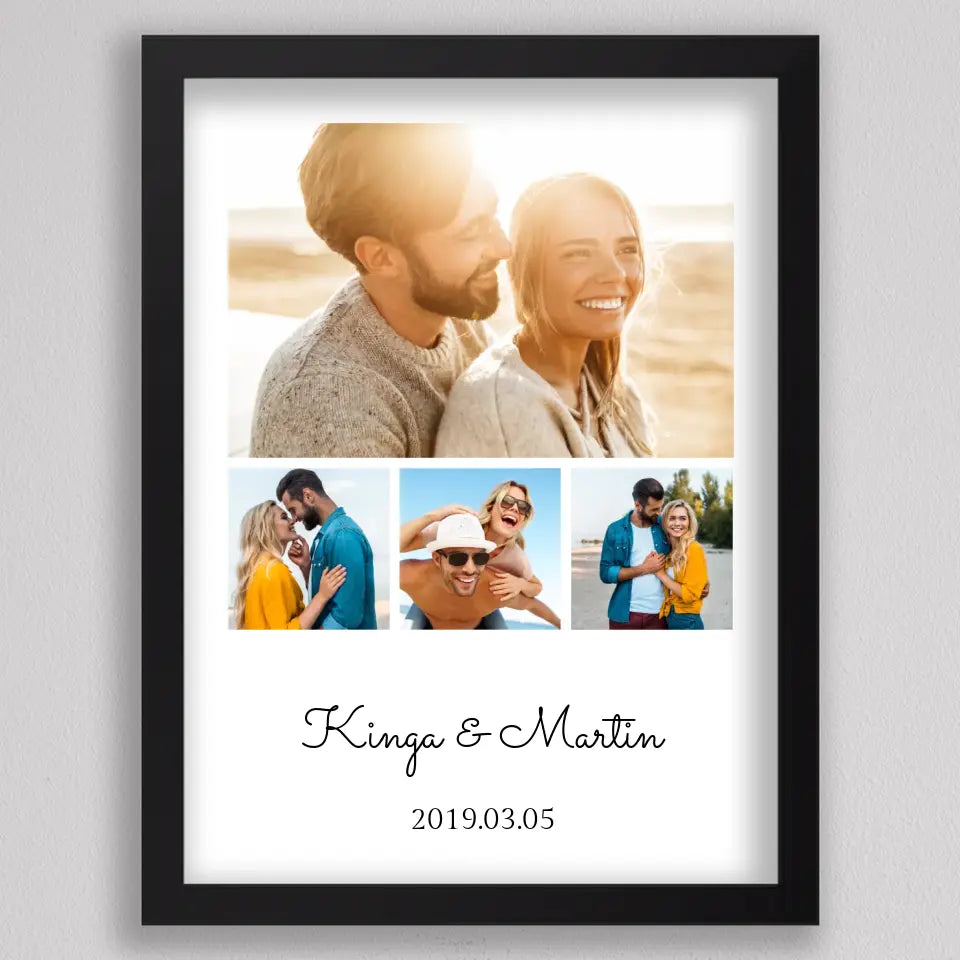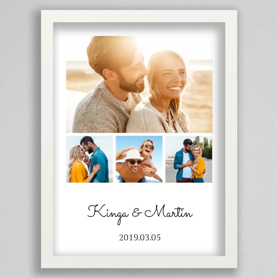 Az Évfordulós és szerelmes fotó kollázs tökéletes ajándék bármilyen különleges alkalomra, legyen az évforduló, születésnap, vagy csak egy romantikus meglepetés. Ez a kollázs négy kedvenc pillanatotokat foglalja össze egy stílusos és elegáns formában, ahol a fotók harmonikus elrendezésben jelennek meg. A kollázs alján a nevetek és a fontos dátum is feltüntetésre kerül, így ez az ajándék igazán egyedivé és személyessé válik. A letisztult dizájnnak köszönhetően bármely otthon dísze lehet, amely mindig emlékeztetni fog benneteket a közösen megélt boldog pillanatokra.