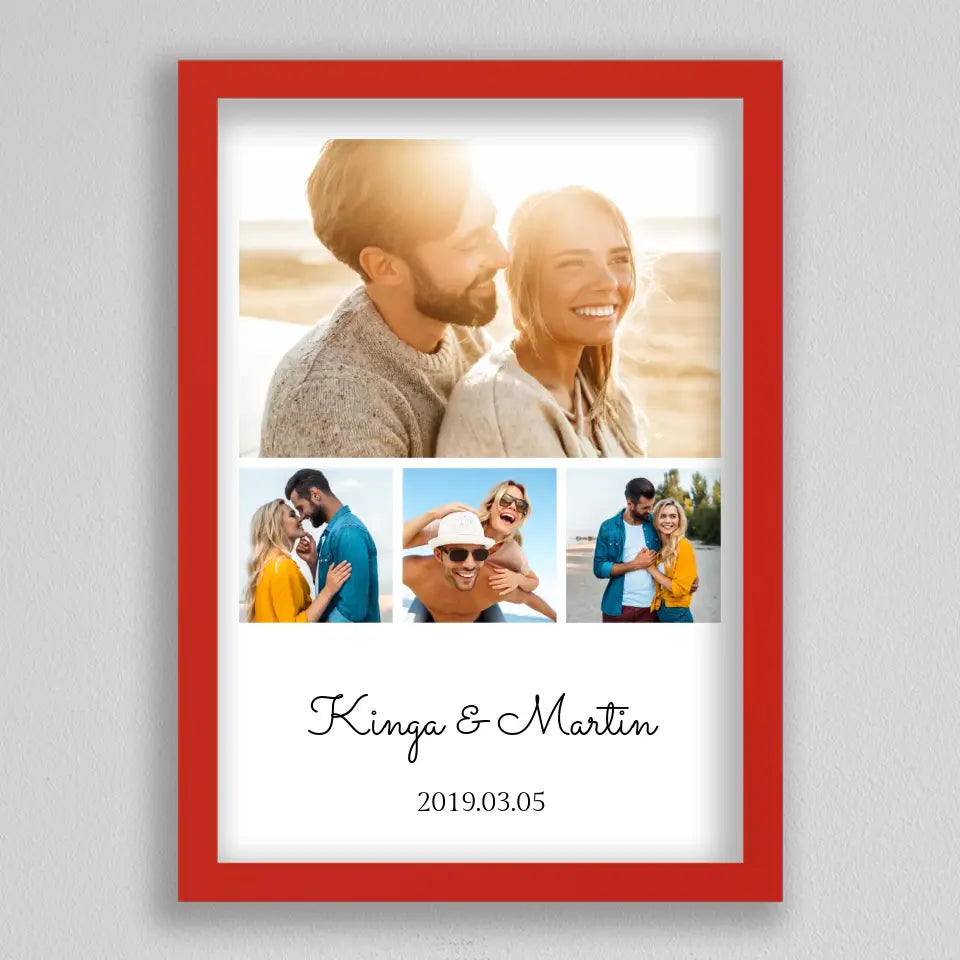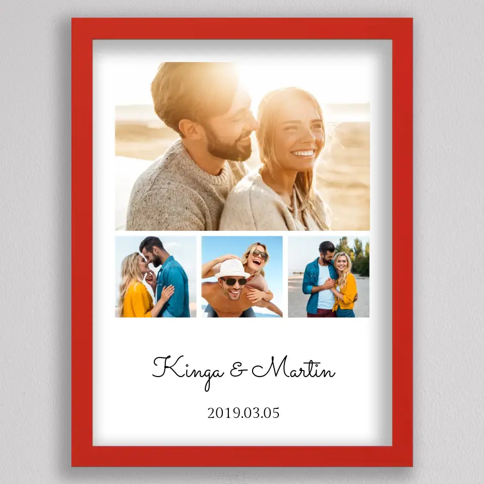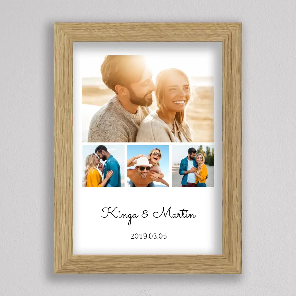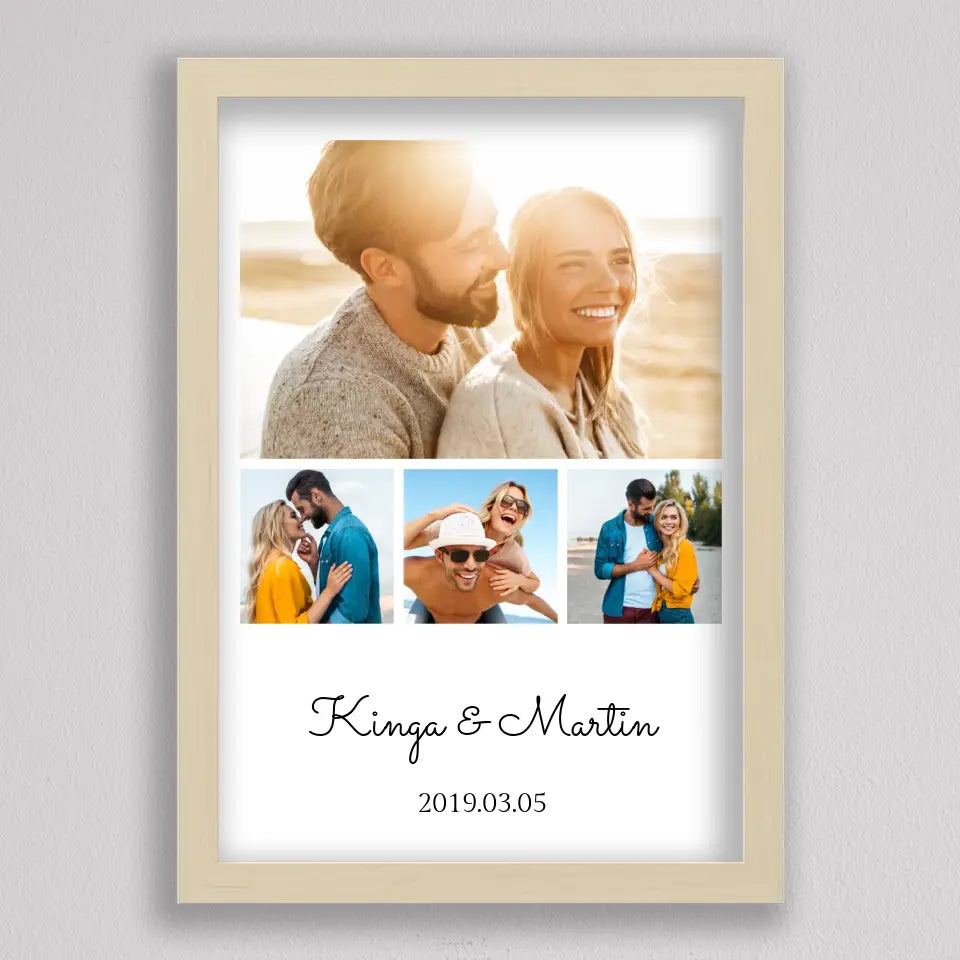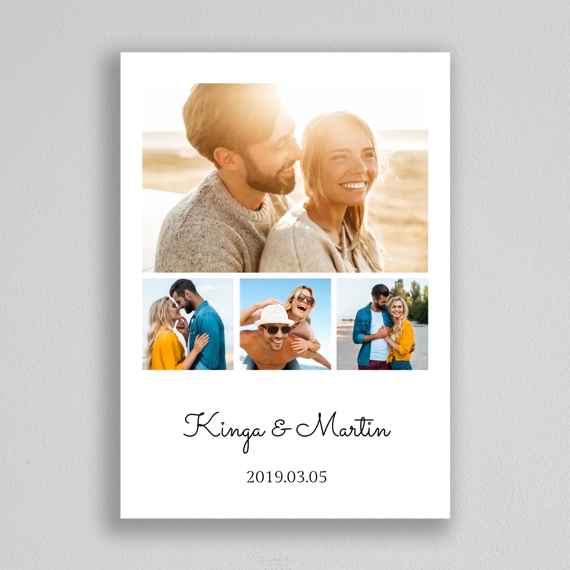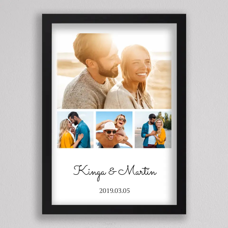 Az Évfordulós és szerelmes fotó kollázs tökéletes ajándék bármilyen különleges alkalomra, legyen az évforduló, születésnap, vagy csak egy romantikus meglepetés. Ez a kollázs négy kedvenc pillanatotokat foglalja össze egy stílusos és elegáns formában, ahol a fotók harmonikus elrendezésben jelennek meg. A kollázs alján a nevetek és a fontos dátum is feltüntetésre kerül, így ez az ajándék igazán egyedivé és személyessé válik. A letisztult dizájnnak köszönhetően bármely otthon dísze lehet, amely mindig emlékeztetni fog benneteket a közösen megélt boldog pillanatokra.