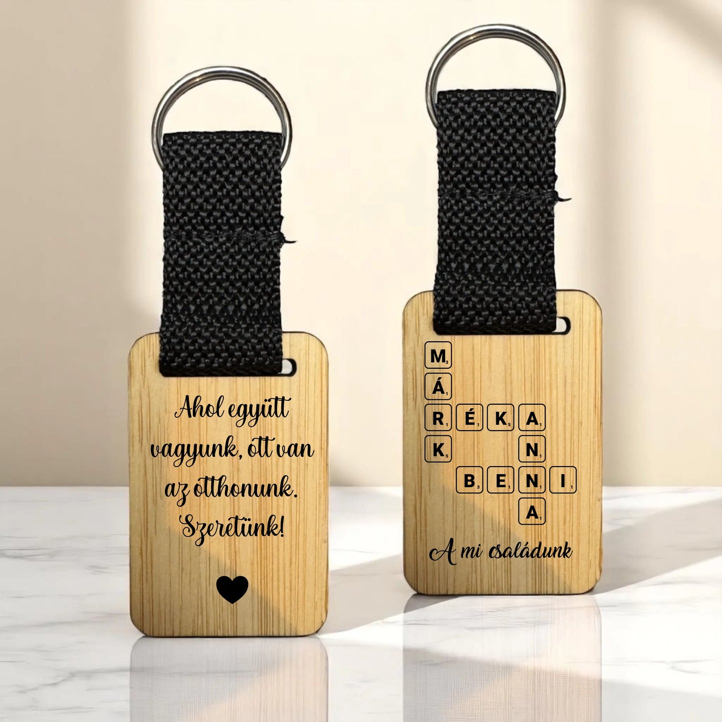 Ez az egyedi, lézervágott fa kulcstartó tökéletes ajándék minden család számára, akik szeretnék egy különleges formában megőrizni az összetartozás érzését. Scrabble-stílusú névkockákban jelennek meg a családtagok nevei, amelyeket keresztbe-fonódva gravírozunk a természetes hatású fa felületre. A hátoldalon egy szeretetteljes idézet emlékeztet arra, hogy az otthon ott van, ahol együtt vagytok – szívből jövő ajándék születésnapra, anyák napjára, karácsonyra vagy házavatóra. A kulcstartó mérete 5x3 cm, strapabíró textil füllel és fém karikával készül, így praktikus és stílusos kiegészítő egyszerre. Teljesen személyre szabható, így minden darab valódi emlékőrző tárggyá válik, amely a mindennapok során is örömet okoz.