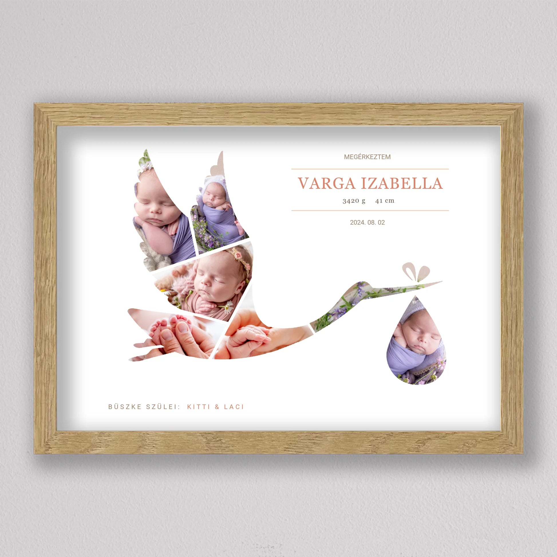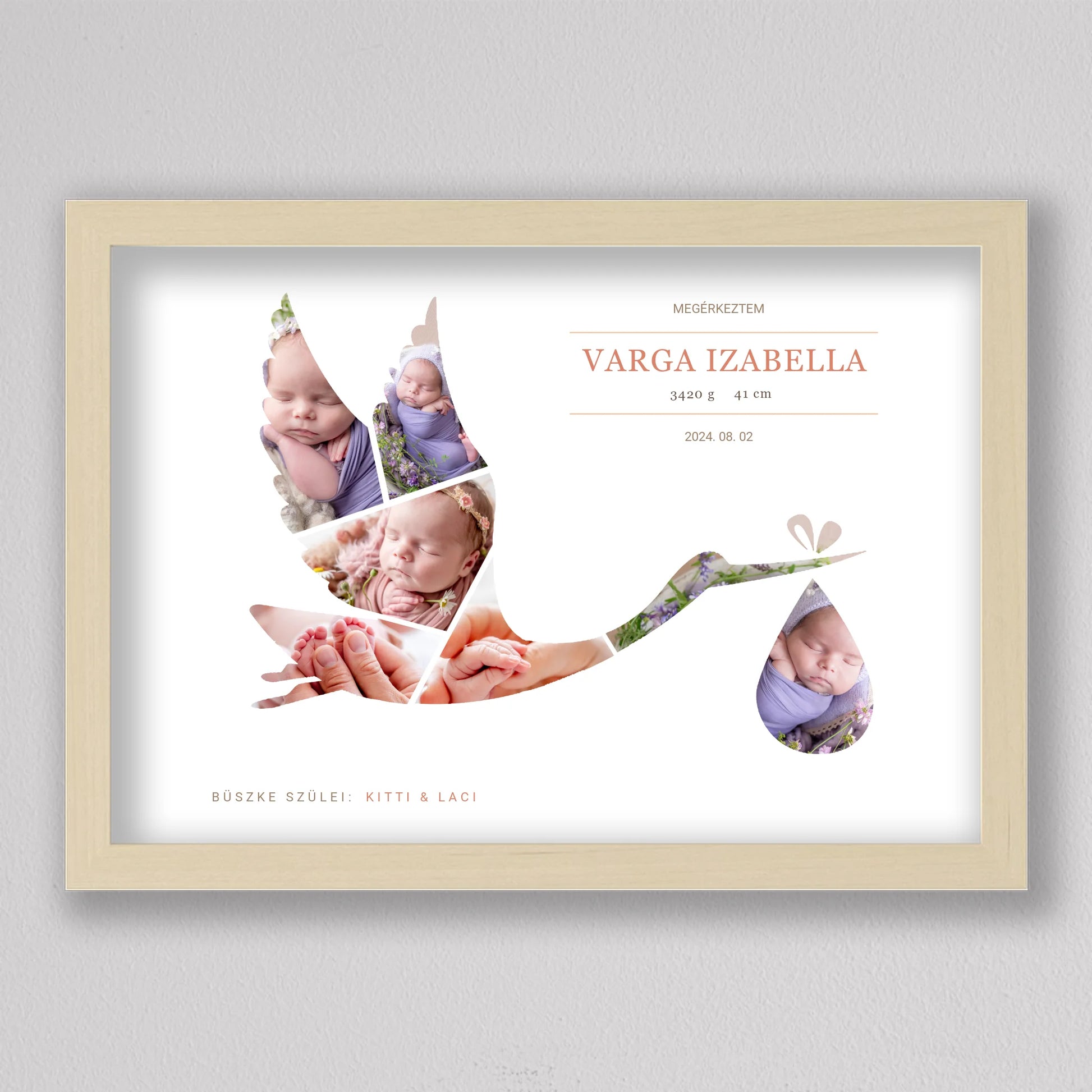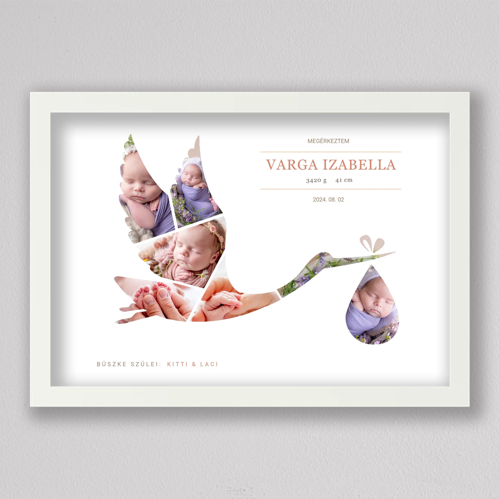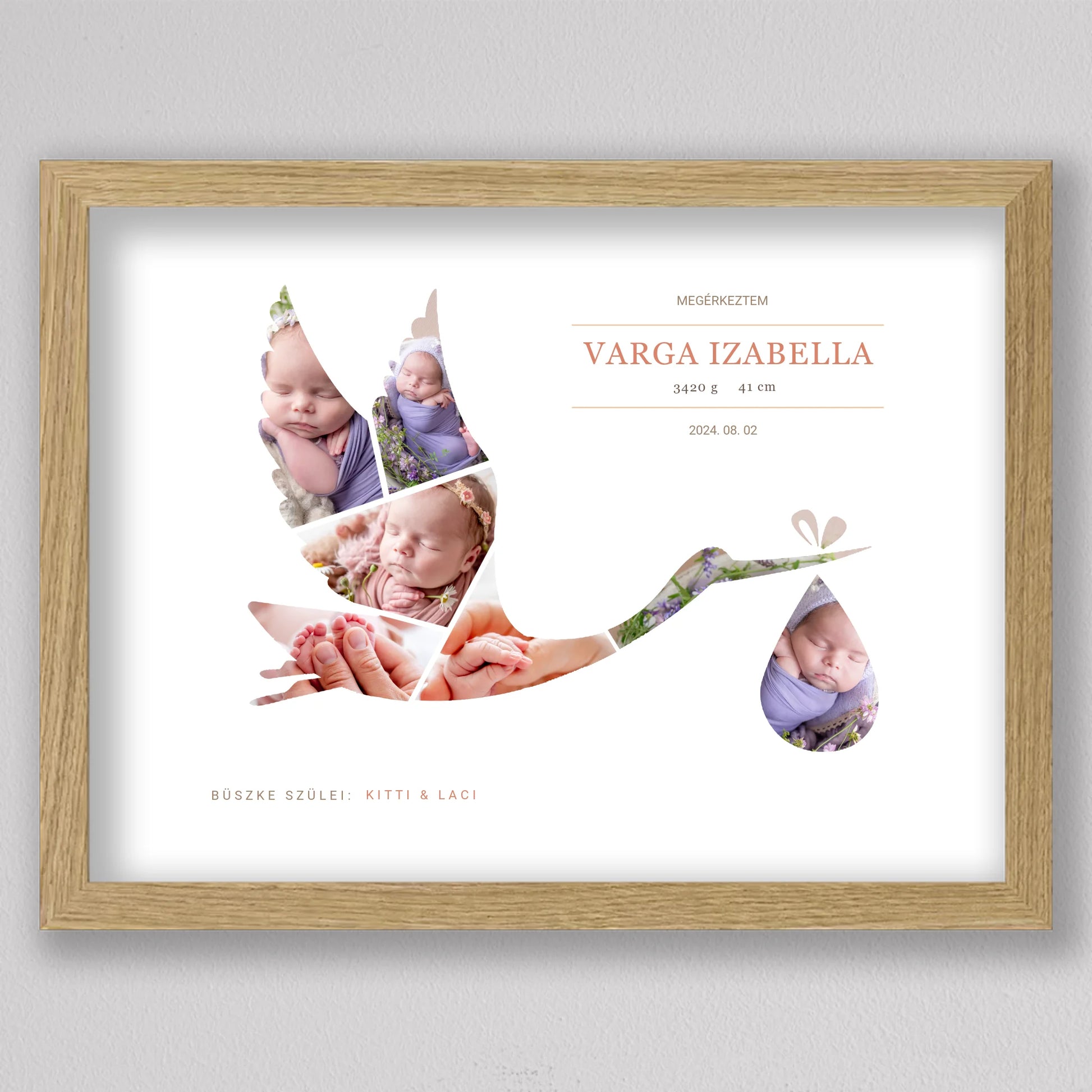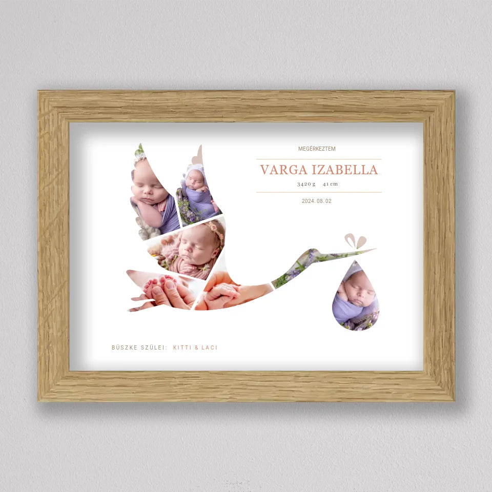 A Gólya alakú babaköszöntő fotó kollázs egy kedves és személyre szabható emléktárgy, amely tökéletesen megörökíti a baba születésének pillanatát. A termék egyedi kialakítása lehetővé teszi, hogy a legaranyosabb babafotók egy elegáns gólya alakban jelenjenek meg, szimbolizálva a baba érkezését. A szülők neve, a baba születési adatai, és egy személyes üzenet is helyet kap a kollázson, ami még különlegesebbé teszi ezt a csodálatos ajándékot. Ideális választás keresztelőkre, babaváró bulikra vagy a gyermek születésének megünneplésére. A modern, letisztult dizájn bármilyen enteriőrbe illeszkedik, így örök emlékként díszítheti a család otthonát.