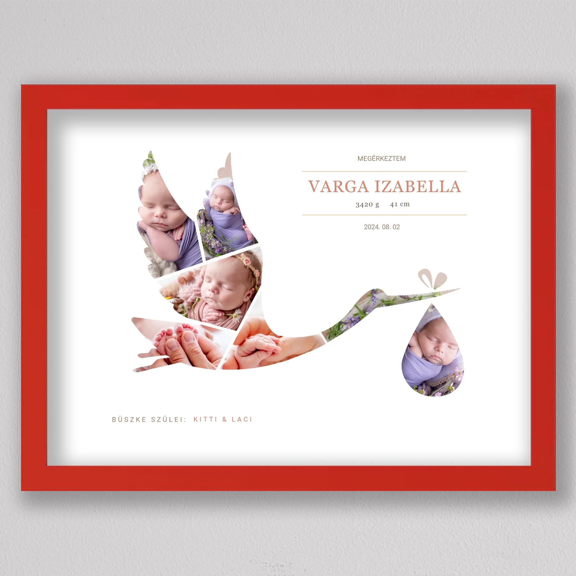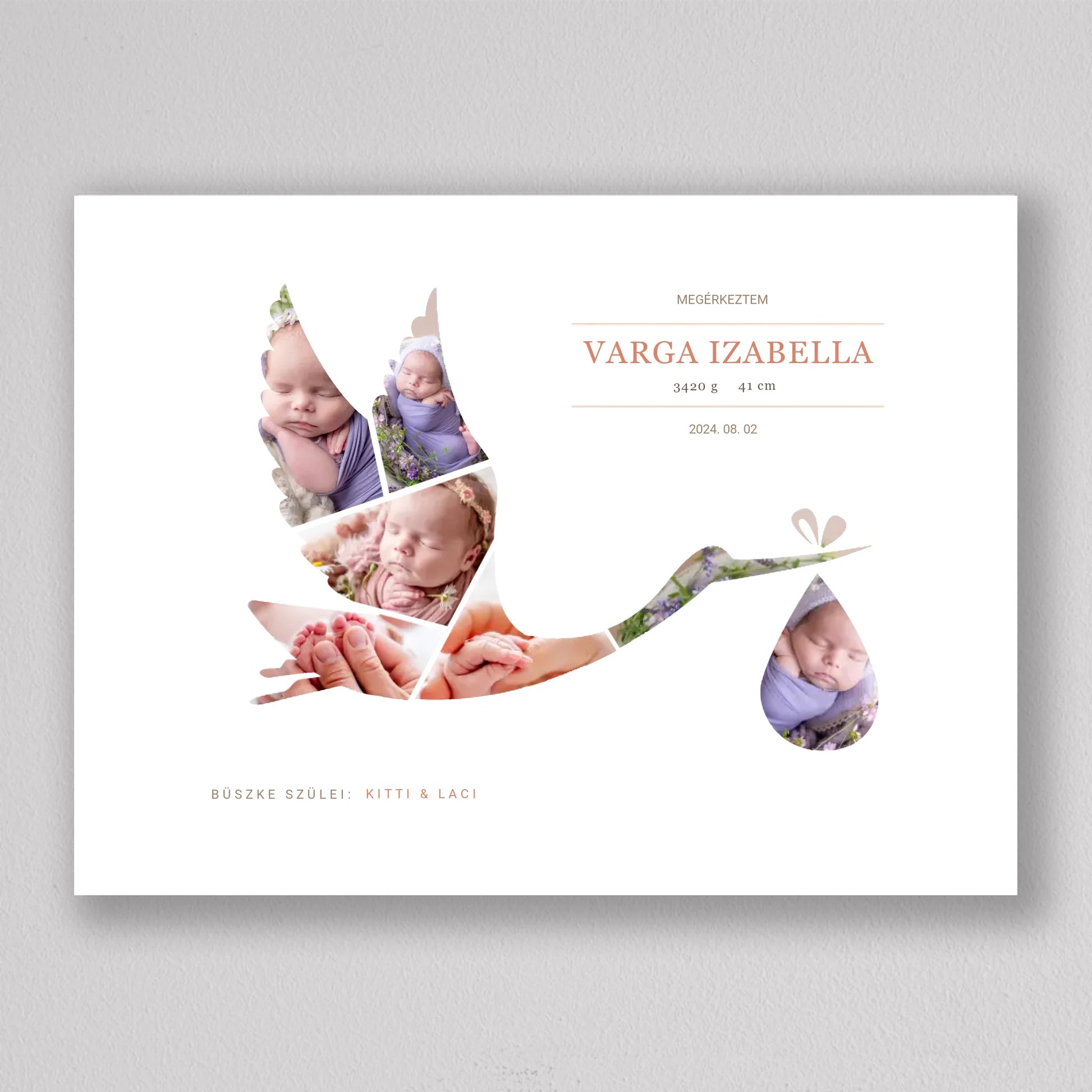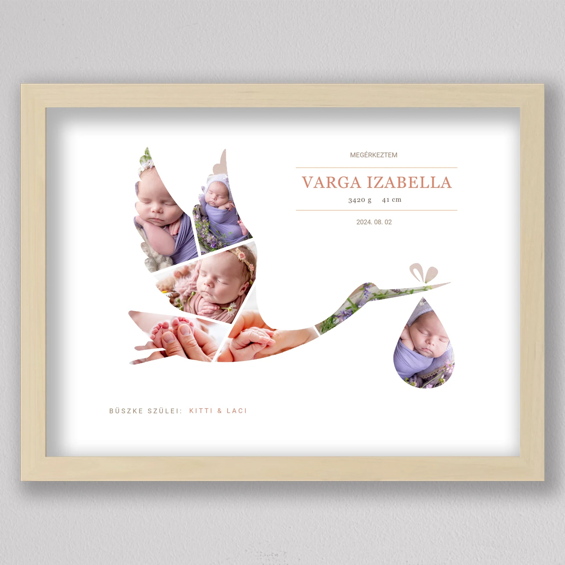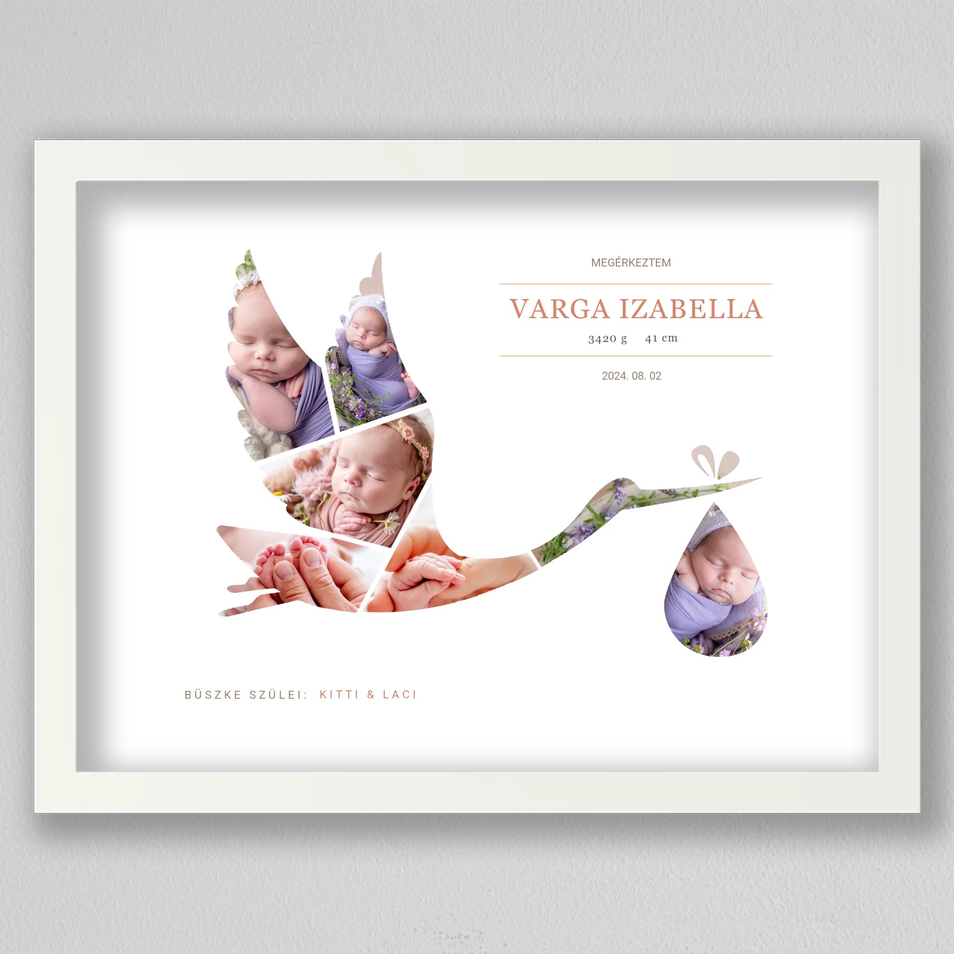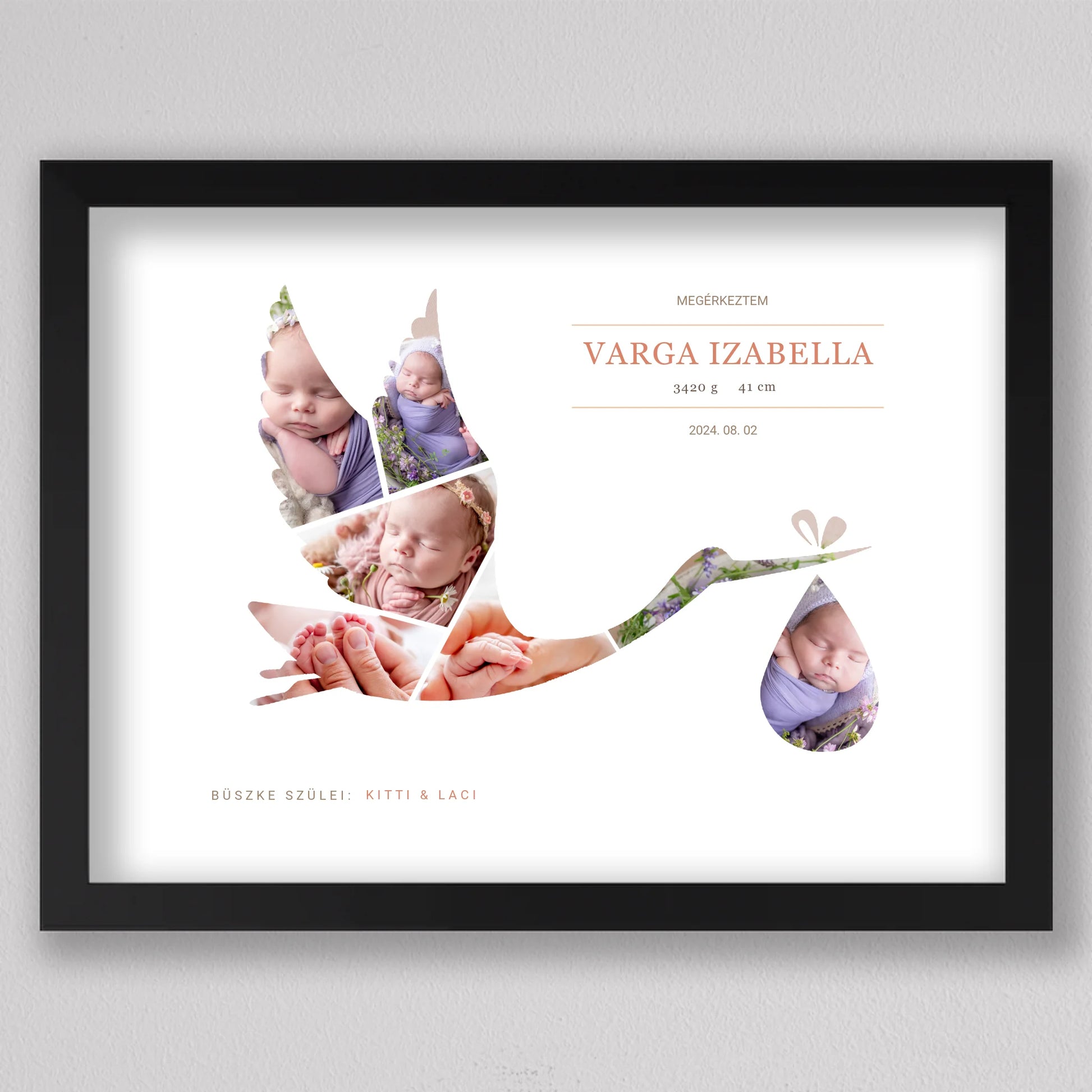 A Gólya alakú babaköszöntő fotó kollázs egy kedves és személyre szabható emléktárgy, amely tökéletesen megörökíti a baba születésének pillanatát. A termék egyedi kialakítása lehetővé teszi, hogy a legaranyosabb babafotók egy elegáns gólya alakban jelenjenek meg, szimbolizálva a baba érkezését. A szülők neve, a baba születési adatai, és egy személyes üzenet is helyet kap a kollázson, ami még különlegesebbé teszi ezt a csodálatos ajándékot. Ideális választás keresztelőkre, babaváró bulikra vagy a gyermek születésének megünneplésére. A modern, letisztult dizájn bármilyen enteriőrbe illeszkedik, így örök emlékként díszítheti a család otthonát.