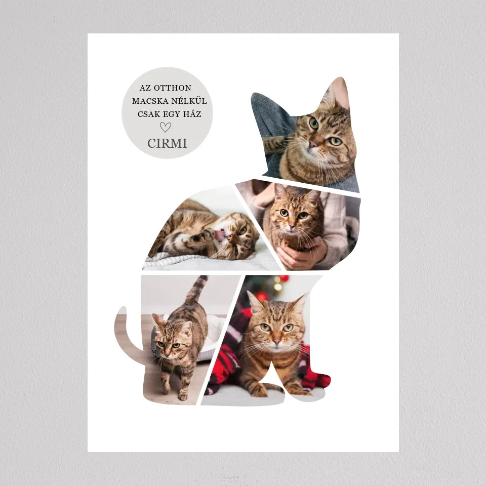 Hűséges Társ macska alakú fotó kollázs tökéletes ajándék minden macskabarát számára, aki szeretné megőrizni kedvenc cicája legaranyosabb pillanatait. Ez az egyedi és személyre szabható kollázs lehetővé teszi, hogy a legkedvesebb fotóidat macska sziluett formájában jelenítsd meg, ezzel még személyesebbé téve otthonod díszítését. Kiváló választás, ha emléket szeretnél állítani hűséges társadnak, vagy ha különleges ajándékot keresel egy macskaimádó ismerősöd számára. Rendelhető többféle méretben és színben, hogy tökéletesen illeszkedjen bármilyen enteriőrbe.