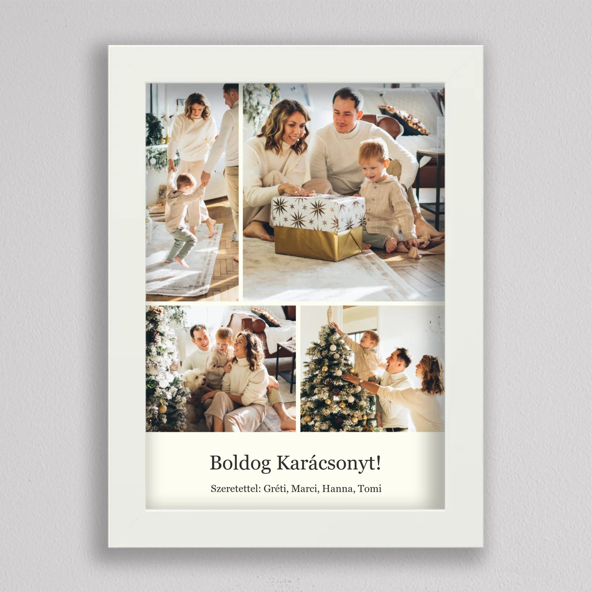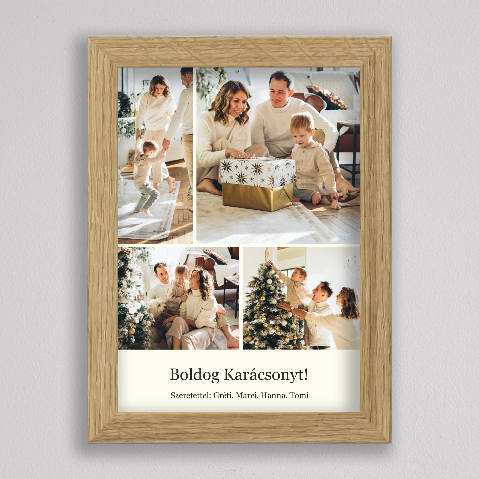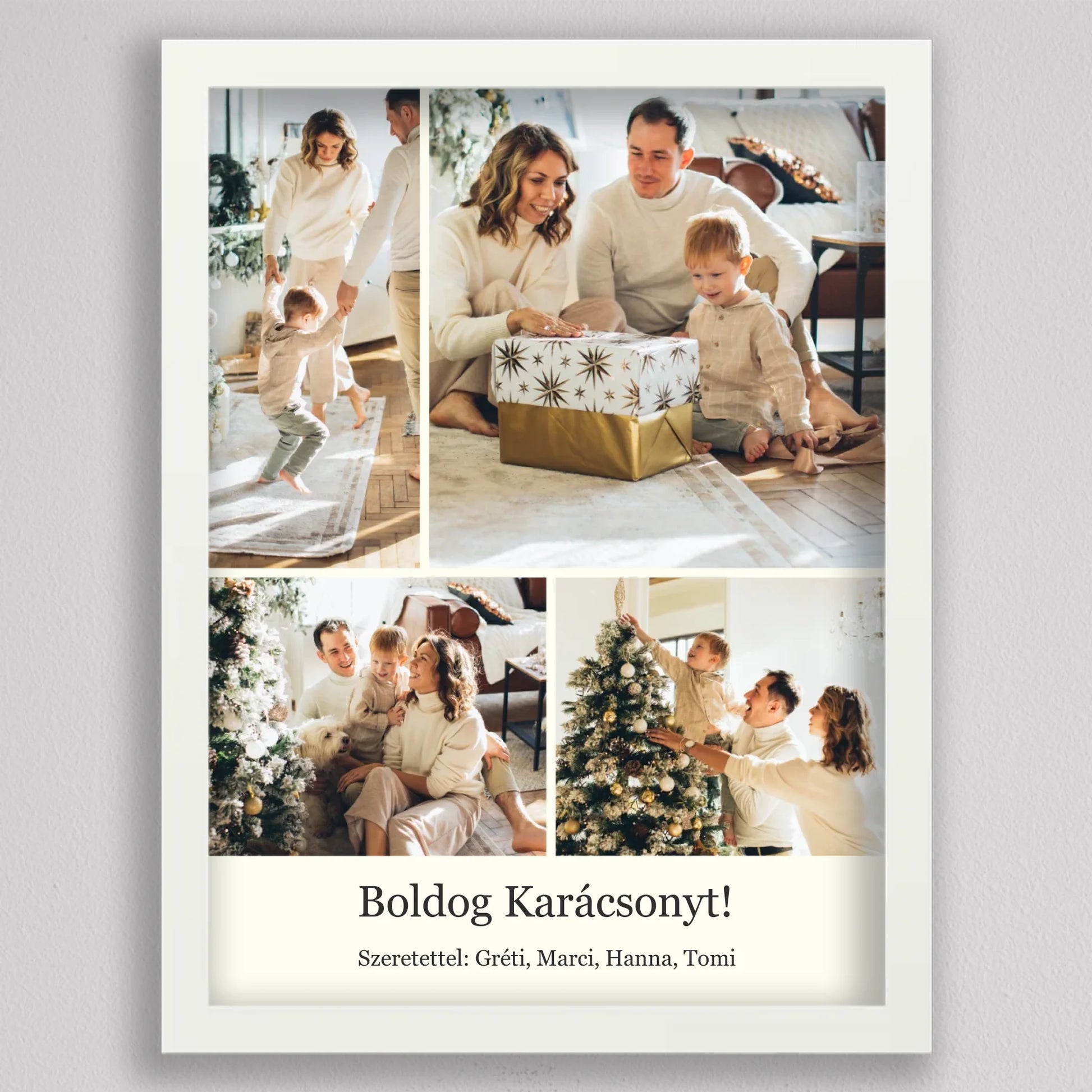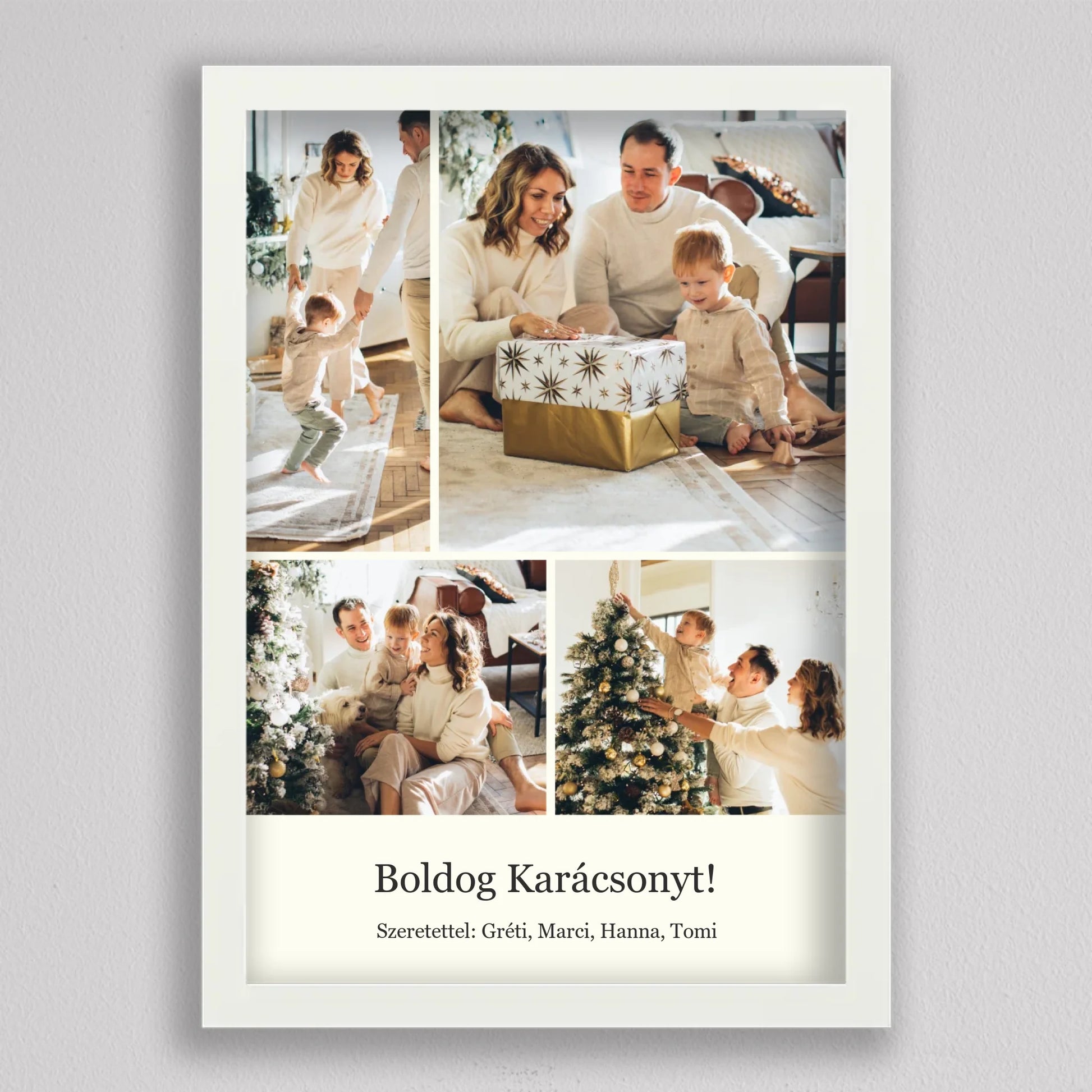 Őrizd meg az ünnep legszebb pillanatait ezzel az elegáns, személyre szabható karácsonyi fotókollázzsal, amely tökéletesen visszaadja a szeretet és az összetartozás hangulatát. Négy kedvenc családi fotód kerülhet rá, így minden részletben ott lesz az ünnep varázsa és a közösen megélt élmények melegsége. A minimalista, letisztult elrendezés gondoskodik arról, hogy a képek ragyogjanak, miközben ízléses dekorációként díszítik az otthont. Kiváló ajándék nagyszülőknek, szülőknek vagy barátoknak – hiszen nincs szebb meglepetés, mint egy szívből jövő, személyes emlék. Egy fotókollázs, ami minden évben mosolyt csal az arcokra, amikor újra a falra néztek.