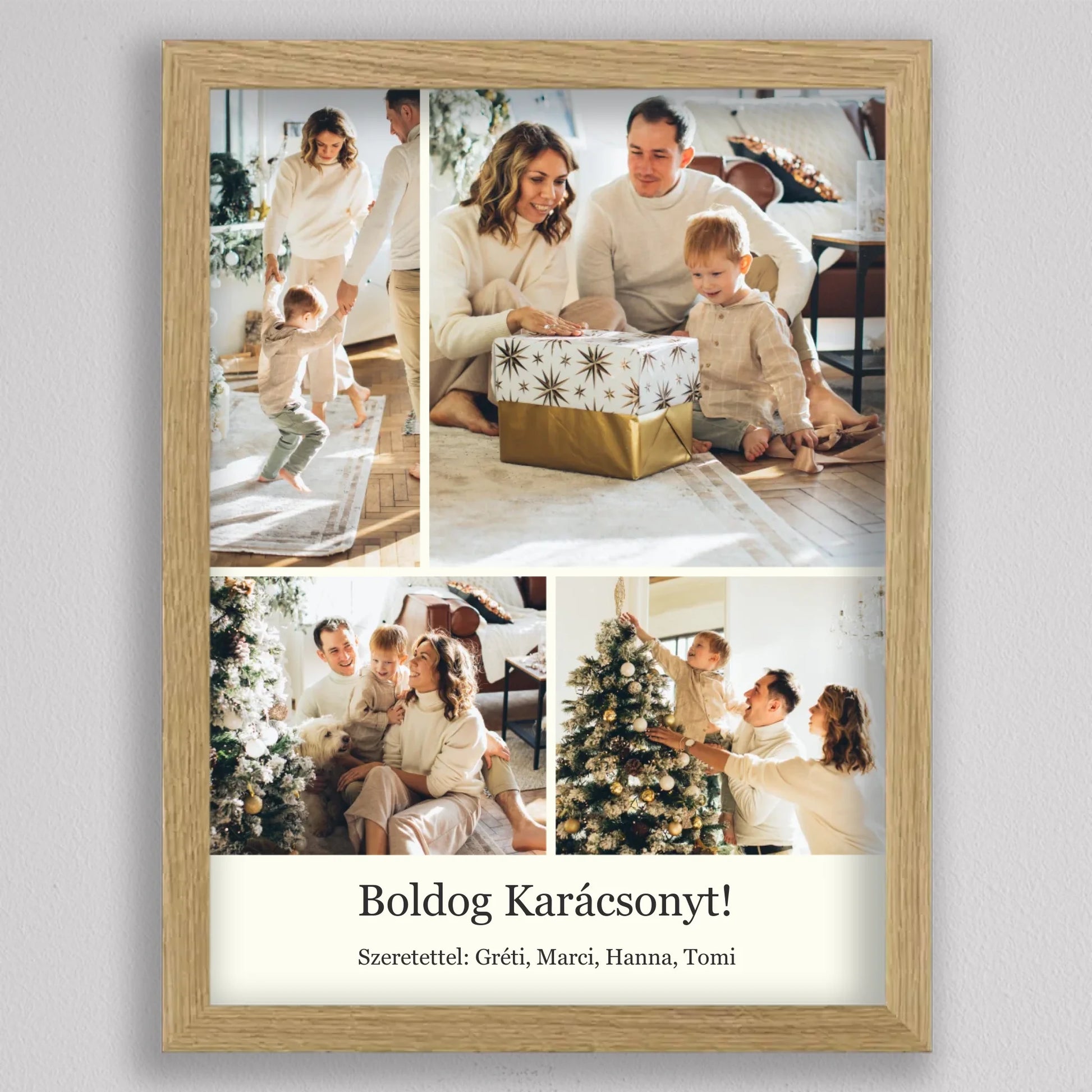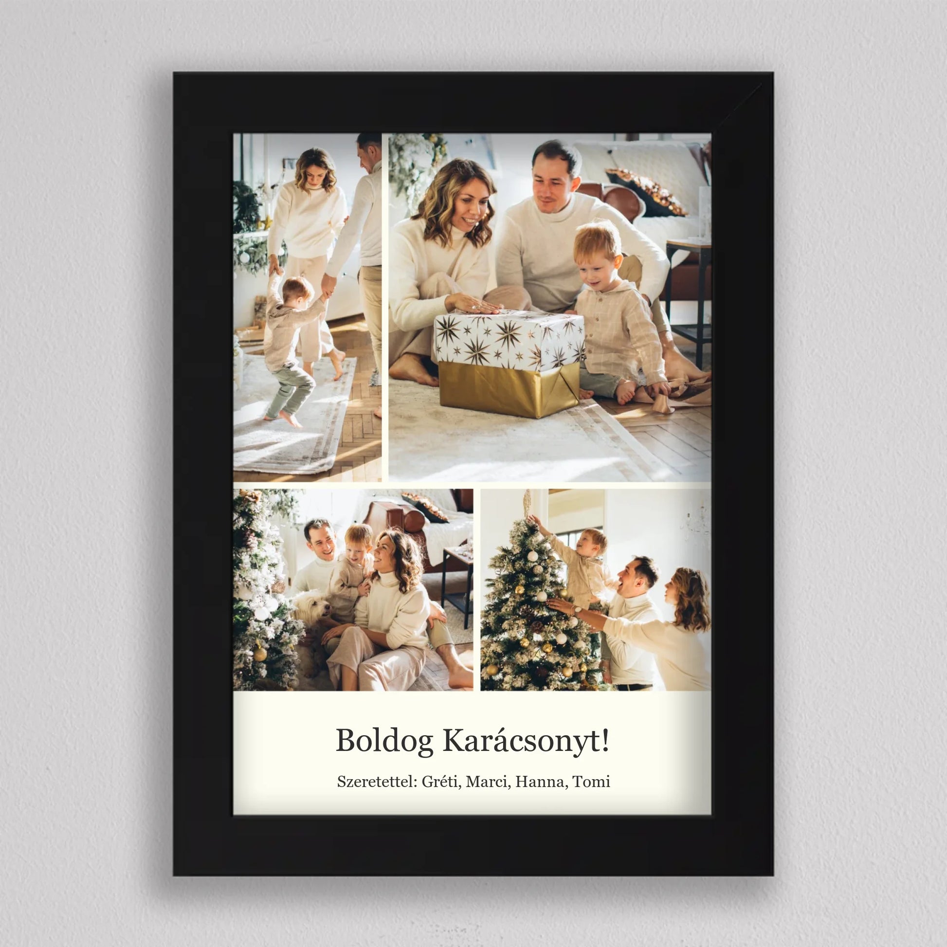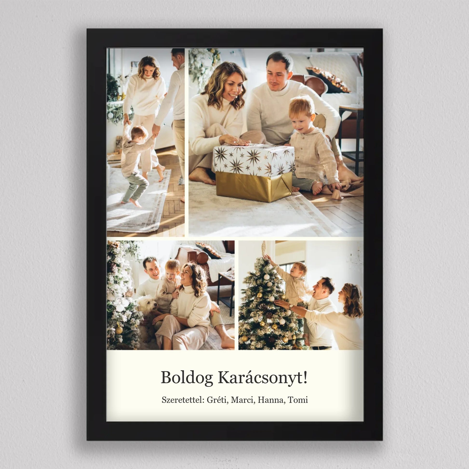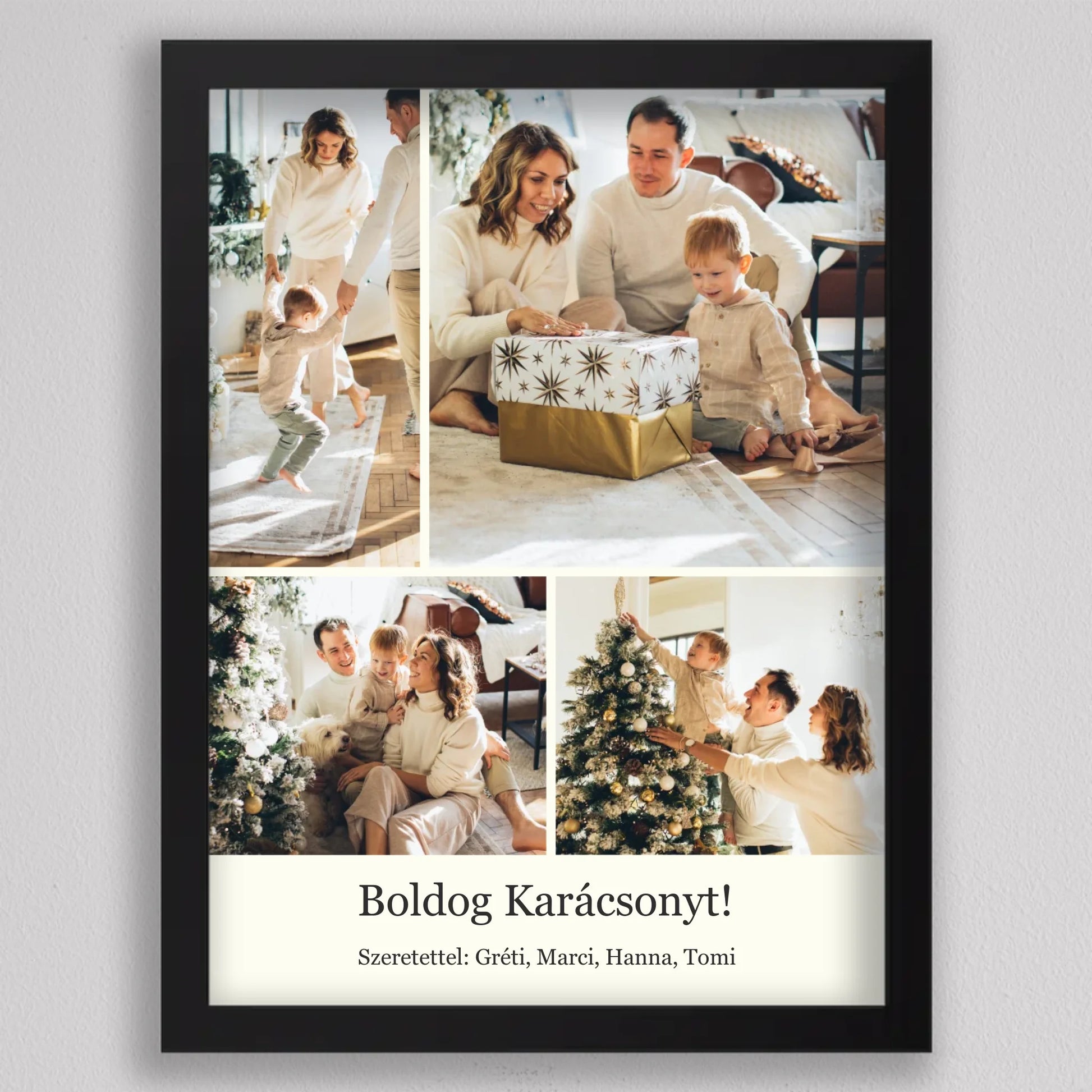 Őrizd meg az ünnep legszebb pillanatait ezzel az elegáns, személyre szabható karácsonyi fotókollázzsal, amely tökéletesen visszaadja a szeretet és az összetartozás hangulatát. Négy kedvenc családi fotód kerülhet rá, így minden részletben ott lesz az ünnep varázsa és a közösen megélt élmények melegsége. A minimalista, letisztult elrendezés gondoskodik arról, hogy a képek ragyogjanak, miközben ízléses dekorációként díszítik az otthont. Kiváló ajándék nagyszülőknek, szülőknek vagy barátoknak – hiszen nincs szebb meglepetés, mint egy szívből jövő, személyes emlék. Egy fotókollázs, ami minden évben mosolyt csal az arcokra, amikor újra a falra néztek.