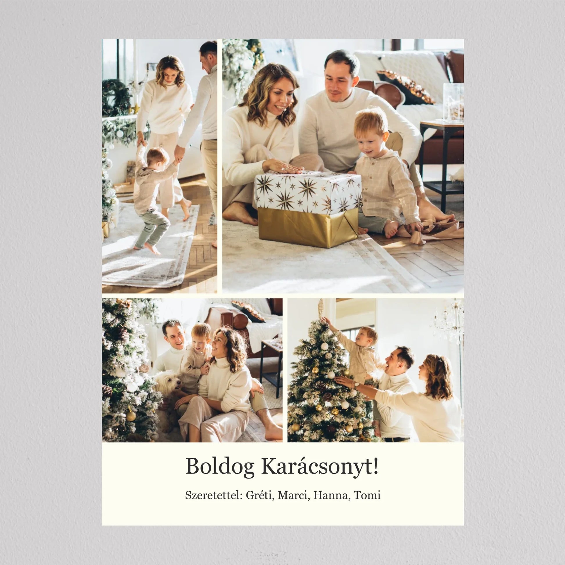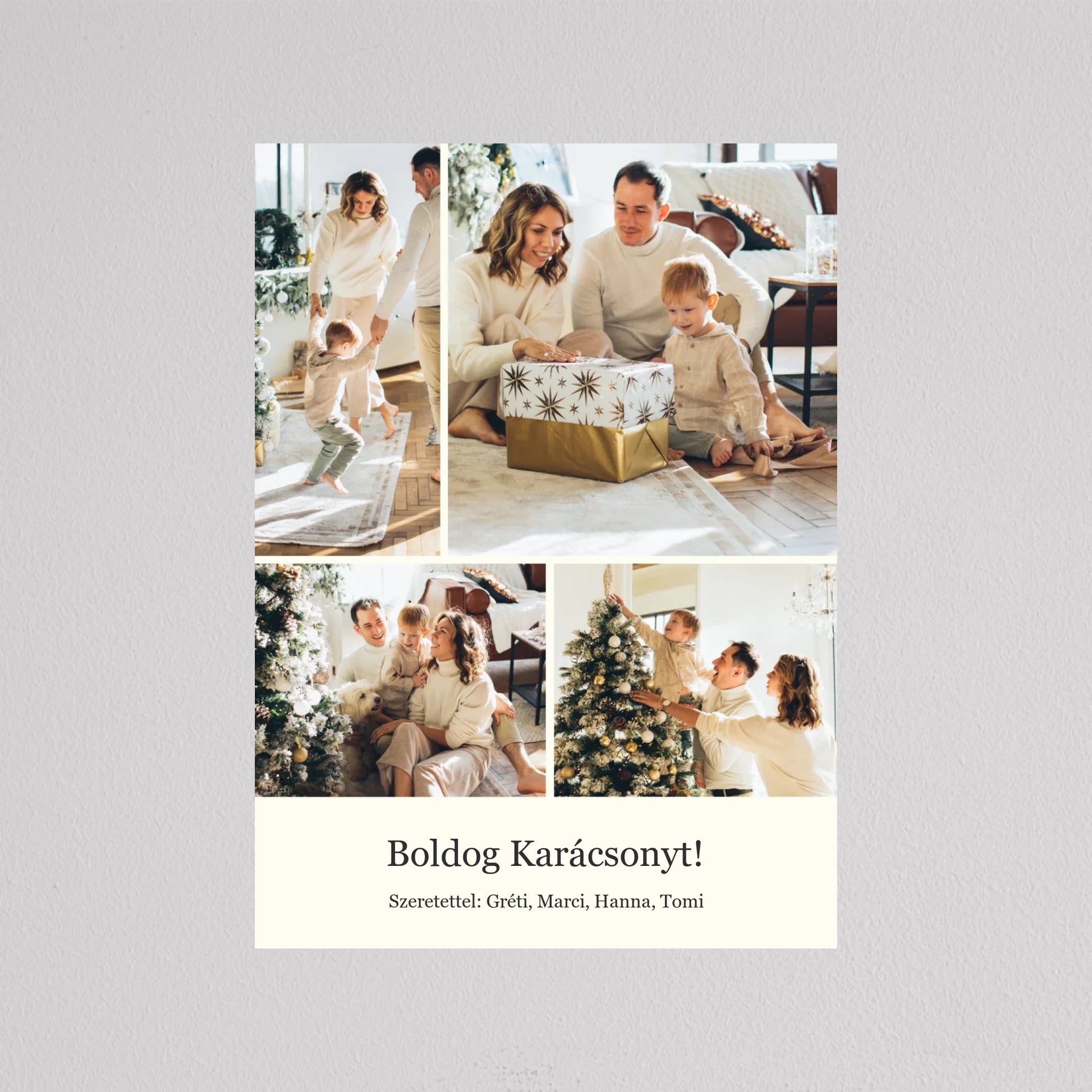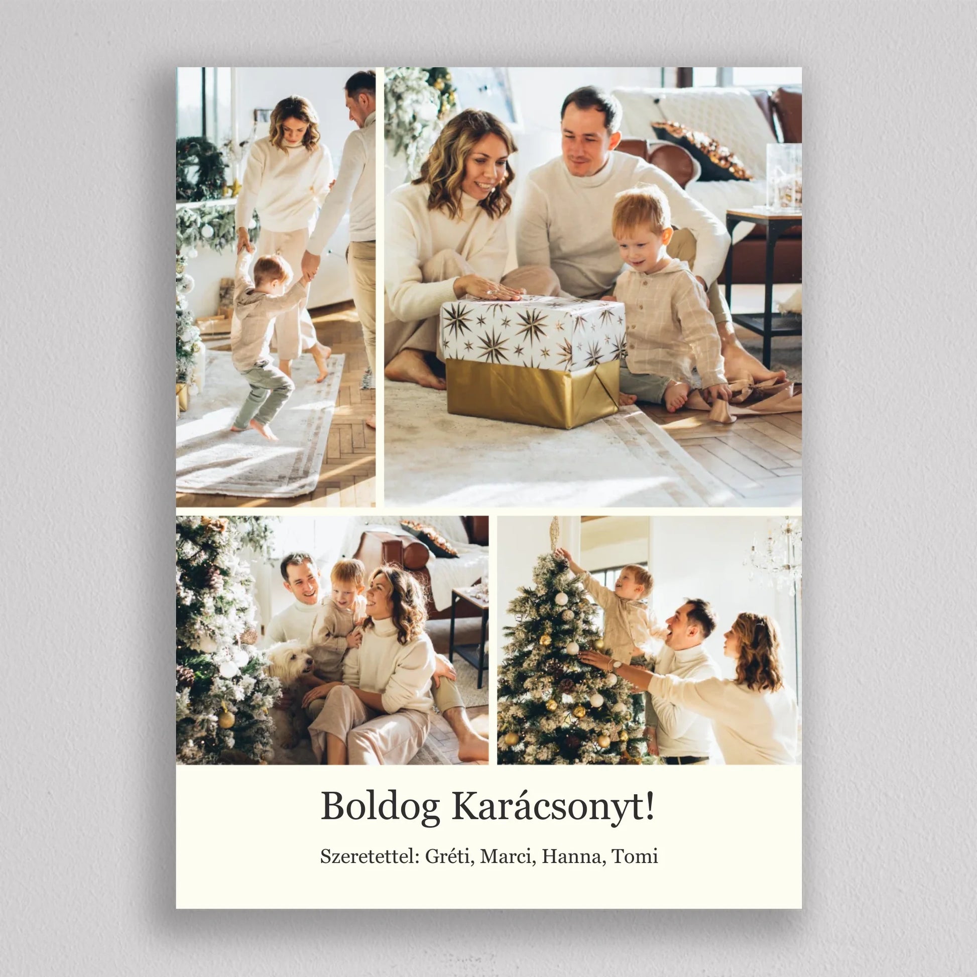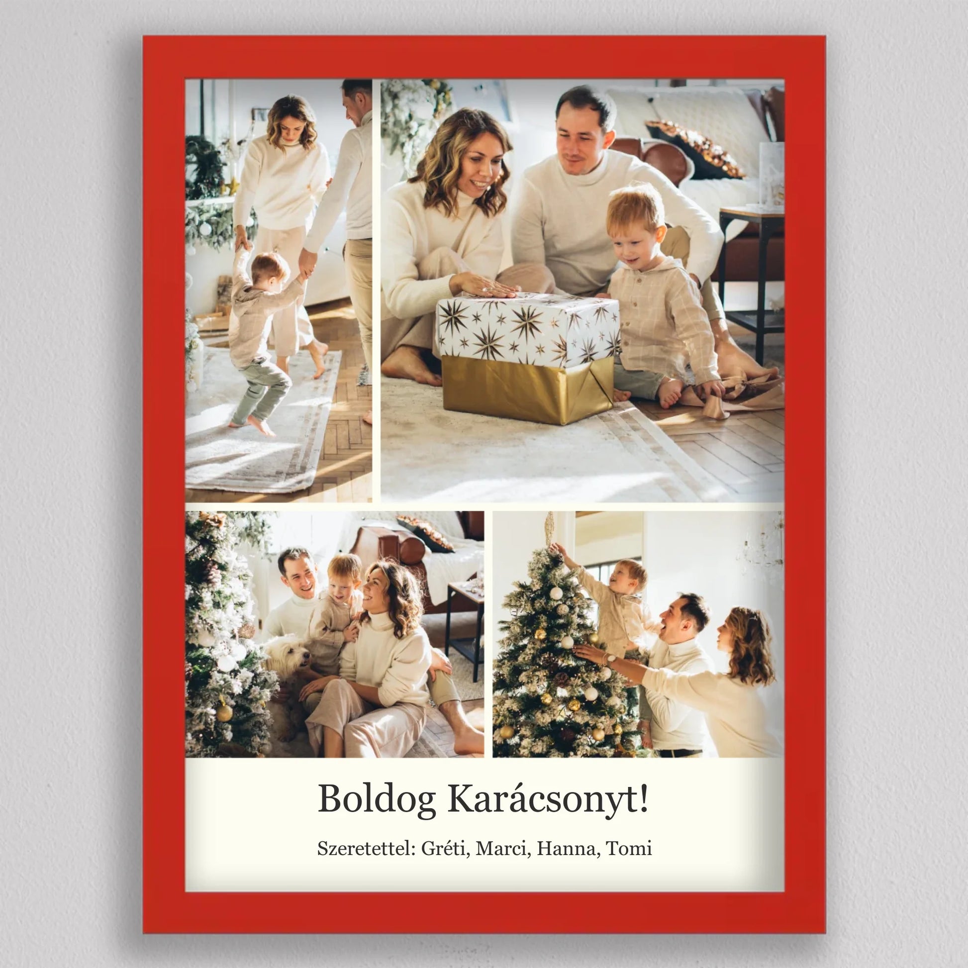 Őrizd meg az ünnep legszebb pillanatait ezzel az elegáns, személyre szabható karácsonyi fotókollázzsal, amely tökéletesen visszaadja a szeretet és az összetartozás hangulatát. Négy kedvenc családi fotód kerülhet rá, így minden részletben ott lesz az ünnep varázsa és a közösen megélt élmények melegsége. A minimalista, letisztult elrendezés gondoskodik arról, hogy a képek ragyogjanak, miközben ízléses dekorációként díszítik az otthont. Kiváló ajándék nagyszülőknek, szülőknek vagy barátoknak – hiszen nincs szebb meglepetés, mint egy szívből jövő, személyes emlék. Egy fotókollázs, ami minden évben mosolyt csal az arcokra, amikor újra a falra néztek.