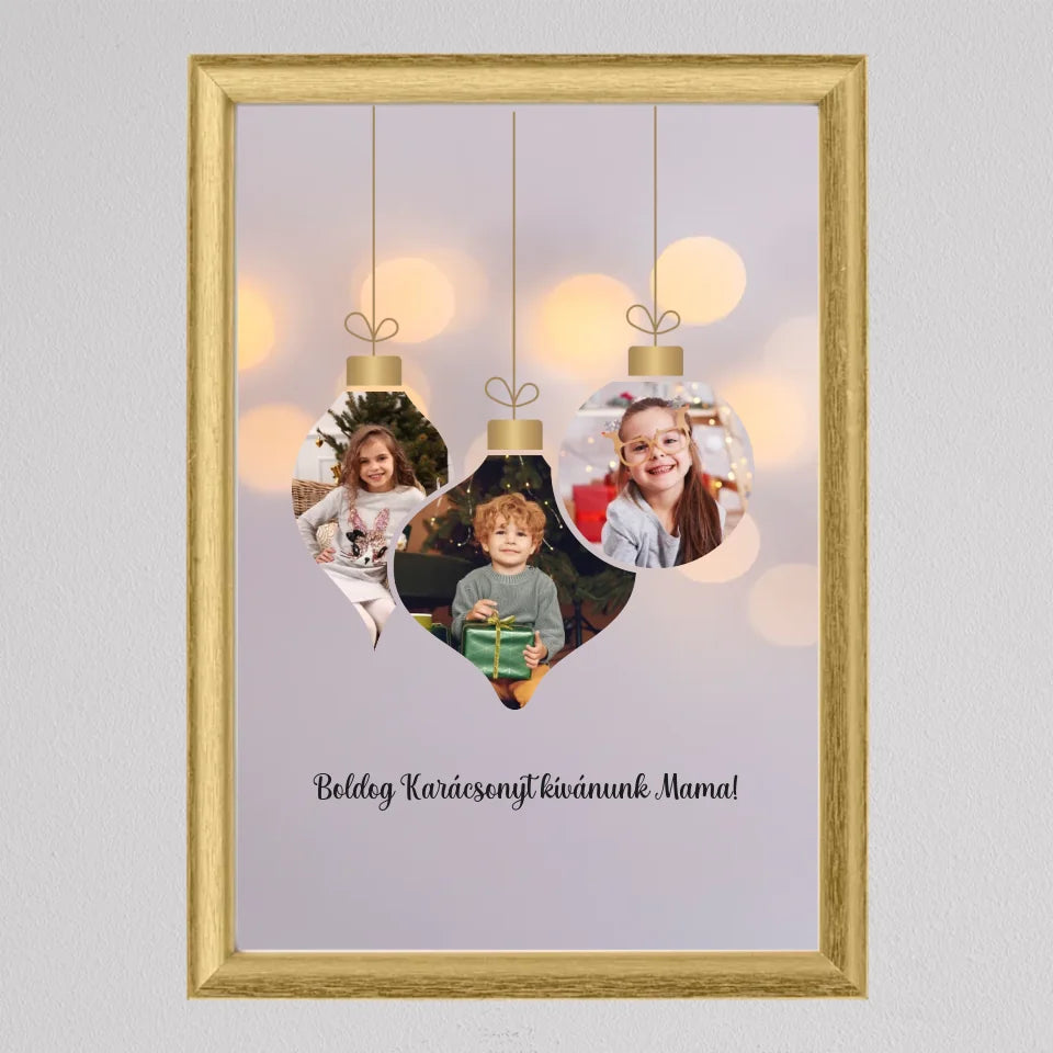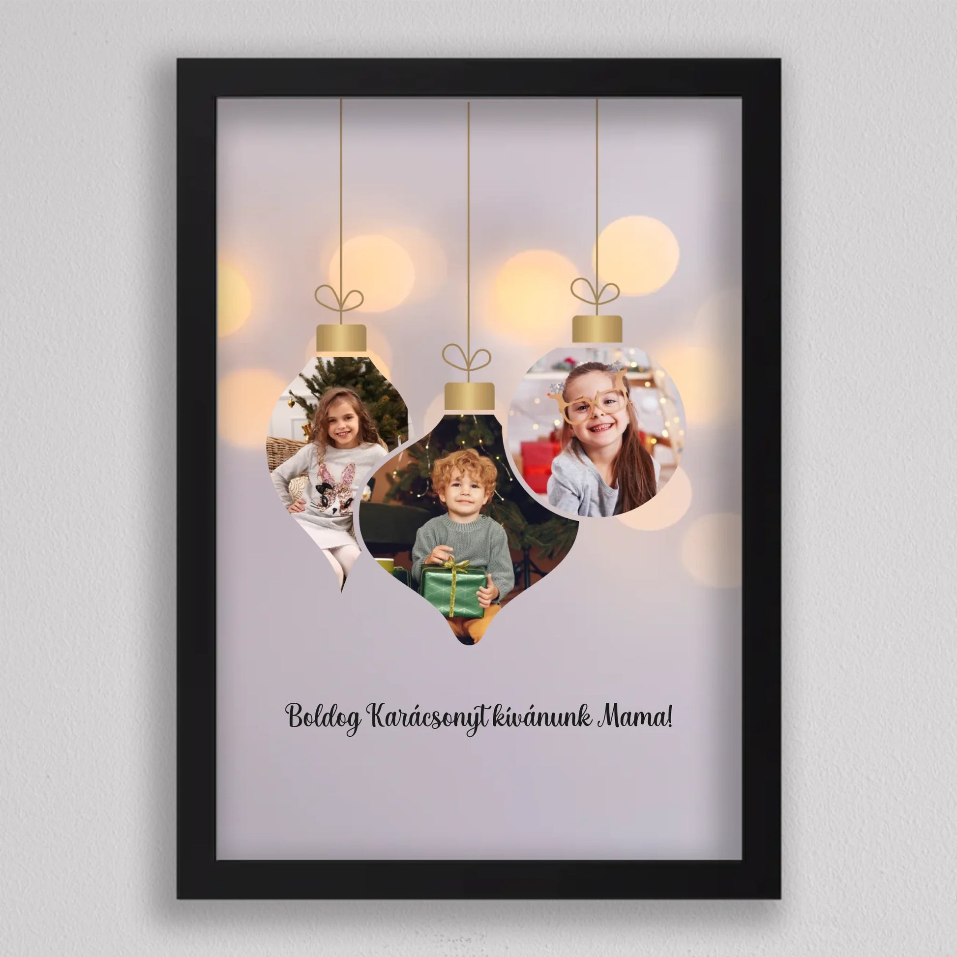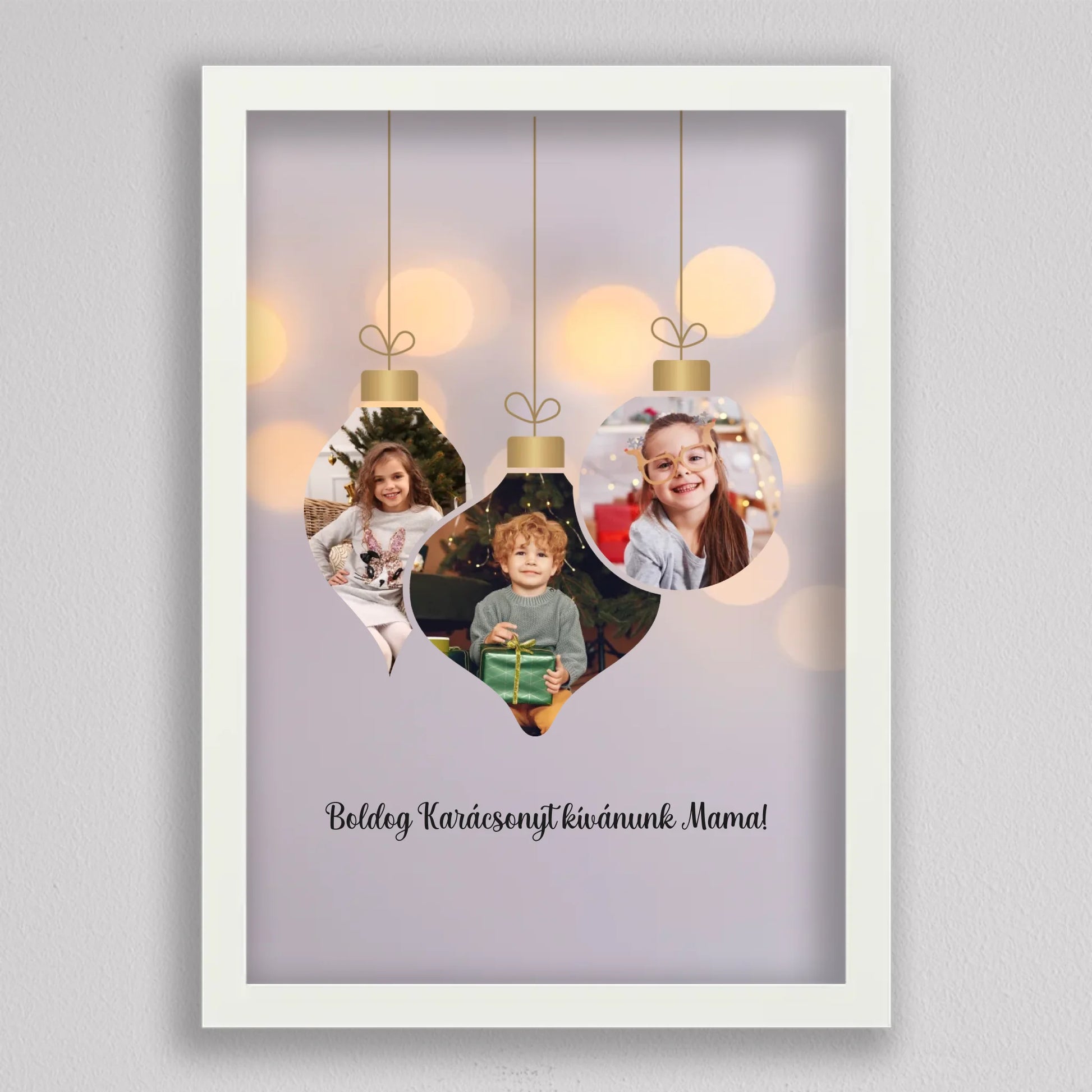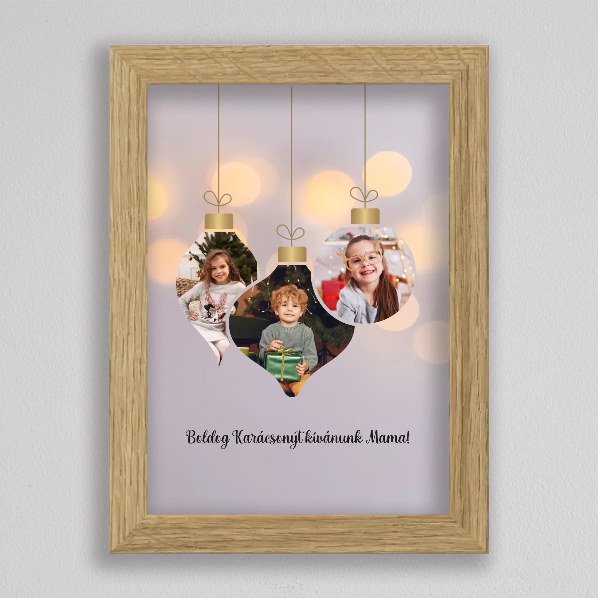A Karácsonyi díszek családi fotókollázs egy gyönyörű, személyre szabható ajándék, amely a legszebb családi pillanatokat örökíti meg az ünnepi hangulatban. A kollázs egyedi karácsonyi díszek formájában jeleníti meg a családtagok fotóit, így tökéletes választás nagymamáknak, szülőknek vagy bármely szeretett személynek karácsonyi ajándékként. A modern, letisztult dizájn mellett lehetőség van személyes üzenet hozzáadására is, hogy az ajándék még különlegesebb legyen. Ideális dekoráció az otthon bármely pontjára, amely melegséget és ünnepi hangulatot sugároz.