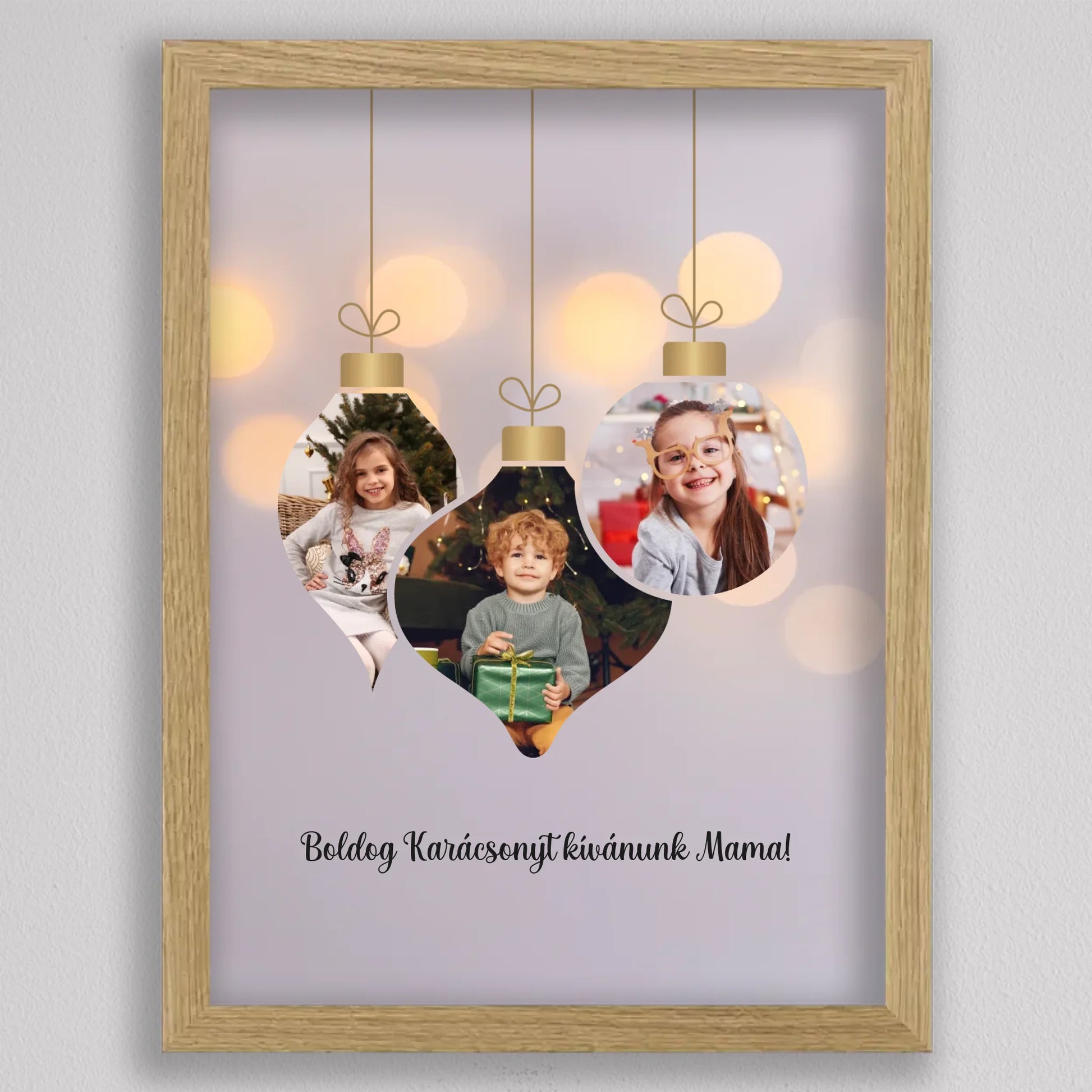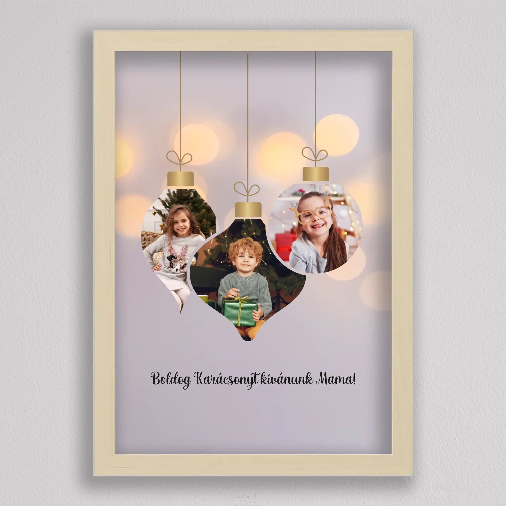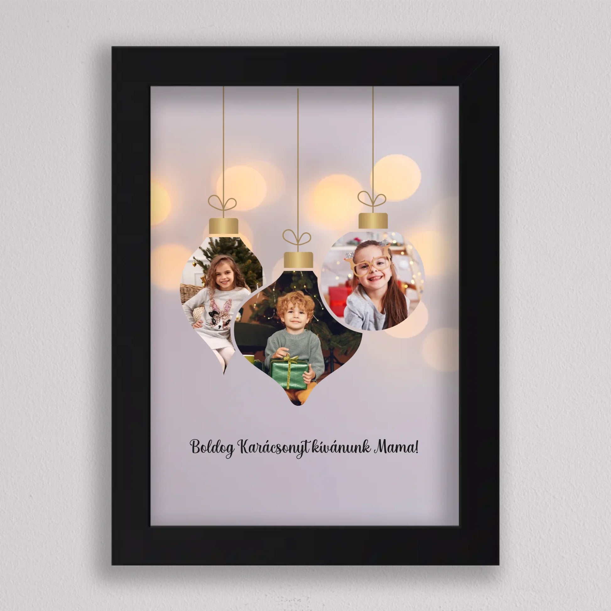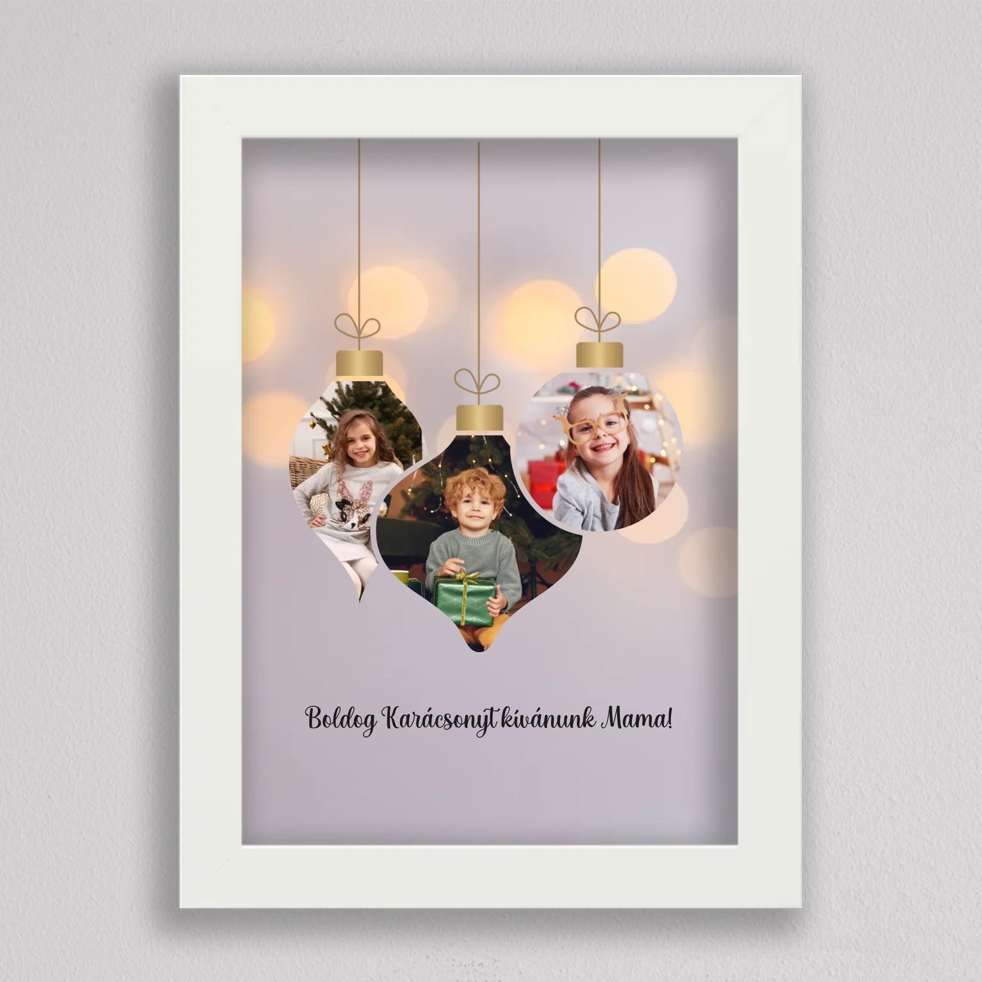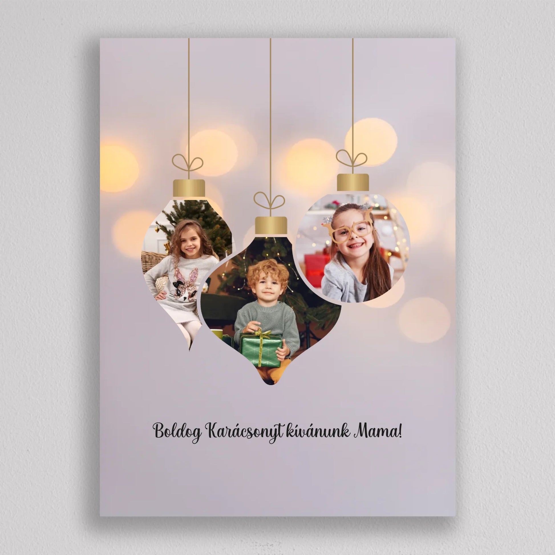 A Karácsonyi díszek családi fotókollázs egy gyönyörű, személyre szabható ajándék, amely a legszebb családi pillanatokat örökíti meg az ünnepi hangulatban. A kollázs egyedi karácsonyi díszek formájában jeleníti meg a családtagok fotóit, így tökéletes választás nagymamáknak, szülőknek vagy bármely szeretett személynek karácsonyi ajándékként. A modern, letisztult dizájn mellett lehetőség van személyes üzenet hozzáadására is, hogy az ajándék még különlegesebb legyen. Ideális dekoráció az otthon bármely pontjára, amely melegséget és ünnepi hangulatot sugároz.