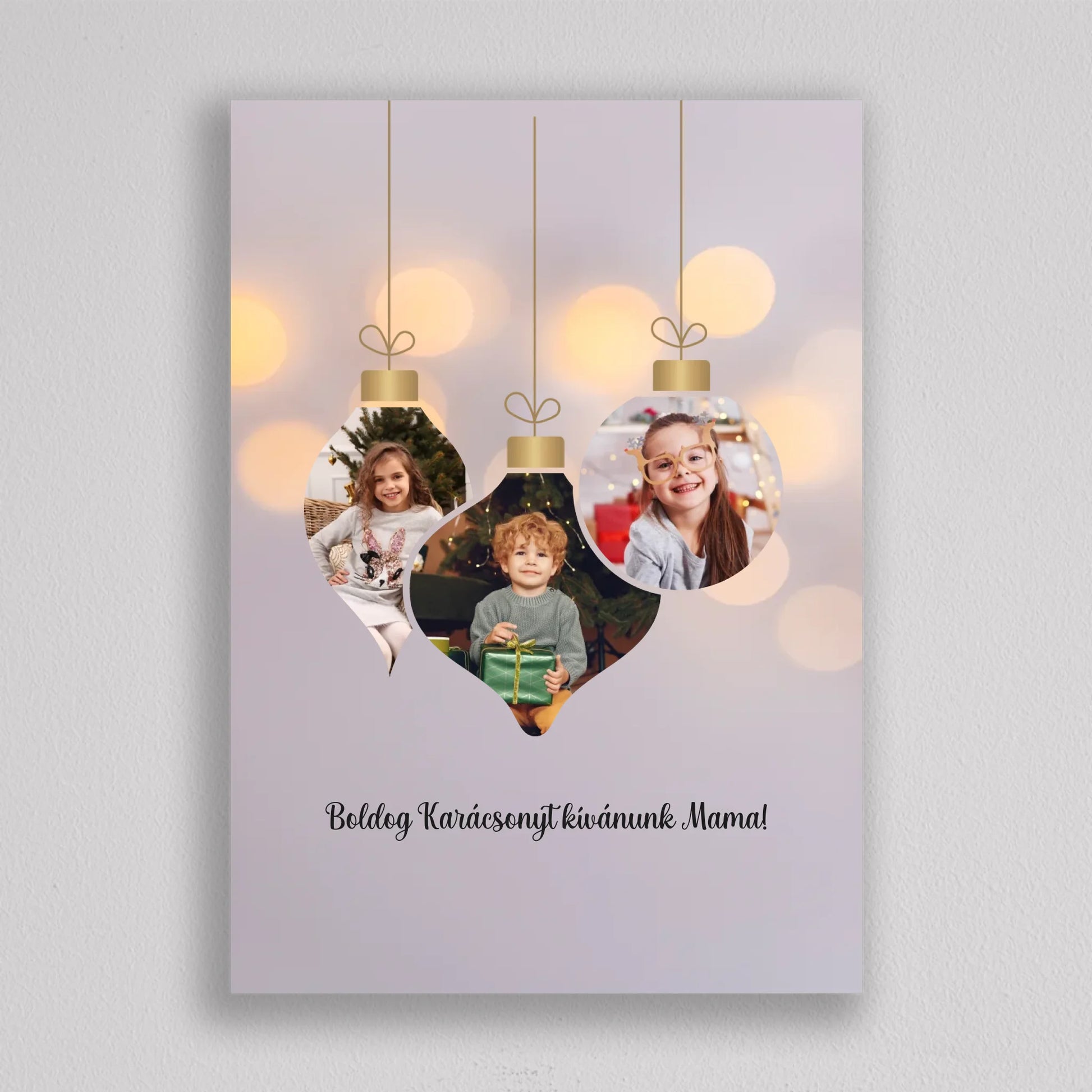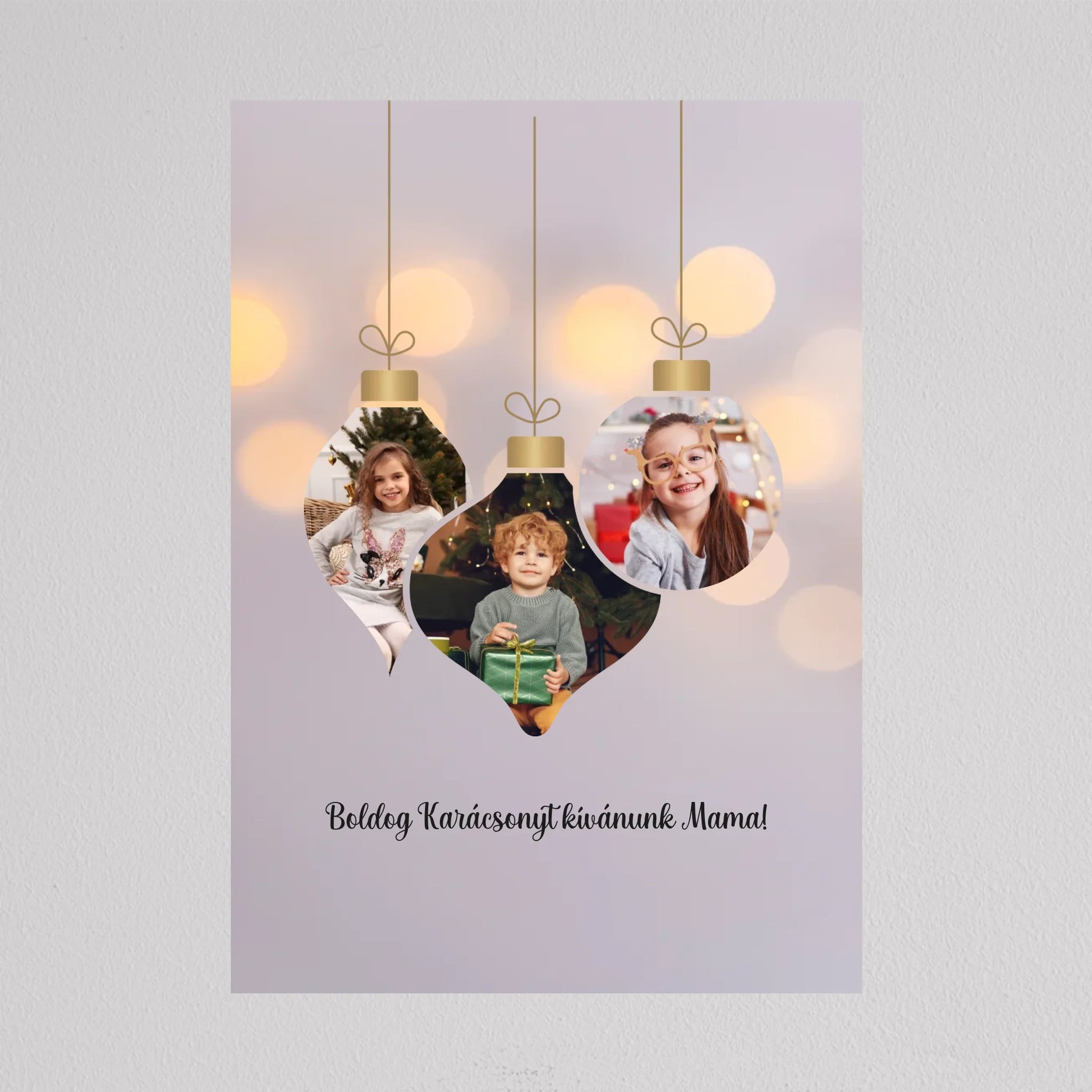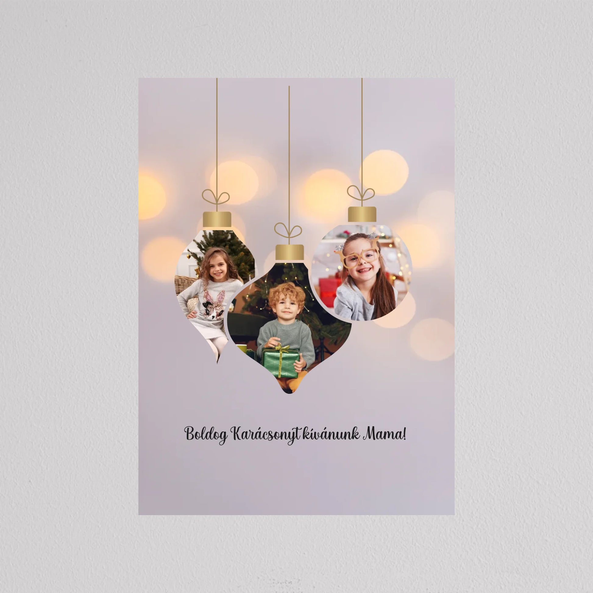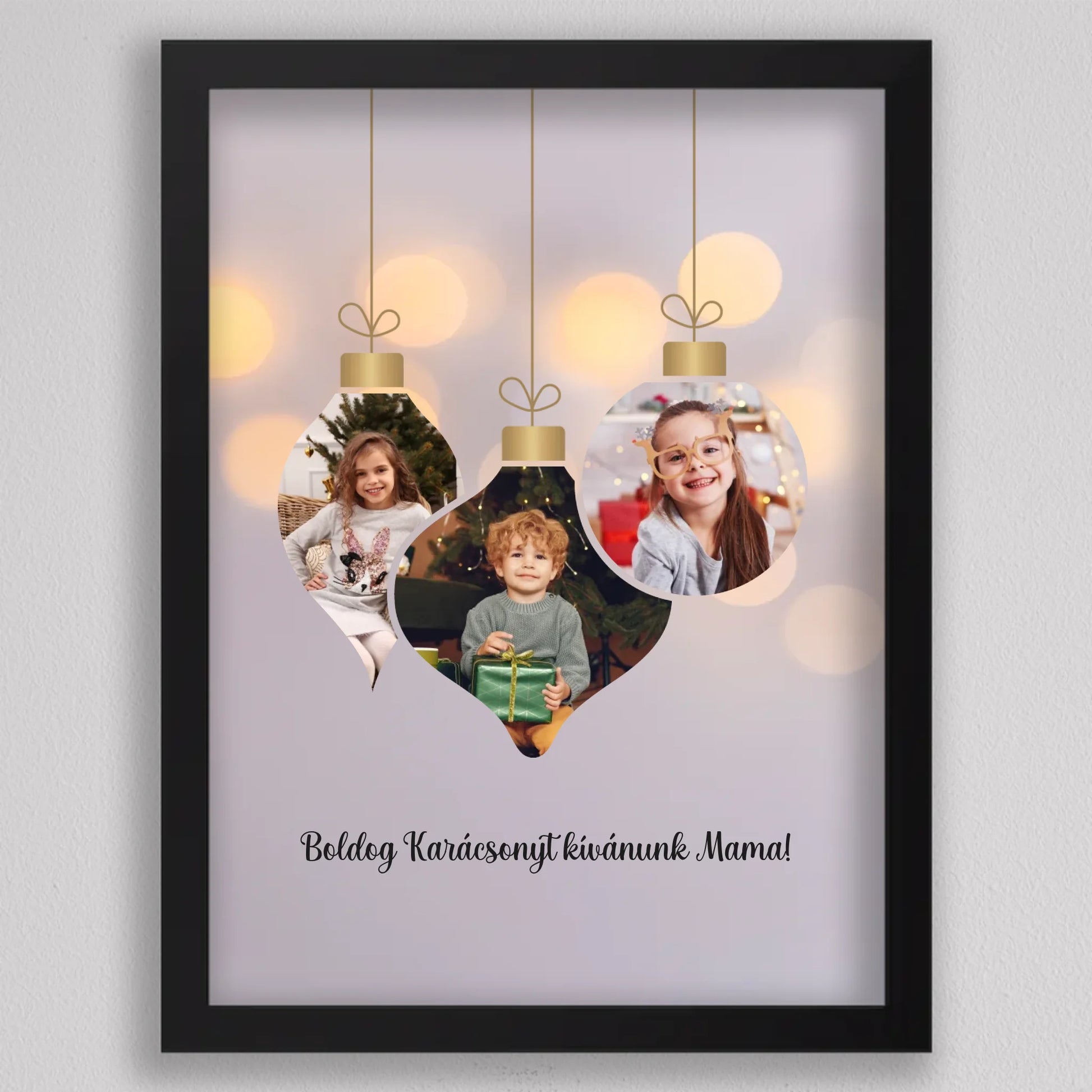 A Karácsonyi díszek családi fotókollázs egy gyönyörű, személyre szabható ajándék, amely a legszebb családi pillanatokat örökíti meg az ünnepi hangulatban. A kollázs egyedi karácsonyi díszek formájában jeleníti meg a családtagok fotóit, így tökéletes választás nagymamáknak, szülőknek vagy bármely szeretett személynek karácsonyi ajándékként. A modern, letisztult dizájn mellett lehetőség van személyes üzenet hozzáadására is, hogy az ajándék még különlegesebb legyen. Ideális dekoráció az otthon bármely pontjára, amely melegséget és ünnepi hangulatot sugároz.