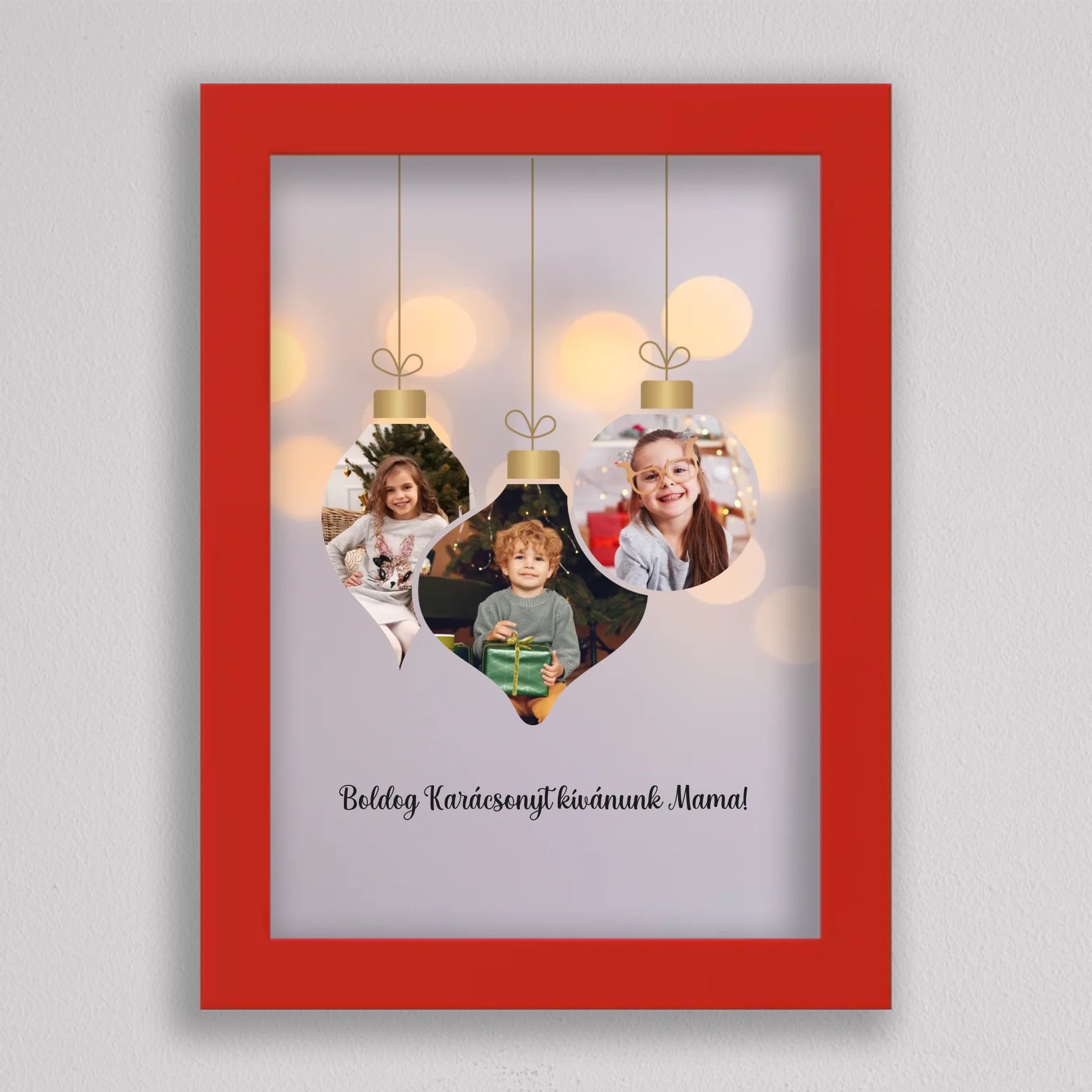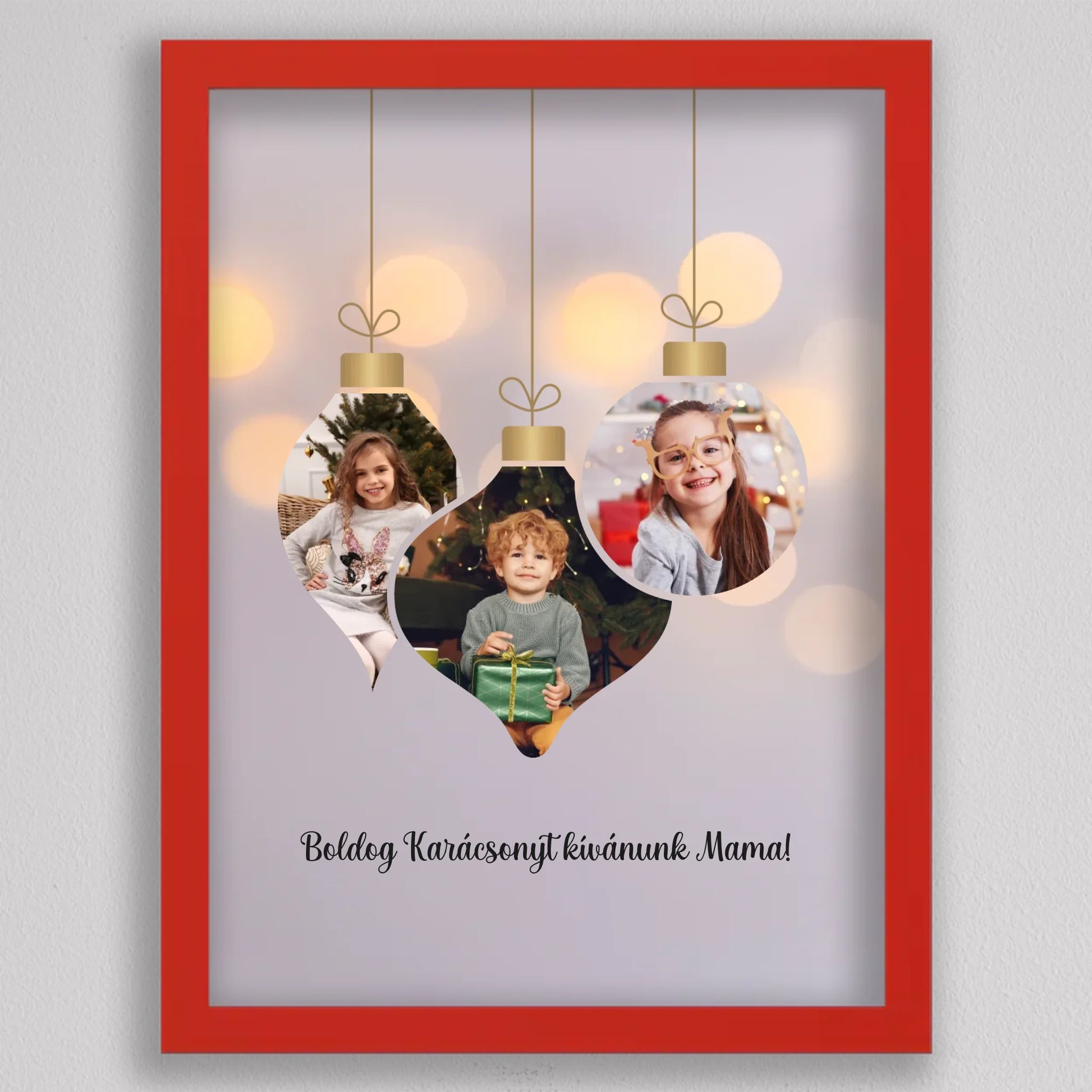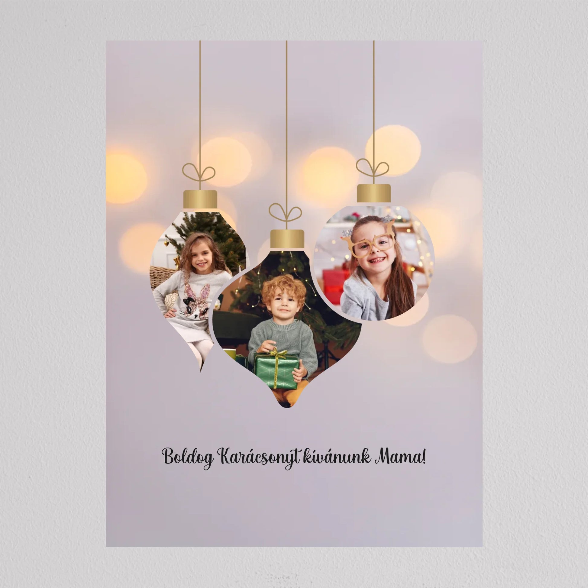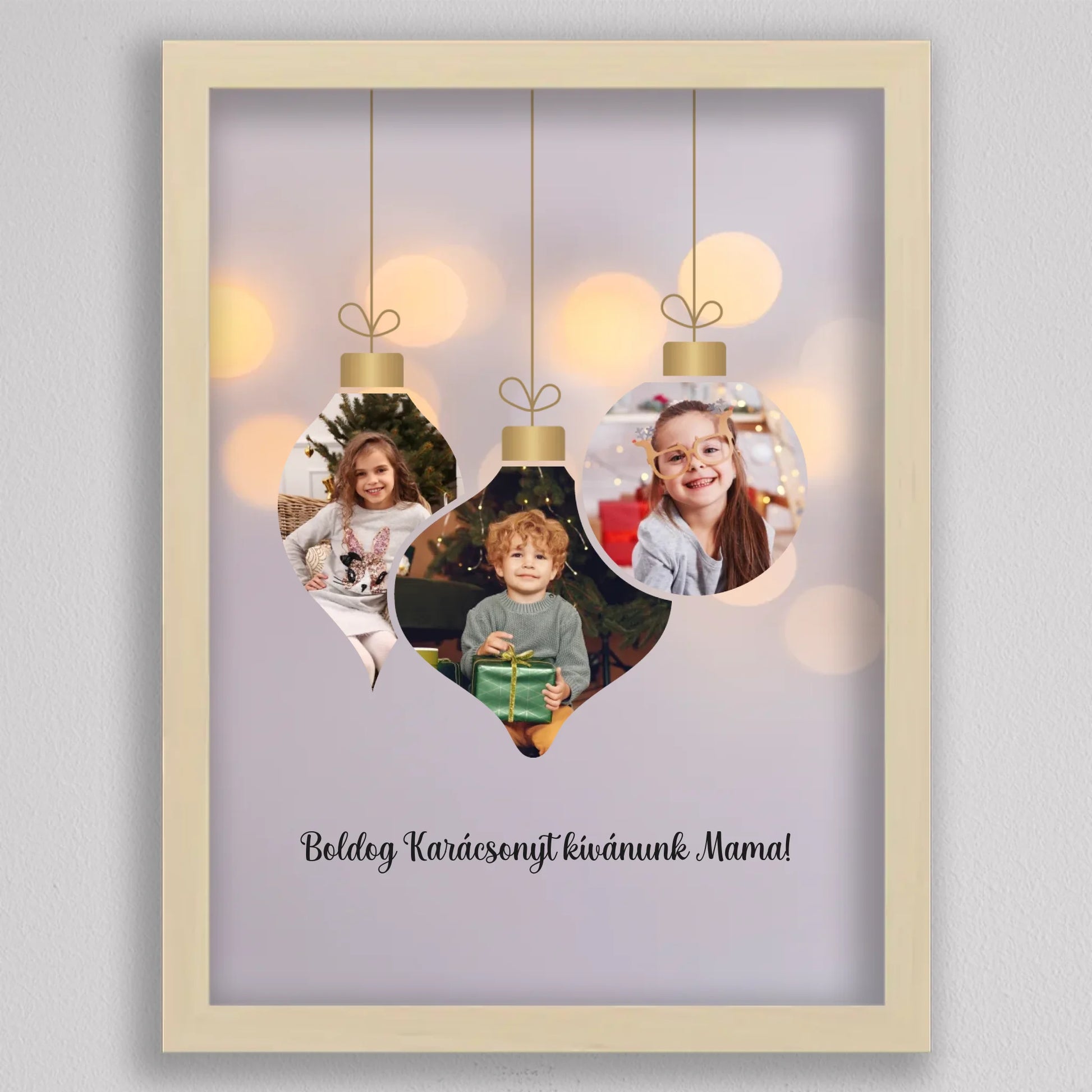 A Karácsonyi díszek családi fotókollázs egy gyönyörű, személyre szabható ajándék, amely a legszebb családi pillanatokat örökíti meg az ünnepi hangulatban. A kollázs egyedi karácsonyi díszek formájában jeleníti meg a családtagok fotóit, így tökéletes választás nagymamáknak, szülőknek vagy bármely szeretett személynek karácsonyi ajándékként. A modern, letisztult dizájn mellett lehetőség van személyes üzenet hozzáadására is, hogy az ajándék még különlegesebb legyen. Ideális dekoráció az otthon bármely pontjára, amely melegséget és ünnepi hangulatot sugároz.