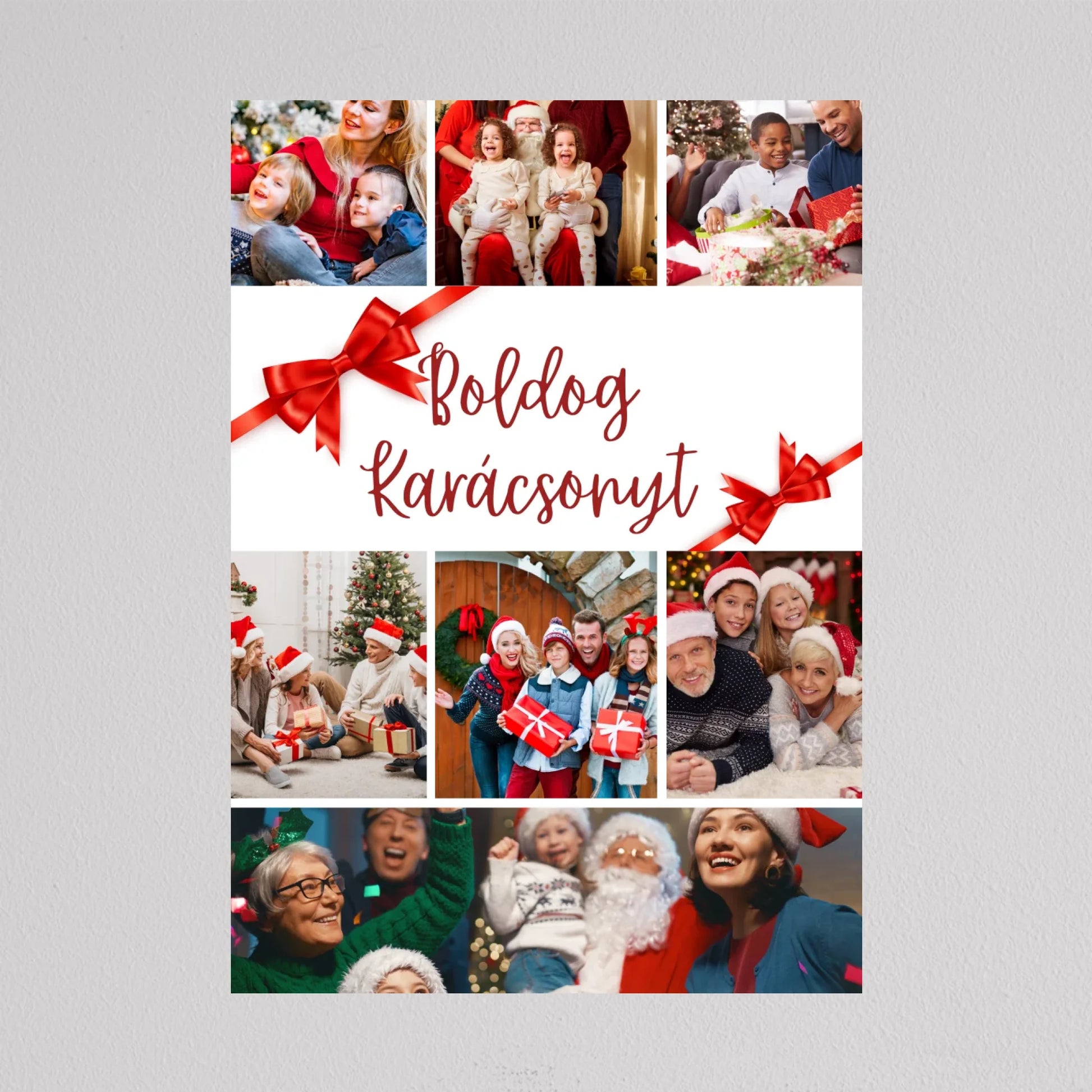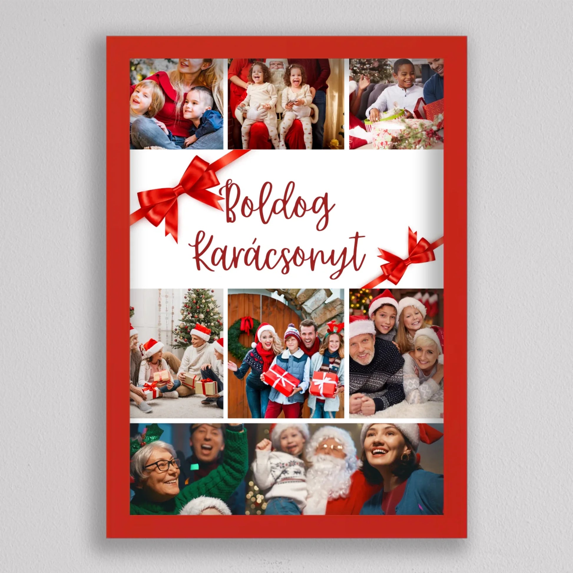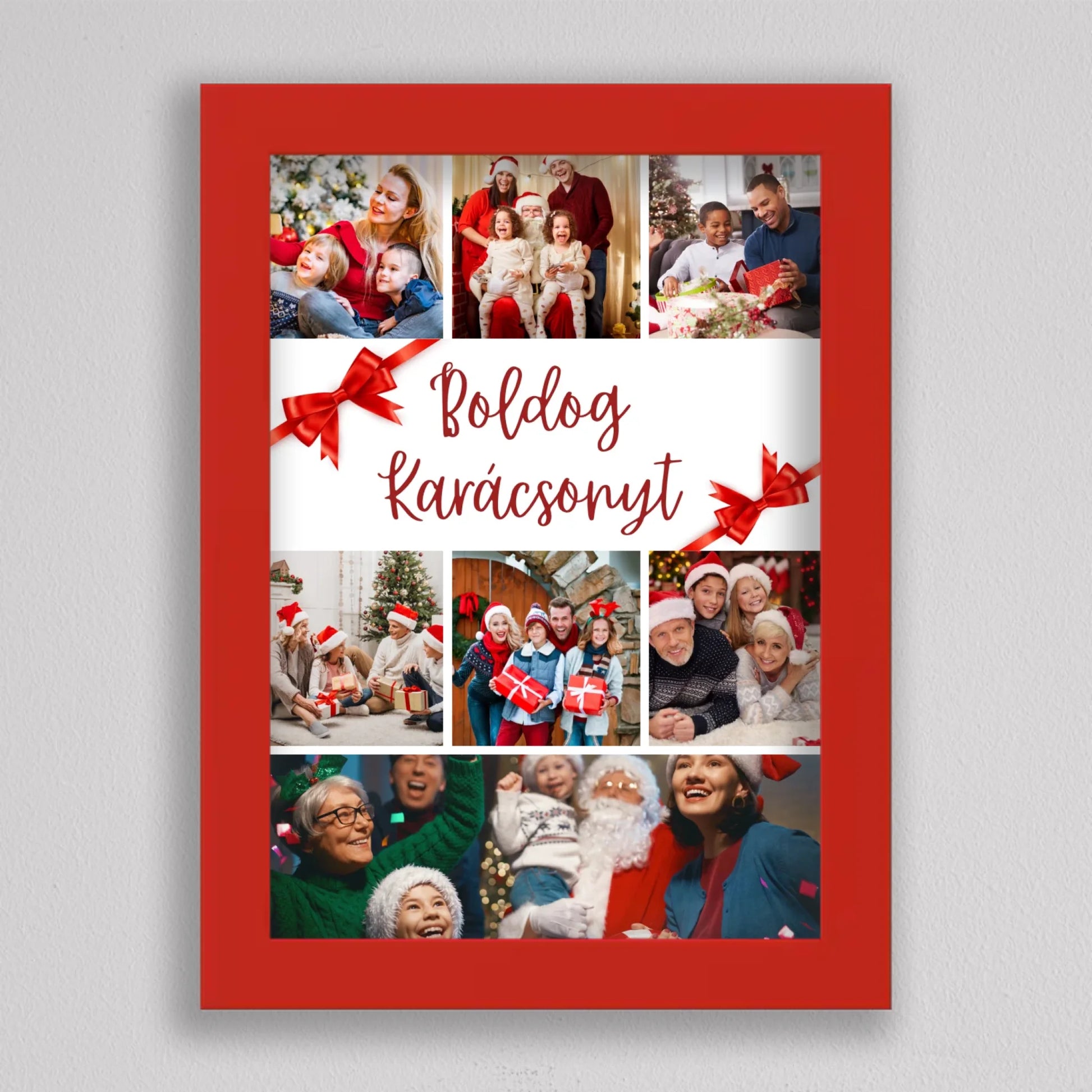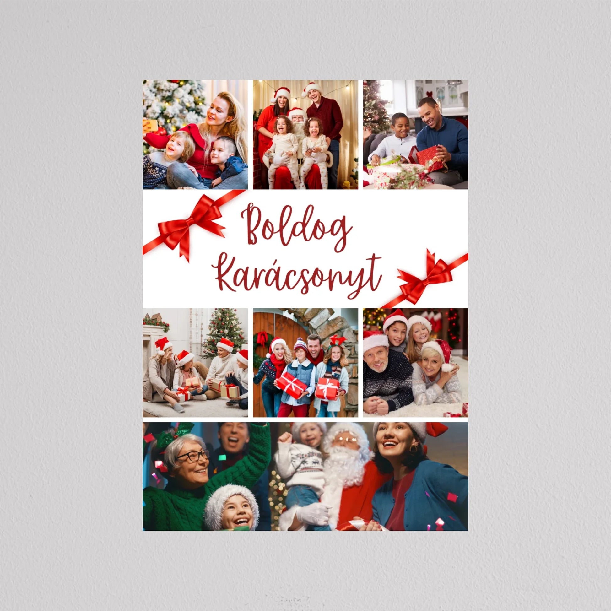 Varázsold újra élővé az ünnepek legszebb pillanatait ezzel az elegáns, személyre szabható karácsonyi fotókollázzsal, amely hét kedvenc fotódat ötvözi egy gyönyörű, ünnepi dizájnban. A piros masnis részlet és a „Boldog Karácsonyt” felirat tökéletesen megidézi az ünnep meghittségét, így ez a kép nemcsak dekoráció, hanem egy szívből jövő emlék is. Ideális ajándék családtagoknak, nagyszülőknek vagy barátoknak – hiszen mi lehetne szebb meglepetés, mint egy közös pillanatokat megörökítő egyedi ajándék?