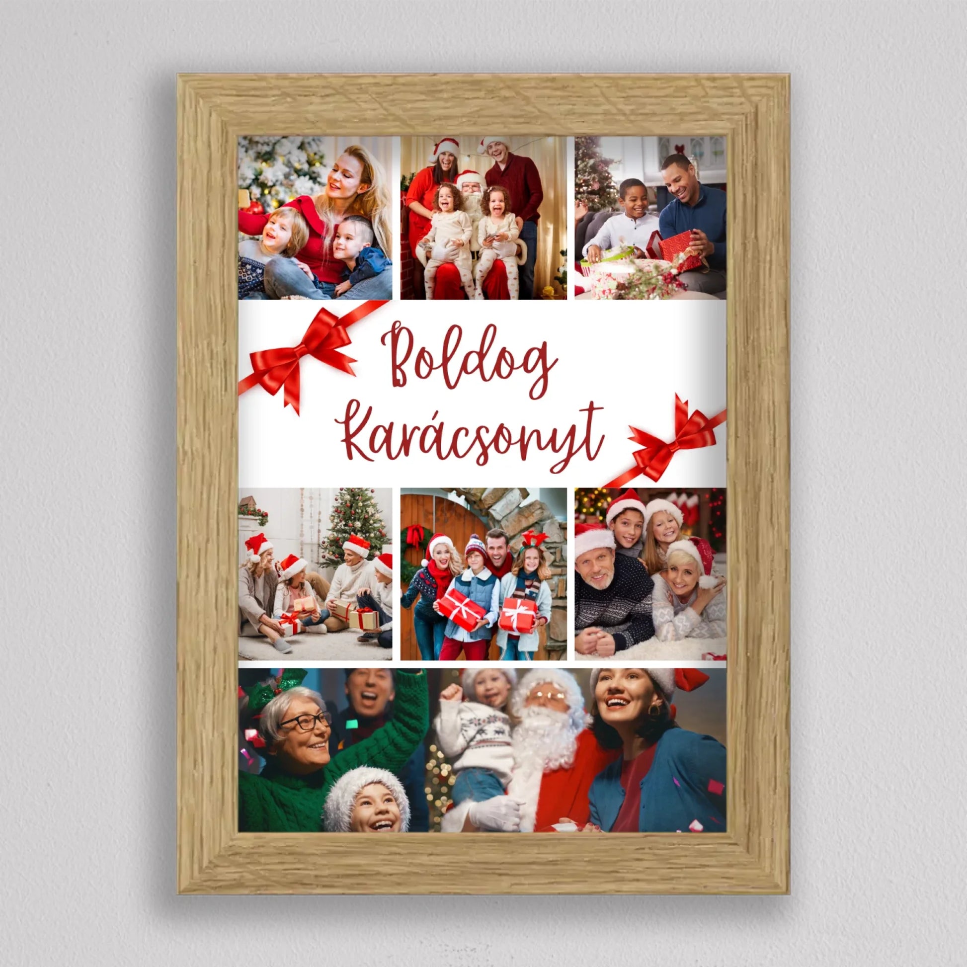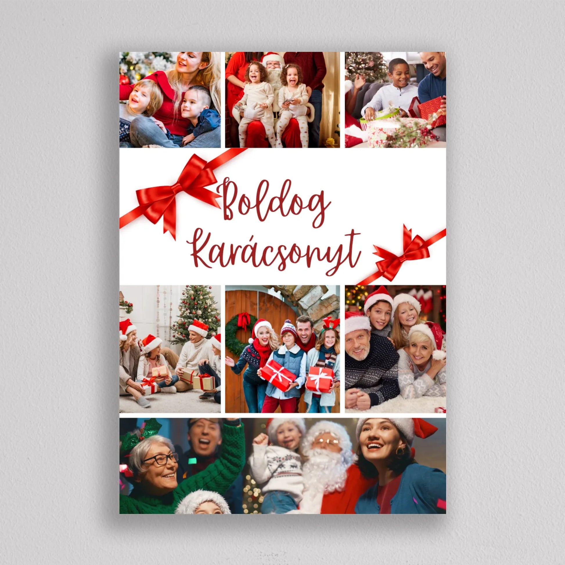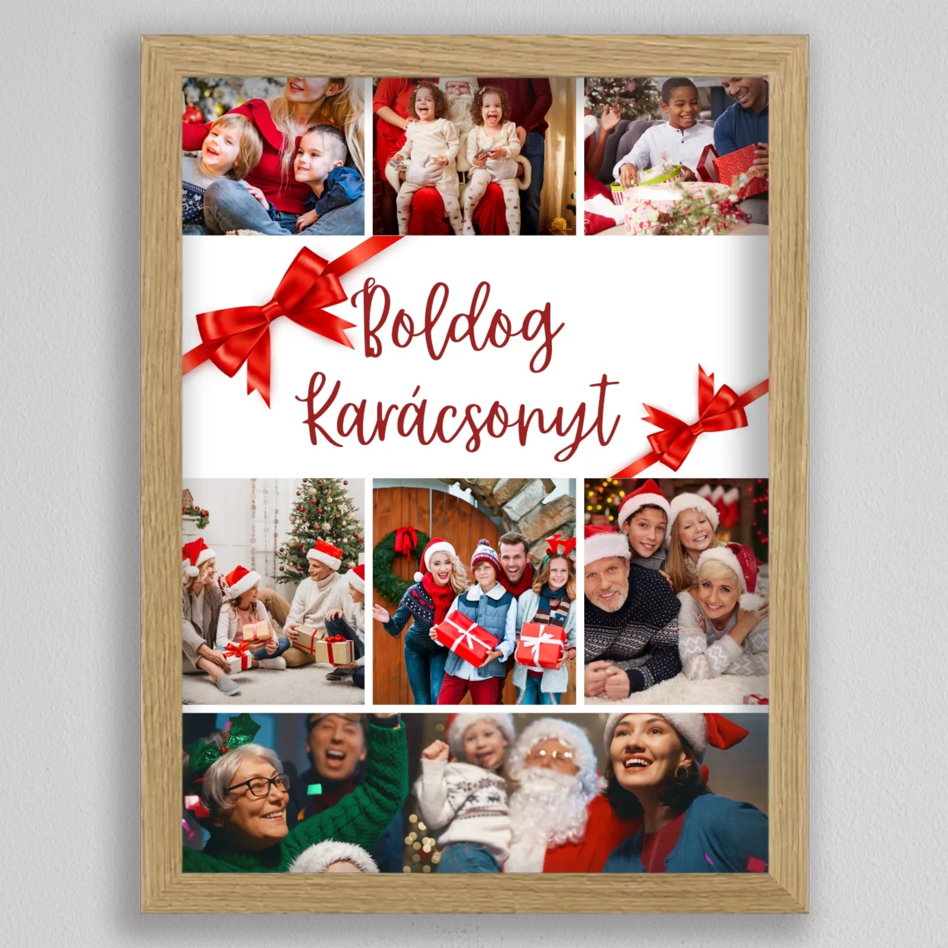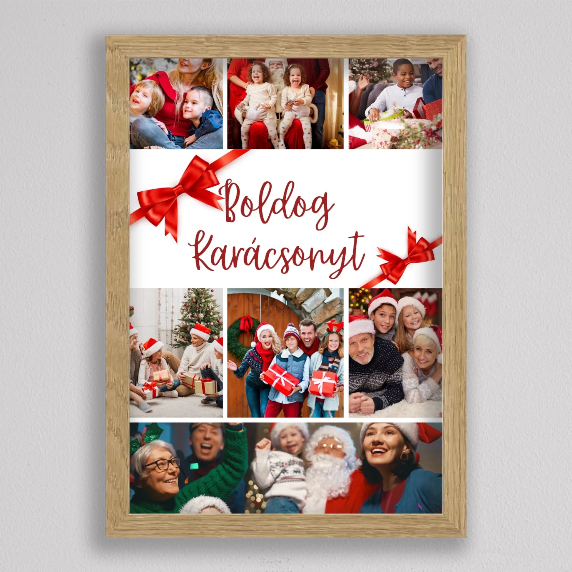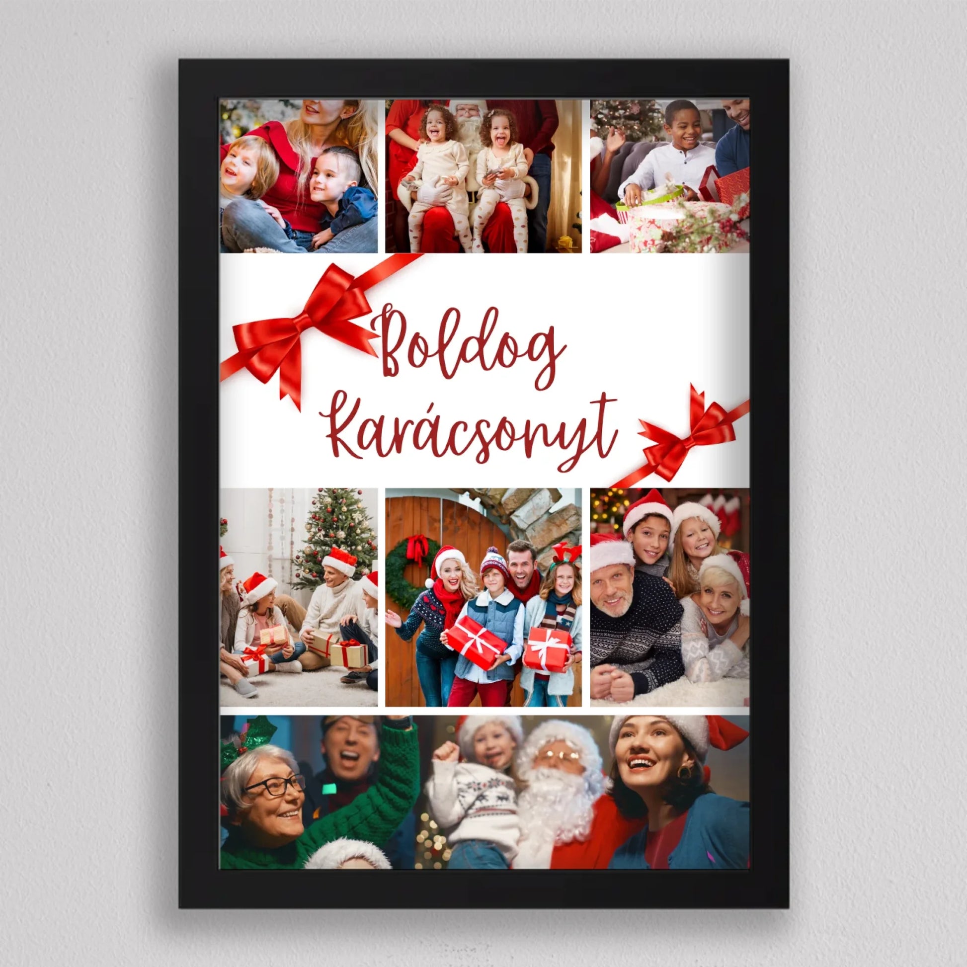 Varázsold újra élővé az ünnepek legszebb pillanatait ezzel az elegáns, személyre szabható karácsonyi fotókollázzsal, amely hét kedvenc fotódat ötvözi egy gyönyörű, ünnepi dizájnban. A piros masnis részlet és a „Boldog Karácsonyt” felirat tökéletesen megidézi az ünnep meghittségét, így ez a kép nemcsak dekoráció, hanem egy szívből jövő emlék is. Ideális ajándék családtagoknak, nagyszülőknek vagy barátoknak – hiszen mi lehetne szebb meglepetés, mint egy közös pillanatokat megörökítő egyedi ajándék?