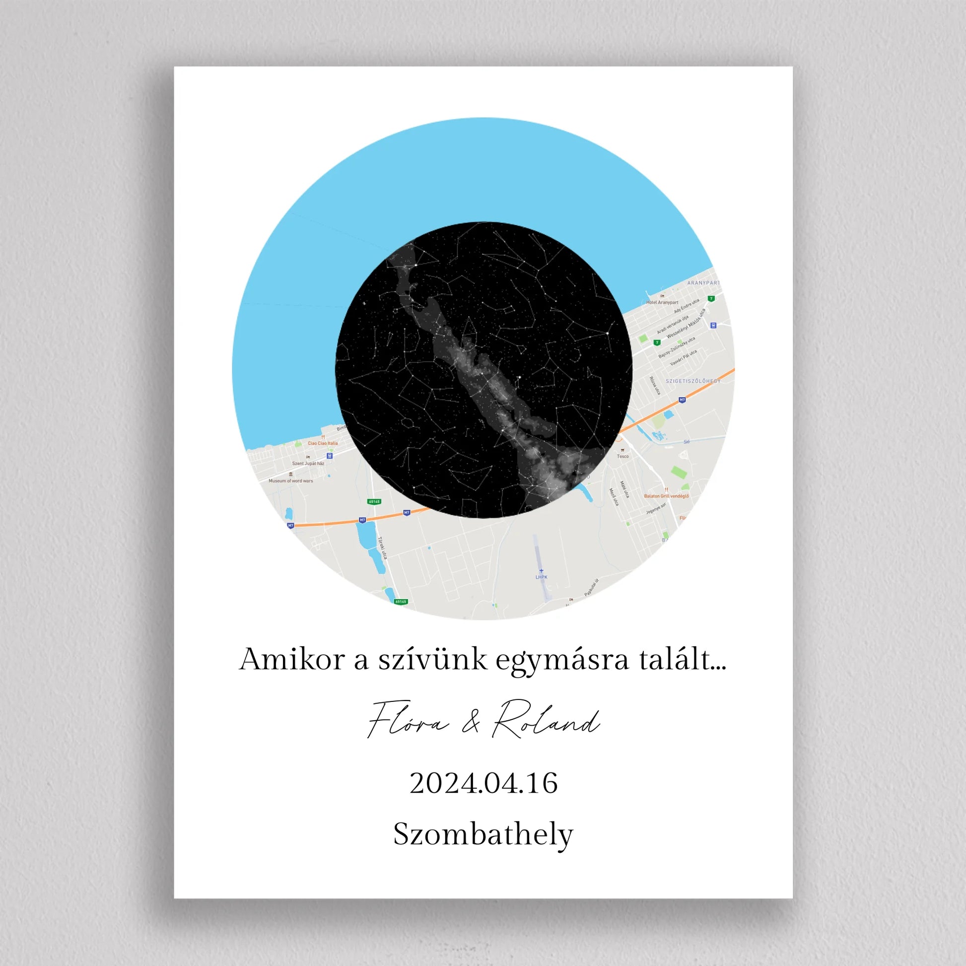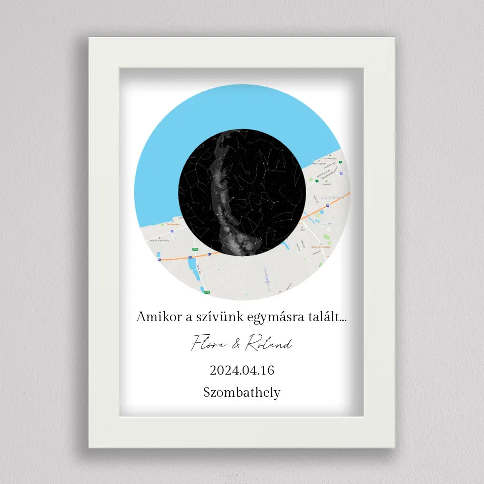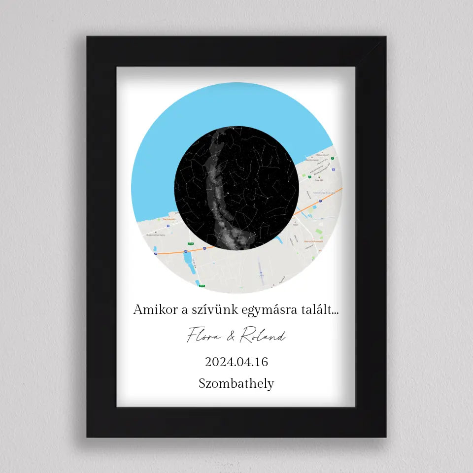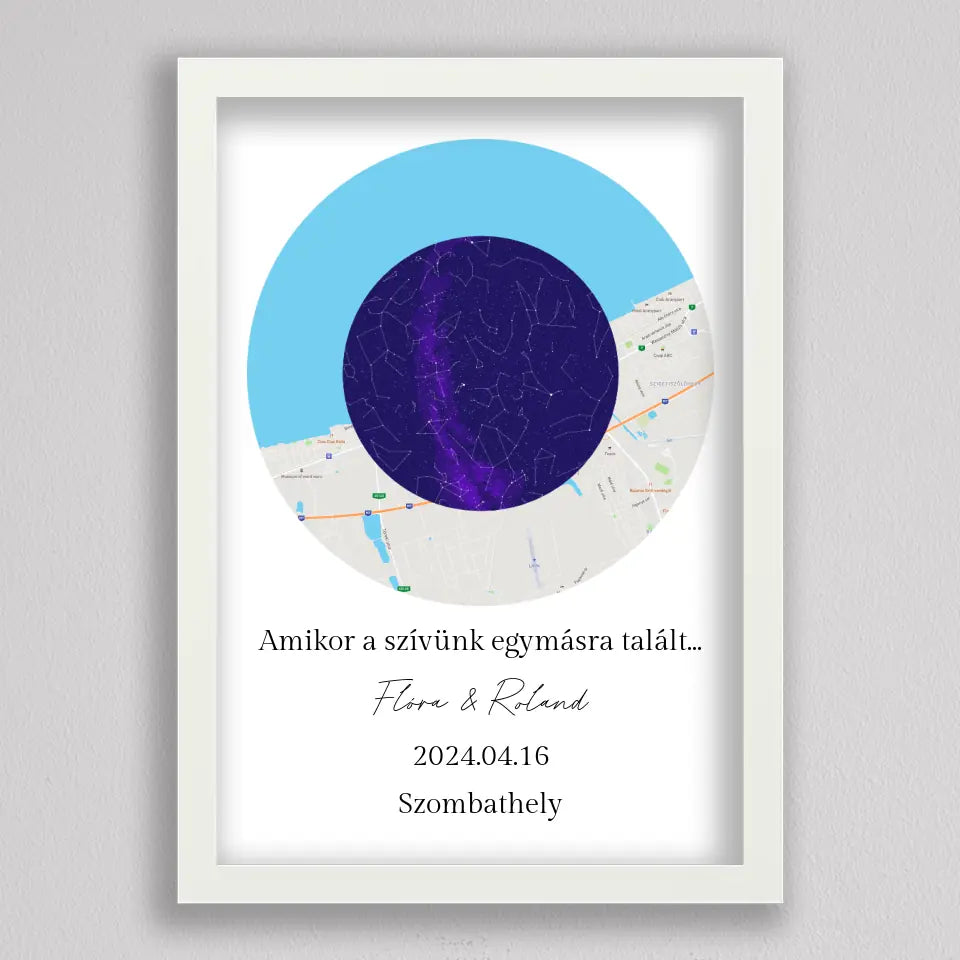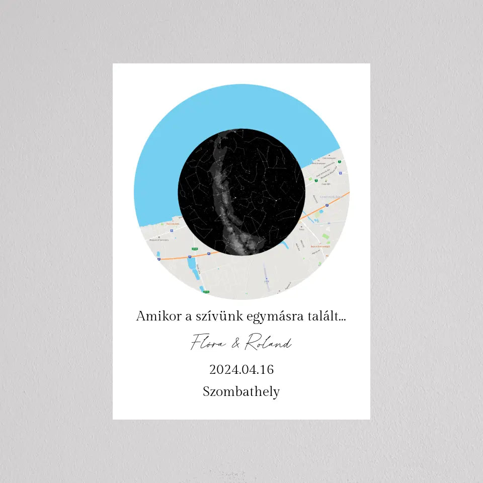 A Kör a körben csillagtérkép és térkép kollázs egy egyedi és különleges ajándék, amely egyszerre örökíti meg a szerelmetek földi és égi pillanatait. Ez a különleges kollázs lehetővé teszi, hogy a választott dátum csillagállása és a kapcsolódó helyszín térképe egy harmonikus kompozícióban egyesüljön. A “kör a körben” dizájn modern és stílusos megjelenést biztosít, amely bármely helyiség falán elegánsan mutat. Ideális ajándék évfordulókra, esküvőkre, vagy bármilyen más különleges alkalomra, amikor egyedi és érzelmileg jelentőségteljes ajándékkal szeretnéd meglepni szeretteidet. Az illusztráció teljes mértékben személyre szabható, hogy még személyesebb legyen az ajándék, amely örökre megőrzi a legszebb közös emlékeket.