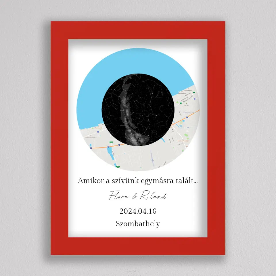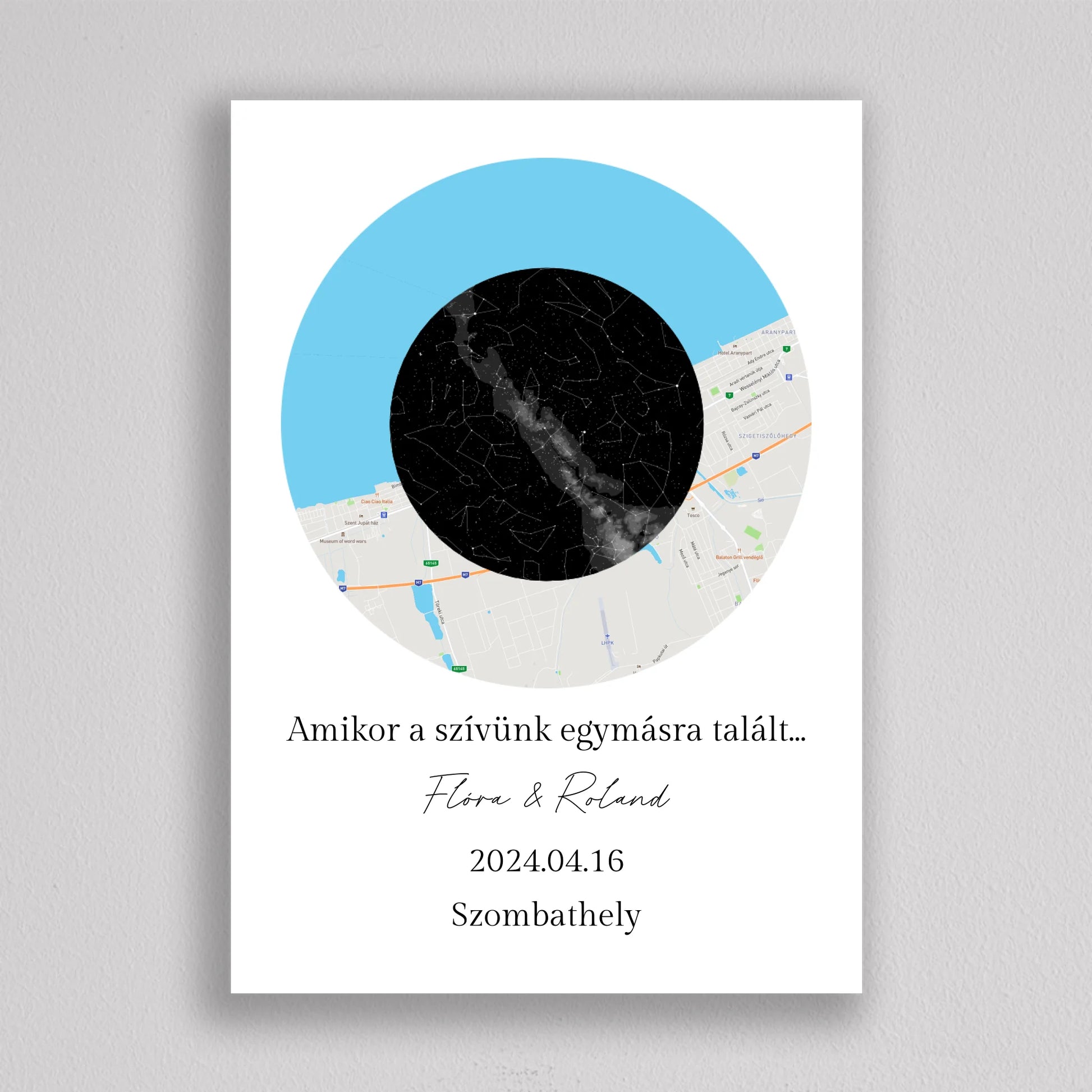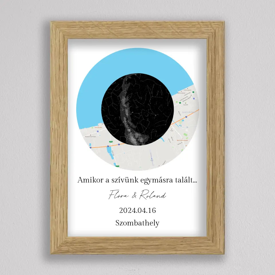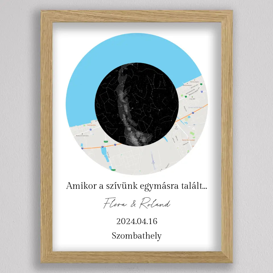 A Kör a körben csillagtérkép és térkép kollázs egy egyedi és különleges ajándék, amely egyszerre örökíti meg a szerelmetek földi és égi pillanatait. Ez a különleges kollázs lehetővé teszi, hogy a választott dátum csillagállása és a kapcsolódó helyszín térképe egy harmonikus kompozícióban egyesüljön. A “kör a körben” dizájn modern és stílusos megjelenést biztosít, amely bármely helyiség falán elegánsan mutat. Ideális ajándék évfordulókra, esküvőkre, vagy bármilyen más különleges alkalomra, amikor egyedi és érzelmileg jelentőségteljes ajándékkal szeretnéd meglepni szeretteidet. Az illusztráció teljes mértékben személyre szabható, hogy még személyesebb legyen az ajándék, amely örökre megőrzi a legszebb közös emlékeket.