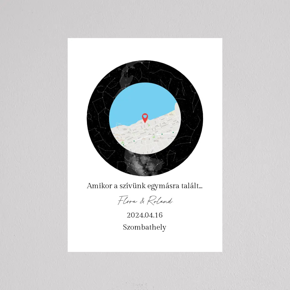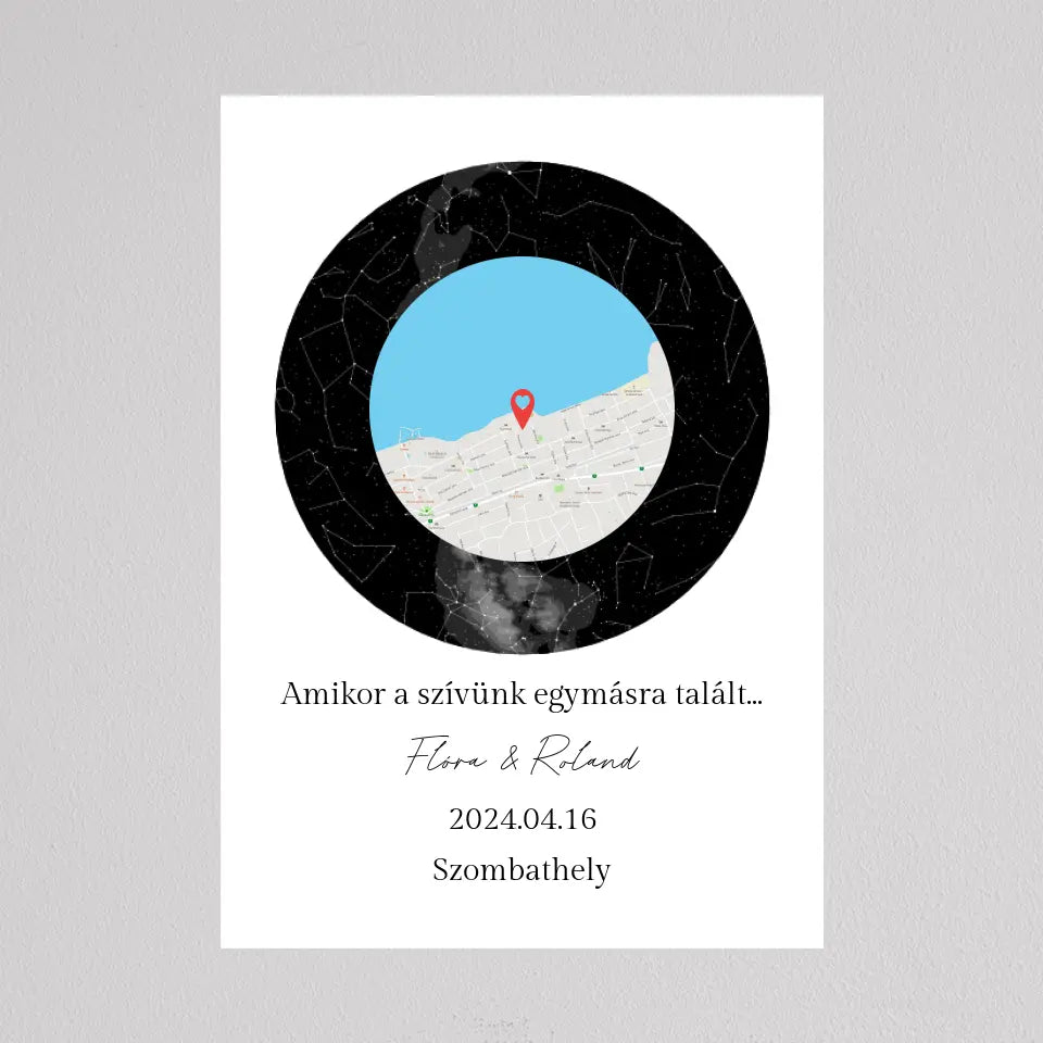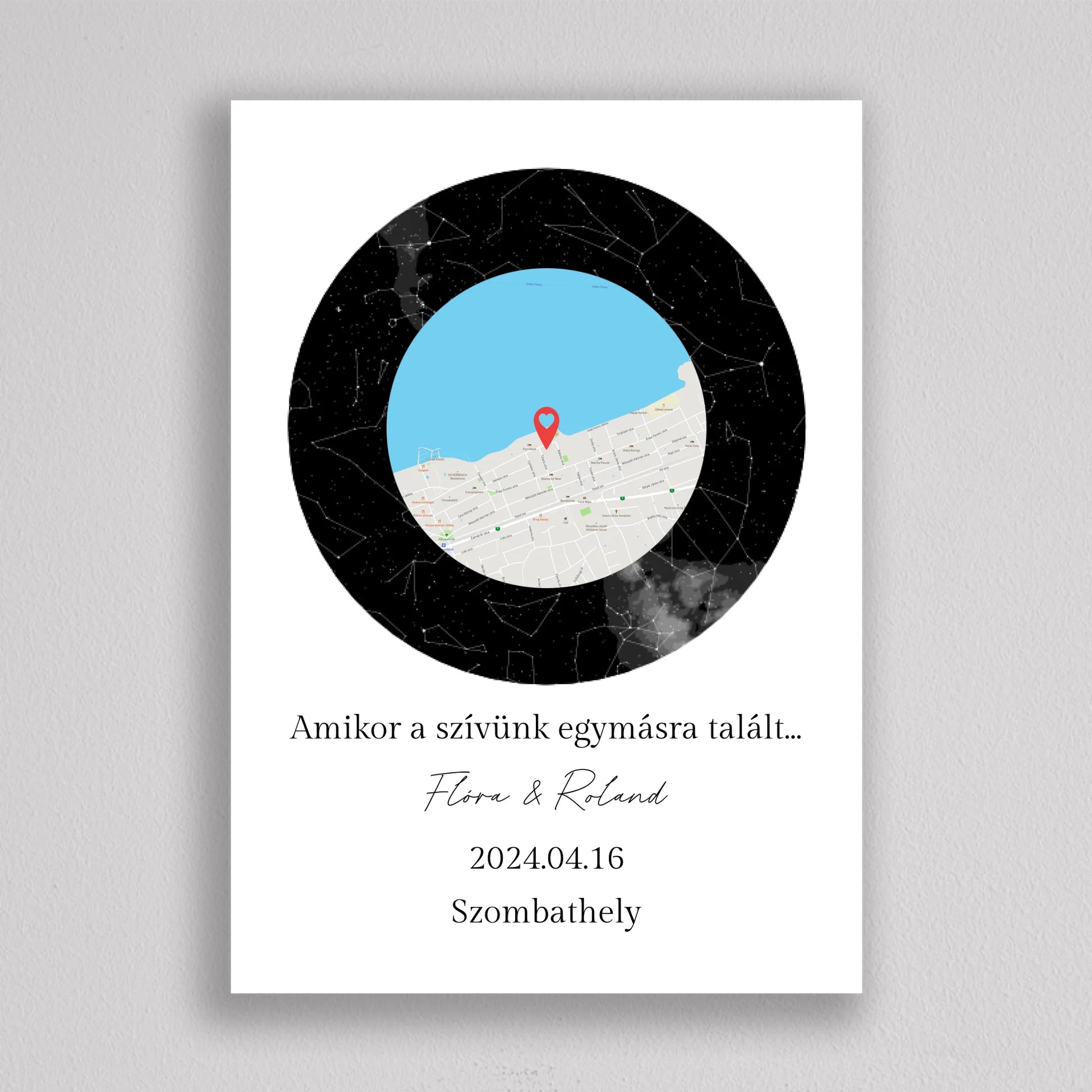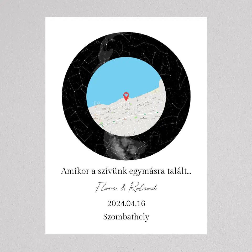 Az Emlékek Összefonódása csillagtérkép és térkép kollázs egy egyedi és különleges ajándék, amely ötvözi a romantikus csillagtérkép és a személyre szabott térkép varázsát. Ez a különleges kollázs lehetővé teszi, hogy egy adott dátum csillagállását és a hozzá tartozó földrajzi helyet egyszerre örökítsd meg, ezzel mély érzelmi kötődést kifejezve. A “kör a körben” dizájn modern és letisztult megjelenést kölcsönöz a műnek, amely tökéletesen illik bármely otthon falára. Ideális választás évfordulóra, esküvőre, vagy bármilyen különleges alkalomra, amikor emlékezetes ajándékot szeretnél adni, amely örökre megőrzi a legkedvesebb pillanatokat. Az illusztráció teljes mértékben személyre szabható, így még egyedibbé teheted ezt a gyönyörű műalkotást.