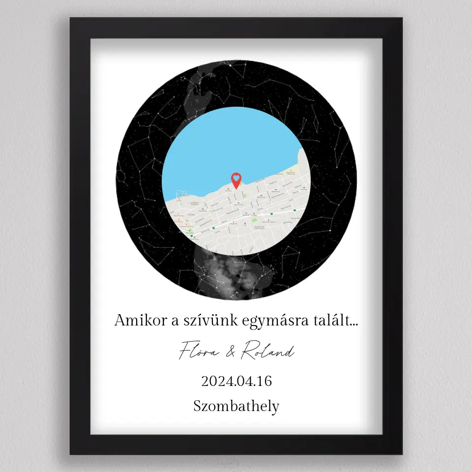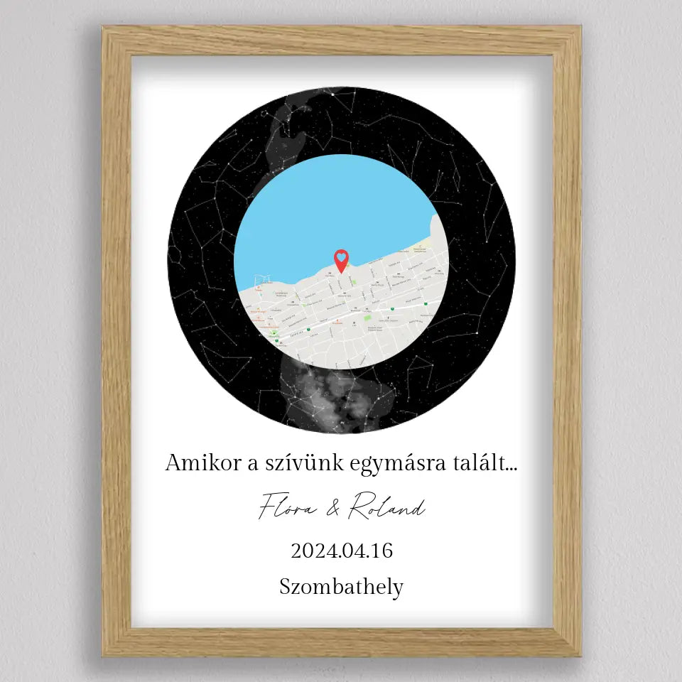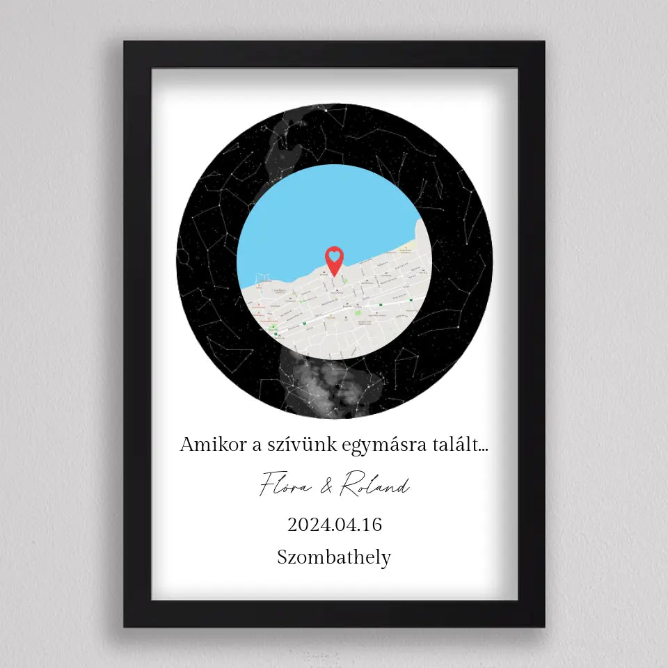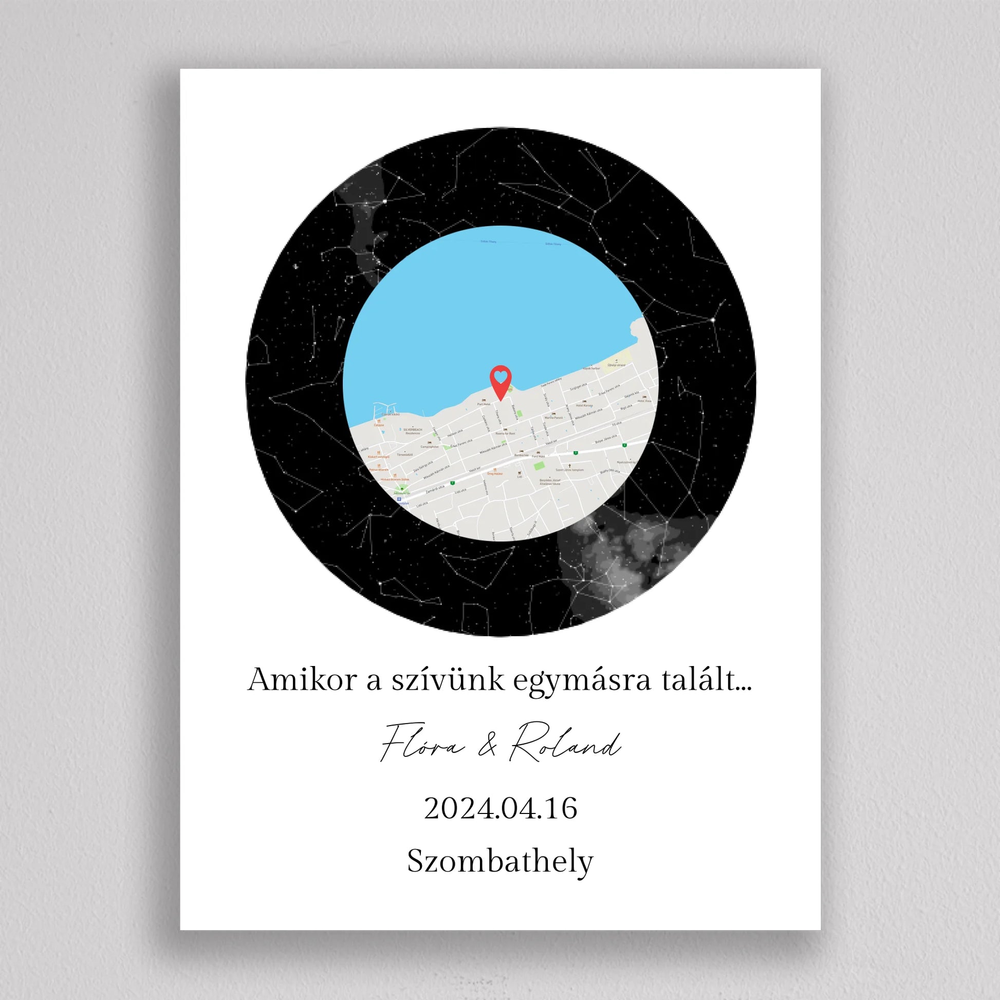 Az Emlékek Összefonódása csillagtérkép és térkép kollázs egy egyedi és különleges ajándék, amely ötvözi a romantikus csillagtérkép és a személyre szabott térkép varázsát. Ez a különleges kollázs lehetővé teszi, hogy egy adott dátum csillagállását és a hozzá tartozó földrajzi helyet egyszerre örökítsd meg, ezzel mély érzelmi kötődést kifejezve. A “kör a körben” dizájn modern és letisztult megjelenést kölcsönöz a műnek, amely tökéletesen illik bármely otthon falára. Ideális választás évfordulóra, esküvőre, vagy bármilyen különleges alkalomra, amikor emlékezetes ajándékot szeretnél adni, amely örökre megőrzi a legkedvesebb pillanatokat. Az illusztráció teljes mértékben személyre szabható, így még egyedibbé teheted ezt a gyönyörű műalkotást.