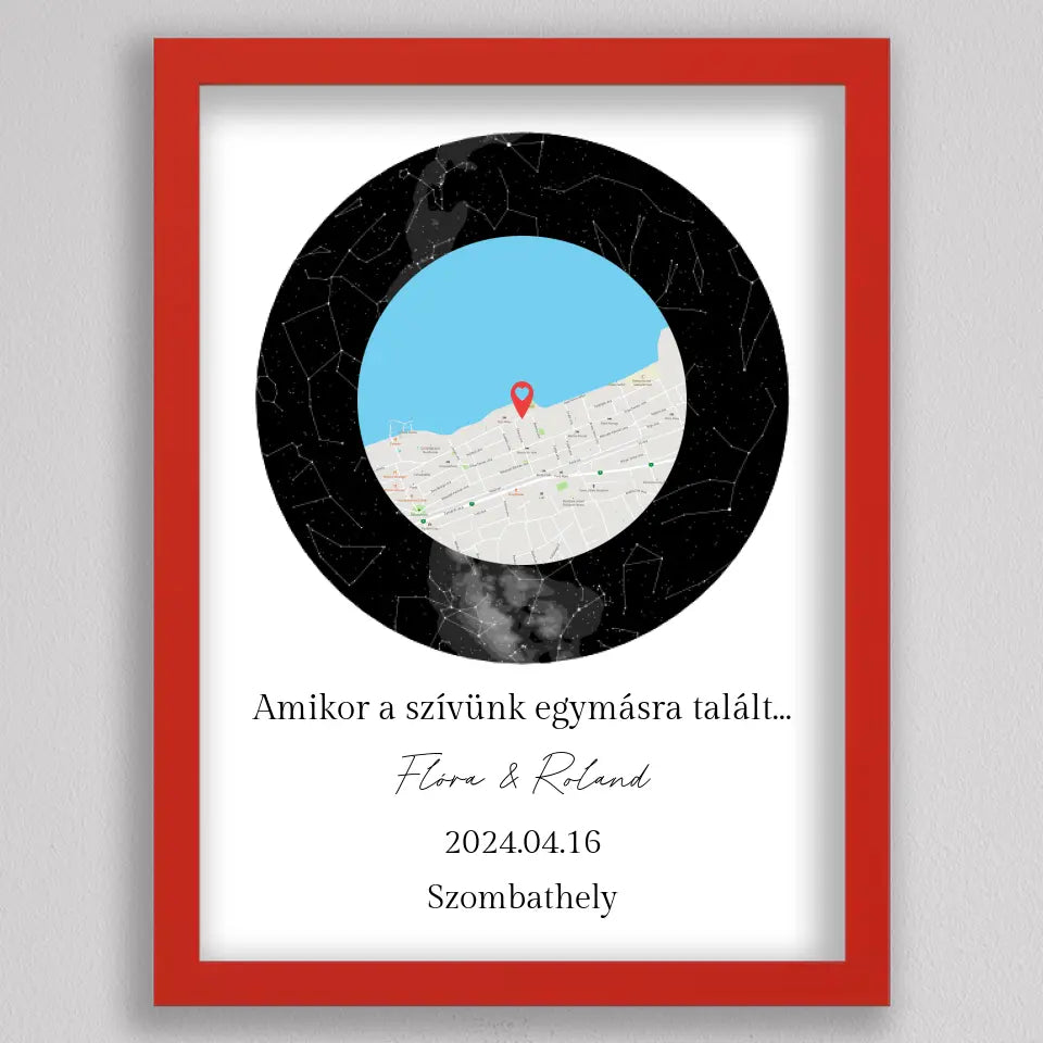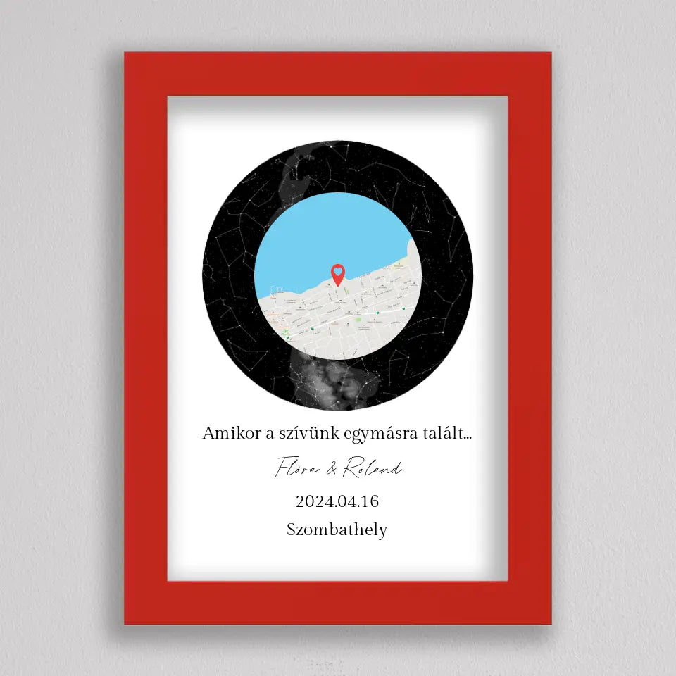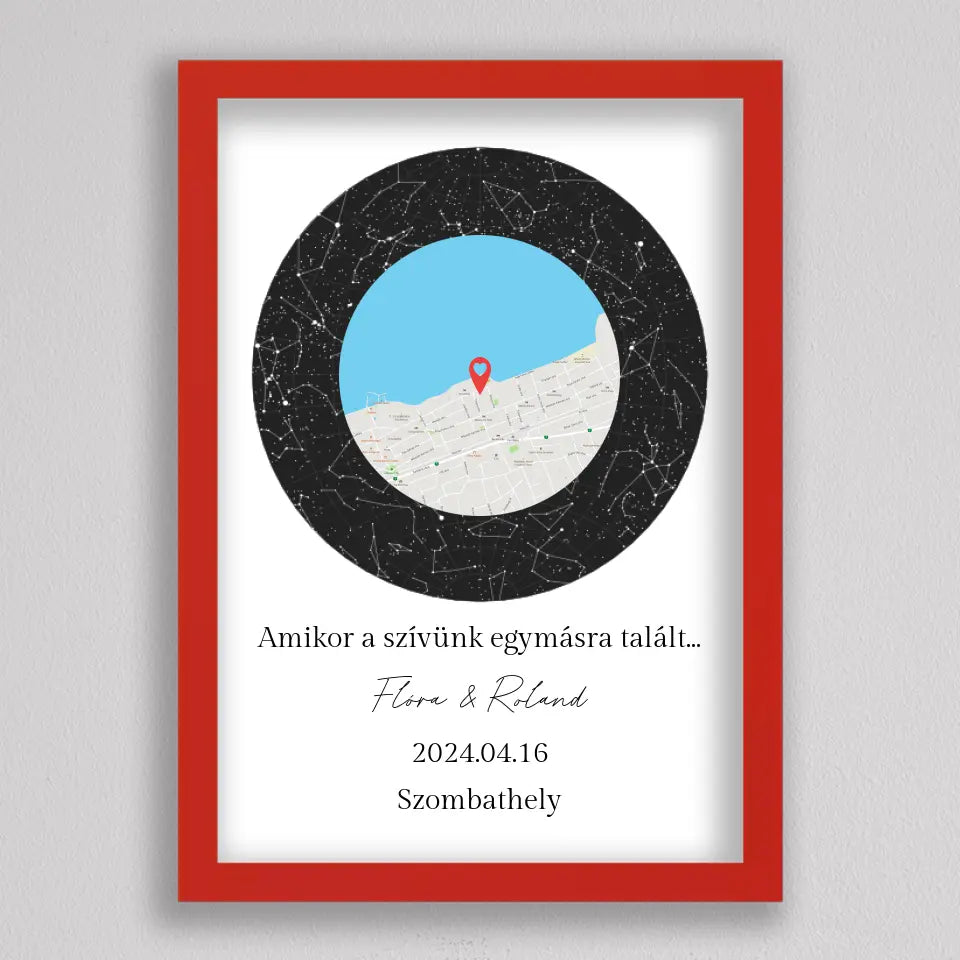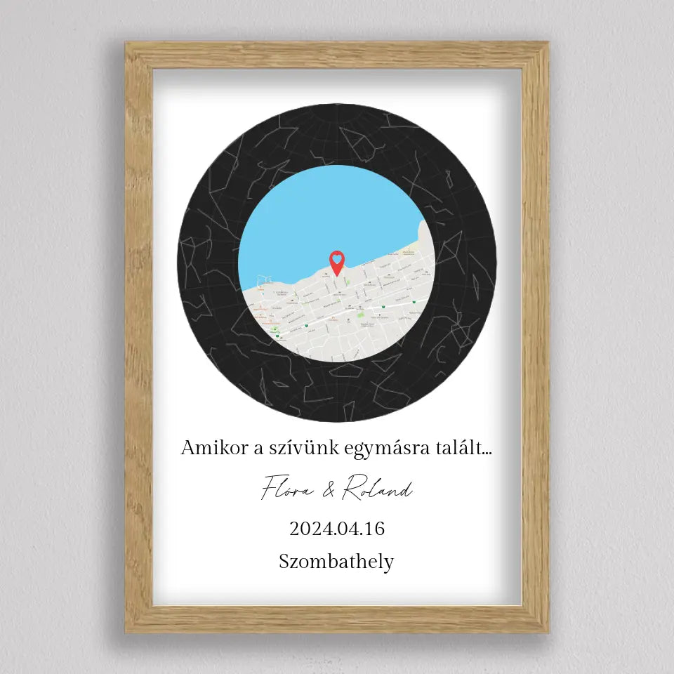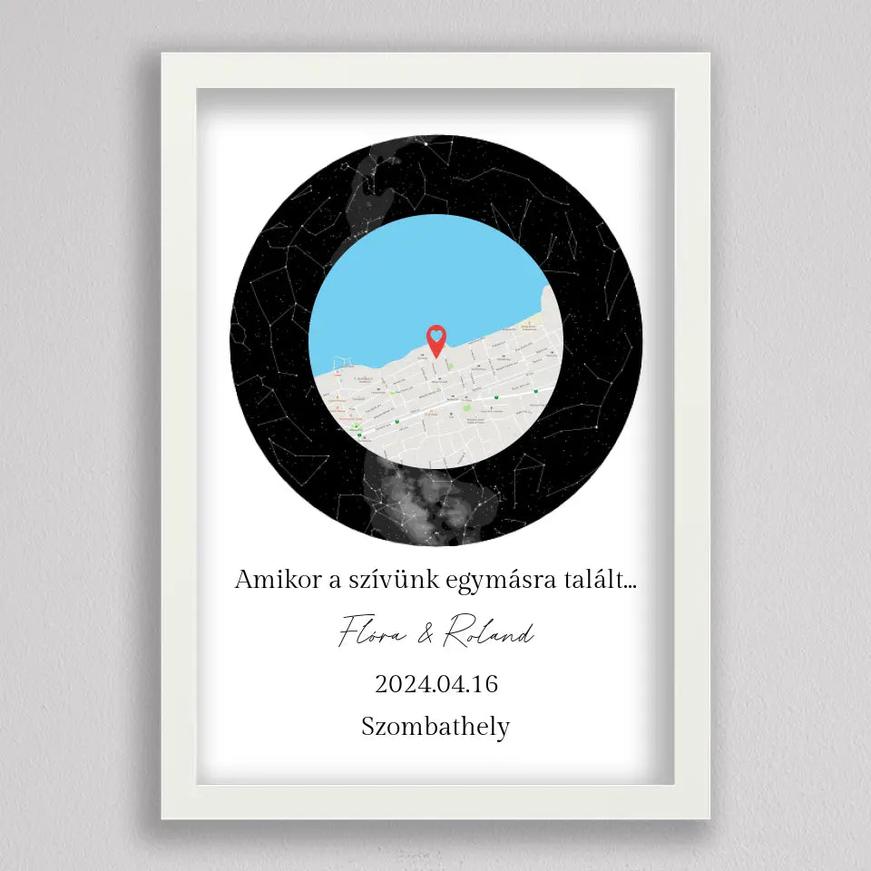 Az Emlékek Összefonódása csillagtérkép és térkép kollázs egy egyedi és különleges ajándék, amely ötvözi a romantikus csillagtérkép és a személyre szabott térkép varázsát. Ez a különleges kollázs lehetővé teszi, hogy egy adott dátum csillagállását és a hozzá tartozó földrajzi helyet egyszerre örökítsd meg, ezzel mély érzelmi kötődést kifejezve. A “kör a körben” dizájn modern és letisztult megjelenést kölcsönöz a műnek, amely tökéletesen illik bármely otthon falára. Ideális választás évfordulóra, esküvőre, vagy bármilyen különleges alkalomra, amikor emlékezetes ajándékot szeretnél adni, amely örökre megőrzi a legkedvesebb pillanatokat. Az illusztráció teljes mértékben személyre szabható, így még egyedibbé teheted ezt a gyönyörű műalkotást.