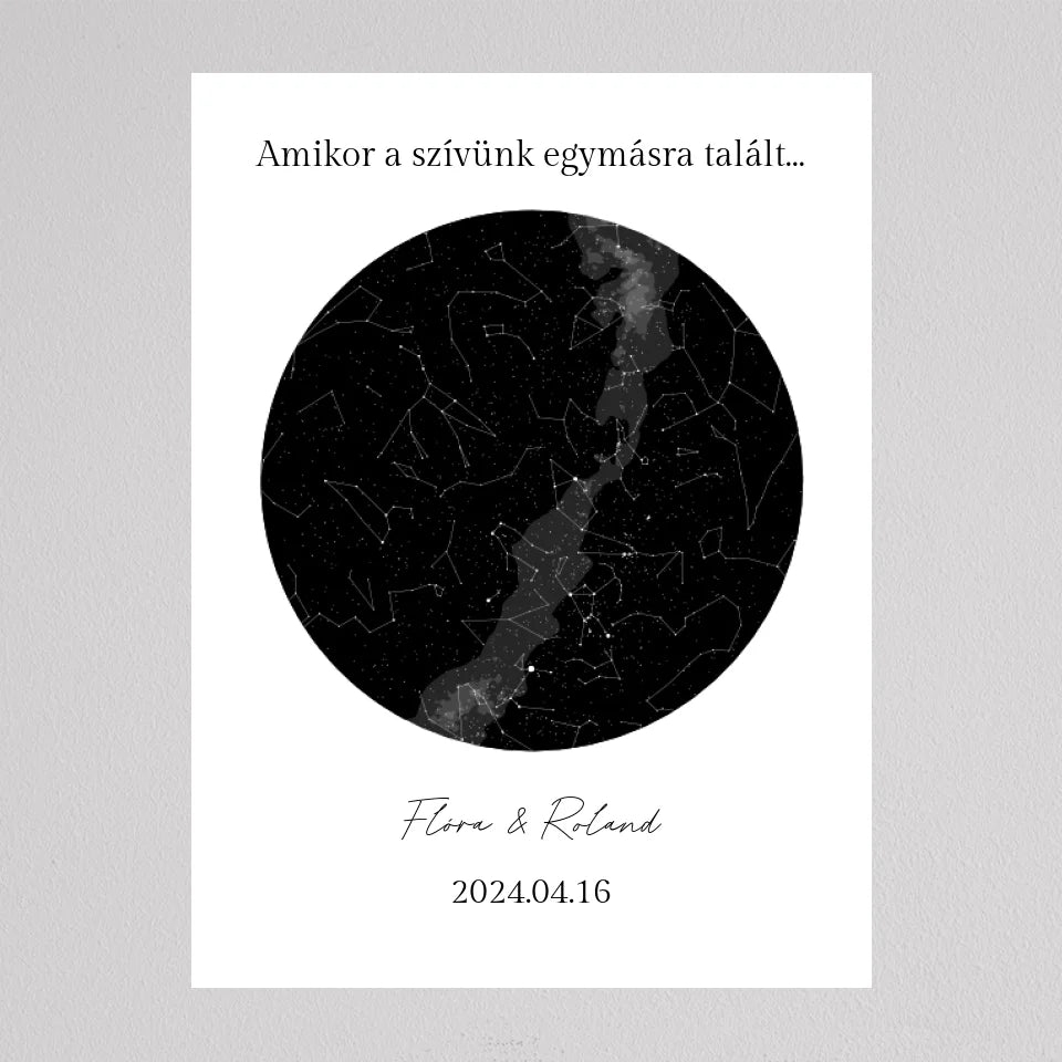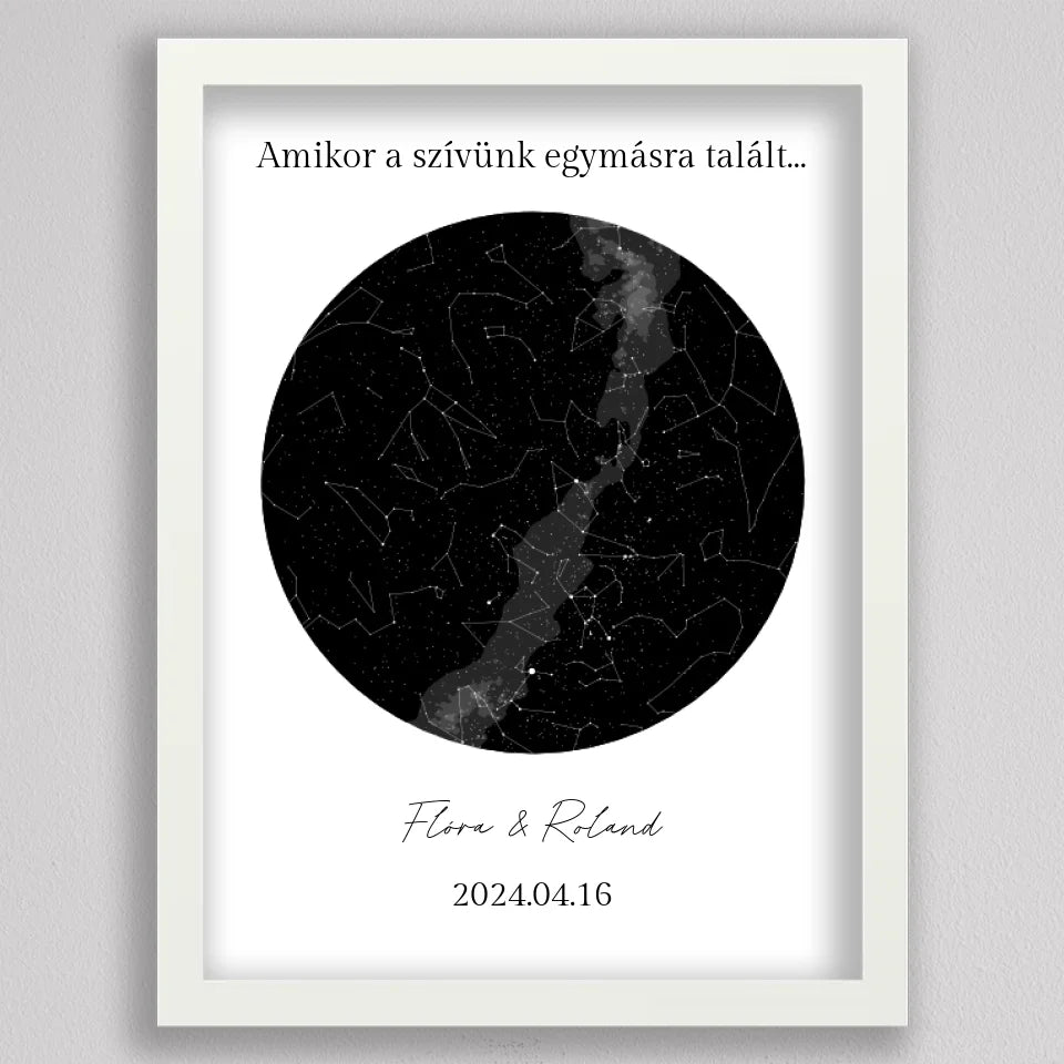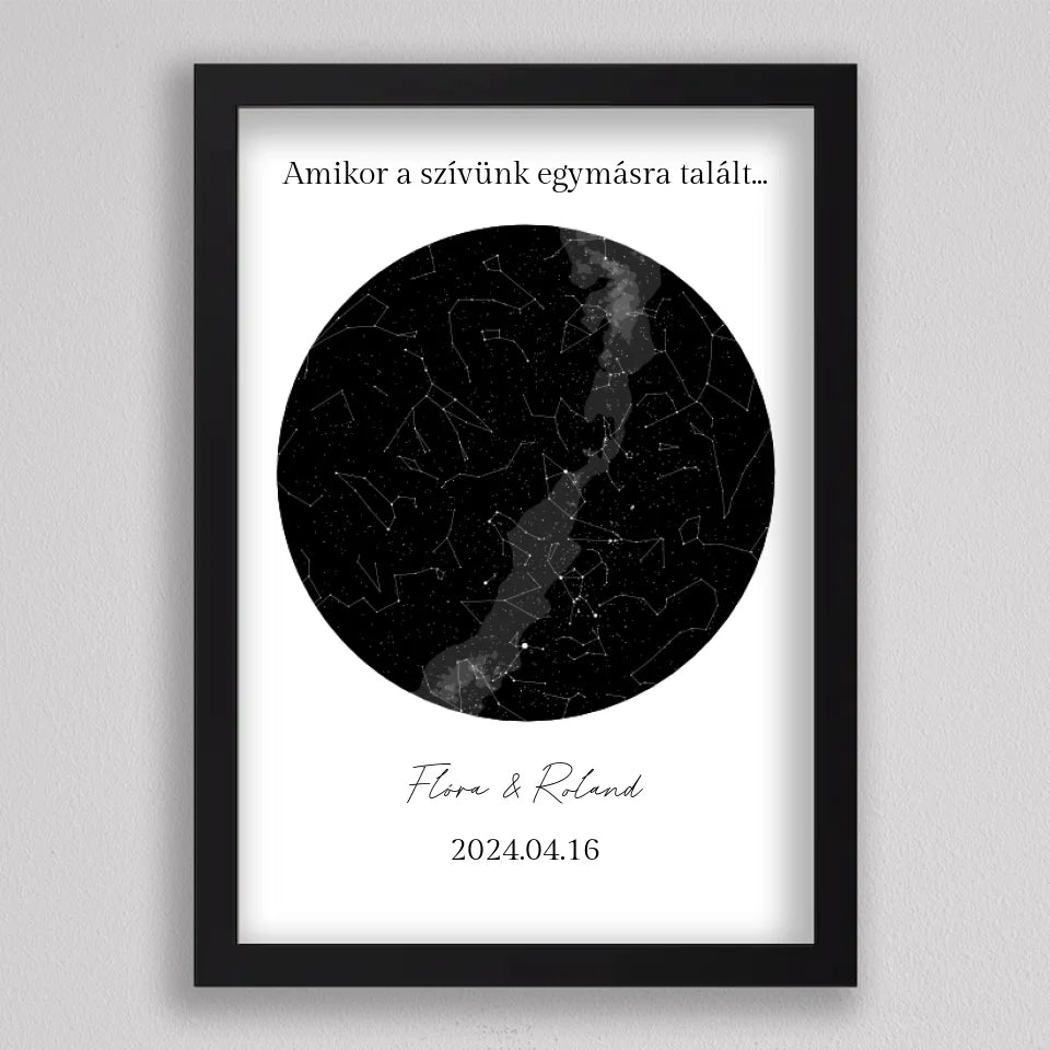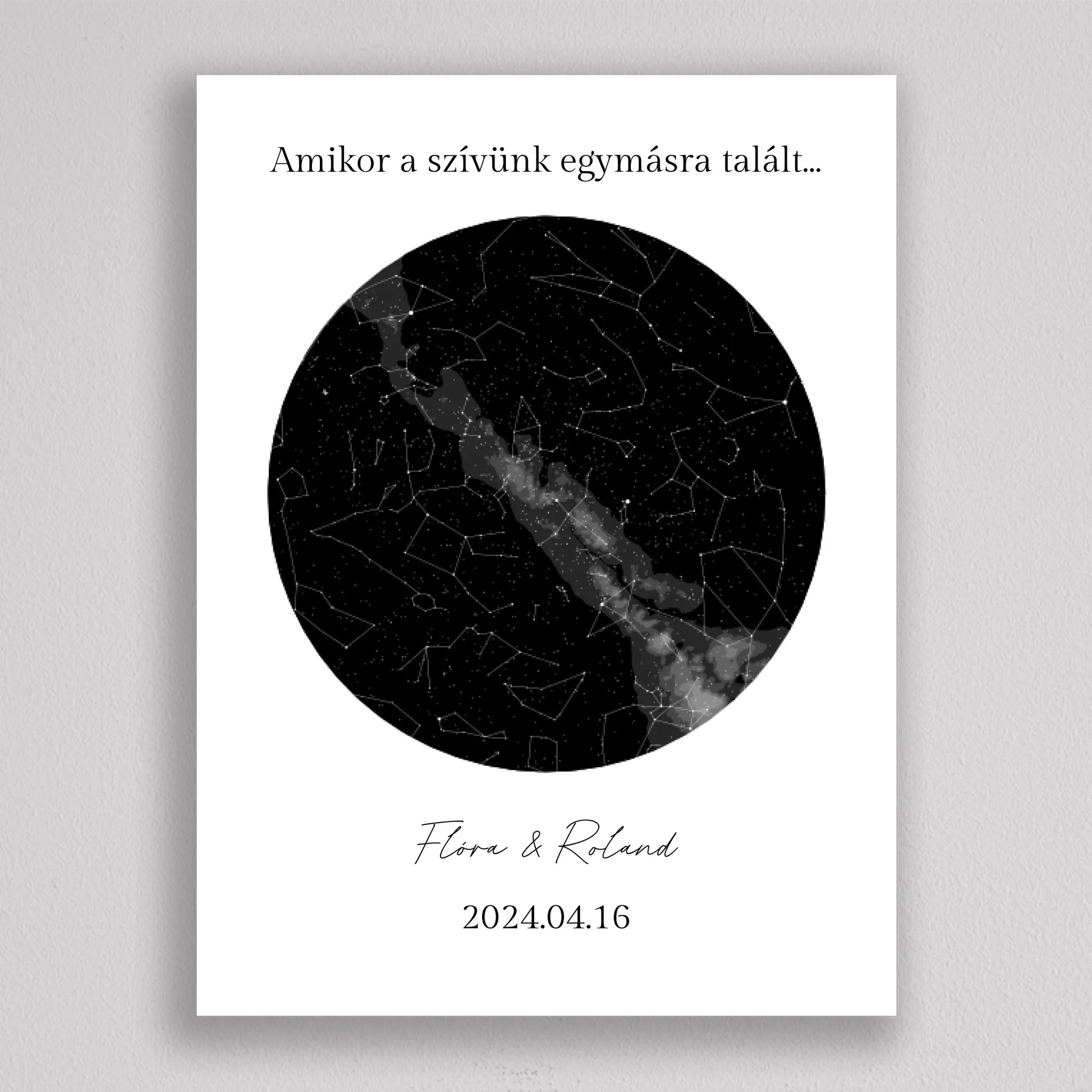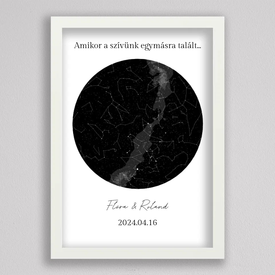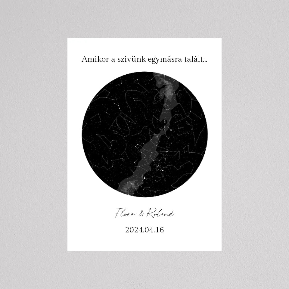 Emlékezetes Éj Csillagtérkép egy különleges, személyre szabható csillagtérkép, amely tökéletes ajándék lehet szeretteid számára bármilyen különleges alkalomra. Ez az egyedi csillagtérkép a kiválasztott dátum és helyszín csillagállását jeleníti meg egy lenyűgöző színekben, amely elegáns és modern megjelenést kölcsönöz ennek a műalkotásnak. Az egyszerű, mégis megható dizájn lehetővé teszi, hogy megőrizd azt az emlékezetes éjszakát vagy napot amikor a szívetek egymásra talált. Ideális választás évfordulókra, Valentin-napra, esküvői ajándékként, vagy bármely más különleges eseményre. Az illusztráció alatti szöveg teljesen személyre szabható, így még egyedibbé teheted ezt a csodálatos emléket.