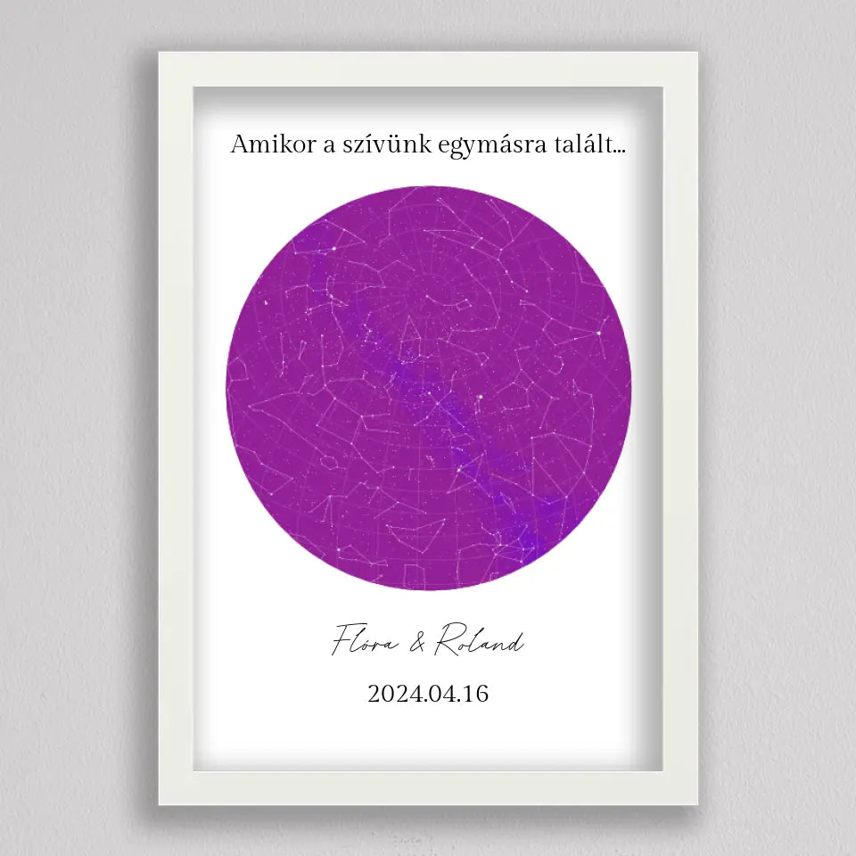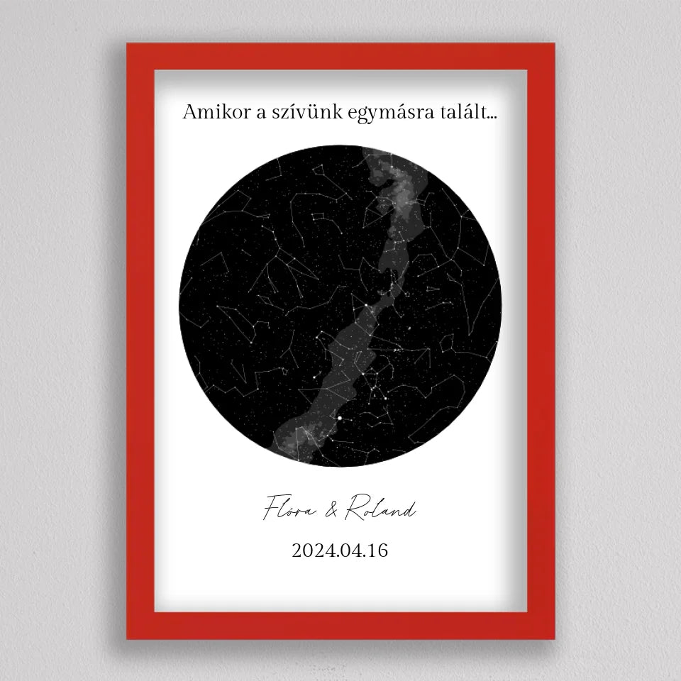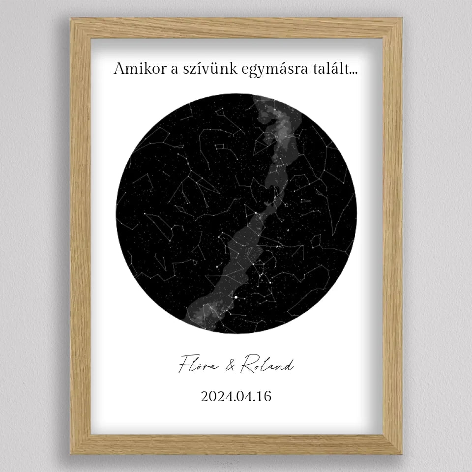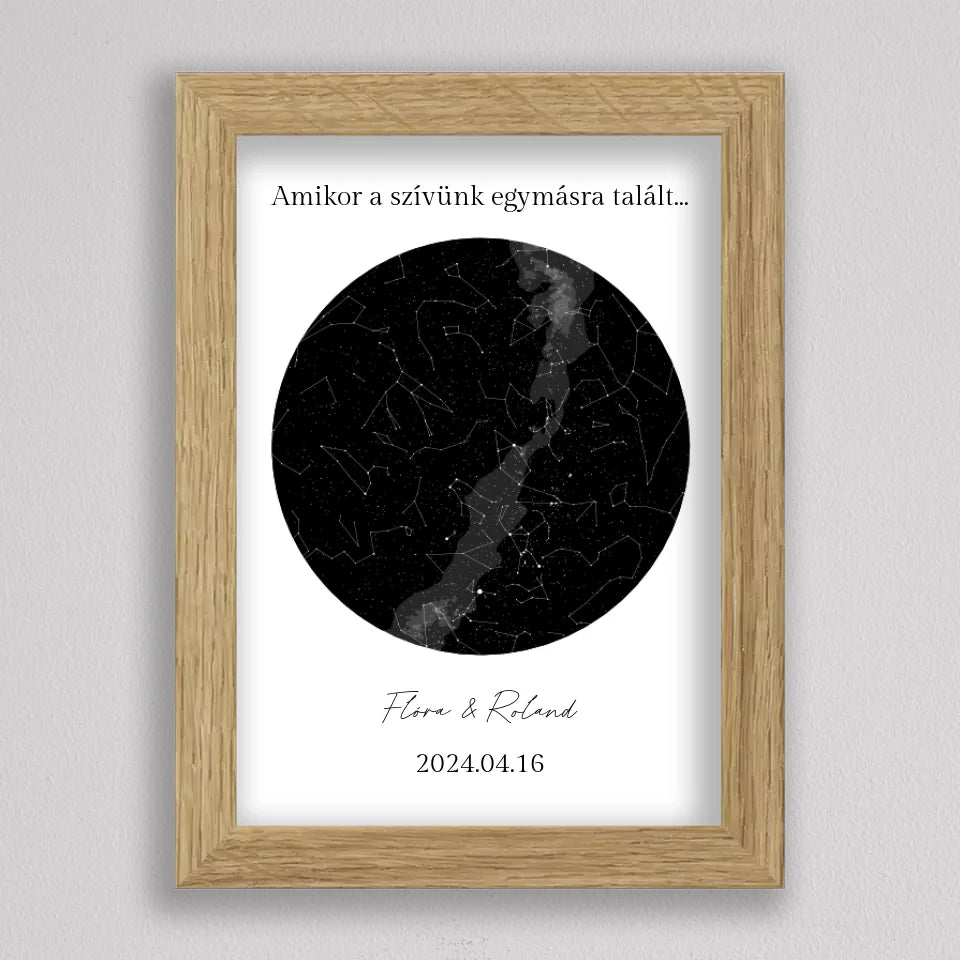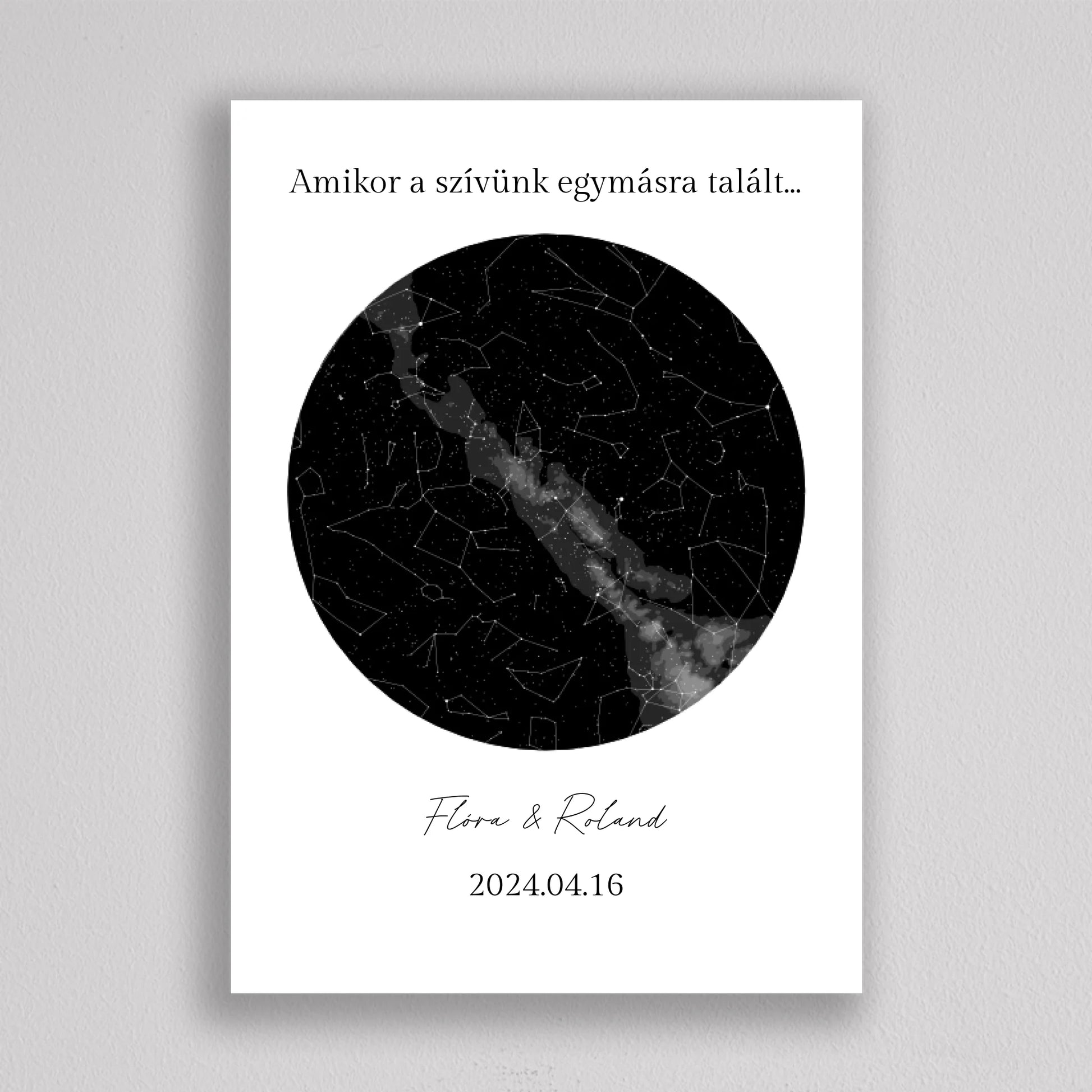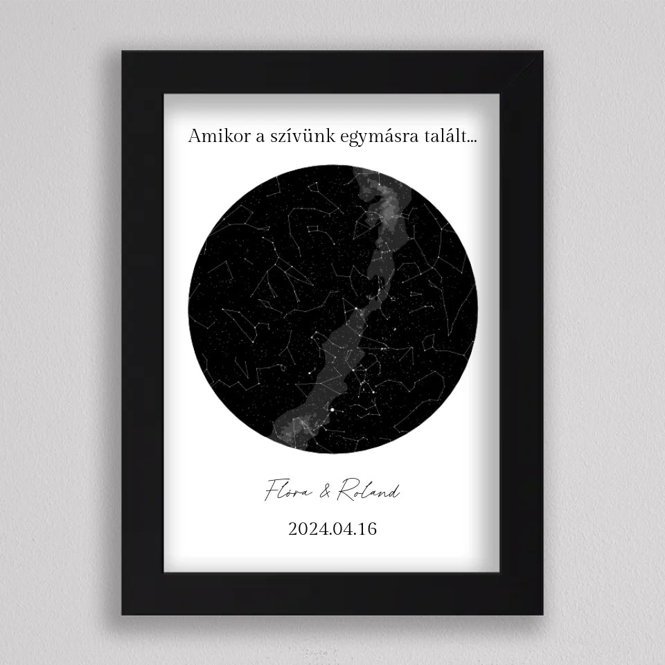 Emlékezetes Éj Csillagtérkép egy különleges, személyre szabható csillagtérkép, amely tökéletes ajándék lehet szeretteid számára bármilyen különleges alkalomra. Ez az egyedi csillagtérkép a kiválasztott dátum és helyszín csillagállását jeleníti meg egy lenyűgöző színekben, amely elegáns és modern megjelenést kölcsönöz ennek a műalkotásnak. Az egyszerű, mégis megható dizájn lehetővé teszi, hogy megőrizd azt az emlékezetes éjszakát vagy napot amikor a szívetek egymásra talált. Ideális választás évfordulókra, Valentin-napra, esküvői ajándékként, vagy bármely más különleges eseményre. Az illusztráció alatti szöveg teljesen személyre szabható, így még egyedibbé teheted ezt a csodálatos emléket.