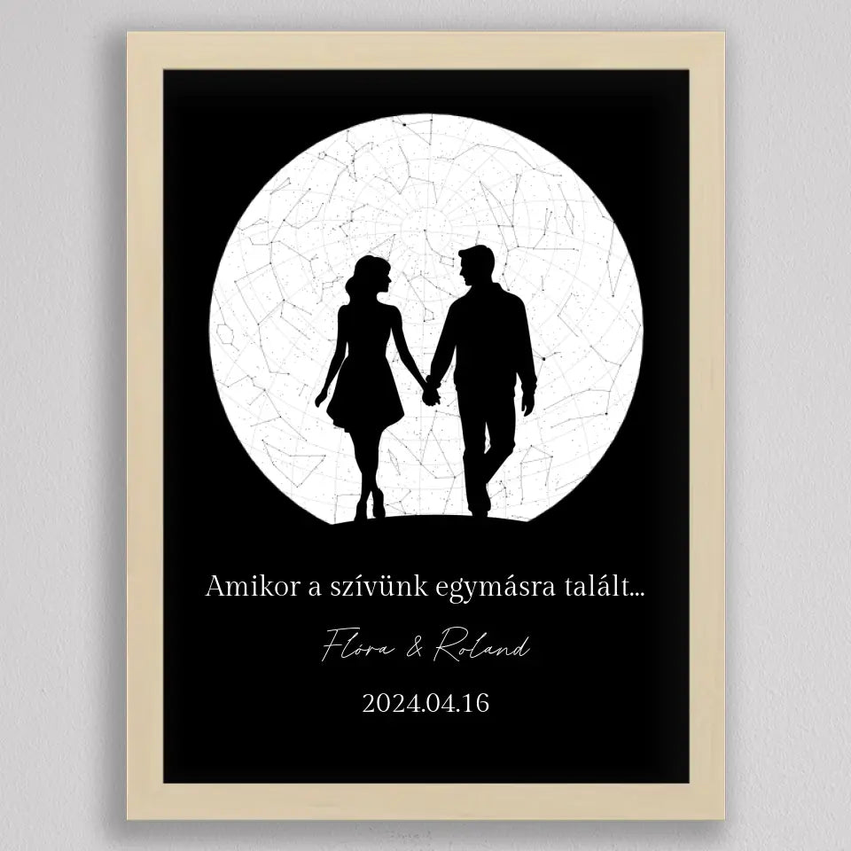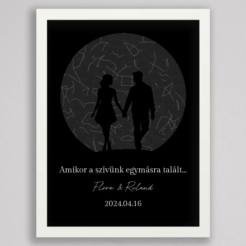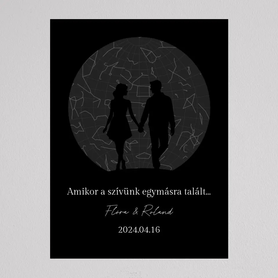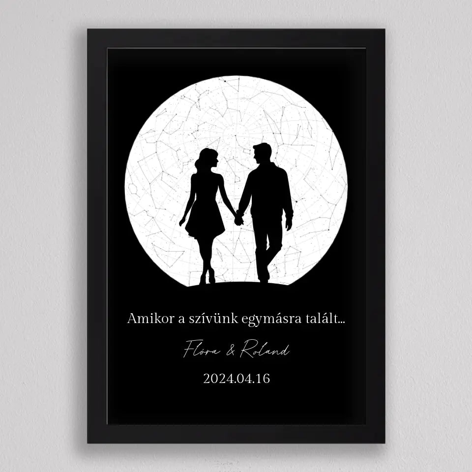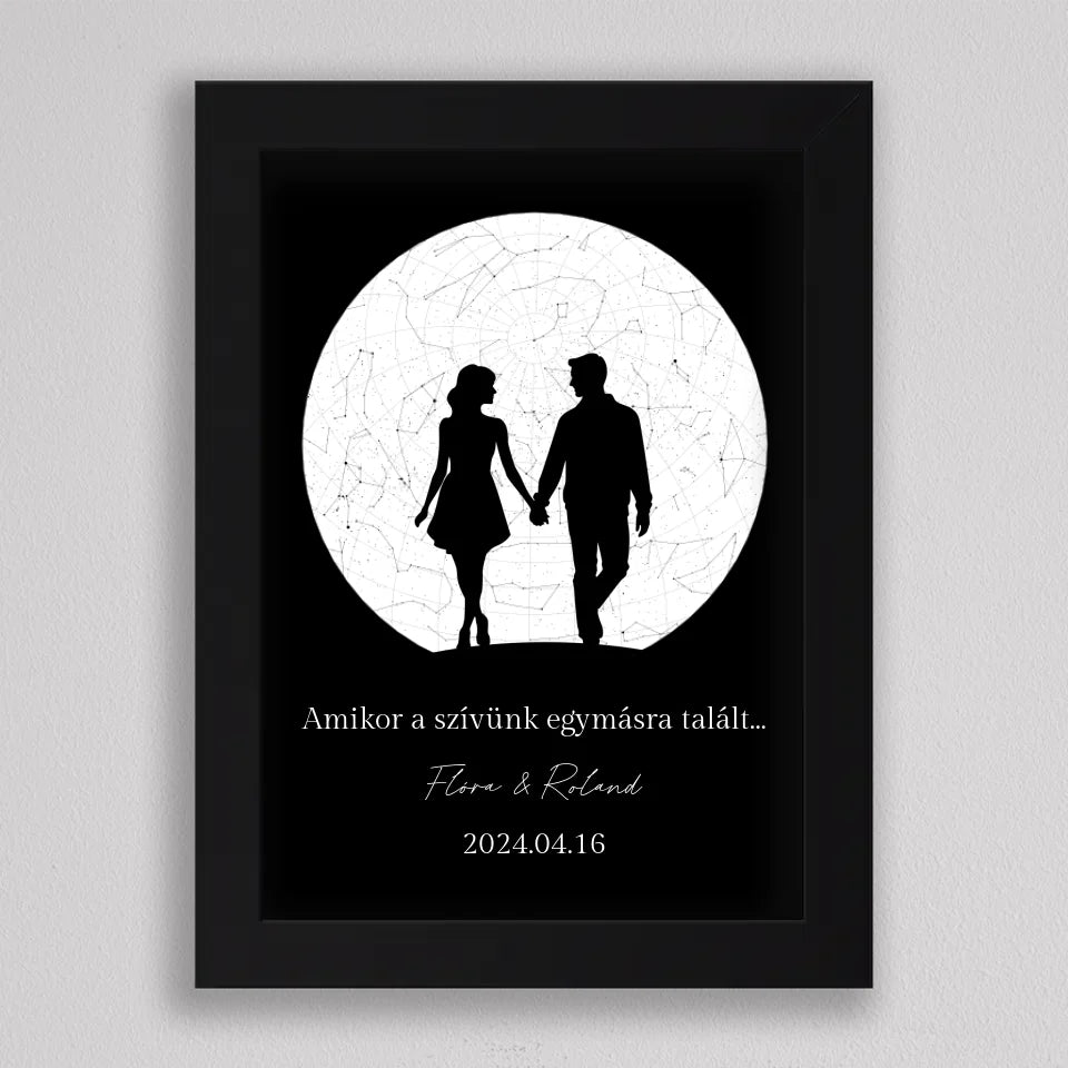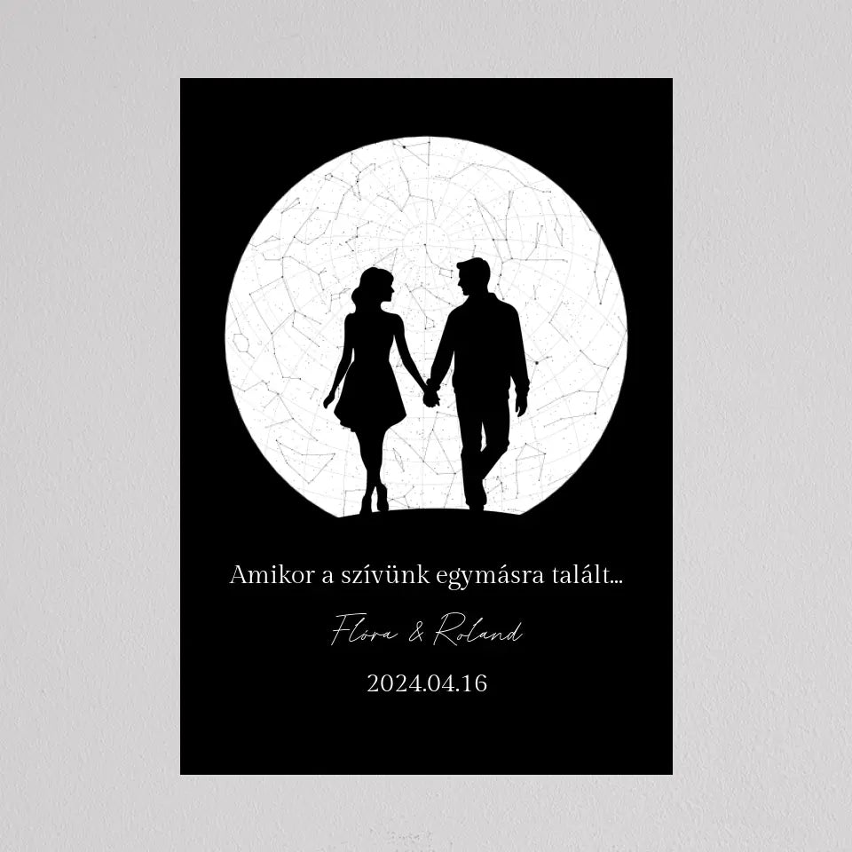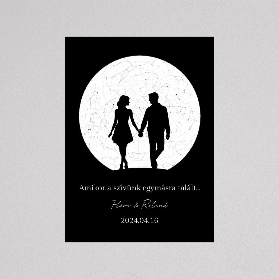Az Örök Szerelem Csillagtérkép egy romantikus és személyre szabott ajándék, amely tökéletes választás azoknak a pároknak, akik szeretnék megörökíteni legkülönlegesebb pillanataikat. Ez az egyedi csillagtérkép az adott dátum és helyszín csillagállását jeleníti meg, gyönyörű fekete-fehér vagy többszínű dizájnnal és egy romantikus sziluettel kiegészítve, amely a holdfényben sétáló szerelmeseket ábrázolja. Ideális választás évfordulókra, Valentin-napra, vagy esküvői ajándékként, amikor egy örök emléket szeretnél ajándékozni, amely nemcsak szép, hanem mély érzelmi értékkel is bír. Az illusztráció alatti szöveg személyre szabható, így még különlegesebbé teheted ezt a csodálatos emléket.