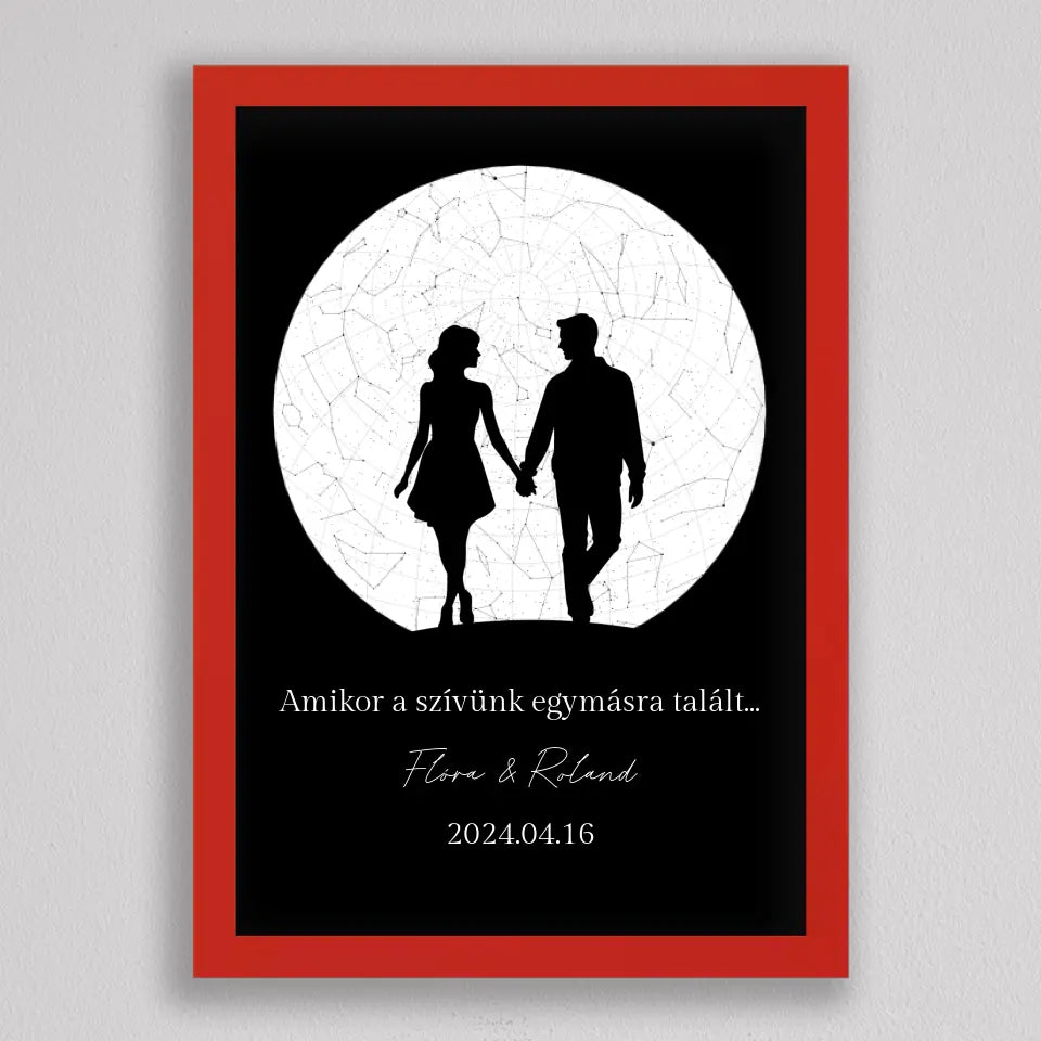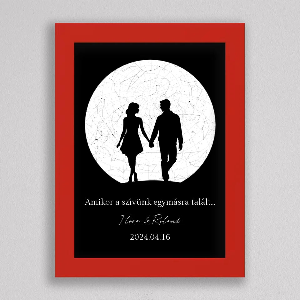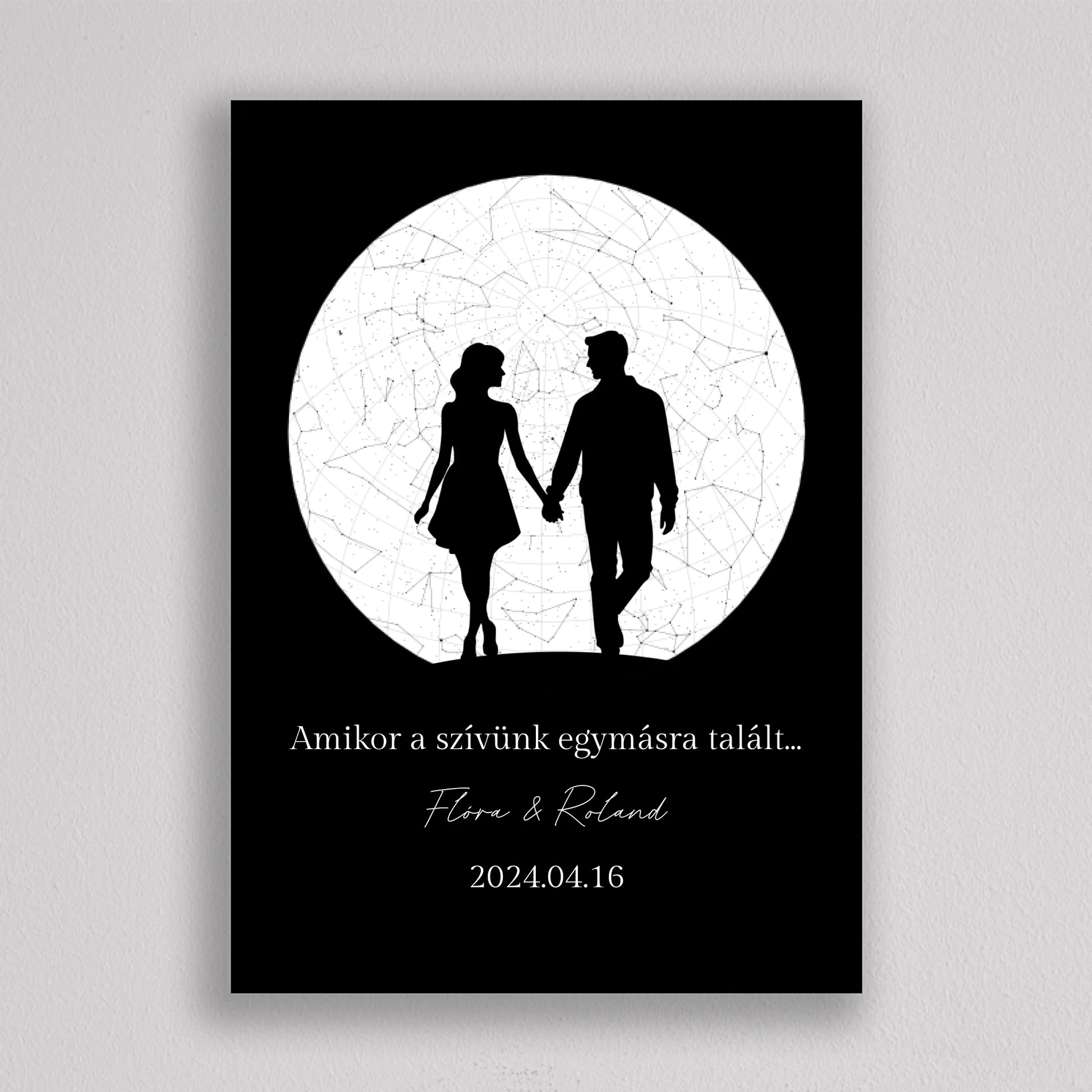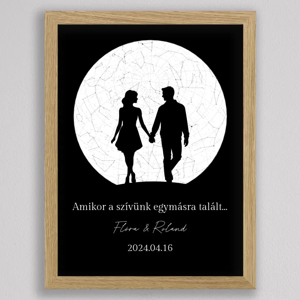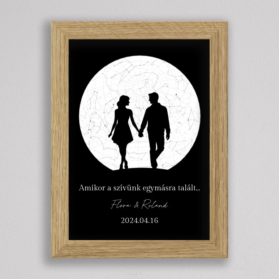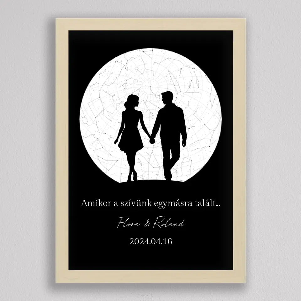 Az Örök Szerelem Csillagtérkép egy romantikus és személyre szabott ajándék, amely tökéletes választás azoknak a pároknak, akik szeretnék megörökíteni legkülönlegesebb pillanataikat. Ez az egyedi csillagtérkép az adott dátum és helyszín csillagállását jeleníti meg, gyönyörű fekete-fehér vagy többszínű dizájnnal és egy romantikus sziluettel kiegészítve, amely a holdfényben sétáló szerelmeseket ábrázolja. Ideális választás évfordulókra, Valentin-napra, vagy esküvői ajándékként, amikor egy örök emléket szeretnél ajándékozni, amely nemcsak szép, hanem mély érzelmi értékkel is bír. Az illusztráció alatti szöveg személyre szabható, így még különlegesebbé teheted ezt a csodálatos emléket.