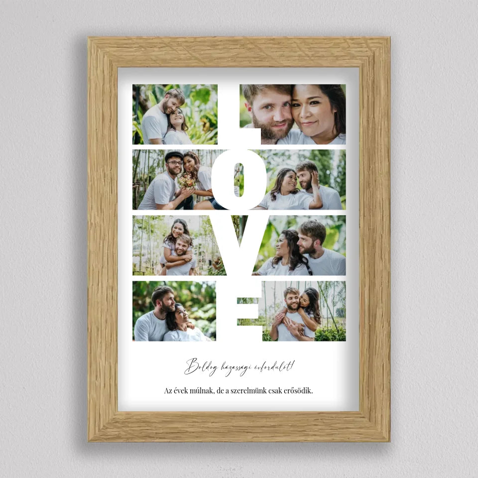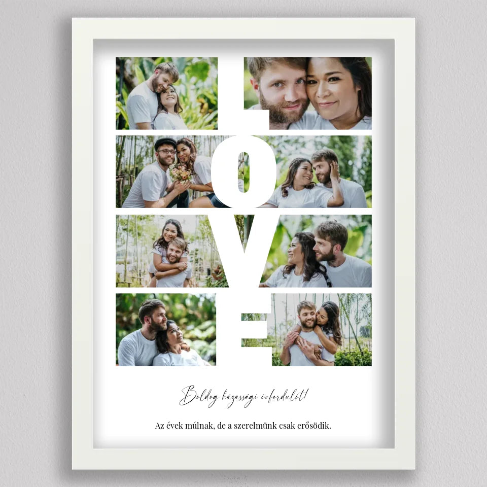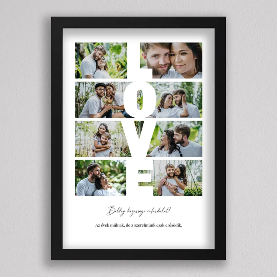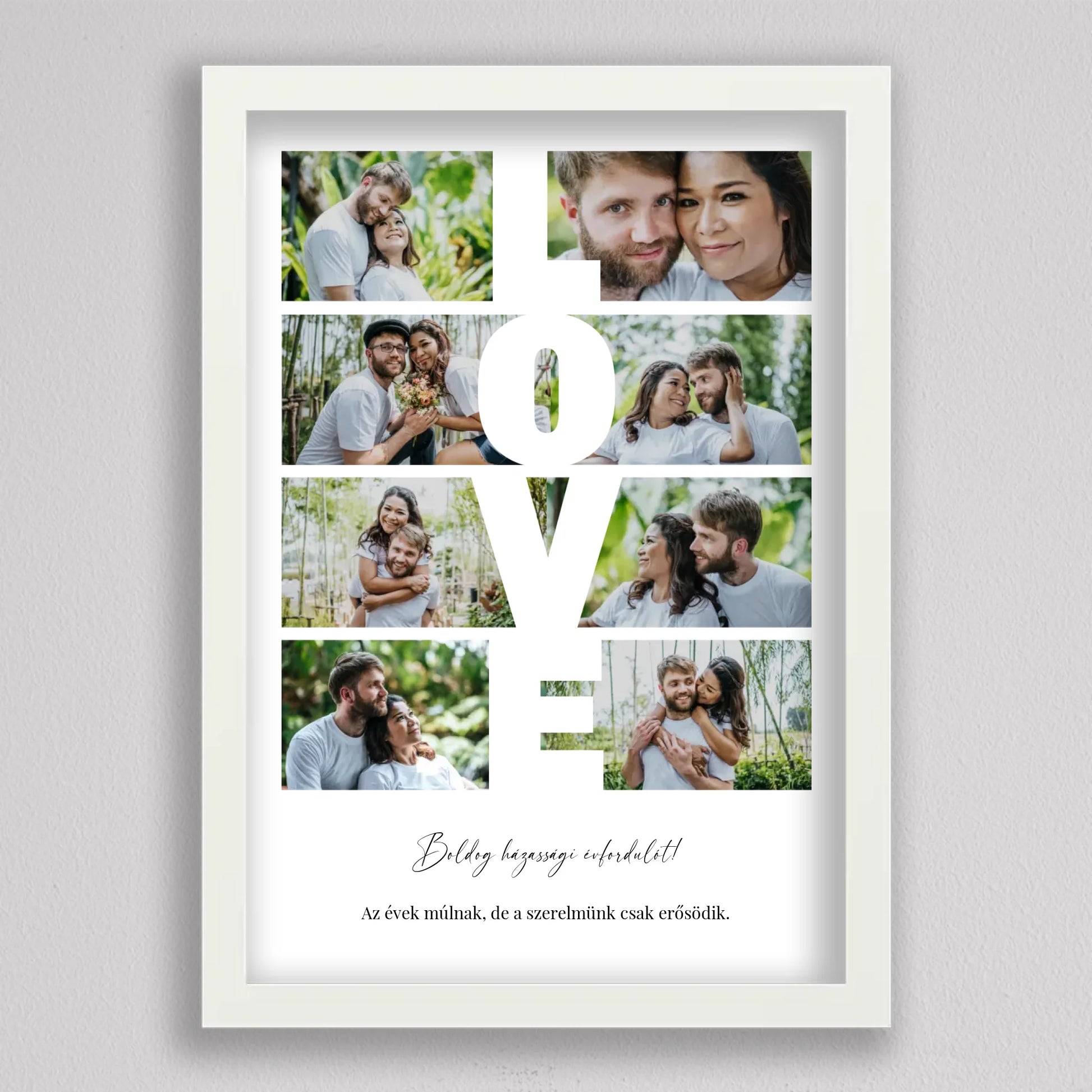 A Szerelmes Pillanatok LOVE feliratú fotó kollázs tökéletes módja annak, hogy megőrizd és megoszd a legszebb közös pillanataitokat egy elegáns és modern dizájnban. Ez az egyedi fotó kollázs a „LOVE” feliratot kreatívan ötvözi a legkedvesebb közös képeitekkel, így egy igazán különleges emléket hoz létre, amely bármely helyiség dísze lehet. Az fotó kollázs alá személyre szabható üzenet vagy idézet is elhelyezhető, amely még személyesebbé teszi ezt a csodálatos ajándékot. Ideális választás évfordulóra, Valentin-napra, esküvőre, vagy bármilyen más alkalomra, amikor szeretnéd kifejezni az szerelmed iránti szeretetedet és kötődésedet egy egyedi és emlékezetes formában.