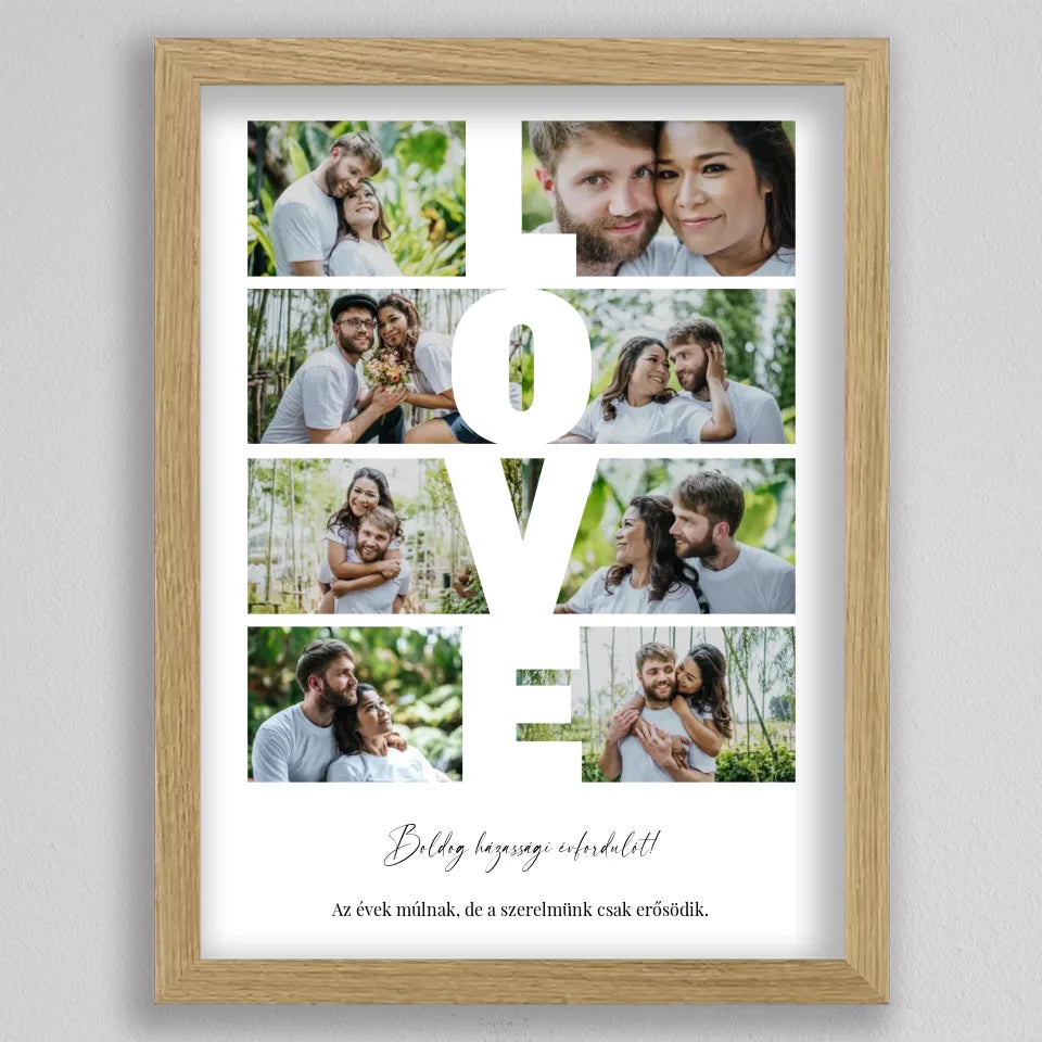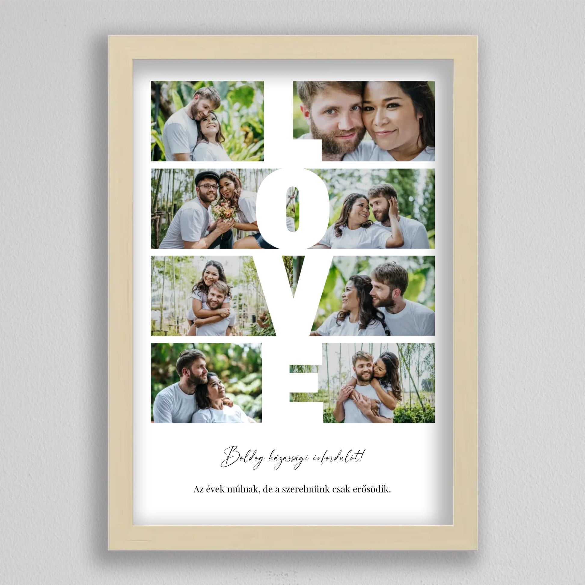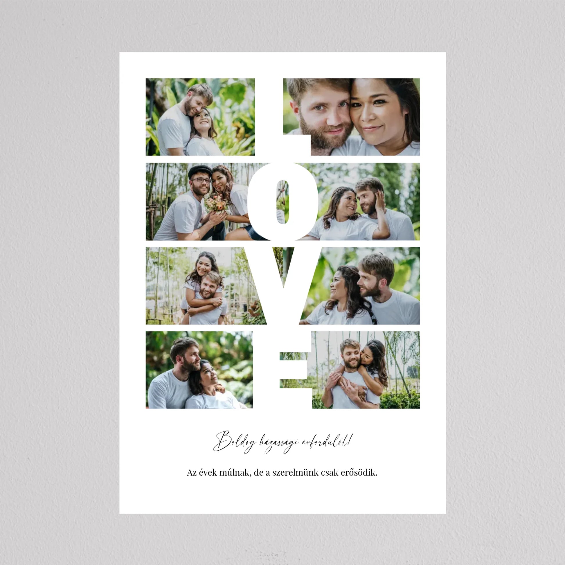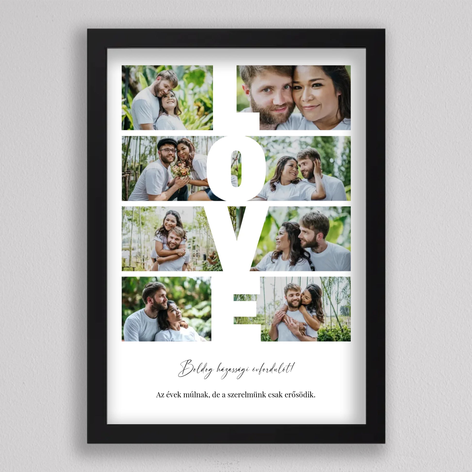 A Szerelmes Pillanatok LOVE feliratú fotó kollázs tökéletes módja annak, hogy megőrizd és megoszd a legszebb közös pillanataitokat egy elegáns és modern dizájnban. Ez az egyedi fotó kollázs a „LOVE” feliratot kreatívan ötvözi a legkedvesebb közös képeitekkel, így egy igazán különleges emléket hoz létre, amely bármely helyiség dísze lehet. Az fotó kollázs alá személyre szabható üzenet vagy idézet is elhelyezhető, amely még személyesebbé teszi ezt a csodálatos ajándékot. Ideális választás évfordulóra, Valentin-napra, esküvőre, vagy bármilyen más alkalomra, amikor szeretnéd kifejezni az szerelmed iránti szeretetedet és kötődésedet egy egyedi és emlékezetes formában.