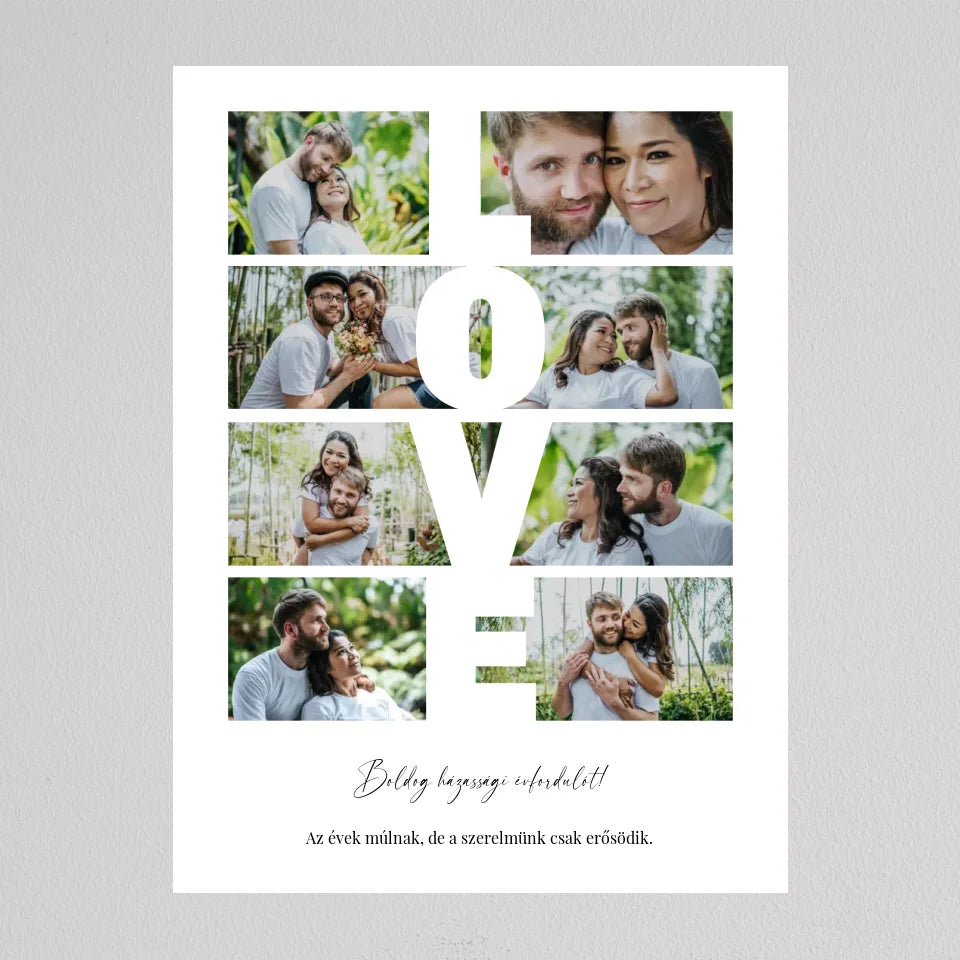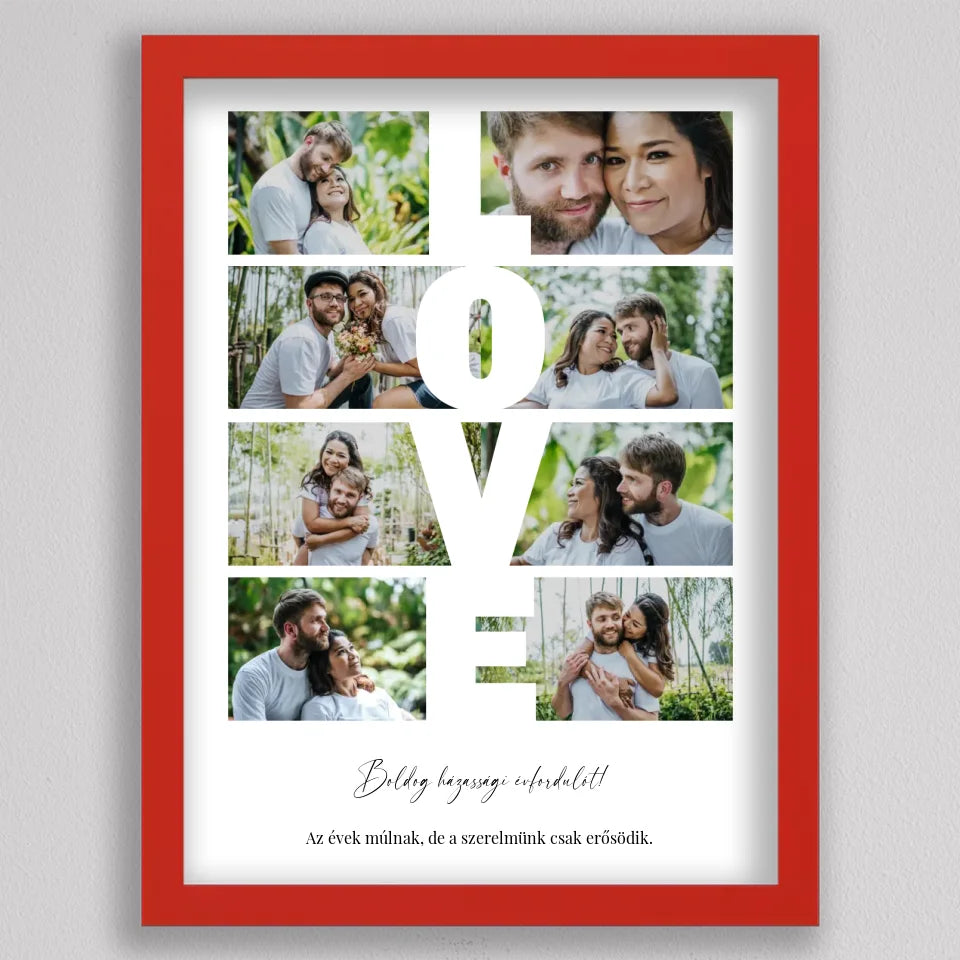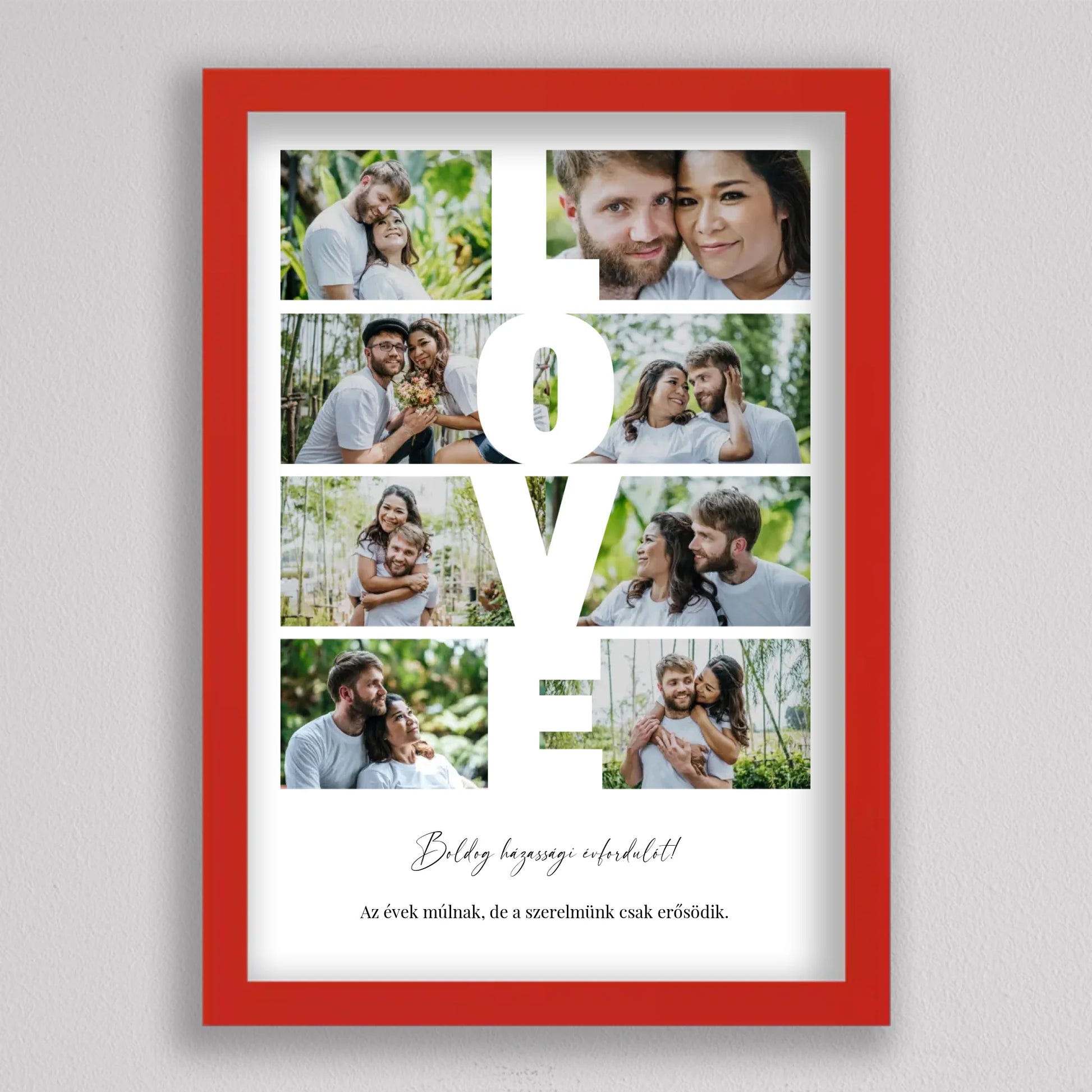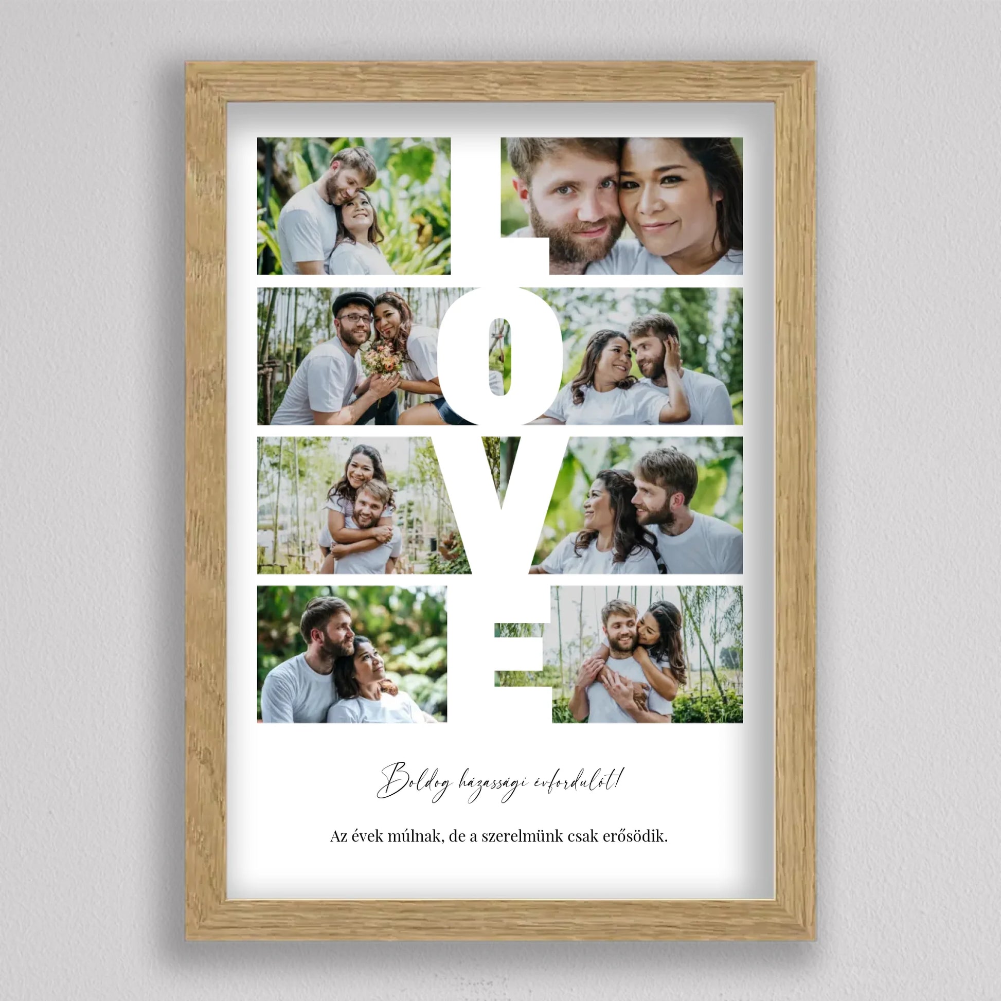 A Szerelmes Pillanatok LOVE feliratú fotó kollázs tökéletes módja annak, hogy megőrizd és megoszd a legszebb közös pillanataitokat egy elegáns és modern dizájnban. Ez az egyedi fotó kollázs a „LOVE” feliratot kreatívan ötvözi a legkedvesebb közös képeitekkel, így egy igazán különleges emléket hoz létre, amely bármely helyiség dísze lehet. Az fotó kollázs alá személyre szabható üzenet vagy idézet is elhelyezhető, amely még személyesebbé teszi ezt a csodálatos ajándékot. Ideális választás évfordulóra, Valentin-napra, esküvőre, vagy bármilyen más alkalomra, amikor szeretnéd kifejezni az szerelmed iránti szeretetedet és kötődésedet egy egyedi és emlékezetes formában.