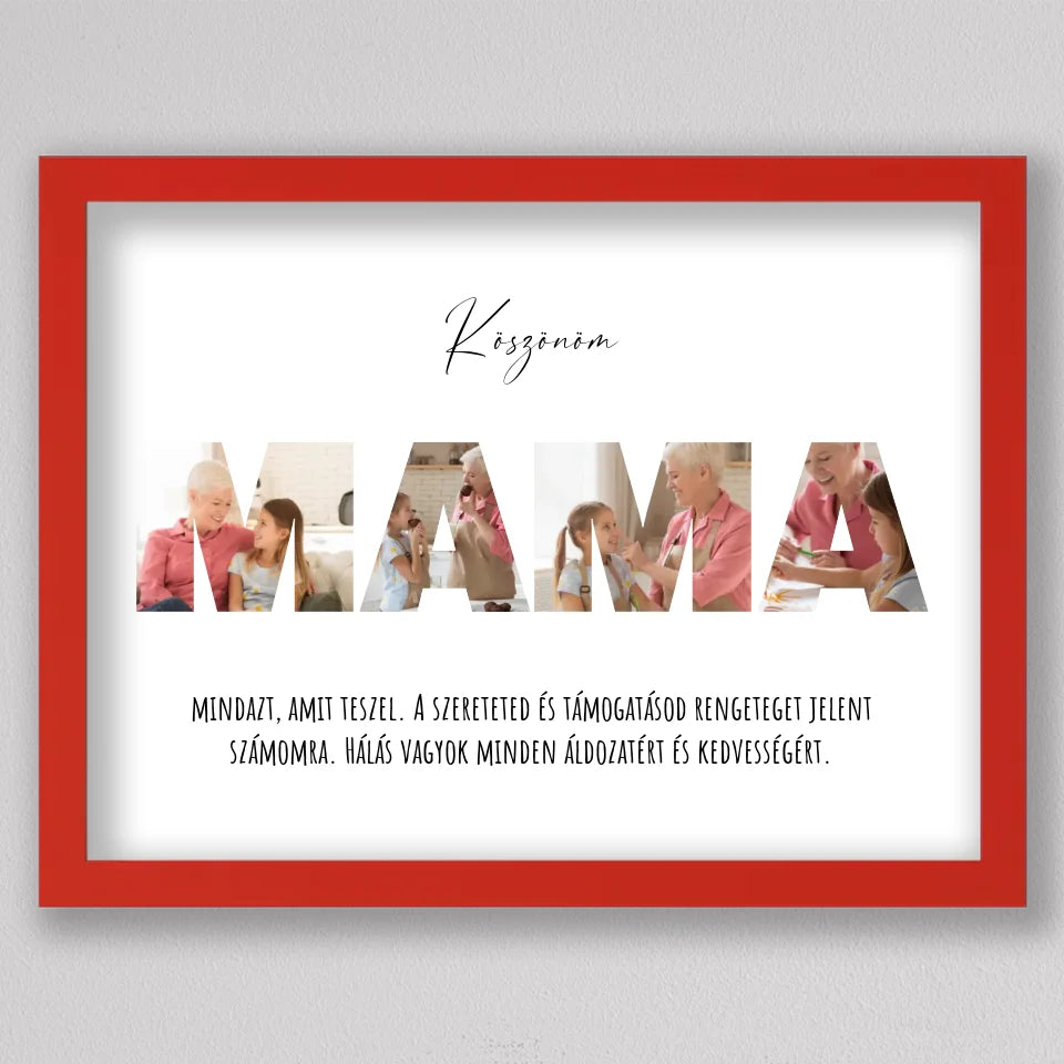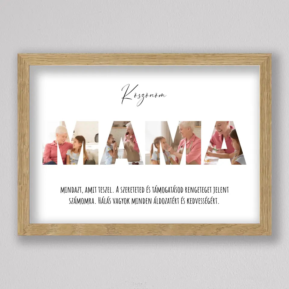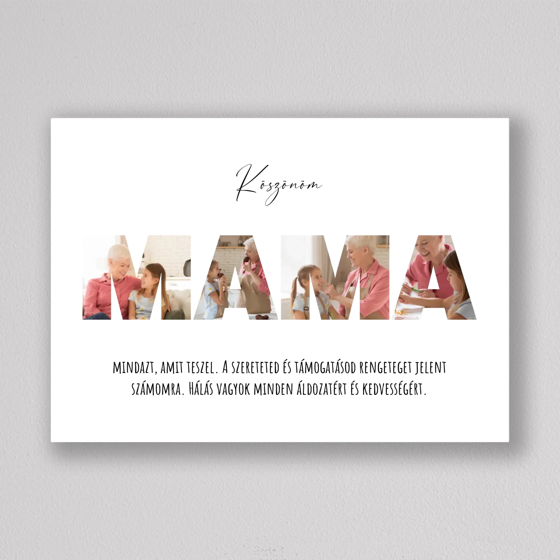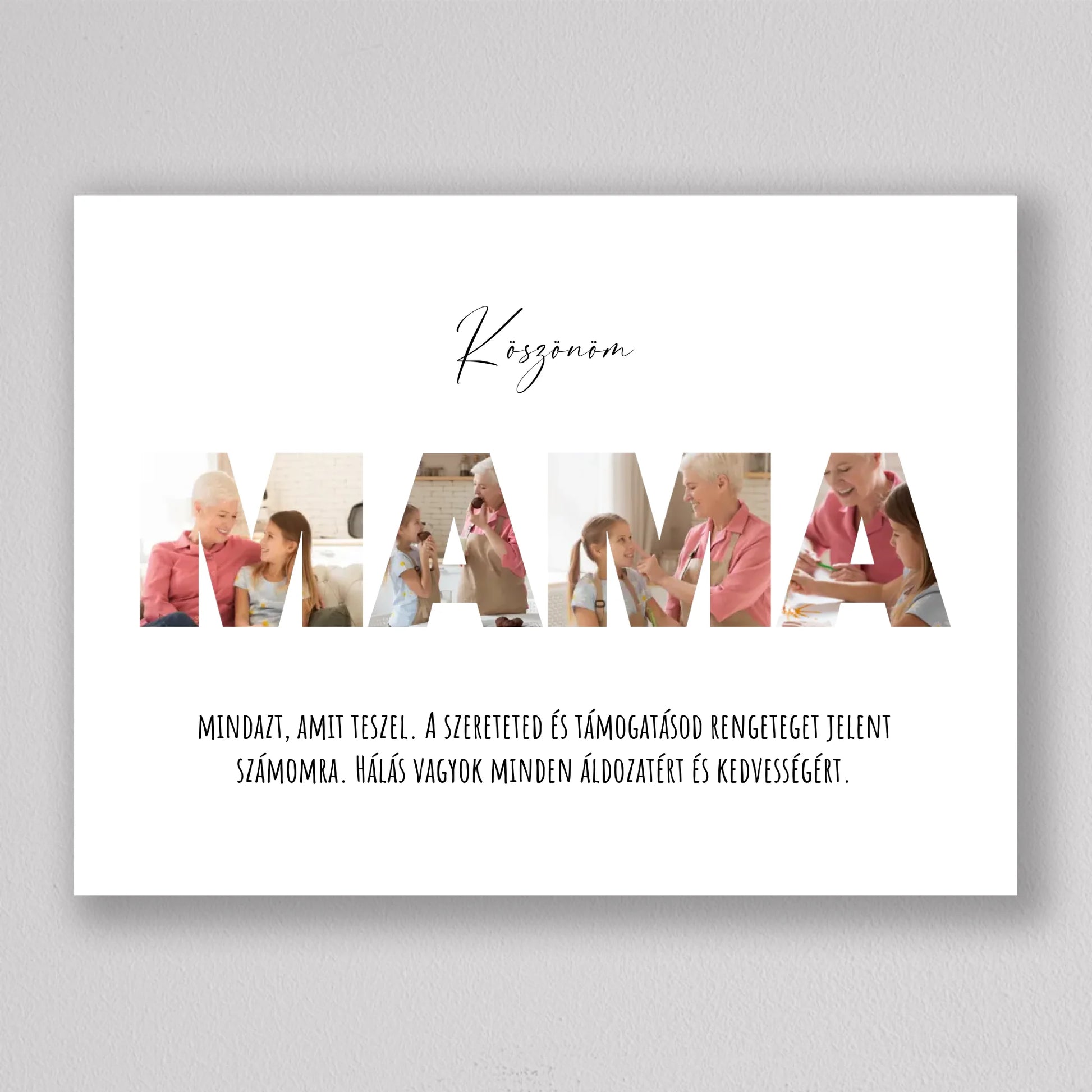 Az MAMA feliratú fotó kollázs egy különleges, szívhez szóló ajándék, amely tökéletes választás nagymamáknak bármely fontos alkalomra, legyen az anyák napja, születésnap, karácsony vagy bármely jeles esemény. Az „MAMA” felirat mögé rejtett fényképekkel a legkedvesebb közös pillanatok örökíthetők meg, míg az érzelmes idézet kifejezi az unokák és a nagymama közötti szeretetet és megbecsülést. Ez a magas minőségű, elegáns akár keretbe is foglalt fotó kollázs nemcsak egyedi, de emlékezetes dísze is lehet a nagymama otthonának, mély érzelmi kötődést kifejezve.