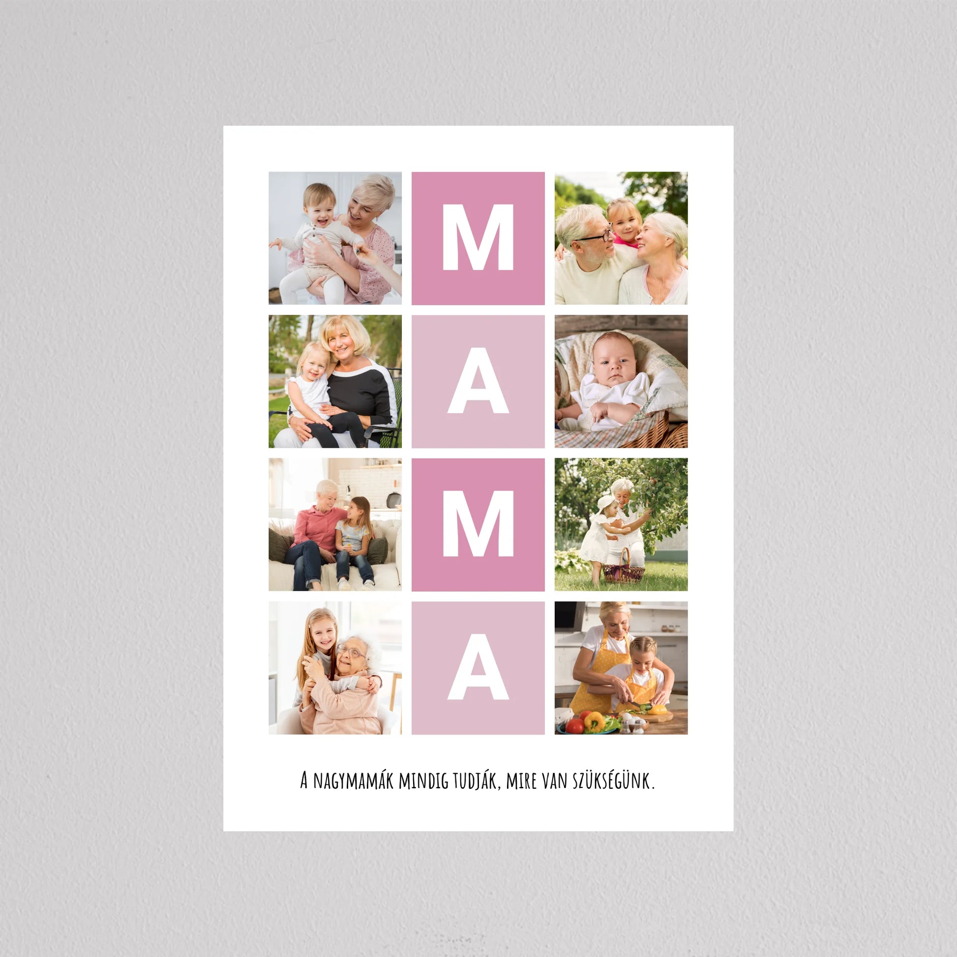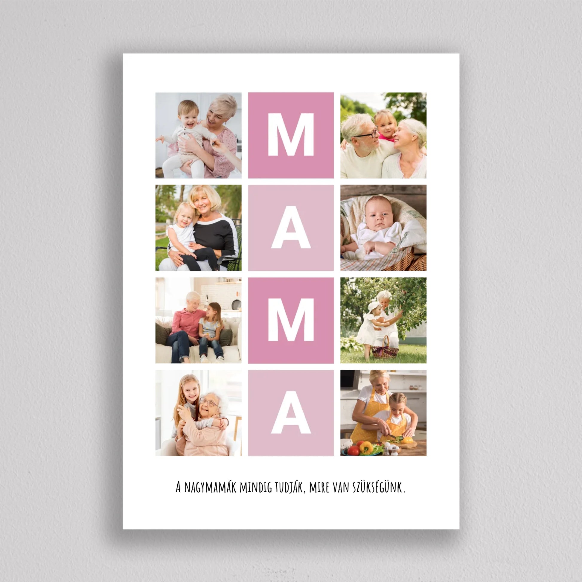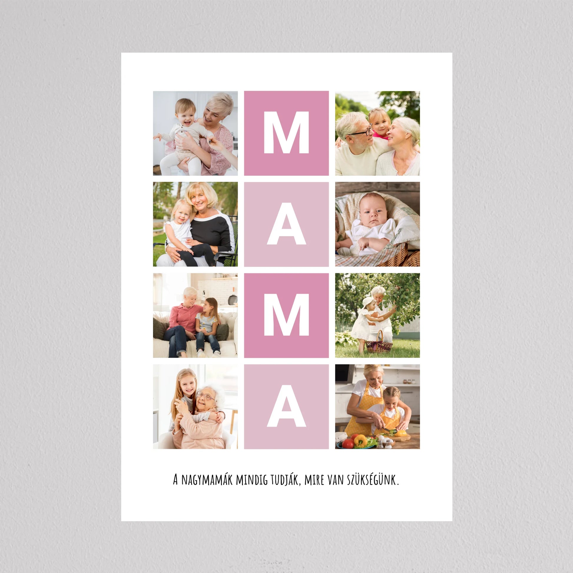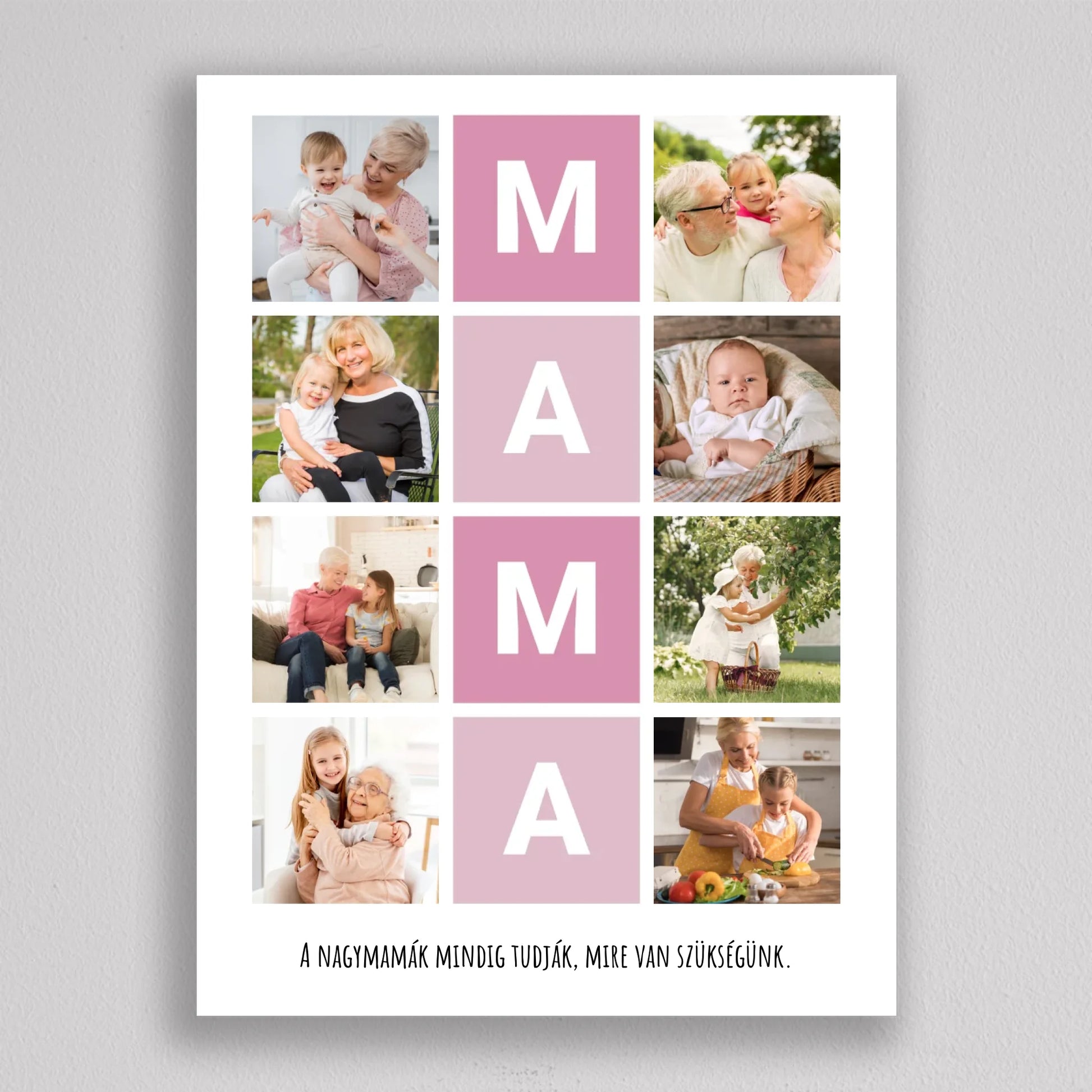 A MAMA kedvenc pillanatai fotó kollázs egy igazán különleges ajándék, amely tökéletesen megörökíti a nagymamával töltött legértékesebb pillanatokat. Ez a személyre szabható kollázs lehetőséget biztosít arra, hogy a szeretett nagymama életének legszebb emlékeit egy gyönyörű, esztétikus elrendezésben őrizhessük meg. A központi MAMA feliratot szívhez szóló családi fotók veszik körül, amelyek biztosan boldogságot hoznak minden nagymama szívébe. Legyen szó születésnapról, anyák napjáról vagy bármilyen különleges alkalomról, ez a kollázs mindig emlékezetes ajándék lesz, amely megmutatja, mennyire fontos számunkra a nagymama.