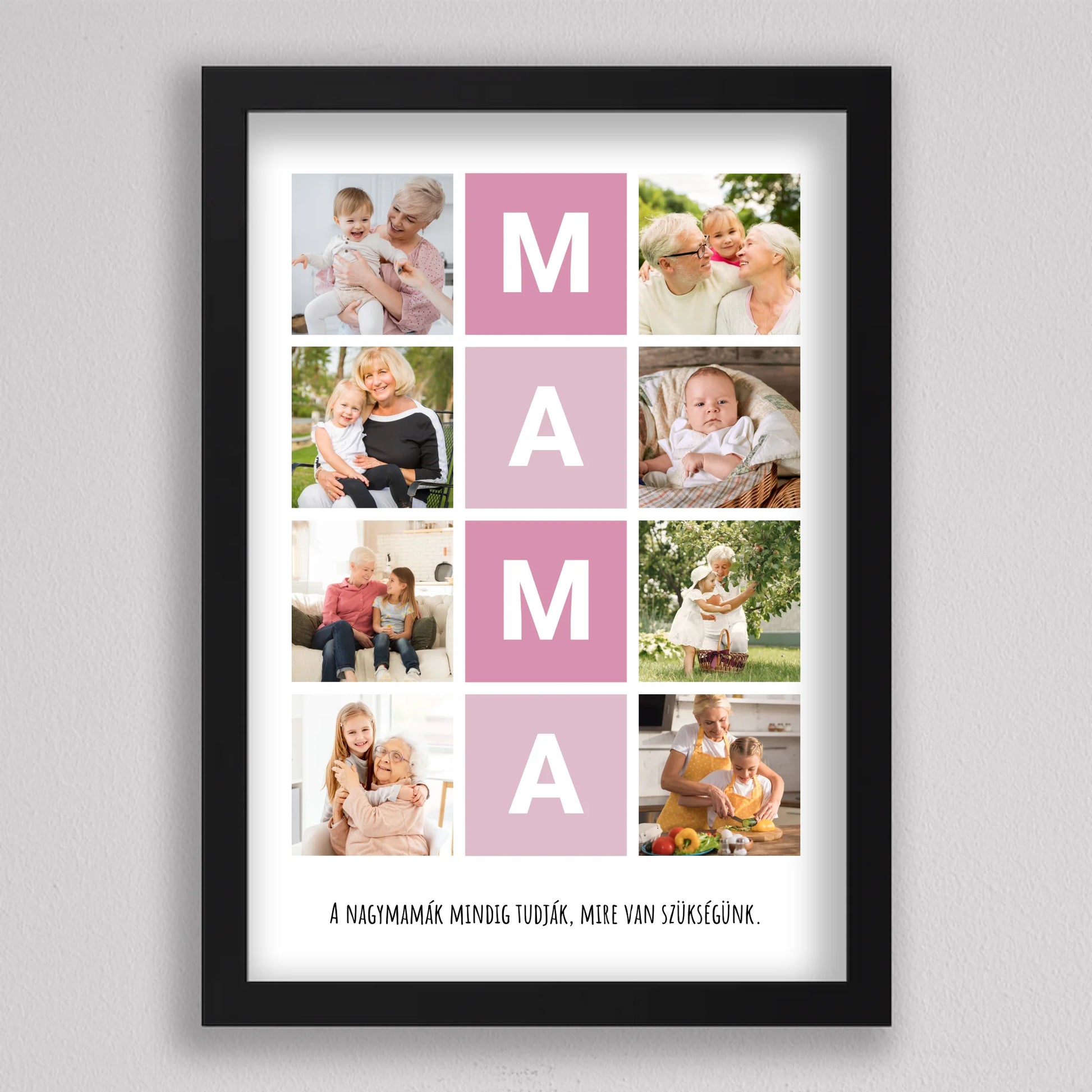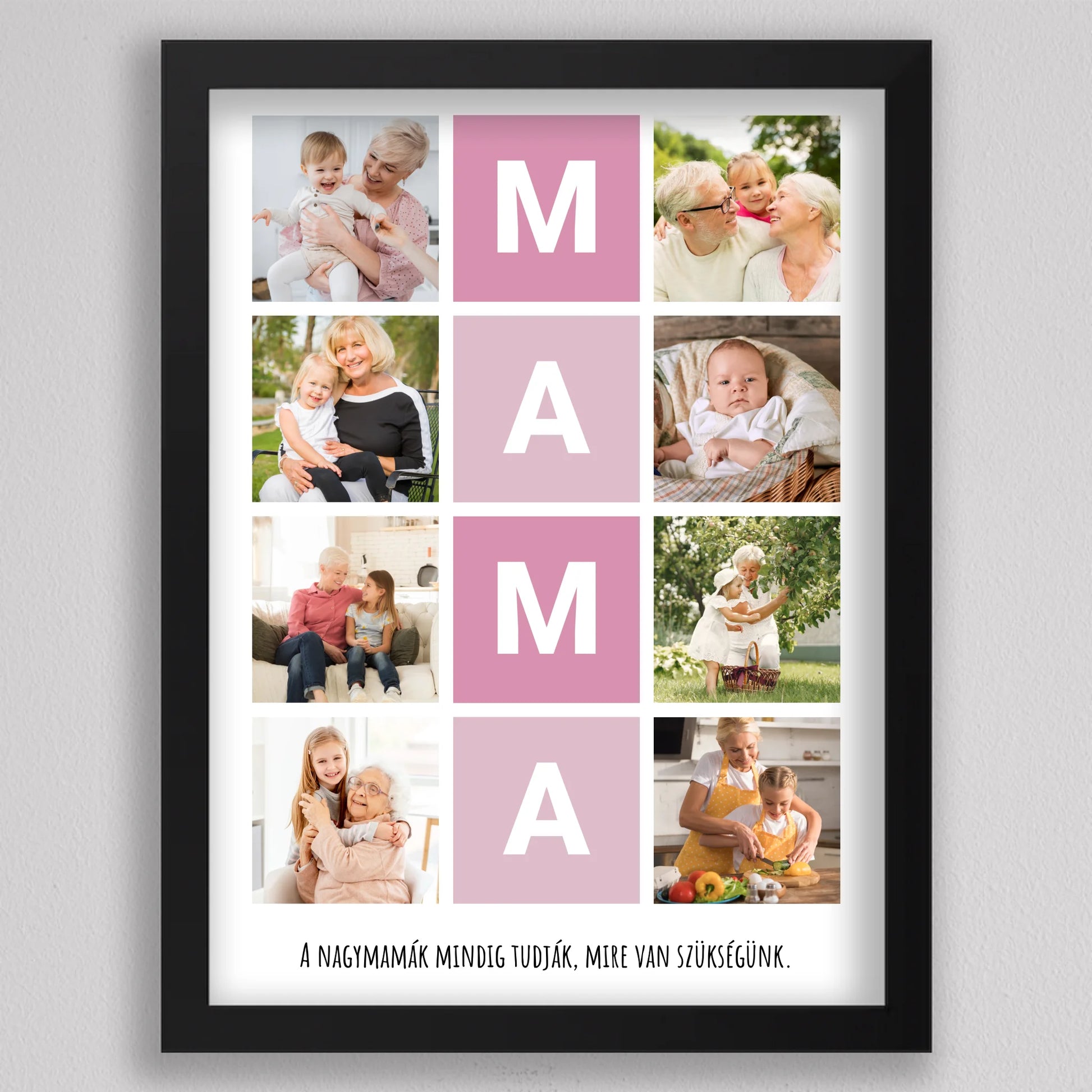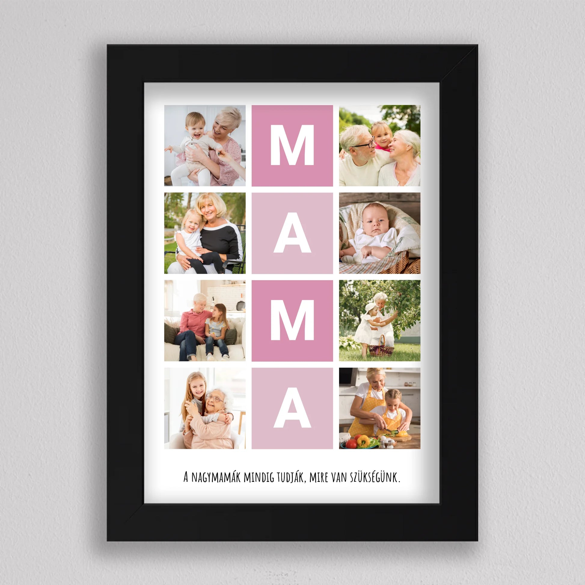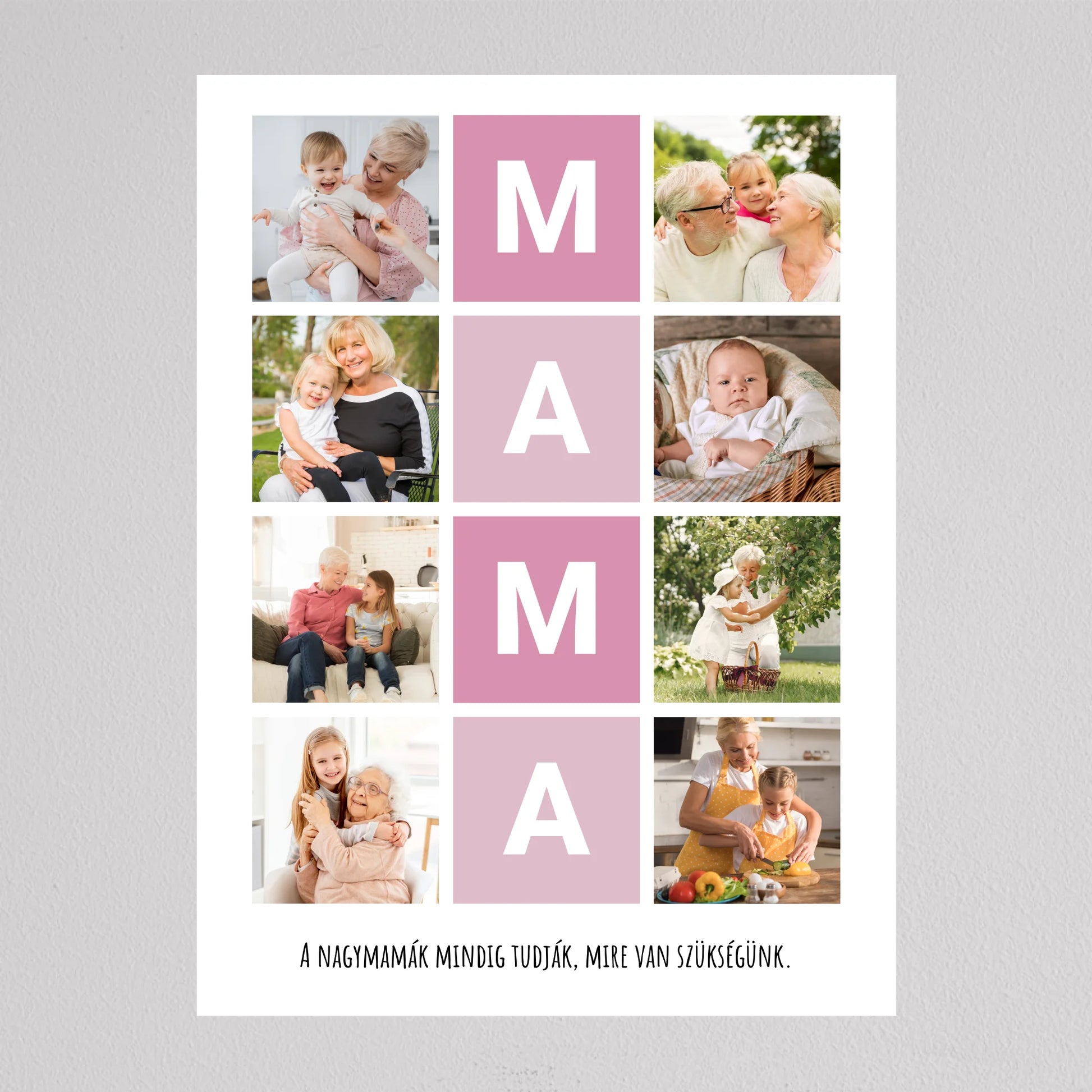 A MAMA kedvenc pillanatai fotó kollázs egy igazán különleges ajándék, amely tökéletesen megörökíti a nagymamával töltött legértékesebb pillanatokat. Ez a személyre szabható kollázs lehetőséget biztosít arra, hogy a szeretett nagymama életének legszebb emlékeit egy gyönyörű, esztétikus elrendezésben őrizhessük meg. A központi MAMA feliratot szívhez szóló családi fotók veszik körül, amelyek biztosan boldogságot hoznak minden nagymama szívébe. Legyen szó születésnapról, anyák napjáról vagy bármilyen különleges alkalomról, ez a kollázs mindig emlékezetes ajándék lesz, amely megmutatja, mennyire fontos számunkra a nagymama.