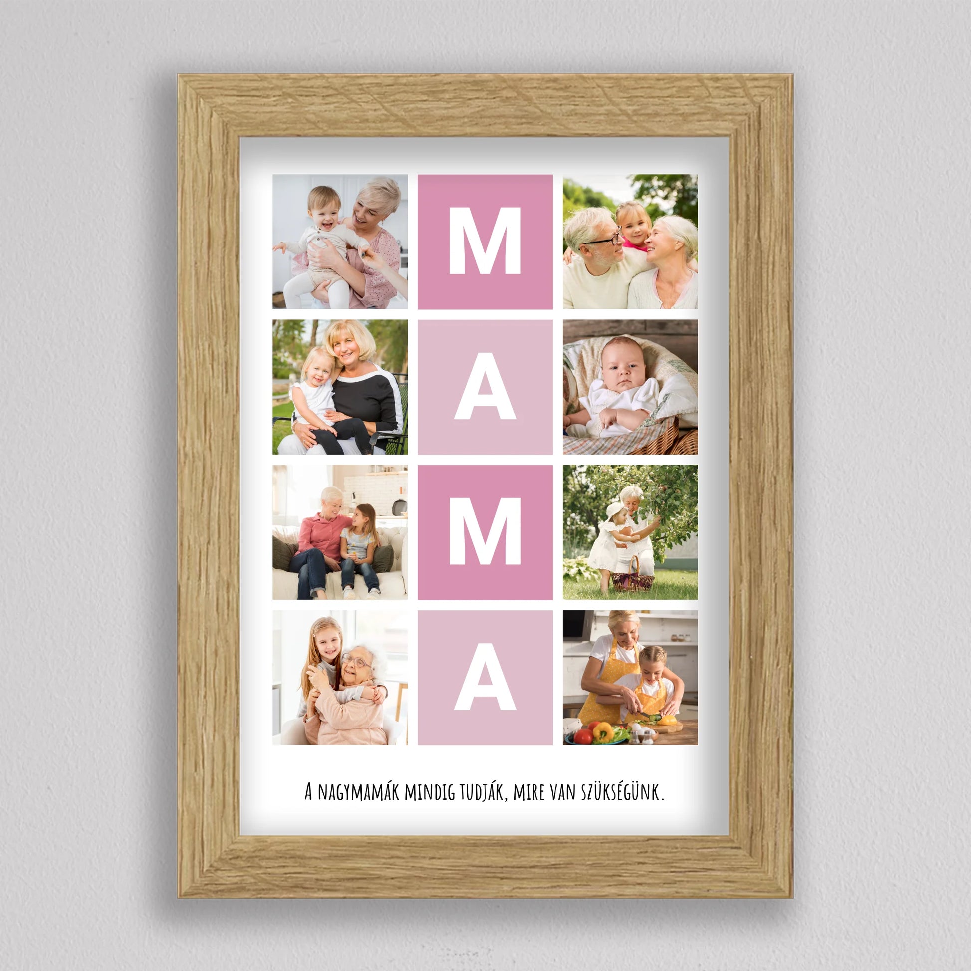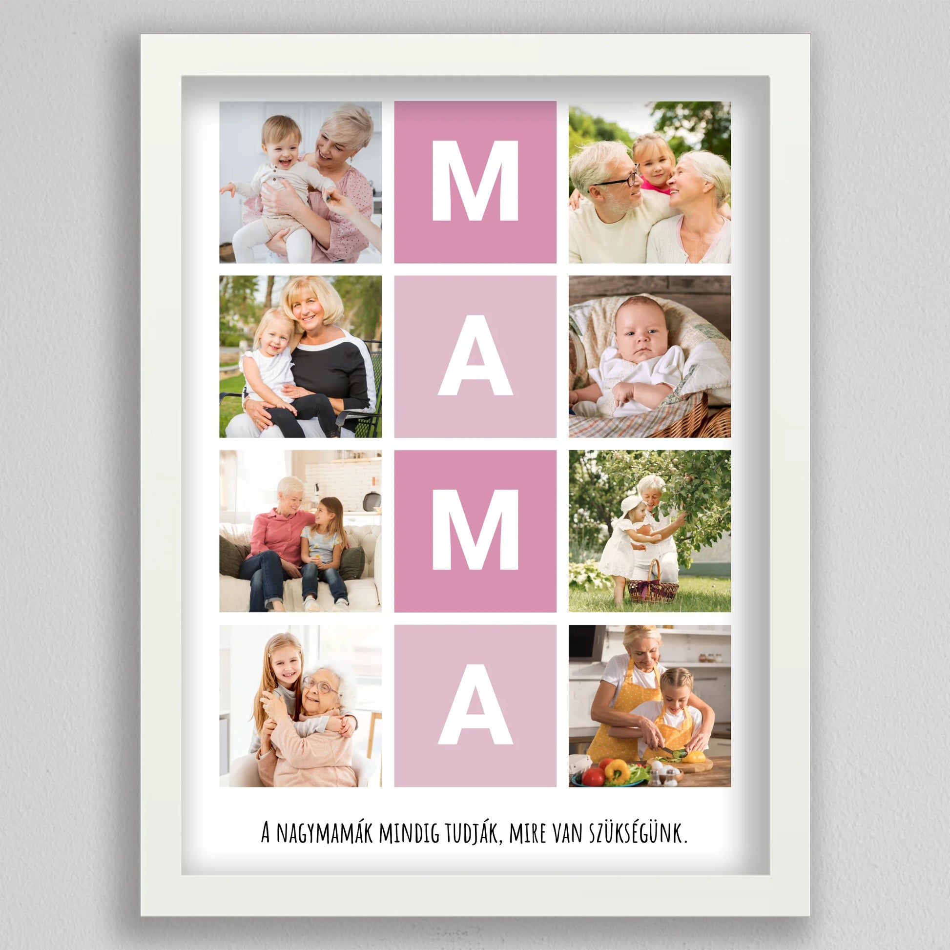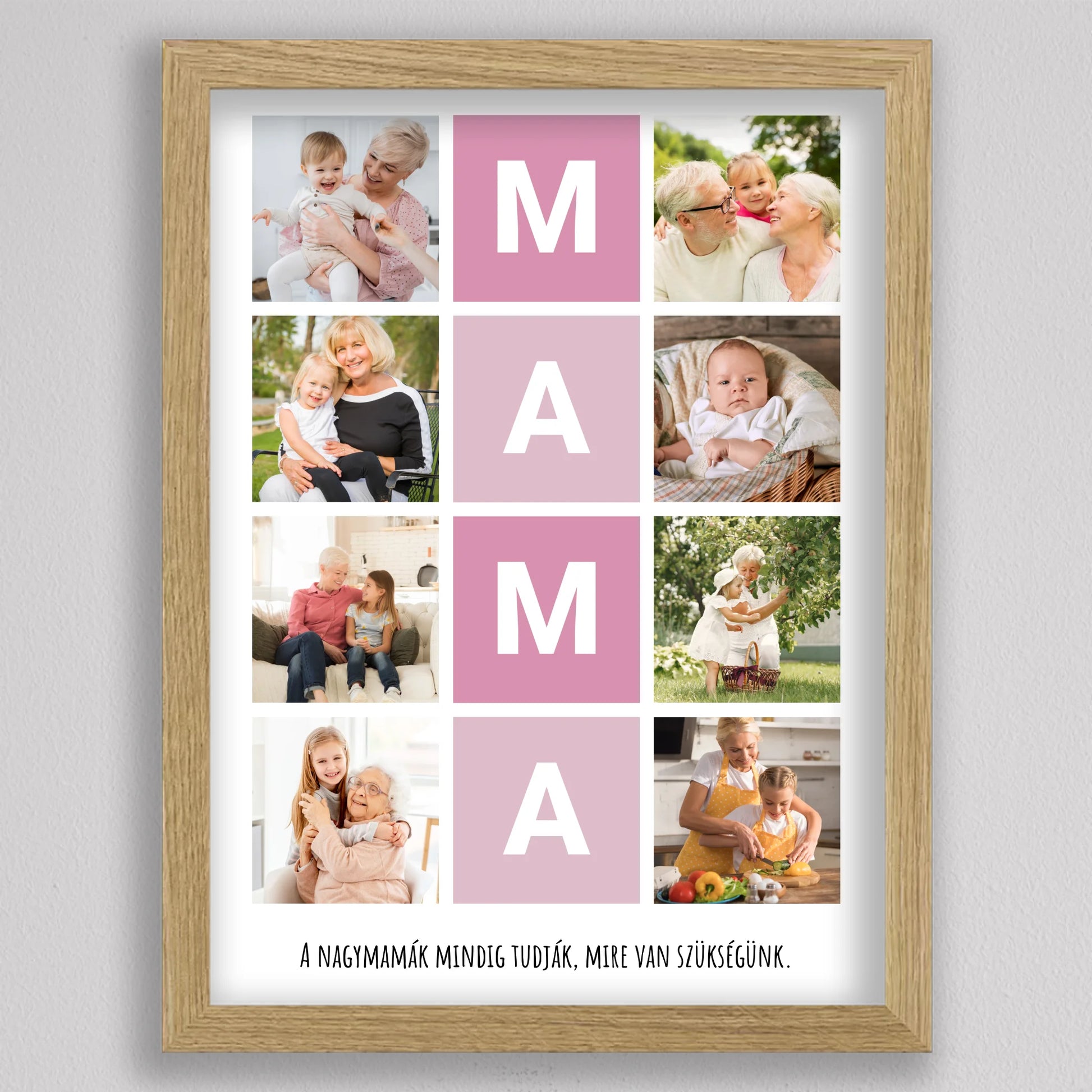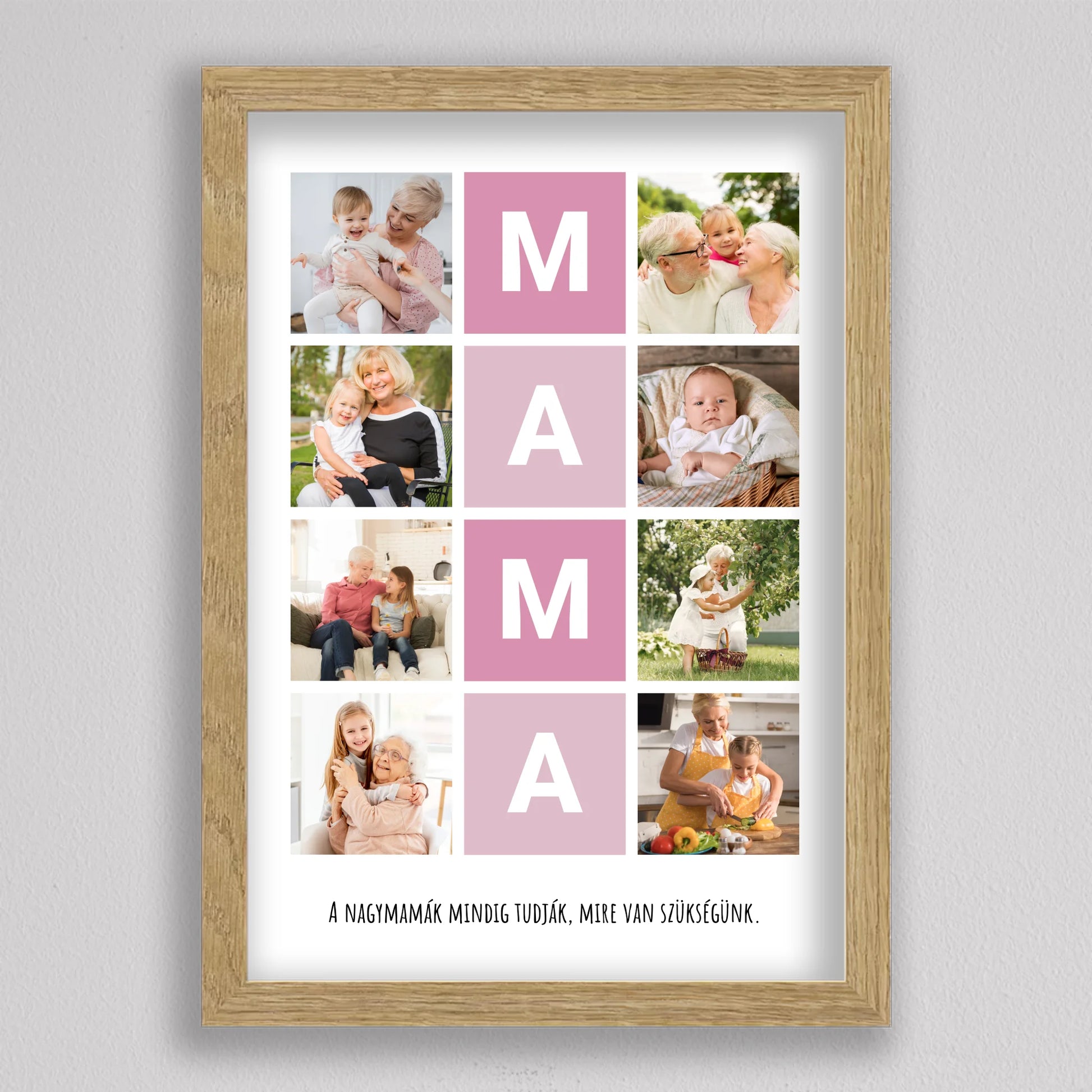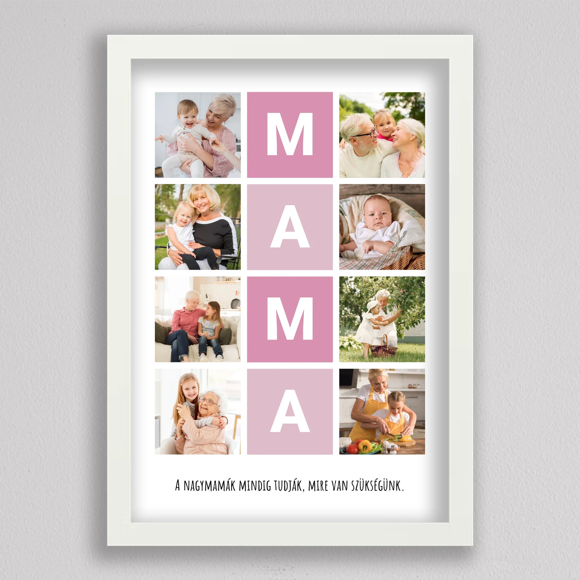 A MAMA kedvenc pillanatai fotó kollázs egy igazán különleges ajándék, amely tökéletesen megörökíti a nagymamával töltött legértékesebb pillanatokat. Ez a személyre szabható kollázs lehetőséget biztosít arra, hogy a szeretett nagymama életének legszebb emlékeit egy gyönyörű, esztétikus elrendezésben őrizhessük meg. A központi MAMA feliratot szívhez szóló családi fotók veszik körül, amelyek biztosan boldogságot hoznak minden nagymama szívébe. Legyen szó születésnapról, anyák napjáról vagy bármilyen különleges alkalomról, ez a kollázs mindig emlékezetes ajándék lesz, amely megmutatja, mennyire fontos számunkra a nagymama.