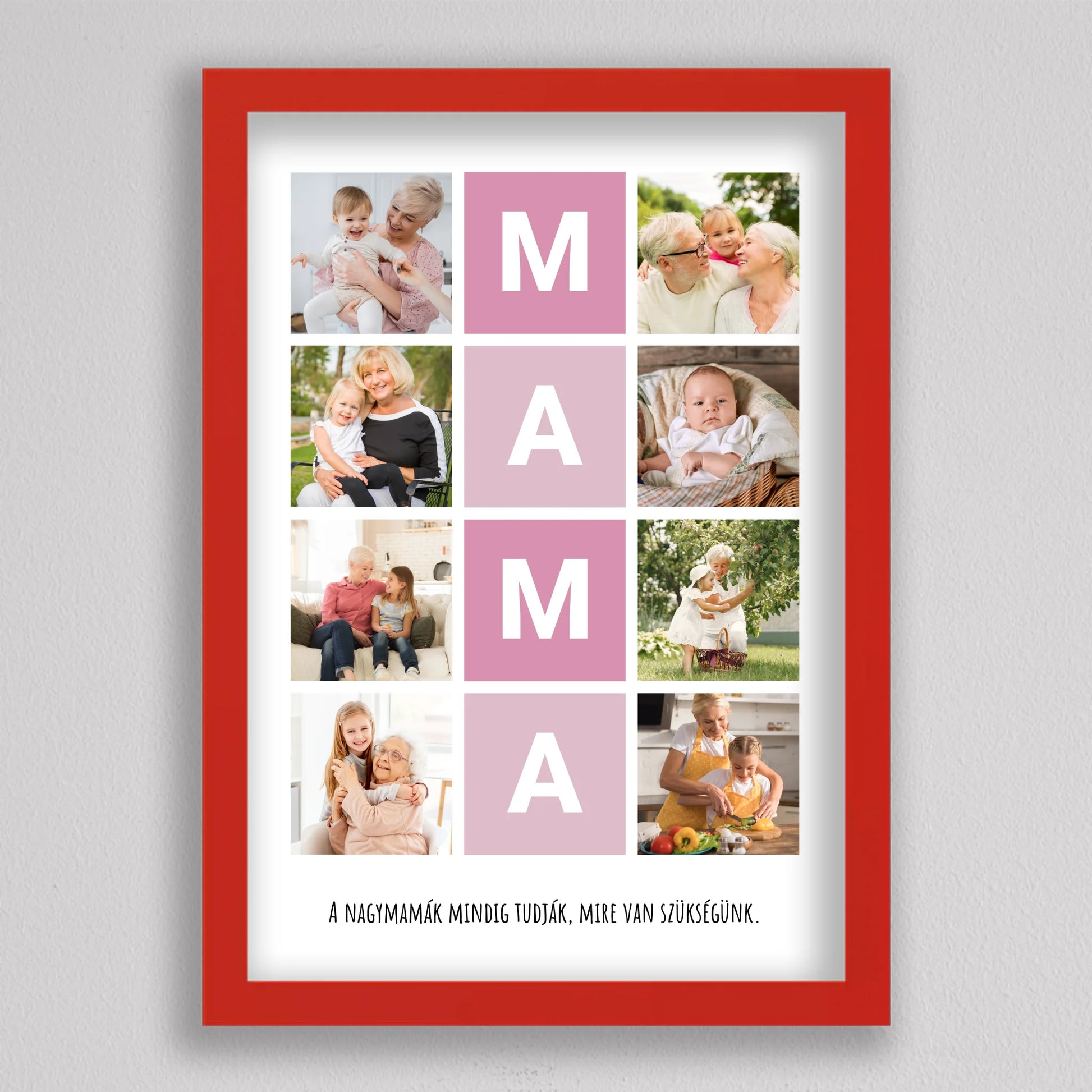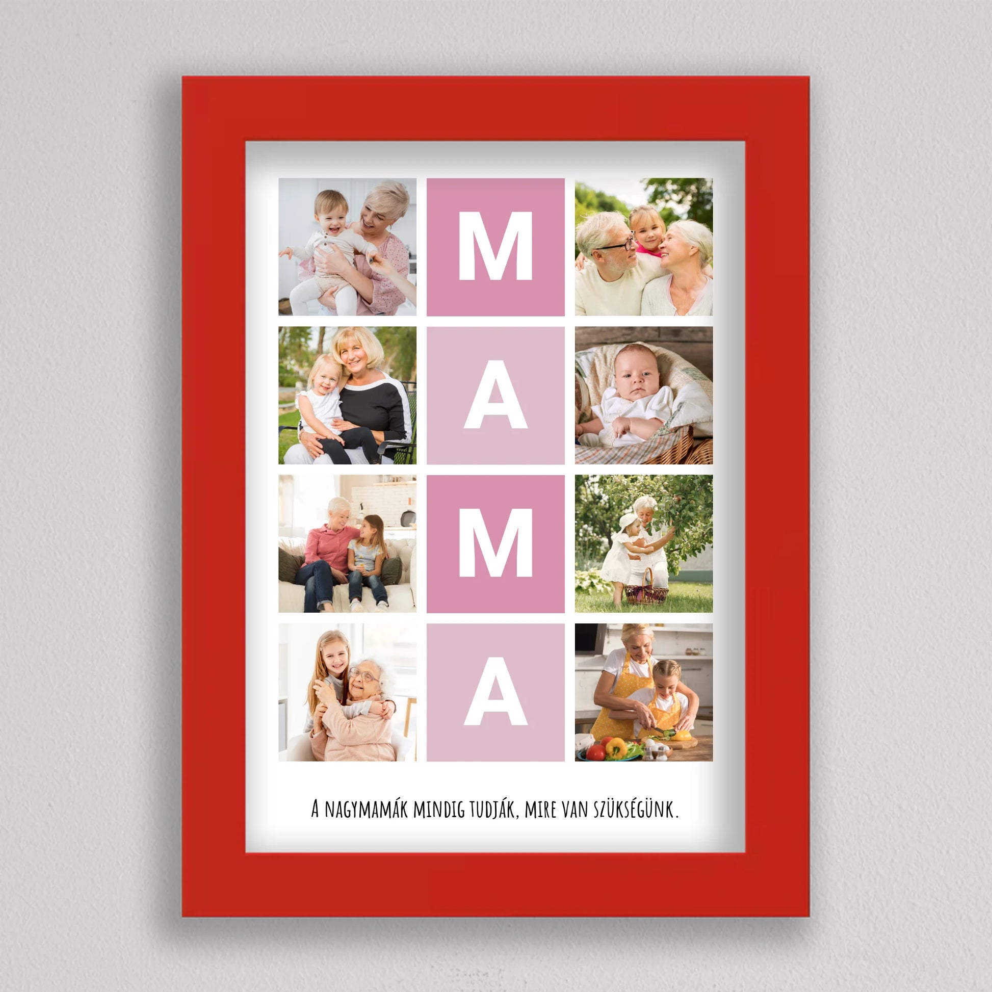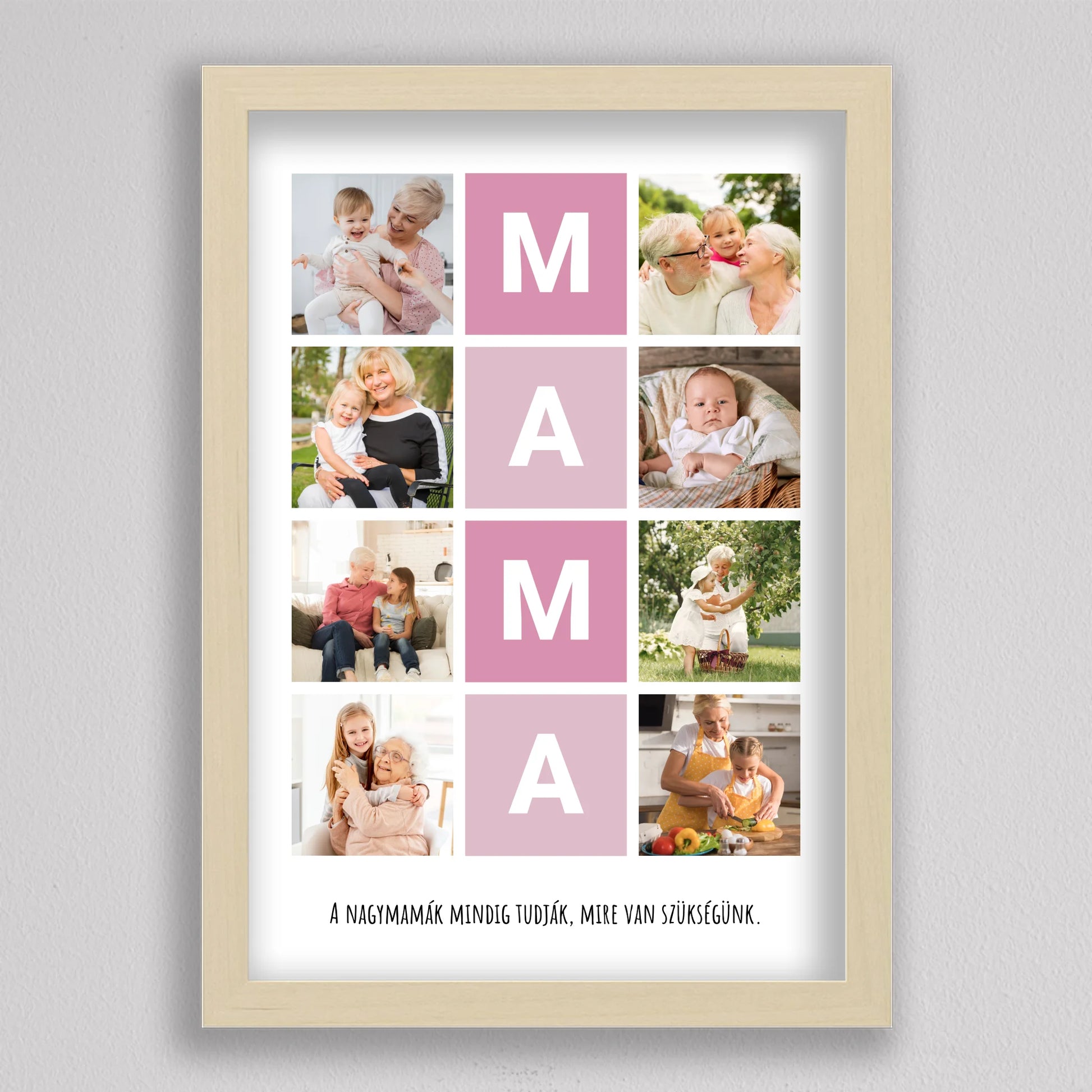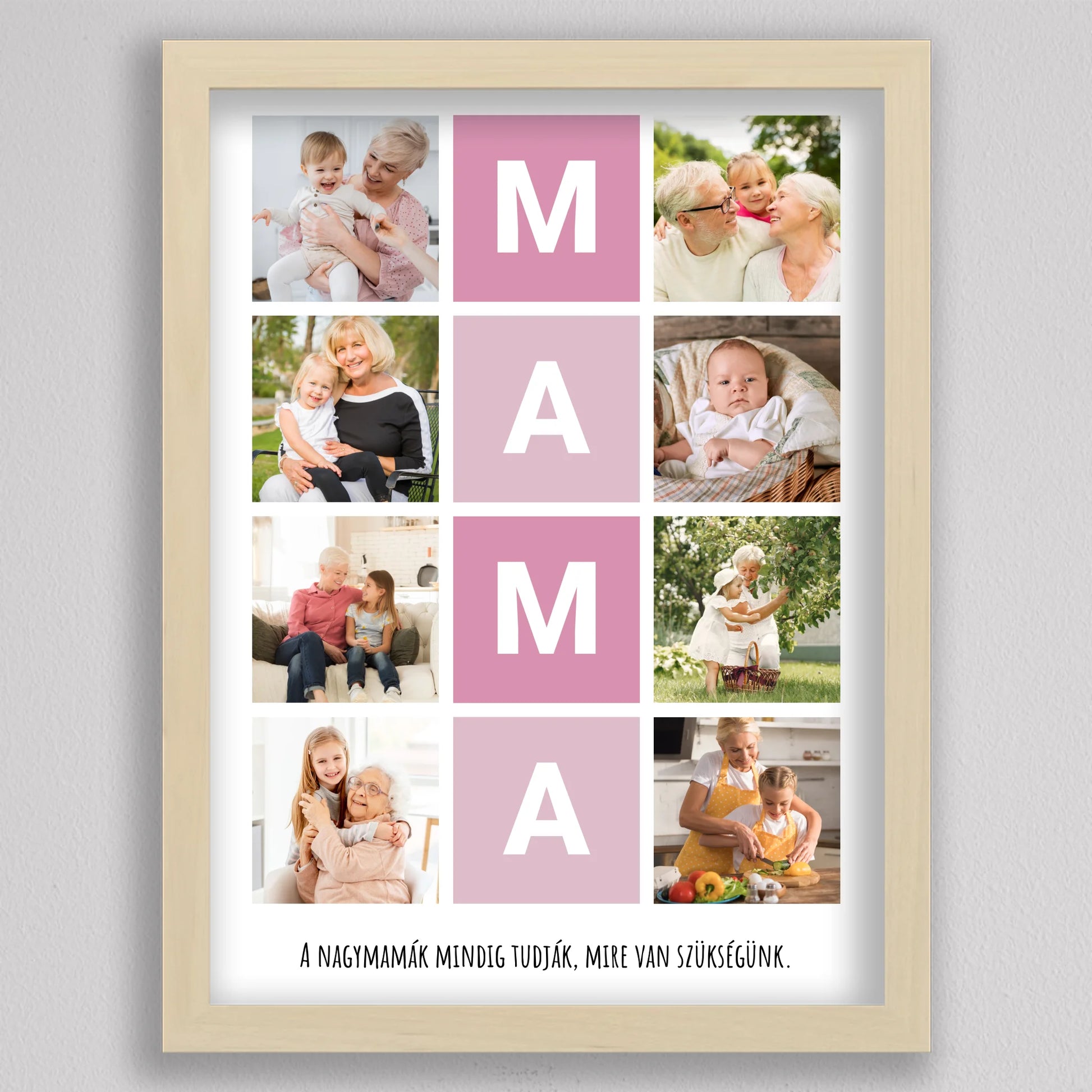 A MAMA kedvenc pillanatai fotó kollázs egy igazán különleges ajándék, amely tökéletesen megörökíti a nagymamával töltött legértékesebb pillanatokat. Ez a személyre szabható kollázs lehetőséget biztosít arra, hogy a szeretett nagymama életének legszebb emlékeit egy gyönyörű, esztétikus elrendezésben őrizhessük meg. A központi MAMA feliratot szívhez szóló családi fotók veszik körül, amelyek biztosan boldogságot hoznak minden nagymama szívébe. Legyen szó születésnapról, anyák napjáról vagy bármilyen különleges alkalomról, ez a kollázs mindig emlékezetes ajándék lesz, amely megmutatja, mennyire fontos számunkra a nagymama.