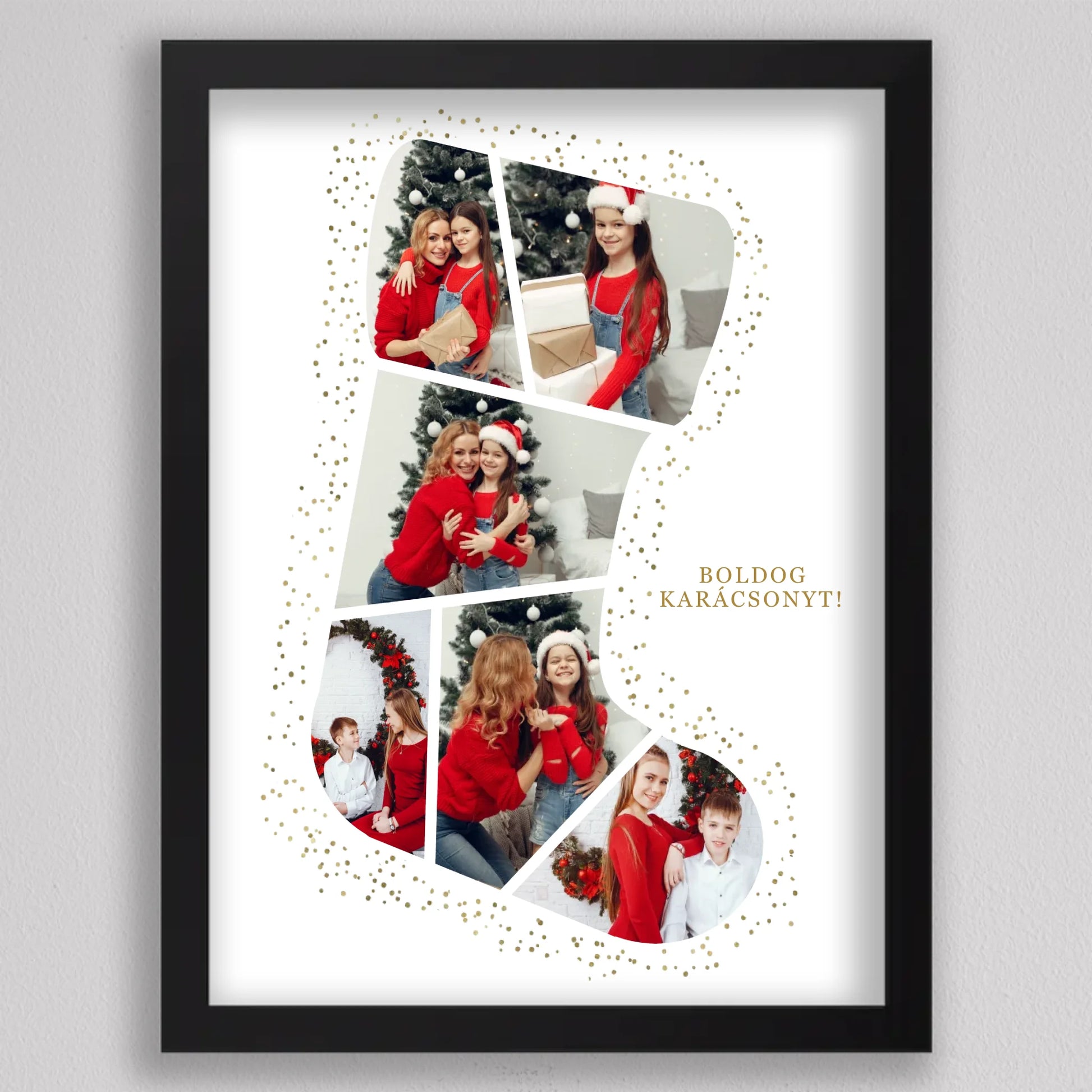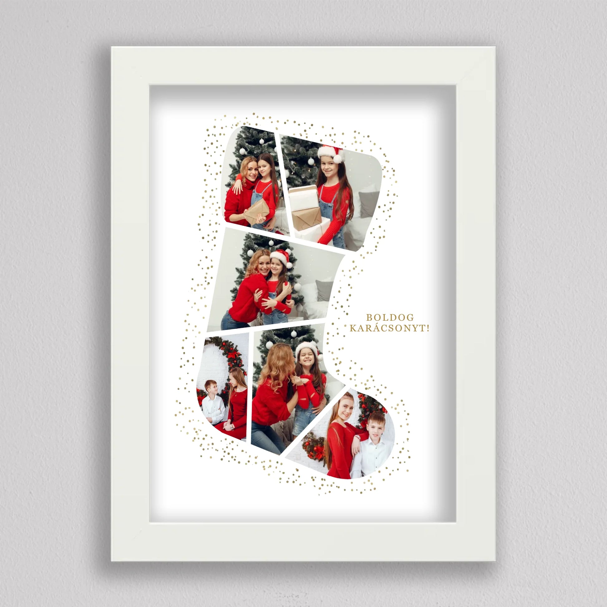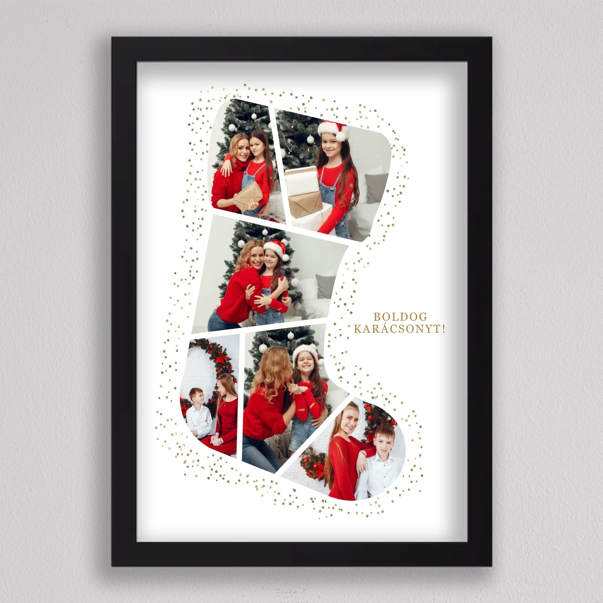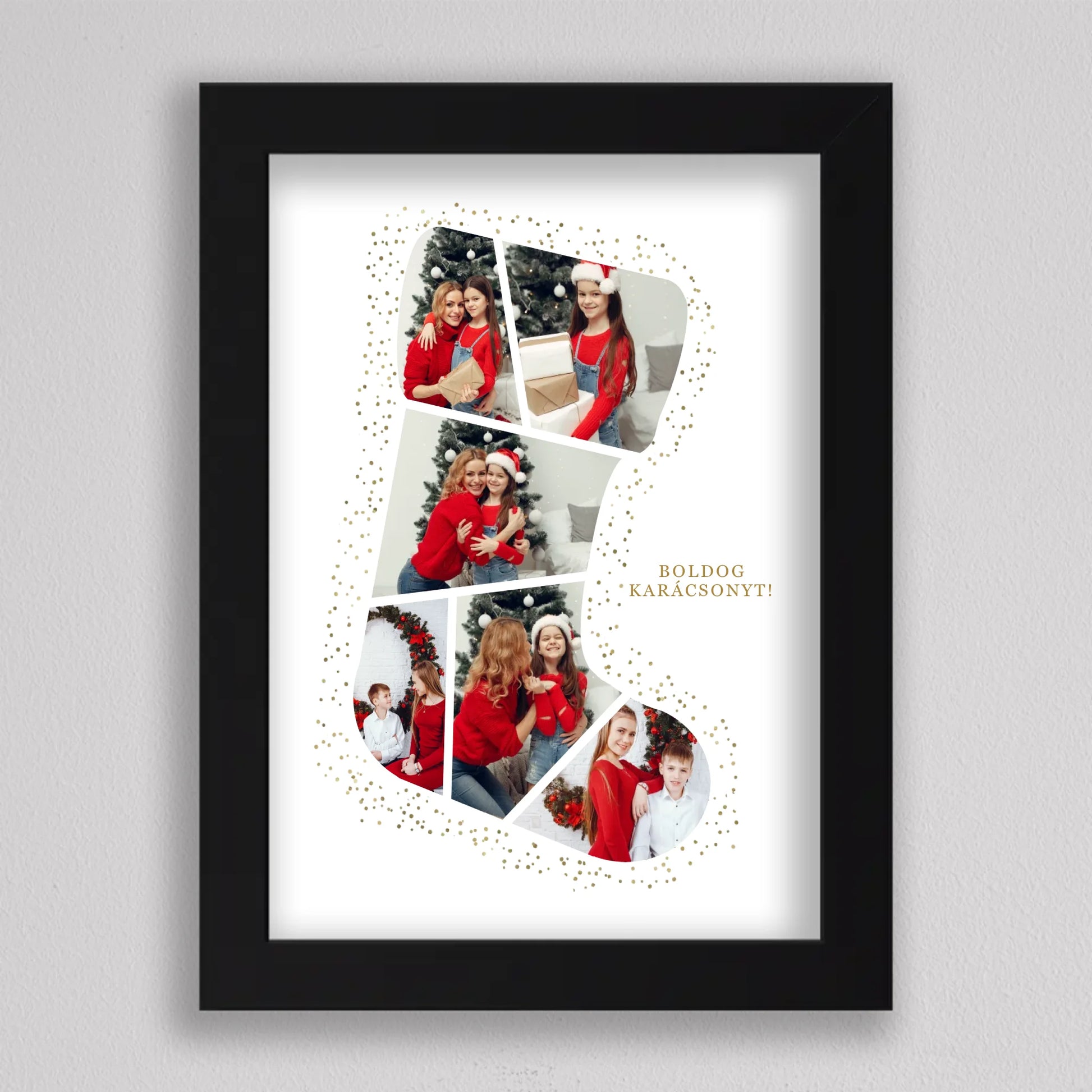 A Mikuláscsizma Alakú Karácsonyi Fotó Kollázs egy egyedülálló és személyre szabható dekoráció, amely tökéletesen megörökíti a család legkedvesebb ünnepi pillanatait. Ez az ötletes kollázs mikuláscsizma formában elrendezett fotókat tartalmaz, melyeket ünnepi díszek és arany csillámok kereteznek, így igazán különleges karácsonyi hangulatot áraszt. Személyre szabhatósága révén minden családtag mosolyát örök emlékként őrzi, így ideális választás karácsonyi ajándéknak. Kiváló minőségű nyomtatásának köszönhetően a kollázs hosszú évekig szép marad, és bármely otthon meghitt karácsonyi dekorációjává válhat.