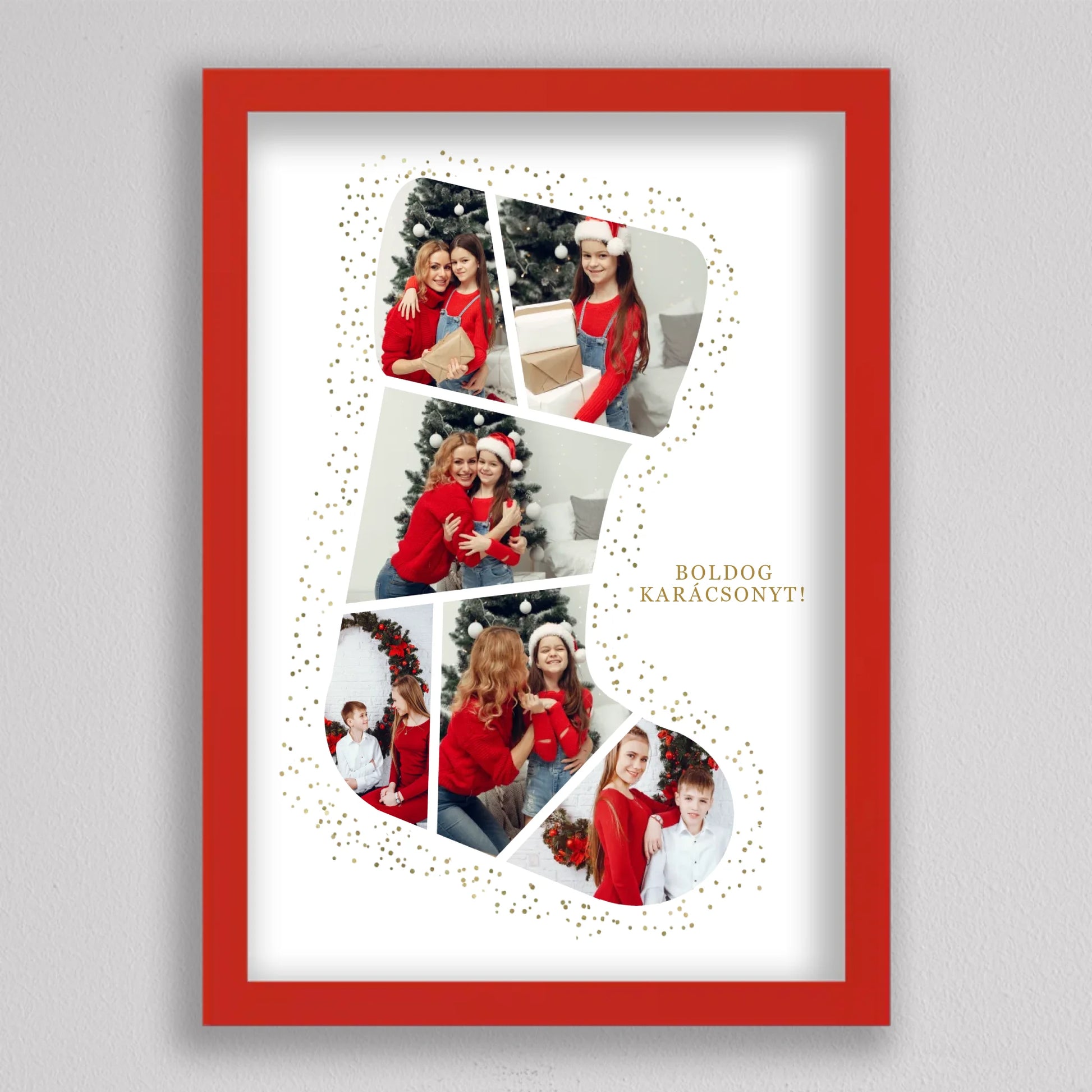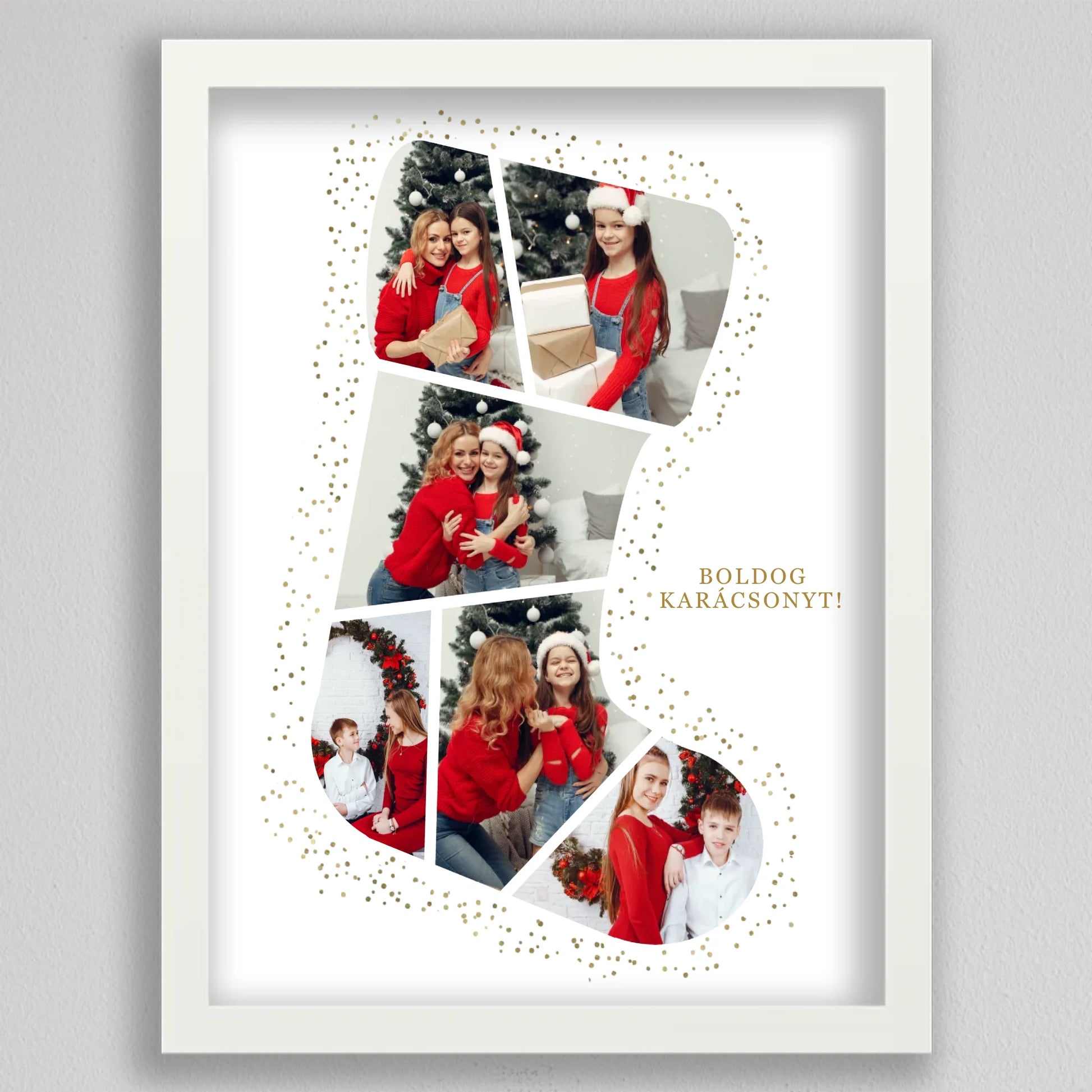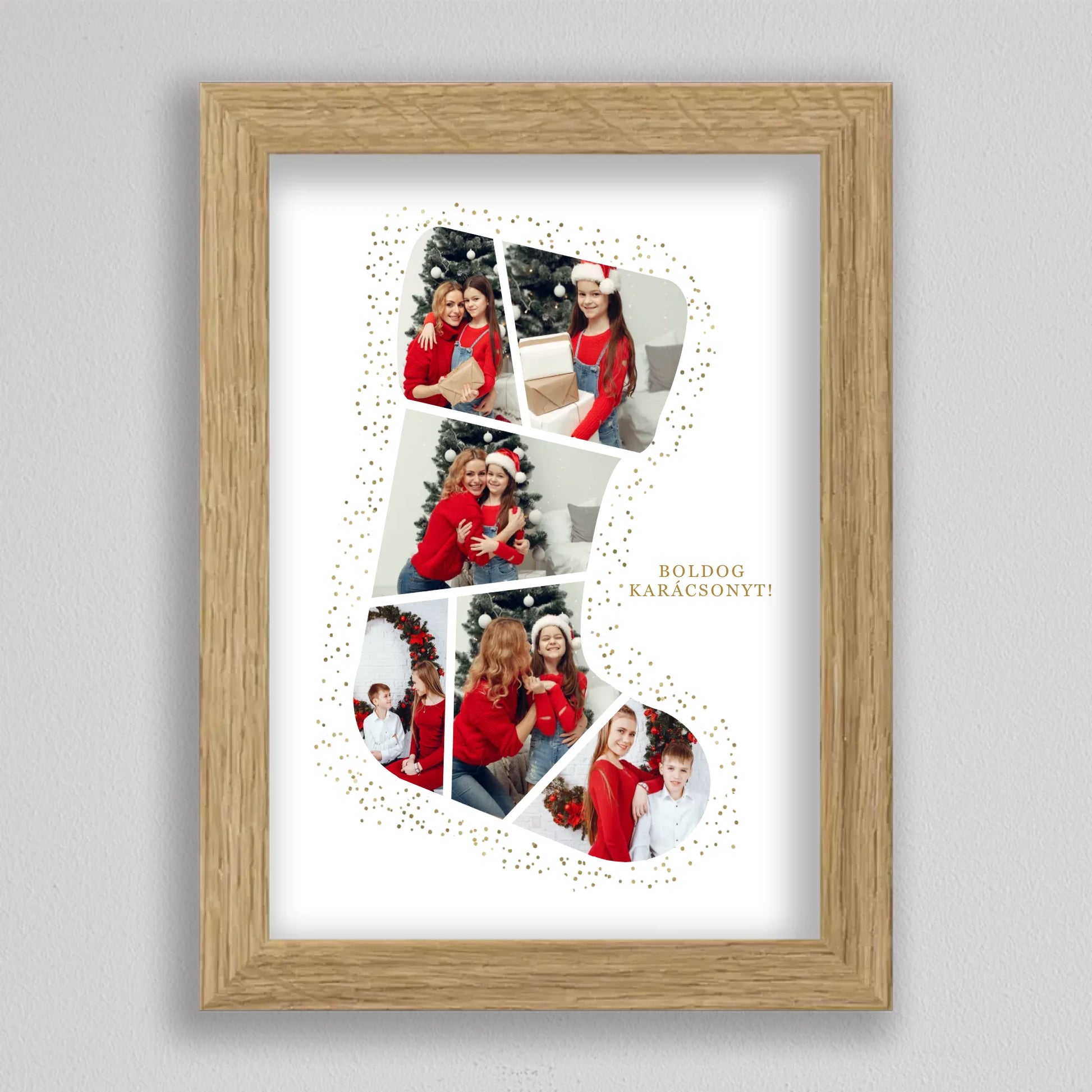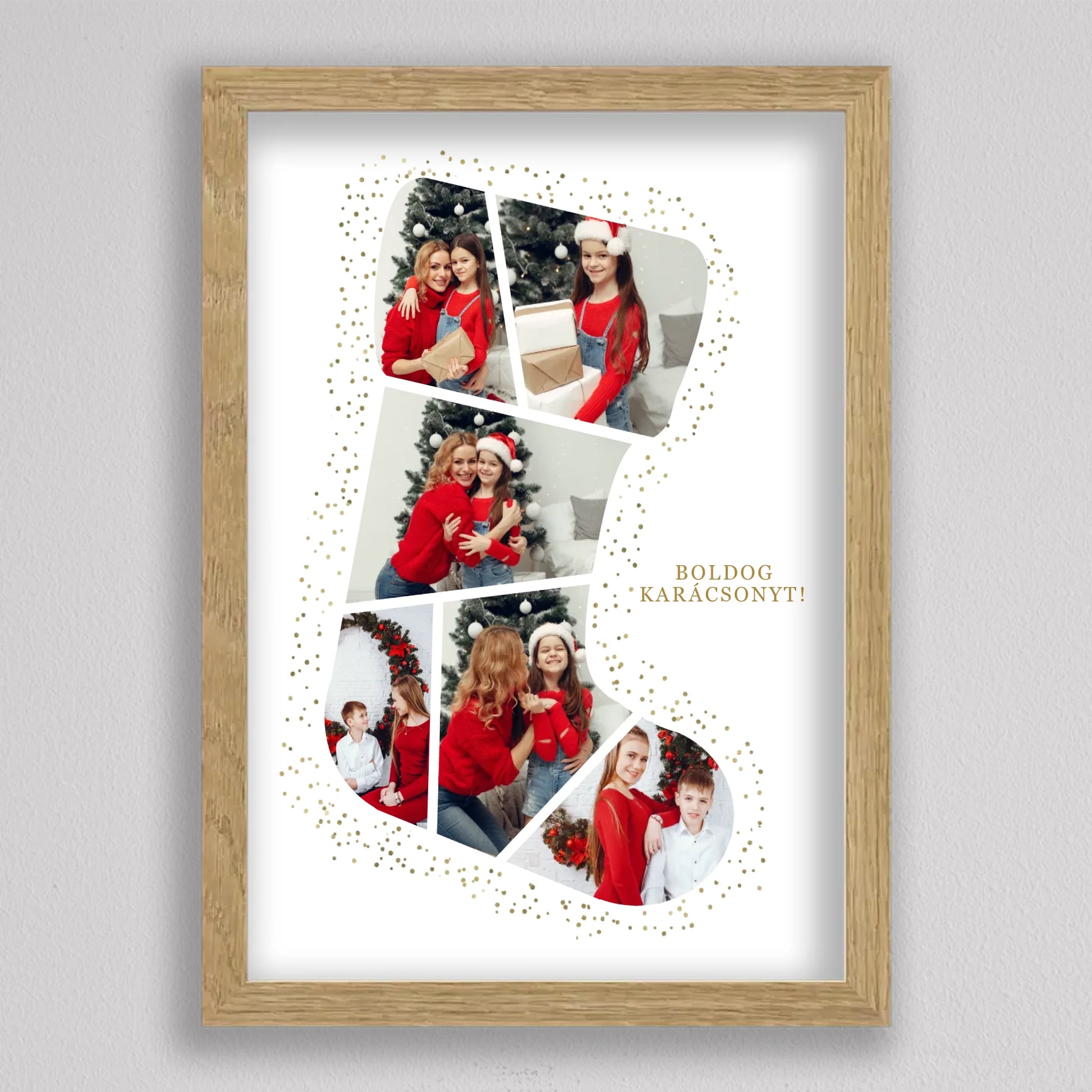 A Mikuláscsizma Alakú Karácsonyi Fotó Kollázs egy egyedülálló és személyre szabható dekoráció, amely tökéletesen megörökíti a család legkedvesebb ünnepi pillanatait. Ez az ötletes kollázs mikuláscsizma formában elrendezett fotókat tartalmaz, melyeket ünnepi díszek és arany csillámok kereteznek, így igazán különleges karácsonyi hangulatot áraszt. Személyre szabhatósága révén minden családtag mosolyát örök emlékként őrzi, így ideális választás karácsonyi ajándéknak. Kiváló minőségű nyomtatásának köszönhetően a kollázs hosszú évekig szép marad, és bármely otthon meghitt karácsonyi dekorációjává válhat.