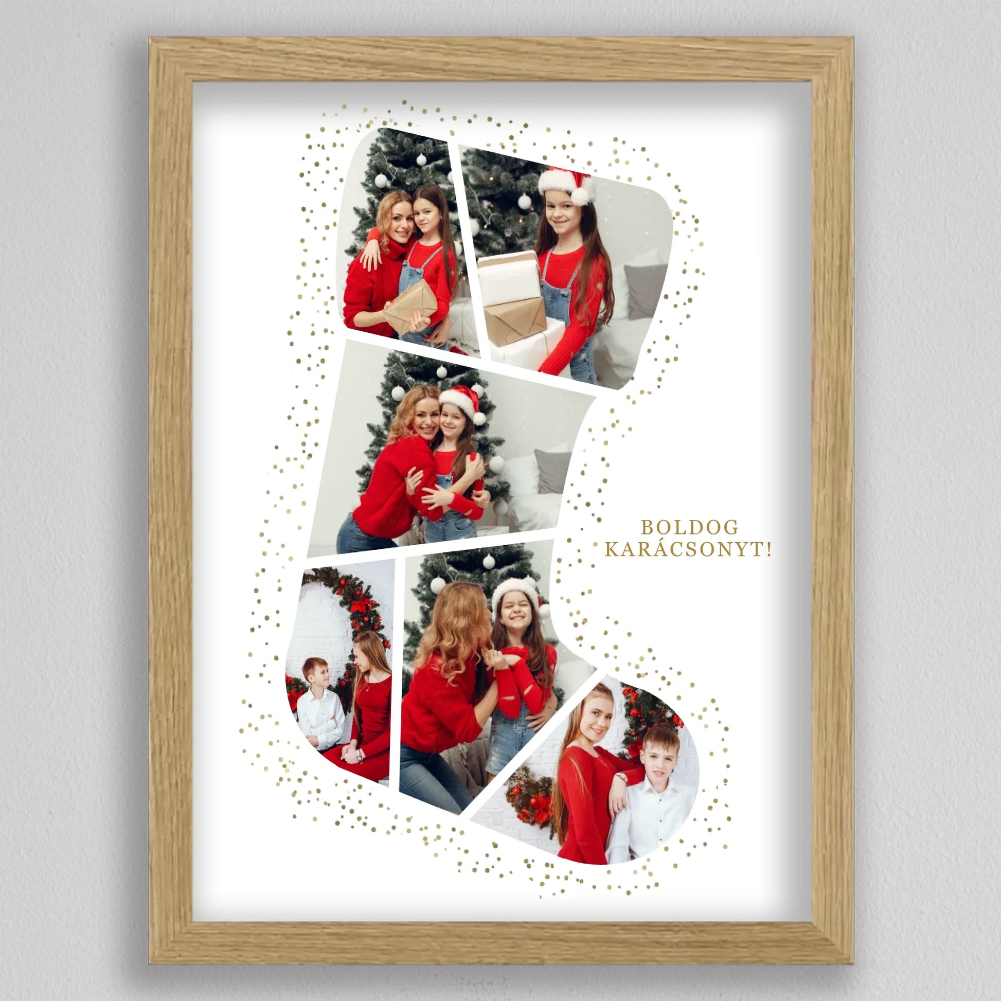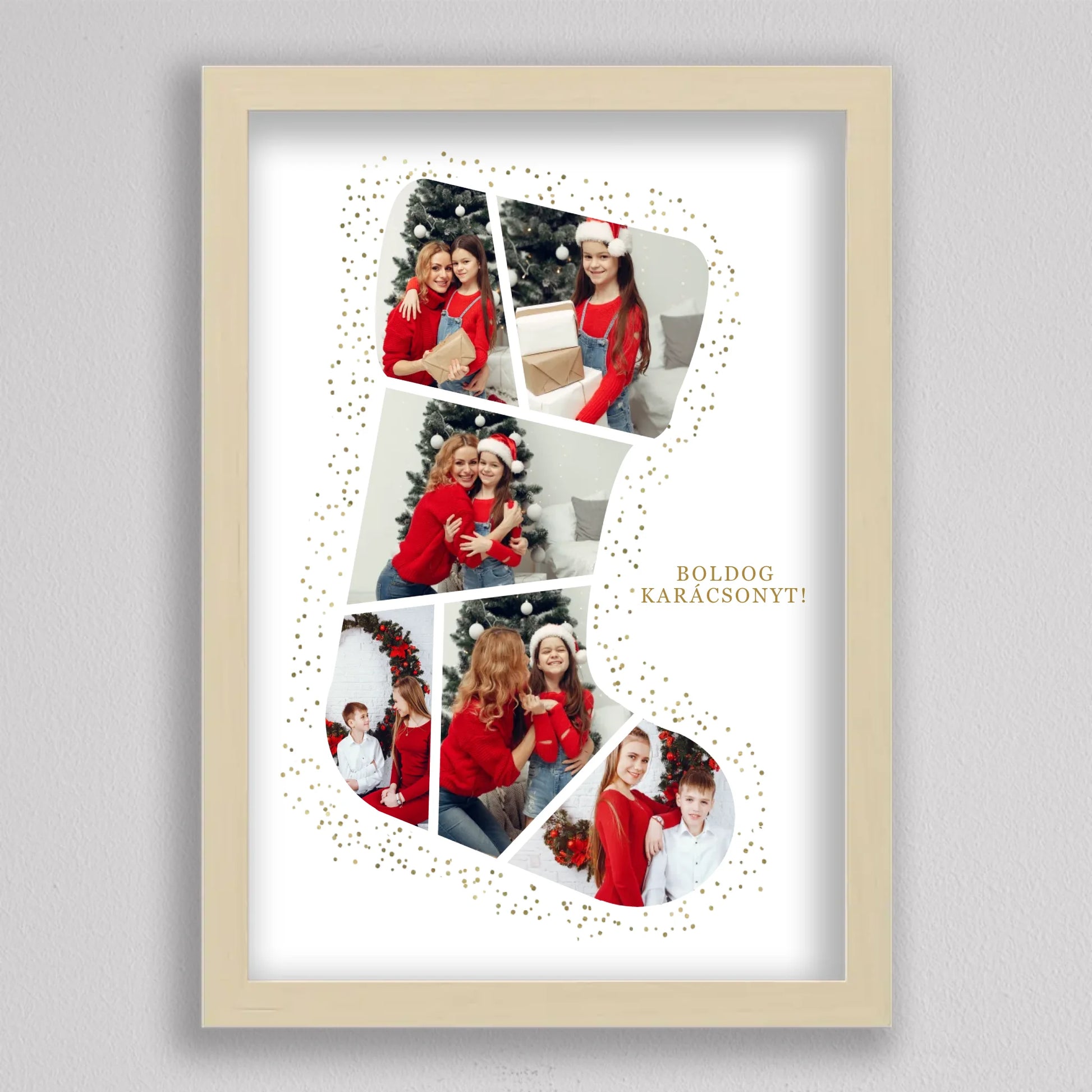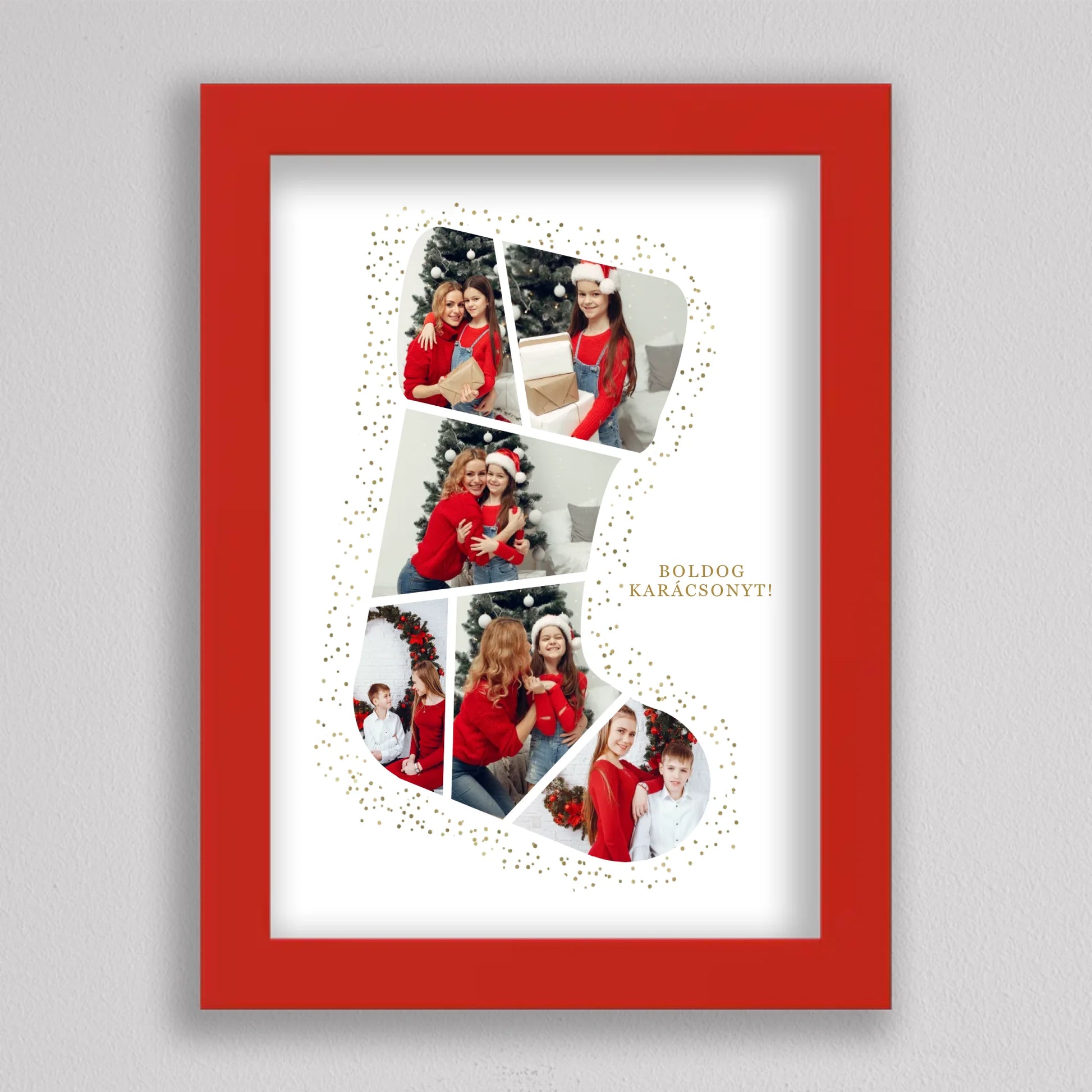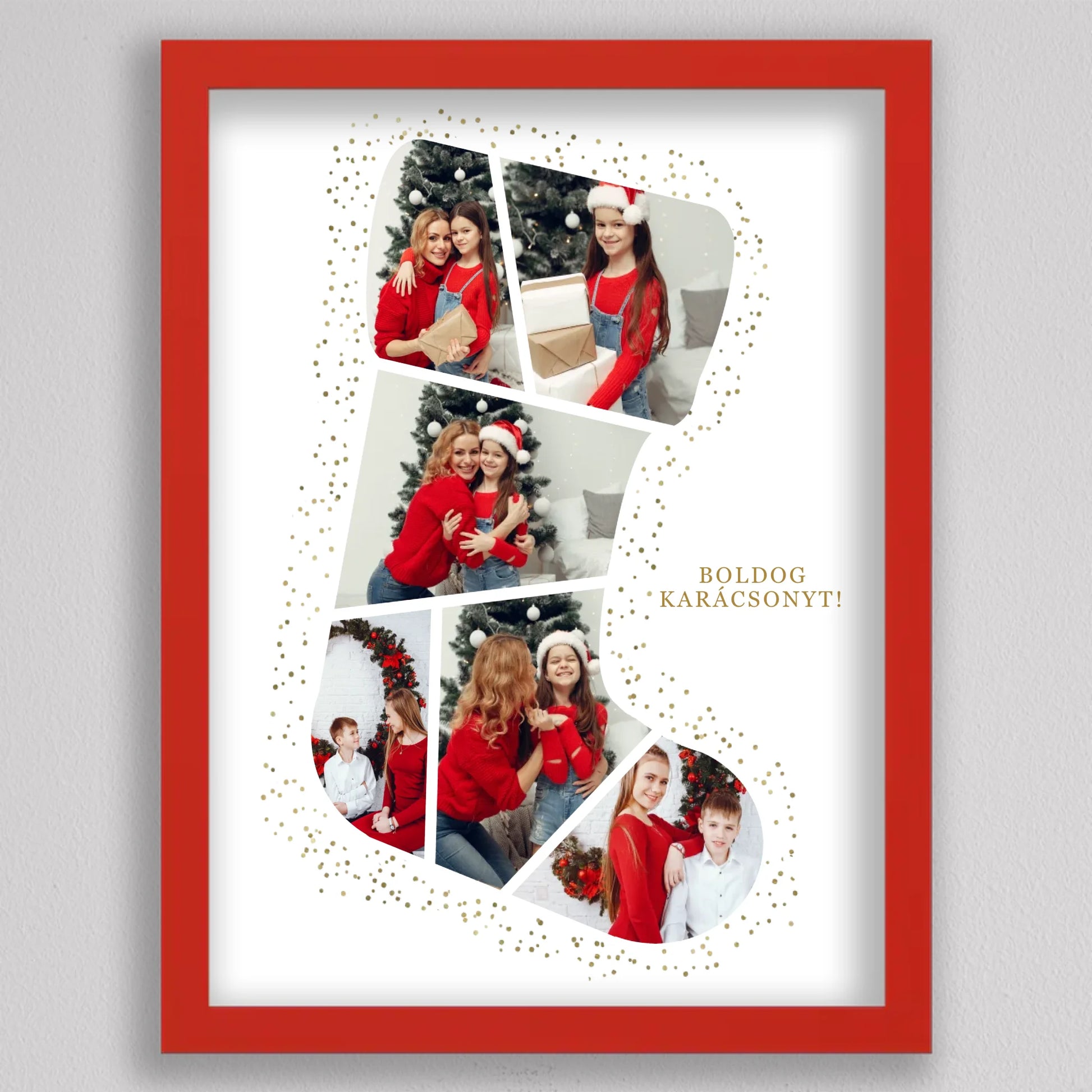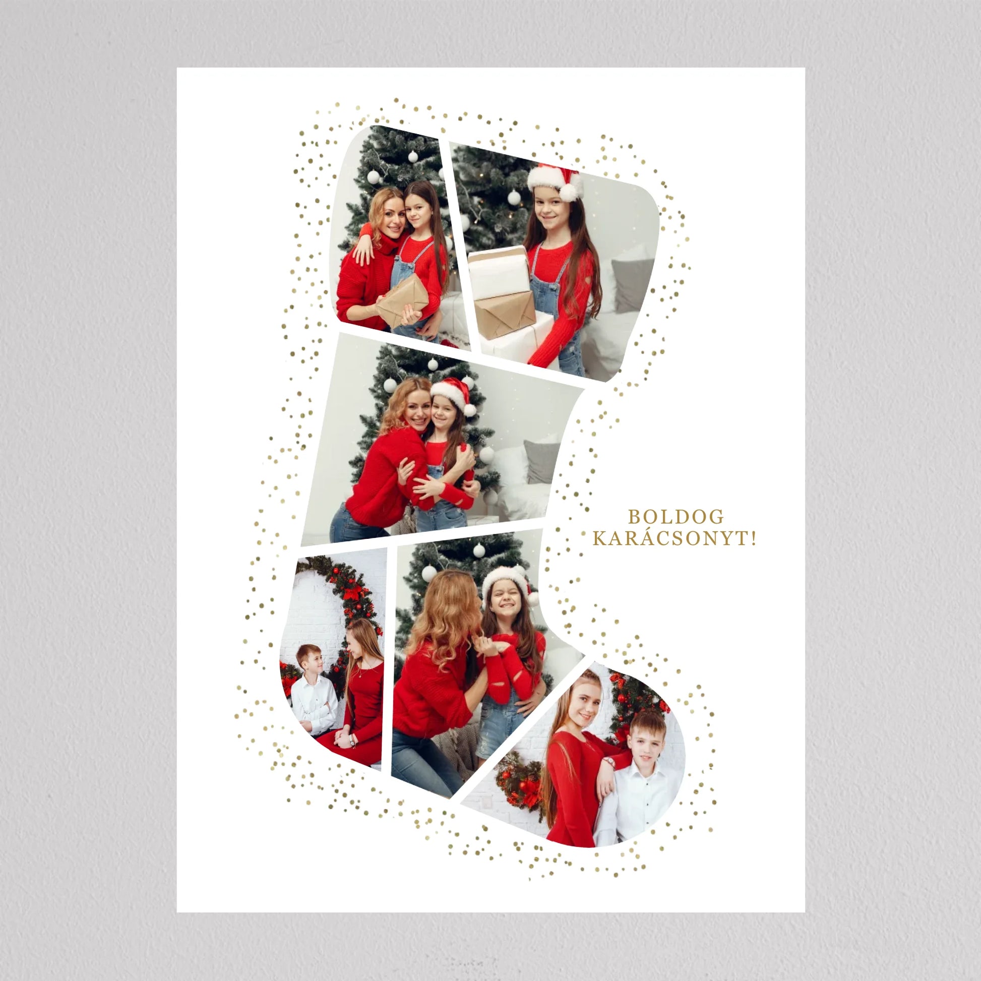 A Mikuláscsizma Alakú Karácsonyi Fotó Kollázs egy egyedülálló és személyre szabható dekoráció, amely tökéletesen megörökíti a család legkedvesebb ünnepi pillanatait. Ez az ötletes kollázs mikuláscsizma formában elrendezett fotókat tartalmaz, melyeket ünnepi díszek és arany csillámok kereteznek, így igazán különleges karácsonyi hangulatot áraszt. Személyre szabhatósága révén minden családtag mosolyát örök emlékként őrzi, így ideális választás karácsonyi ajándéknak. Kiváló minőségű nyomtatásának köszönhetően a kollázs hosszú évekig szép marad, és bármely otthon meghitt karácsonyi dekorációjává válhat.