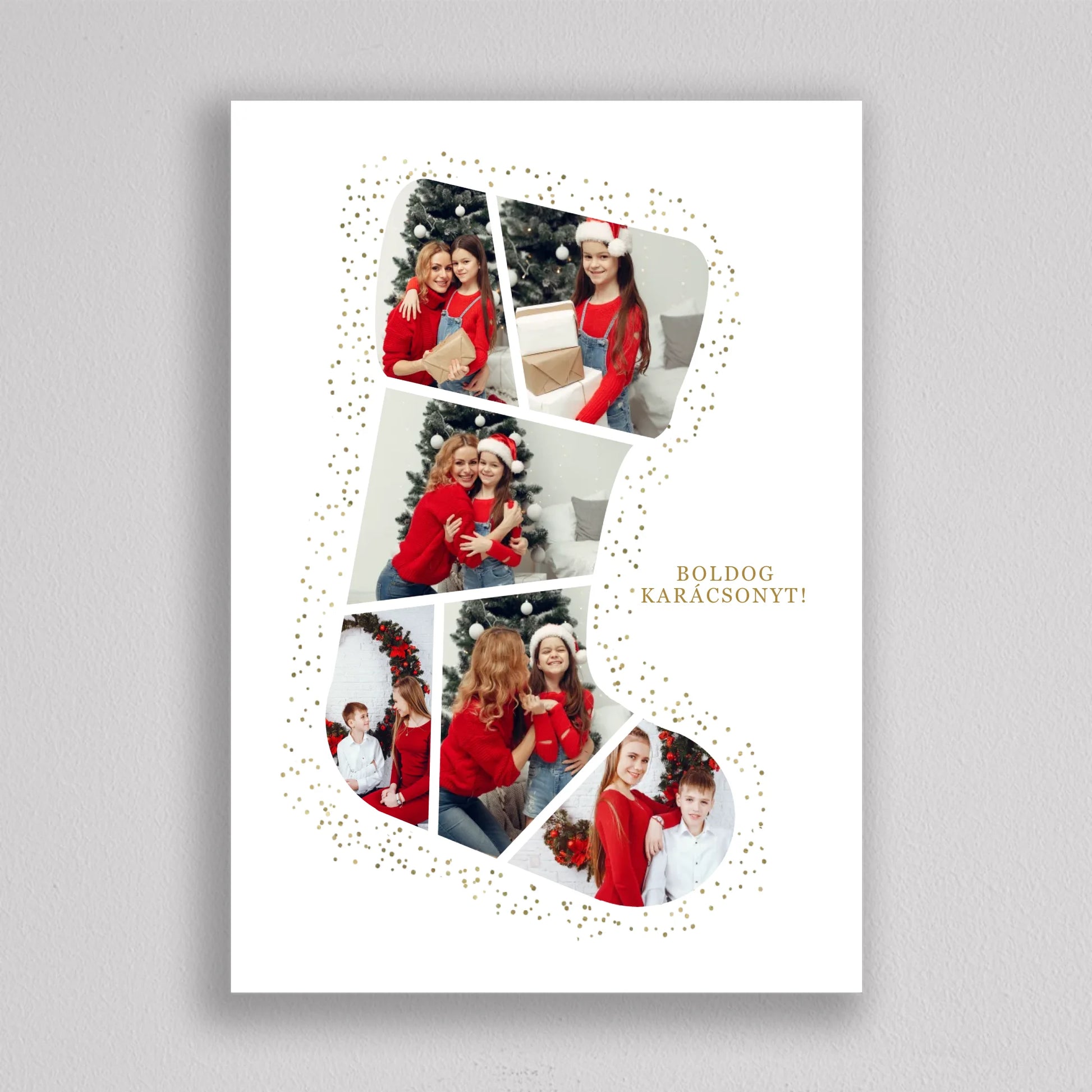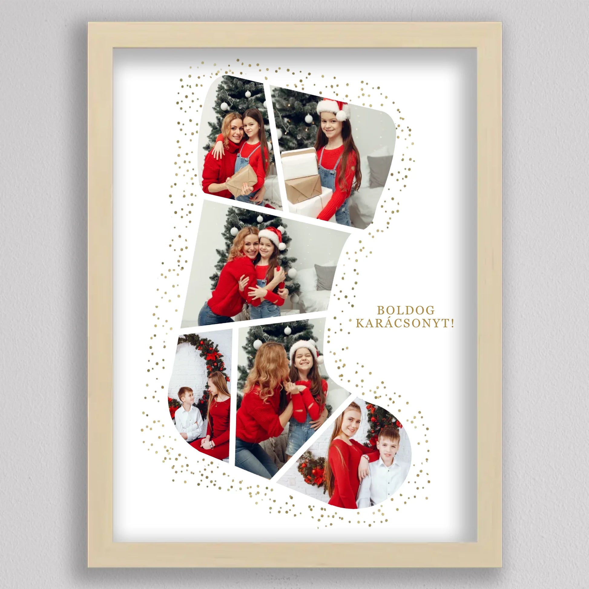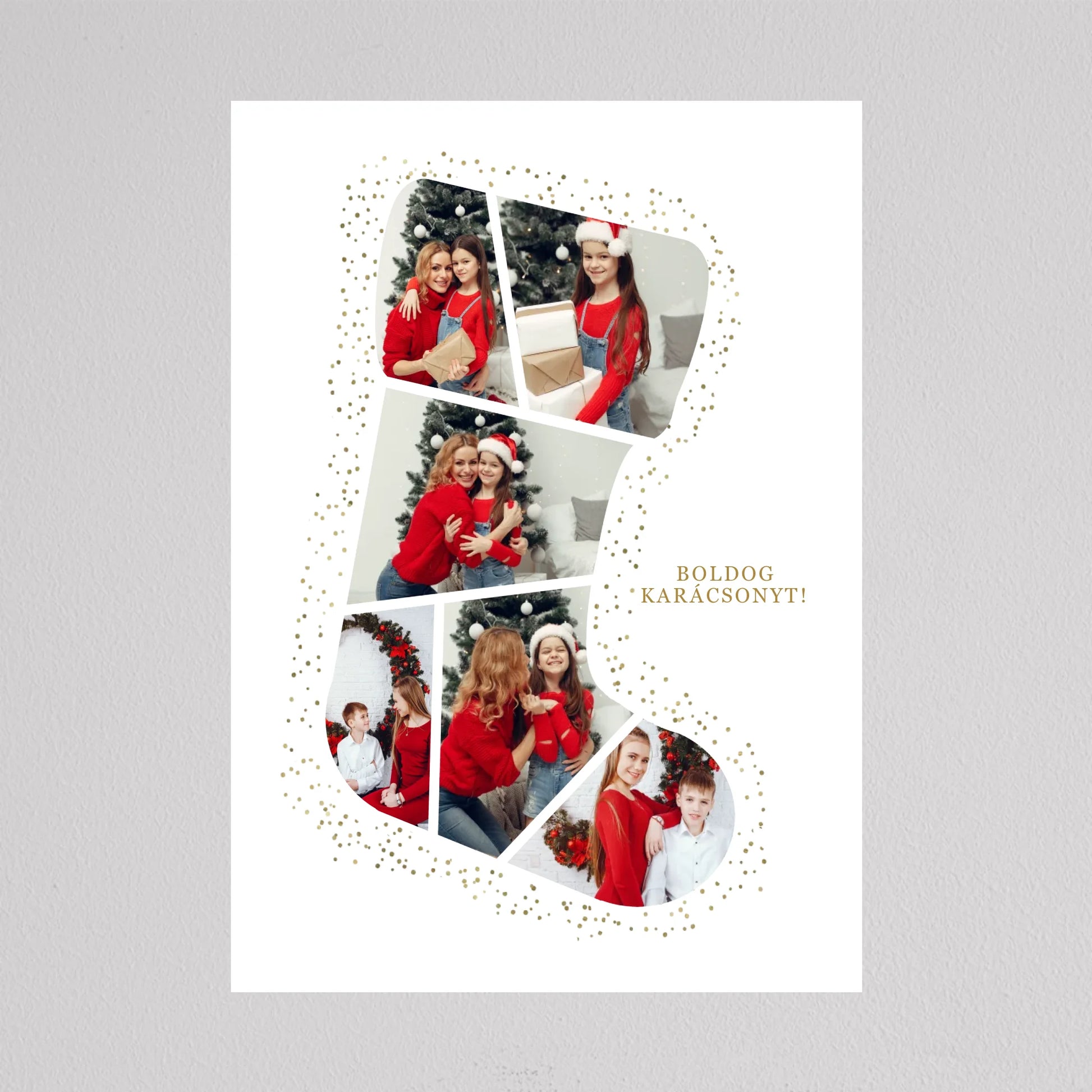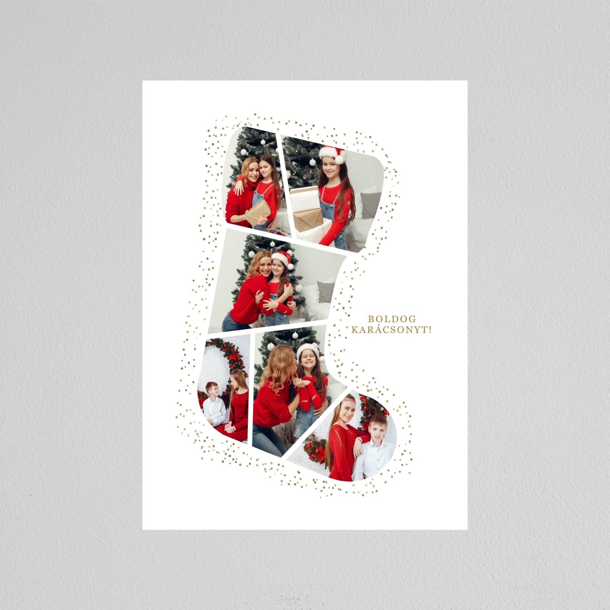 A Mikuláscsizma Alakú Karácsonyi Fotó Kollázs egy egyedülálló és személyre szabható dekoráció, amely tökéletesen megörökíti a család legkedvesebb ünnepi pillanatait. Ez az ötletes kollázs mikuláscsizma formában elrendezett fotókat tartalmaz, melyeket ünnepi díszek és arany csillámok kereteznek, így igazán különleges karácsonyi hangulatot áraszt. Személyre szabhatósága révén minden családtag mosolyát örök emlékként őrzi, így ideális választás karácsonyi ajándéknak. Kiváló minőségű nyomtatásának köszönhetően a kollázs hosszú évekig szép marad, és bármely otthon meghitt karácsonyi dekorációjává válhat.