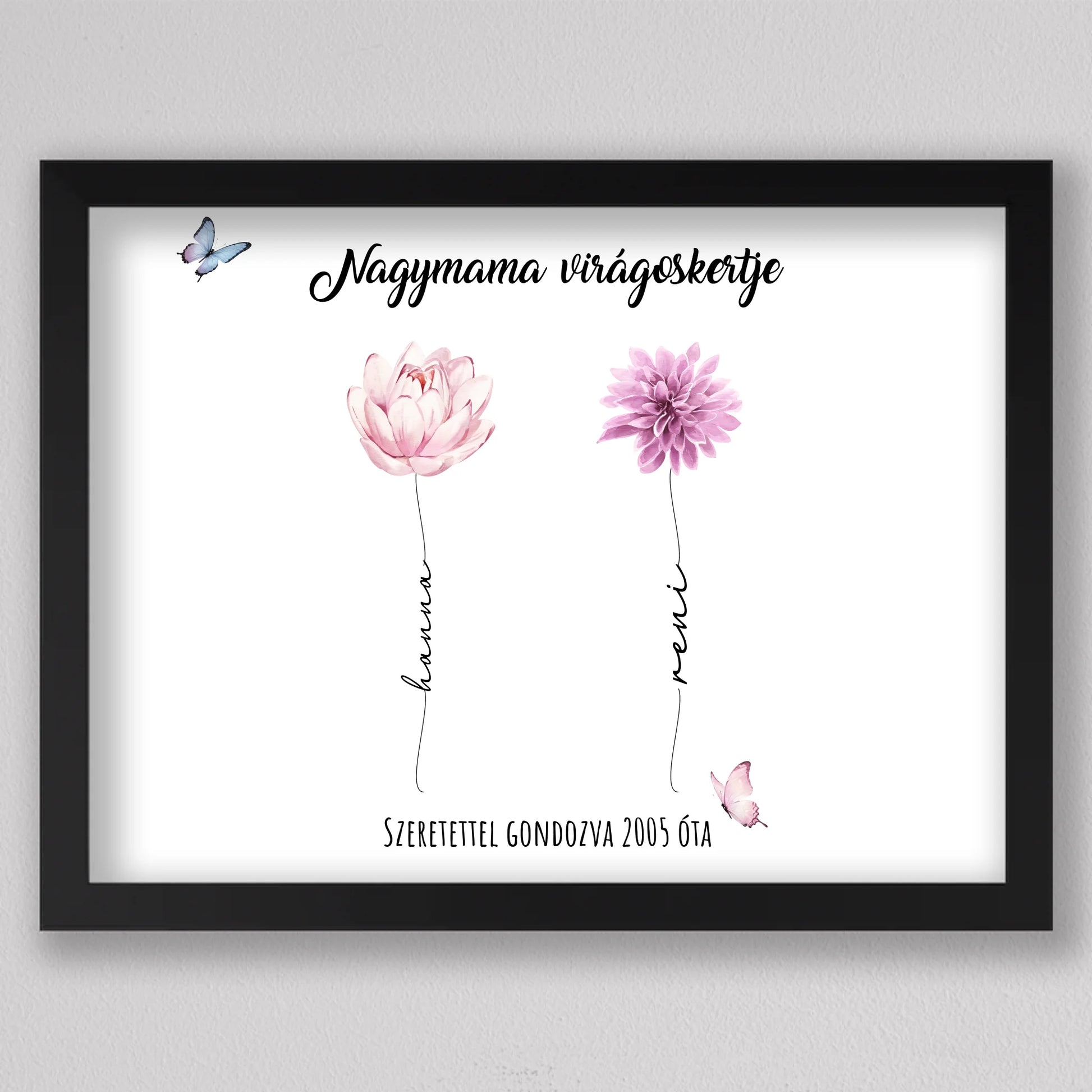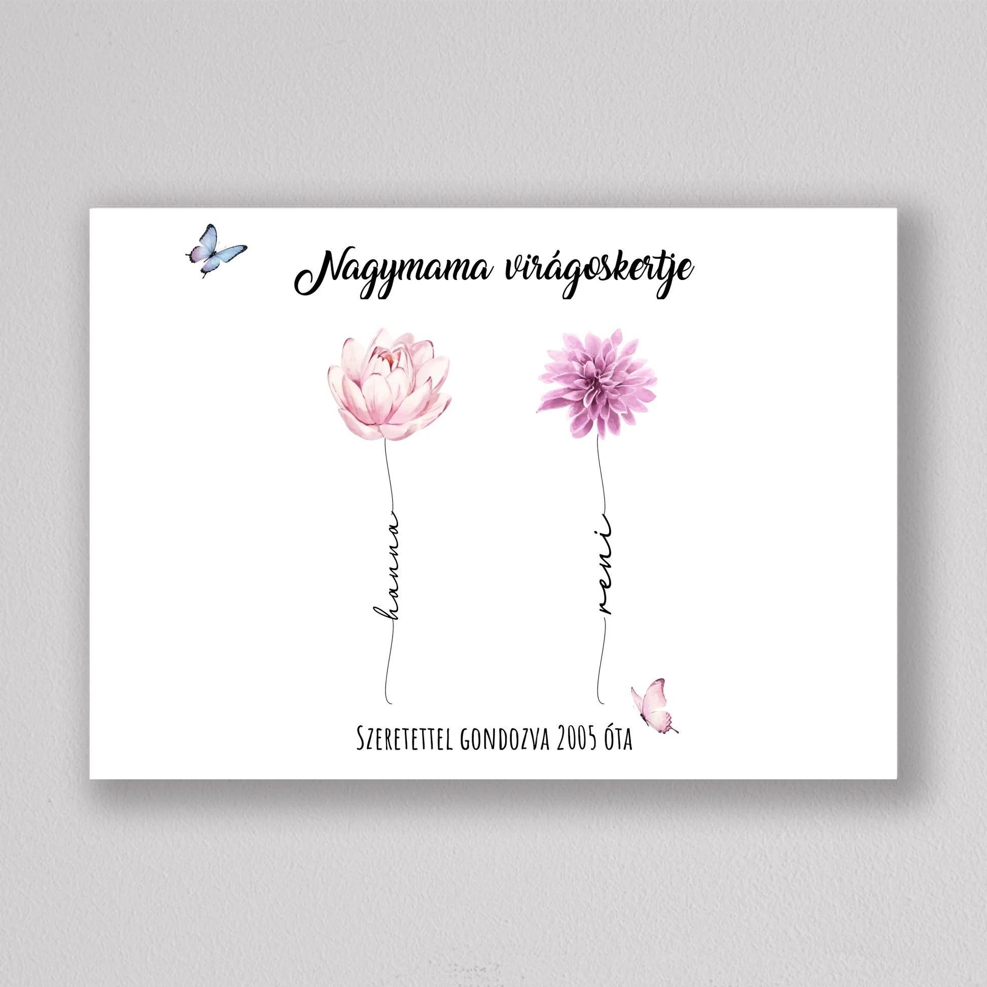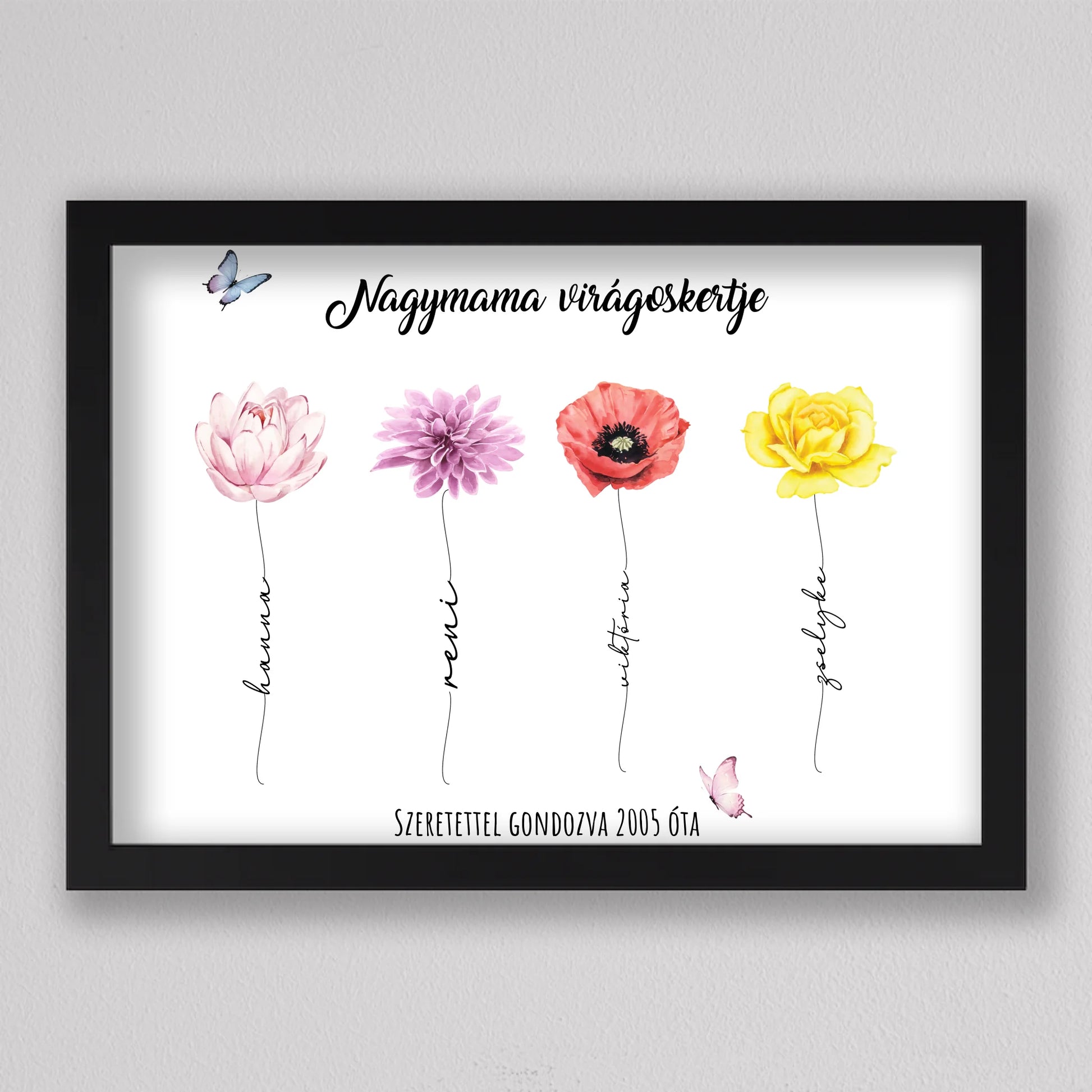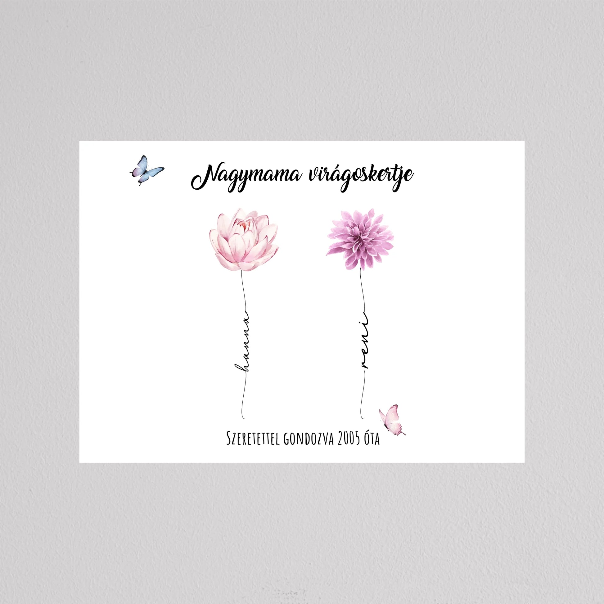 Egy szívhez szóló, személyre szabható illusztráció, amelyben minden virág egy-egy unokát szimbolizál – névvel, stílussal és egyedi jelentéssel. A “Nagymama virágoskertje” tökéletes ajándék anyák napjára, születésnapra vagy bármilyen alkalomra, amikor szeretnél mély érzelmi kötődést kifejezni. A háttér és a virágok is variálhatók, így teljesen az ajándékozottra szabható. Letisztult, esztétikus dizájnja elegánsan illik bármely enteriőrbe, különösen, ha prémium keretben kérik. Ez az illusztráció nem csupán dekoráció, hanem örök emlék, amit a nagymama büszkén helyez el otthona legmelegebb pontján.