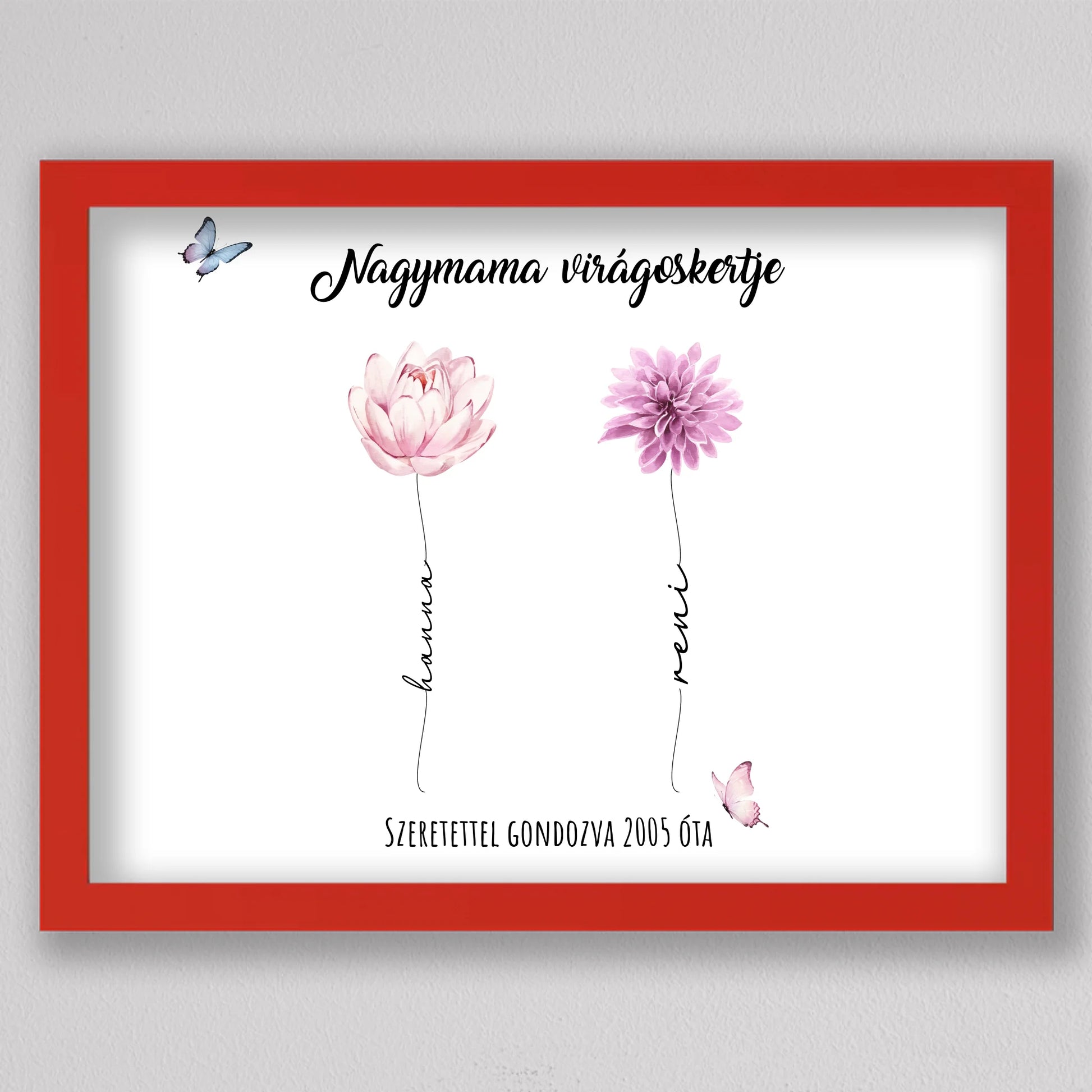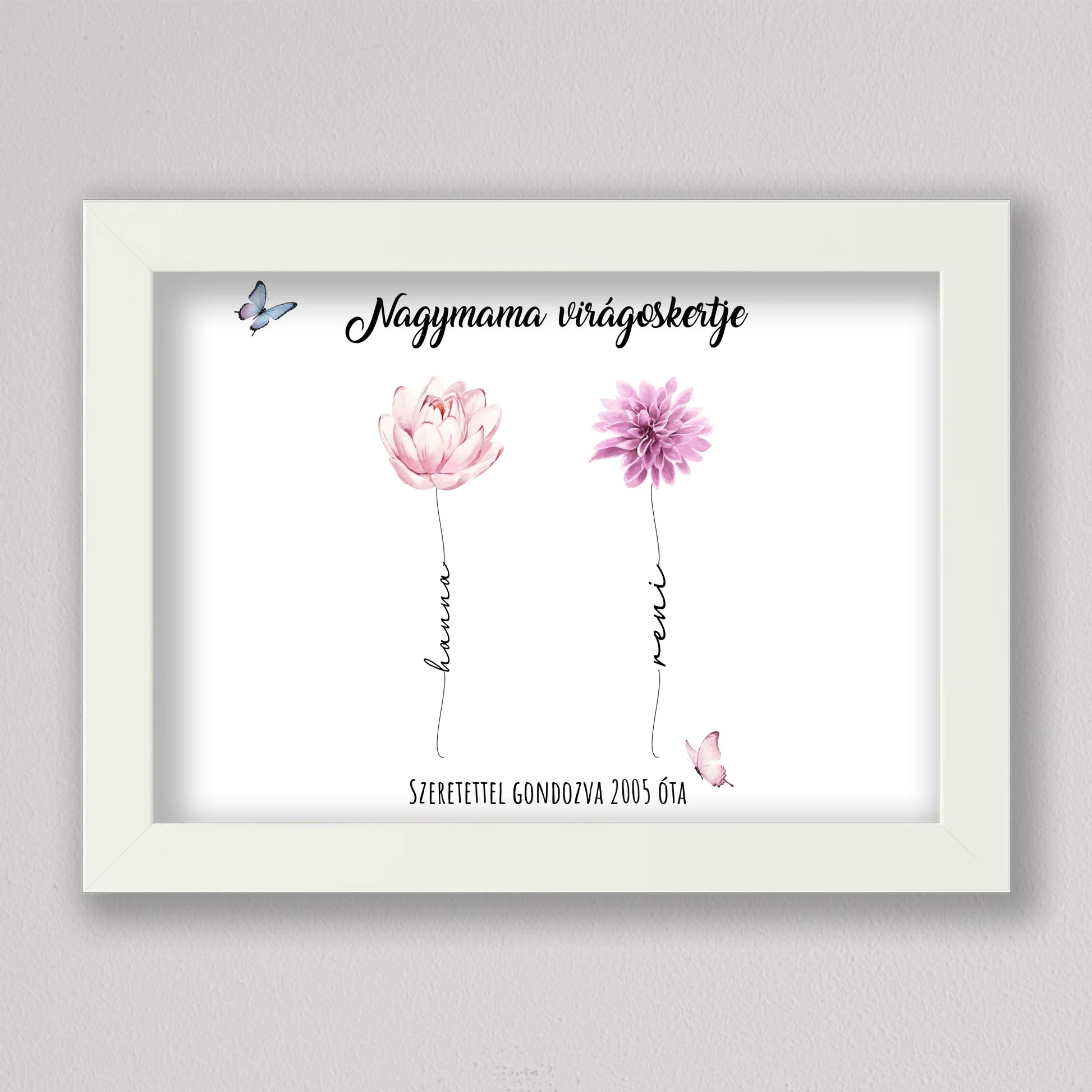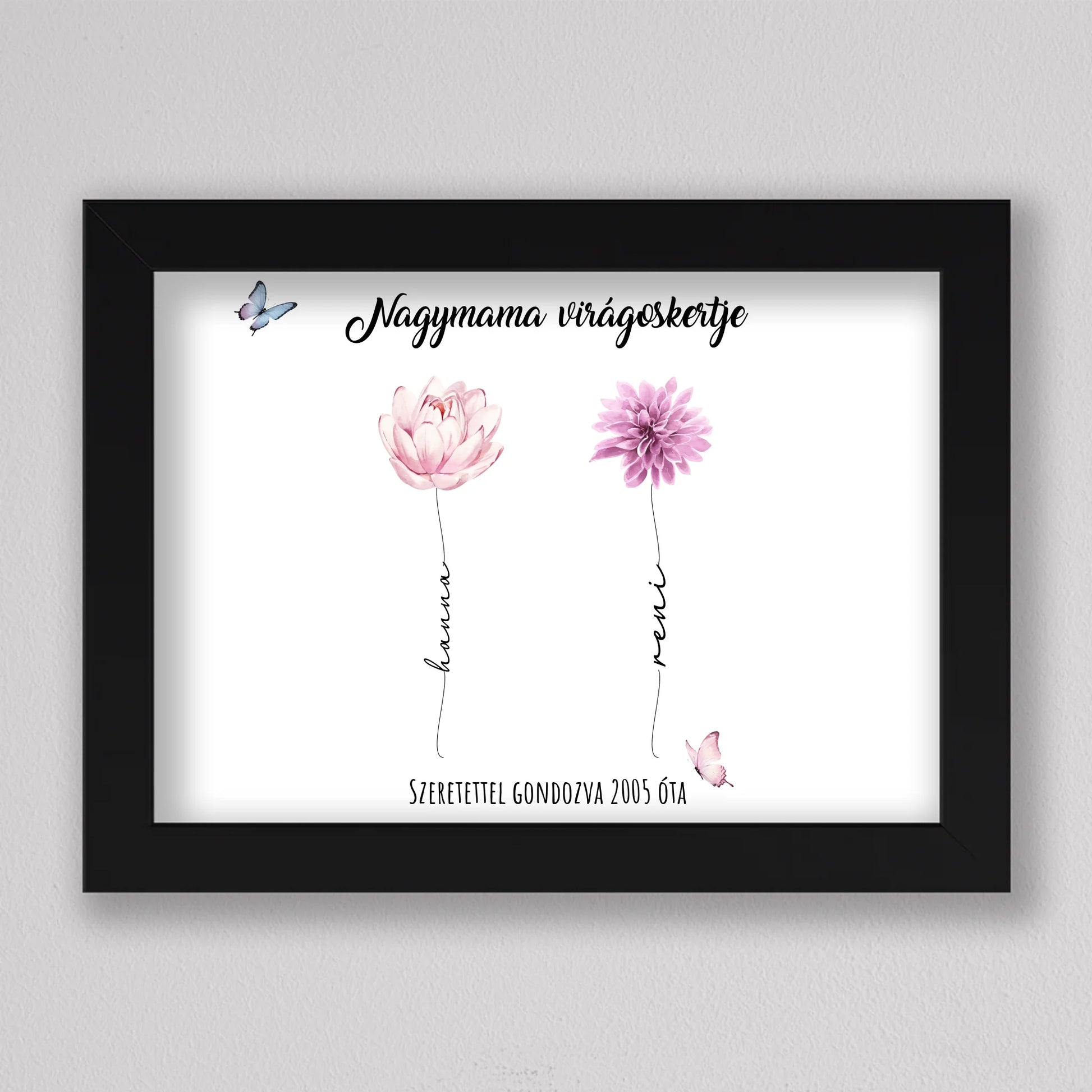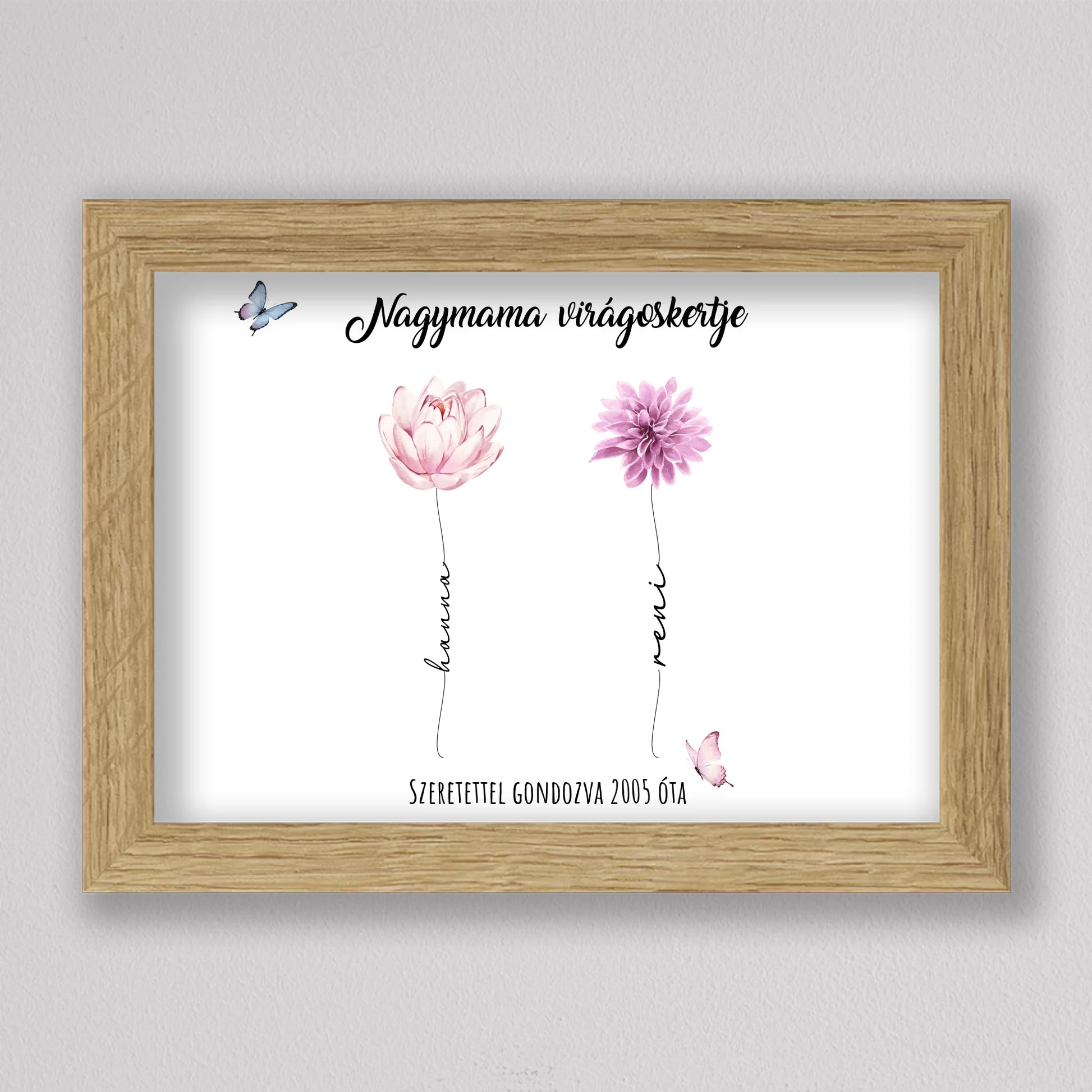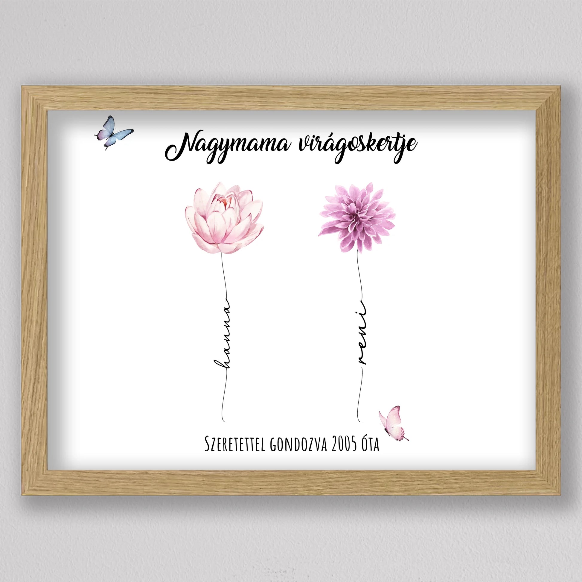 Egy szívhez szóló, személyre szabható illusztráció, amelyben minden virág egy-egy unokát szimbolizál – névvel, stílussal és egyedi jelentéssel. A “Nagymama virágoskertje” tökéletes ajándék anyák napjára, születésnapra vagy bármilyen alkalomra, amikor szeretnél mély érzelmi kötődést kifejezni. A háttér és a virágok is variálhatók, így teljesen az ajándékozottra szabható. Letisztult, esztétikus dizájnja elegánsan illik bármely enteriőrbe, különösen, ha prémium keretben kérik. Ez az illusztráció nem csupán dekoráció, hanem örök emlék, amit a nagymama büszkén helyez el otthona legmelegebb pontján.