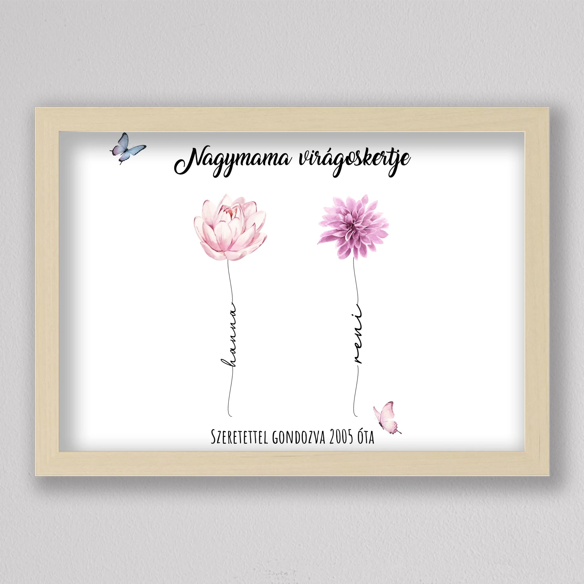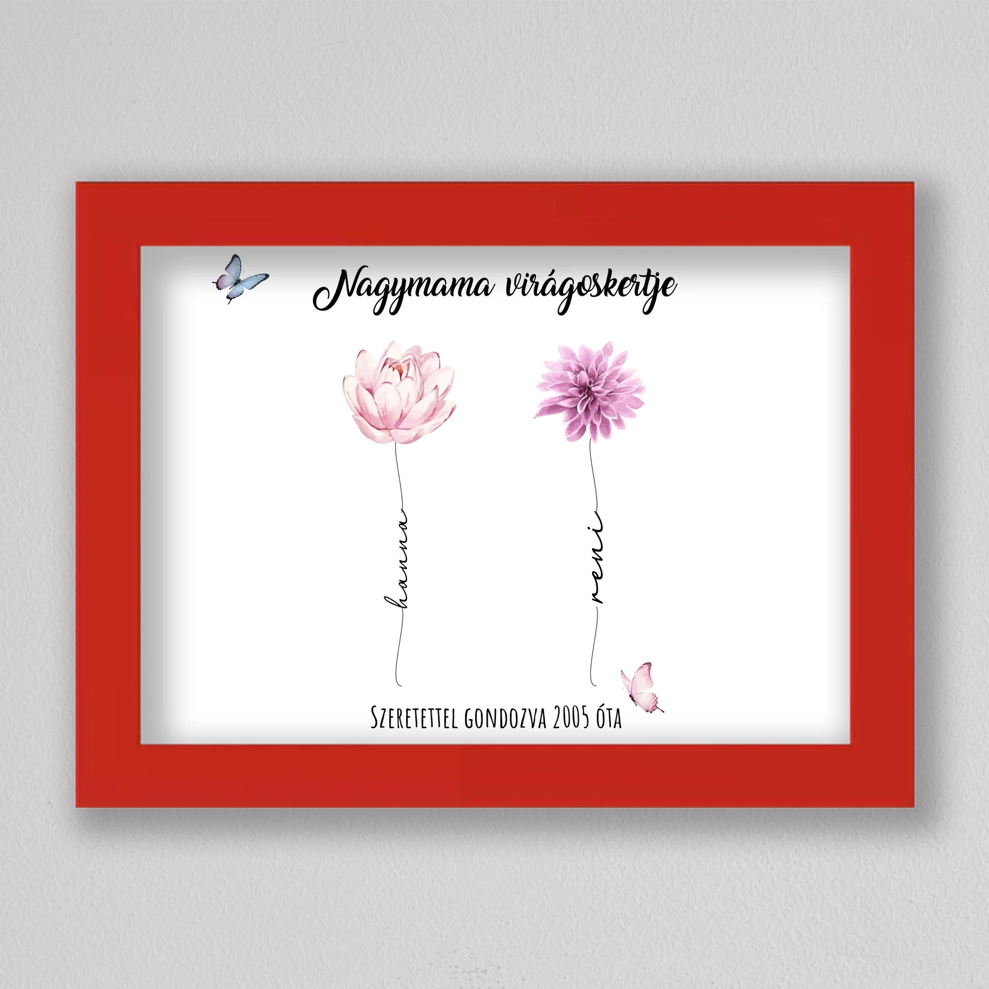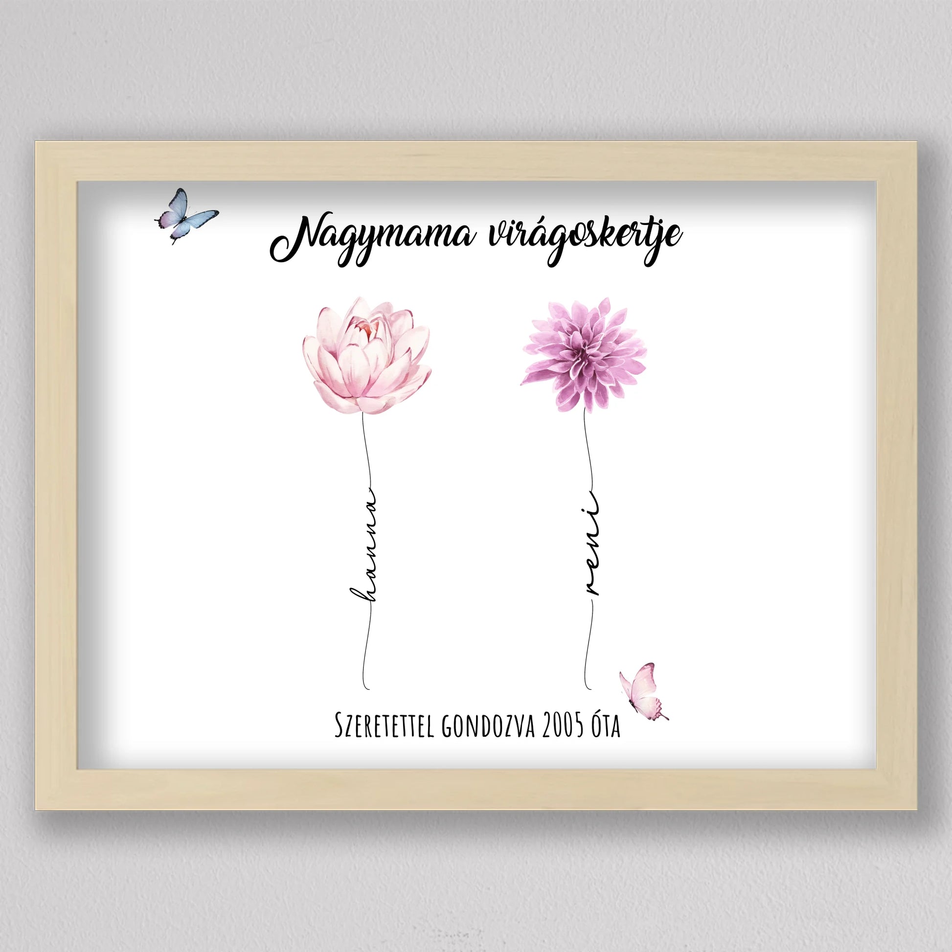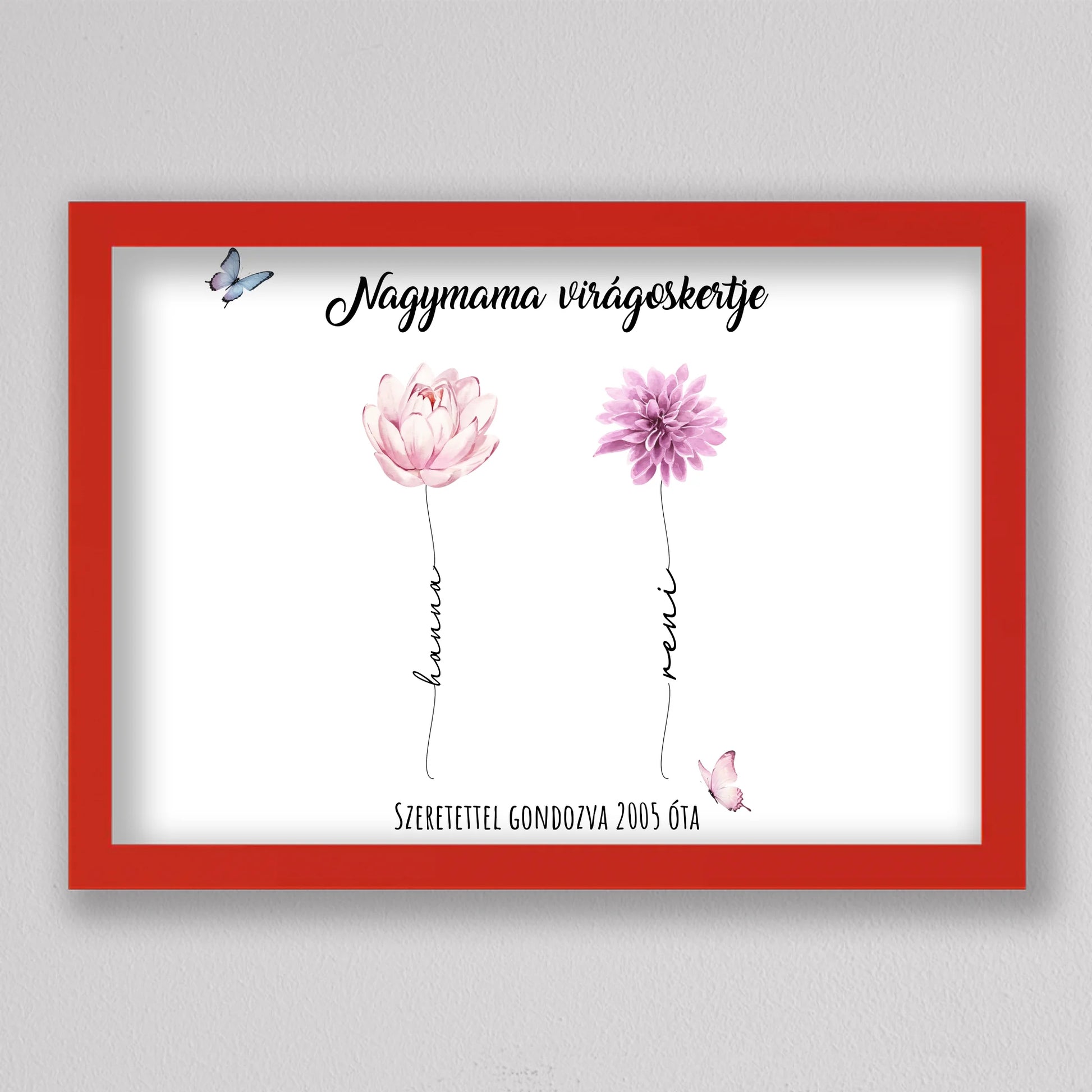 Egy szívhez szóló, személyre szabható illusztráció, amelyben minden virág egy-egy unokát szimbolizál – névvel, stílussal és egyedi jelentéssel. A “Nagymama virágoskertje” tökéletes ajándék anyák napjára, születésnapra vagy bármilyen alkalomra, amikor szeretnél mély érzelmi kötődést kifejezni. A háttér és a virágok is variálhatók, így teljesen az ajándékozottra szabható. Letisztult, esztétikus dizájnja elegánsan illik bármely enteriőrbe, különösen, ha prémium keretben kérik. Ez az illusztráció nem csupán dekoráció, hanem örök emlék, amit a nagymama büszkén helyez el otthona legmelegebb pontján.