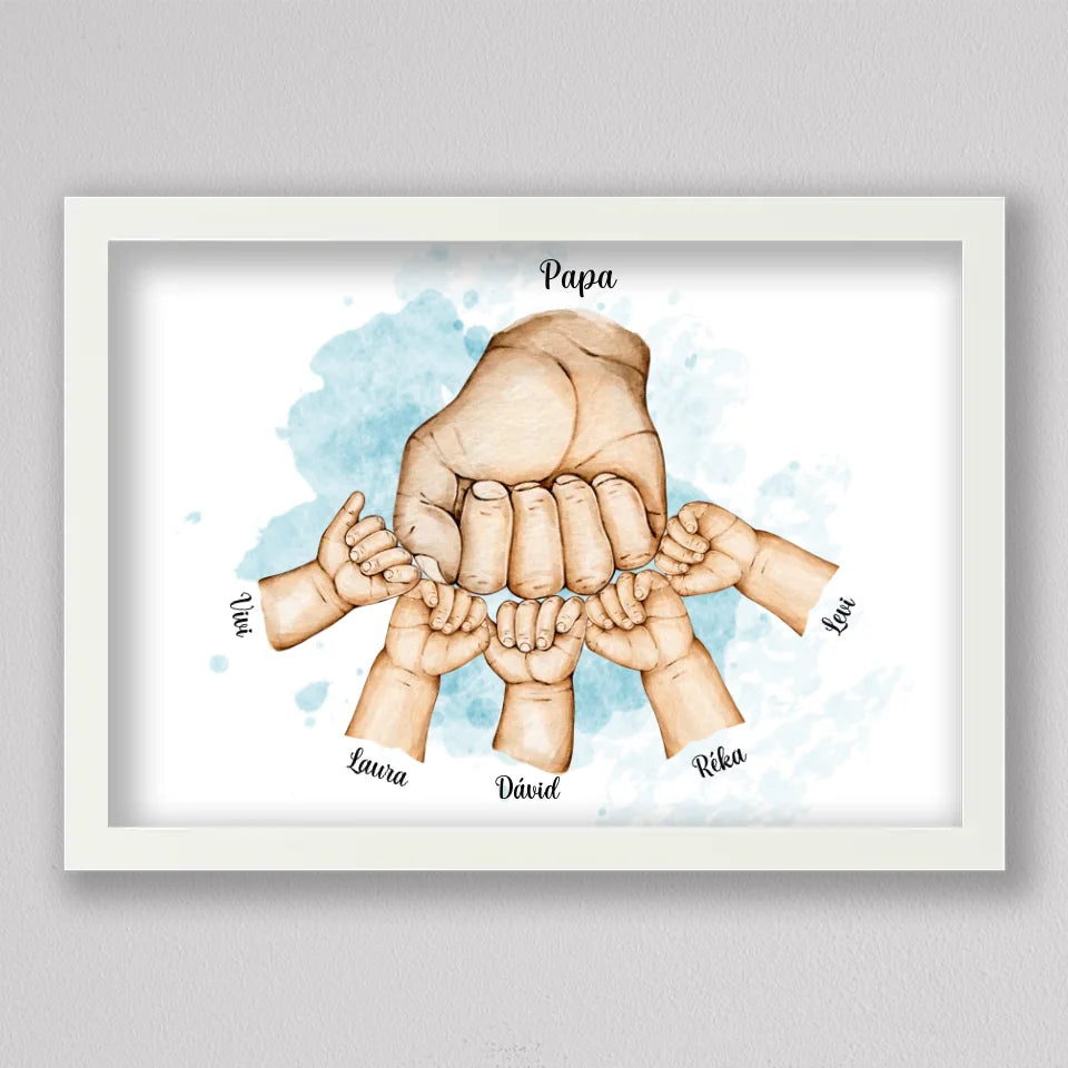A Nagypapa és Gyerekek Családi Kéz Illusztráció egy szívmelengető és egyedi ajándék, amely tökéletesen kifejezi a nagypapa és az unokák közötti különleges kapcsolatot. Ez a kézzel festett hatású illusztráció személyre szabható, így minden gyermek neve megjeleníthető a képen, amit egyedi ajándékká varázsol bármely családi eseményre, legyen az születésnap, névnap, vagy akár karácsony. A letisztult, modern dizájn lehetővé teszi, hogy az illusztráció bármilyen otthonba stílusosan illeszkedjen, és örök emlék maradjon. Prémium minőségű nyomtatással és különleges figyelemmel készült, így biztosítva, hogy egy olyan ajándékot adhass át, amely hosszú évekig emlékezetes marad.