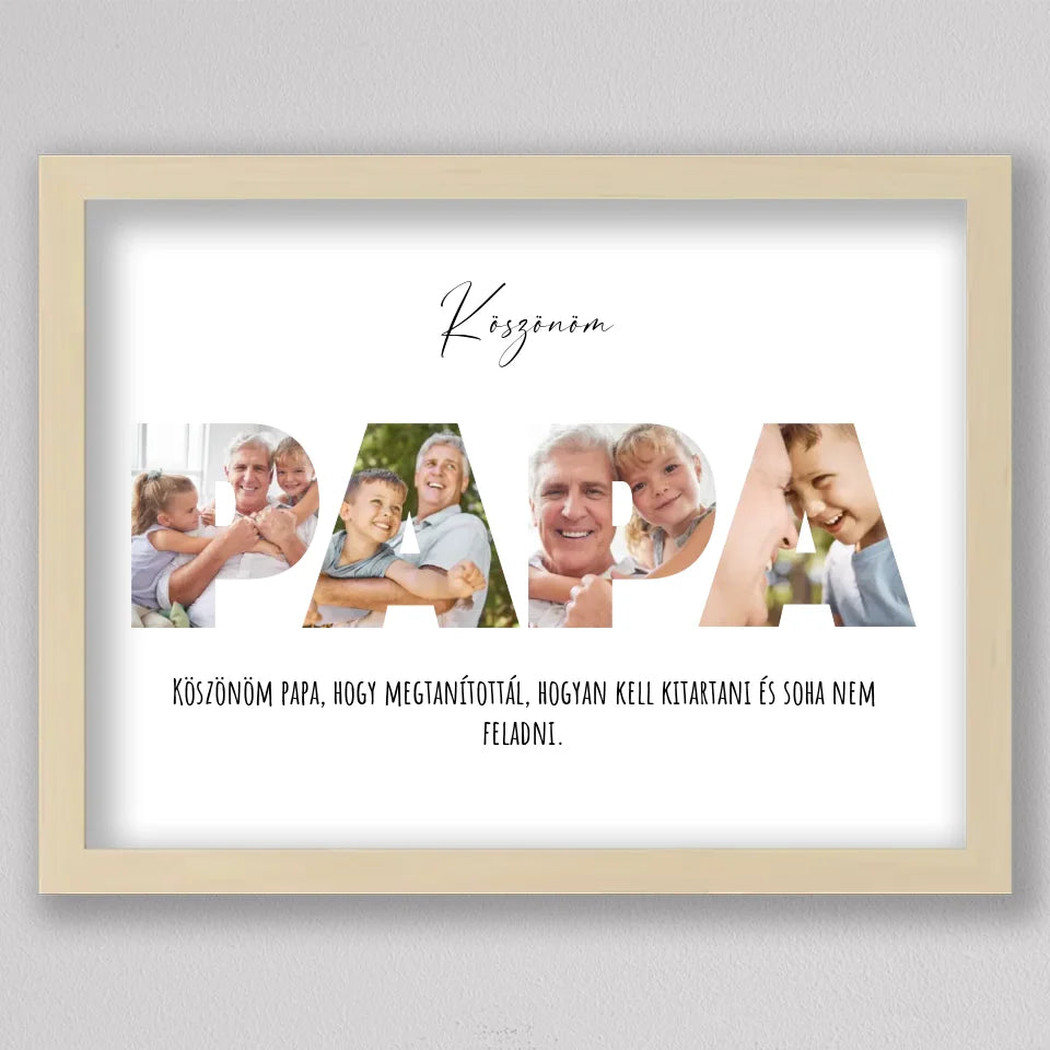A PAPA feliratú fotó kollázs egy megható és személyre szabott ajándék, amely tökéletes választás nagypapáknak bármilyen különleges alkalomra, legyen az apák (papák) napja, születésnap, karácsony vagy más jeles esemény. Az „PAPA” felirat mögött megjelenített fényképek segítségével a legkedvesebb közös pillanatok örökíthetők meg, míg a szívből jövő idézet kifejezi a nagypapával való szeretetteljes és tiszteletteljes kapcsolatot. Ez a magas minőségű, esztétikus akár keretbe foglalt fotó kollázs nem csak egyedi, de emlékezetes dísze is lehet a nagypapa otthonának, amelyet mély érzelmi kötődés tölt meg.