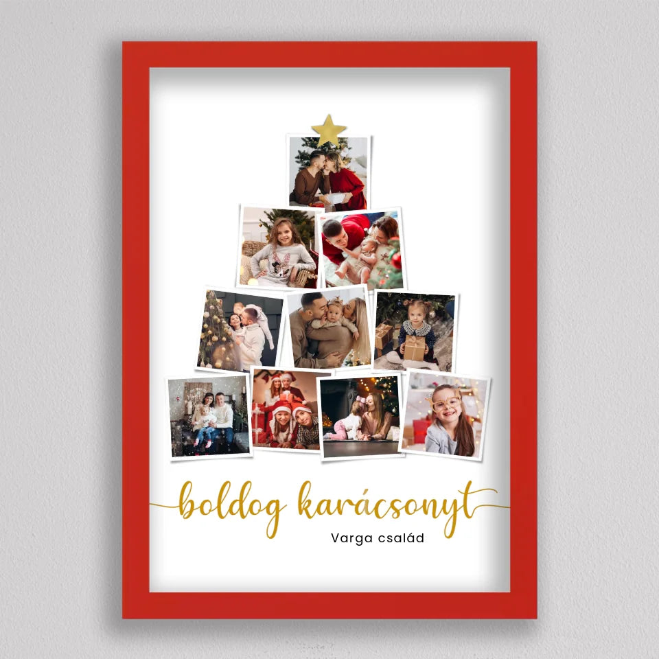 A Polaroid képek karácsonyfa alakú fotó kollázs tökéletes választás azok számára, akik különleges, személyre szabott ünnepi ajándékkal szeretnék meglepni családjukat vagy barátaikat. Ez az egyedi kollázs a meghitt karácsonyi pillanatok emlékét idézi meg, ahol a polaroid hatású képek karácsonyfa formában rendeződnek el, arany csillaggal a tetején. A kollázs lehetőséget nyújt akár több családi fotó elhelyezésére, így minden fontos pillanat megörökíthető. A kép piros keretben érkezik, amely ünnepi megjelenést kölcsönöz neki, és még inkább kiemeli az otthon karácsonyi hangulatát. Ez a különleges dekoráció minden évben újra örömmel tölti majd el a családot, és a lakás központi díszévé válik.