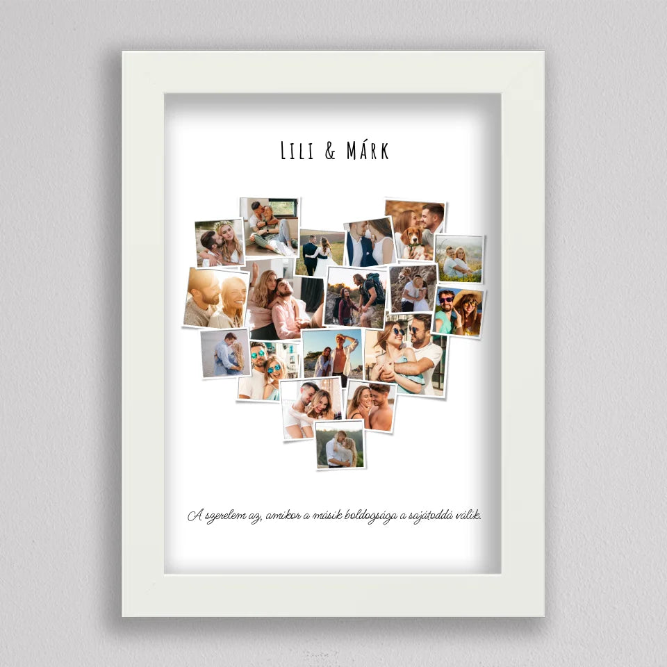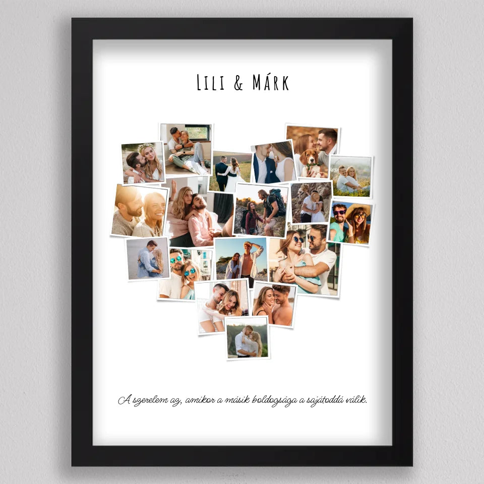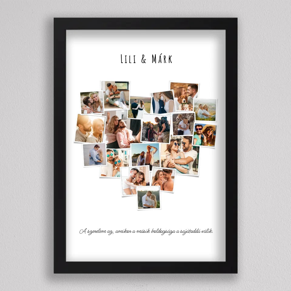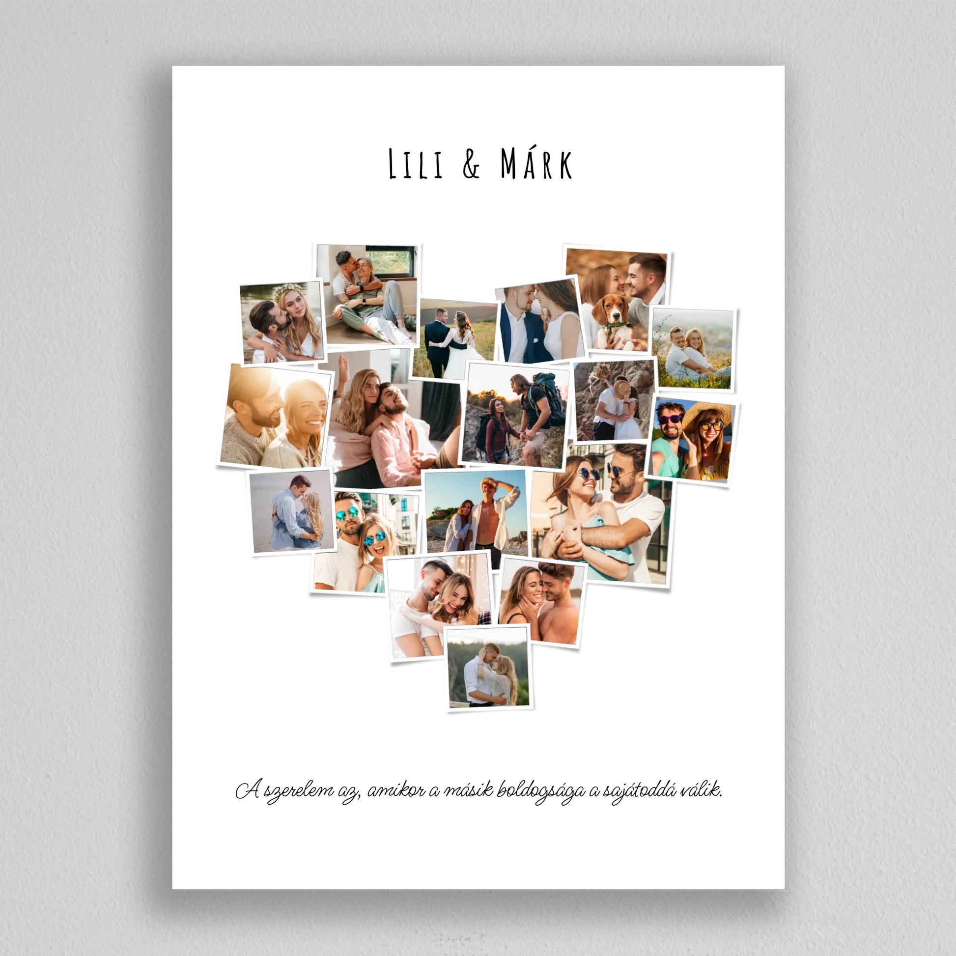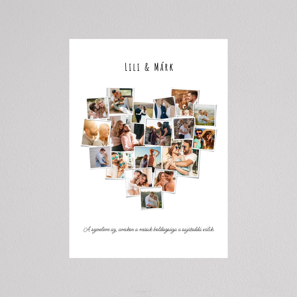 A Polaroid képes szív alakú fotó kollázs egyedi módja annak, hogy szerelmes pillanataitok minden részletét megörökítsétek. Az ikonikus Polaroid-stílusú fotók egy szív formájában rendeződnek, amely szimbolizálja az érzelmi köteléket, és így tökéletes ajándék lehet évfordulóra, születésnapra vagy Valentin-napra. Az egyedi kollázs kialakításnak köszönhetően, minden részlet személyre szabható, a fotóktól egészen az üzenetig, így egy igazán személyes és időtálló dekoráció készíthető. Az esztétikus nyomtatás és prémium minőségű anyagok biztosítják, hogy a kollázs méltó helyet kapjon otthonotok falán. Ideális választás azoknak, akik egy különleges ajándékkal szeretnék kifejezni érzéseiket.