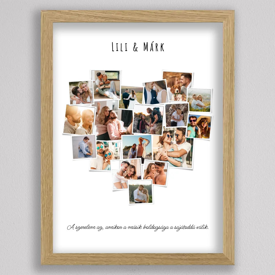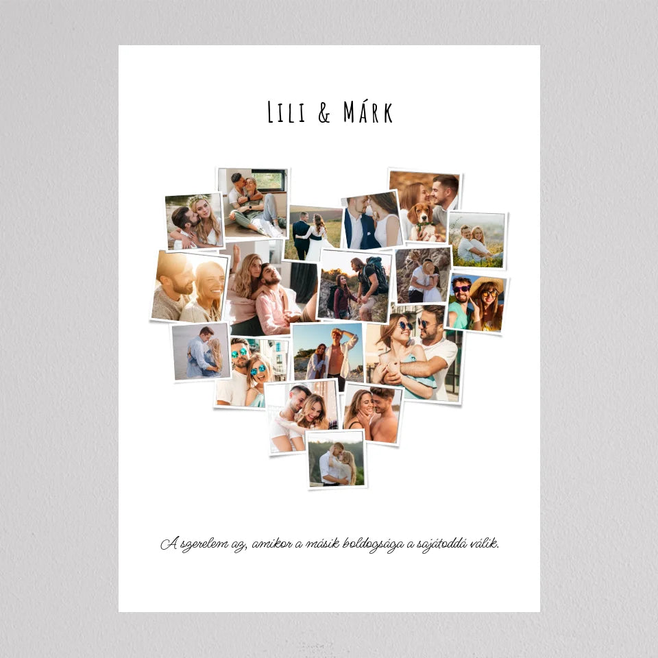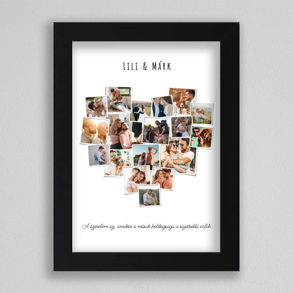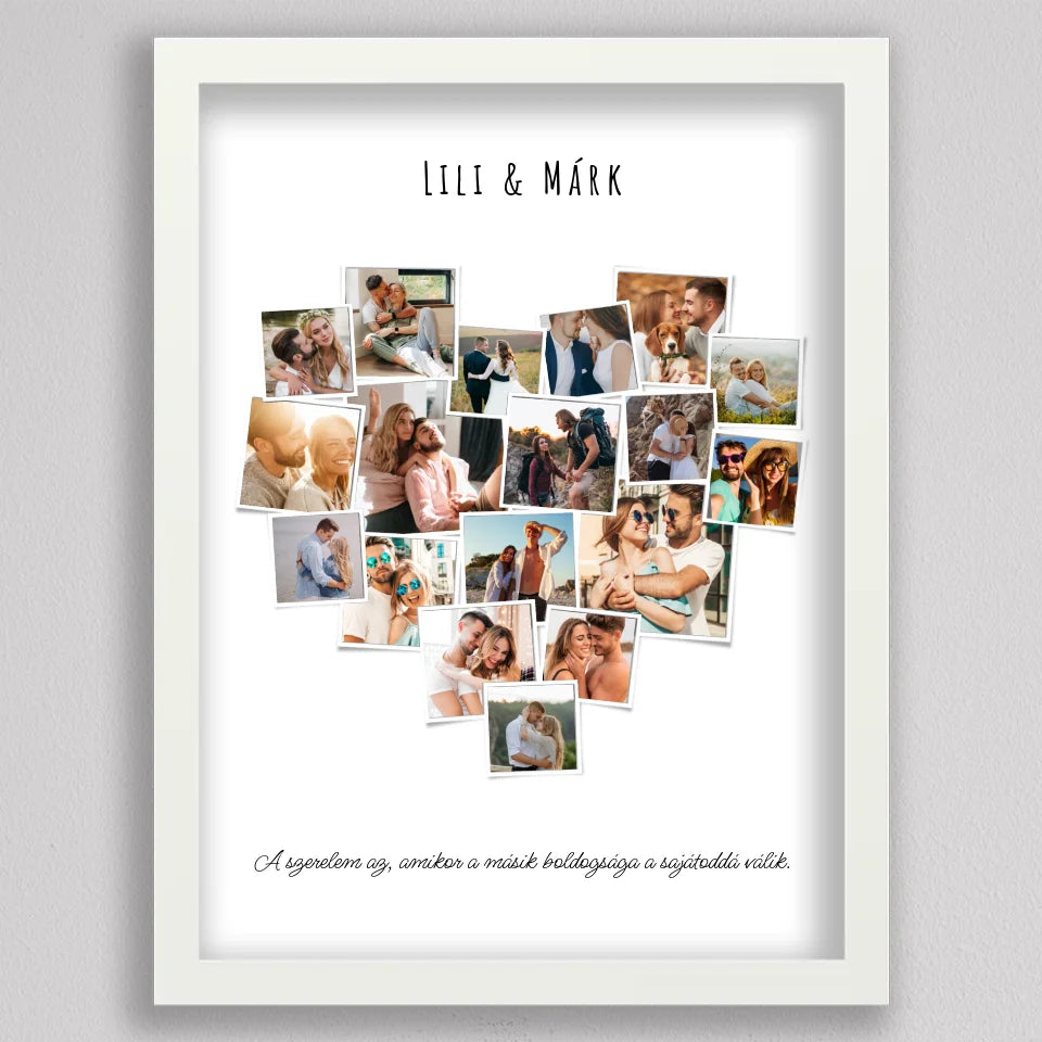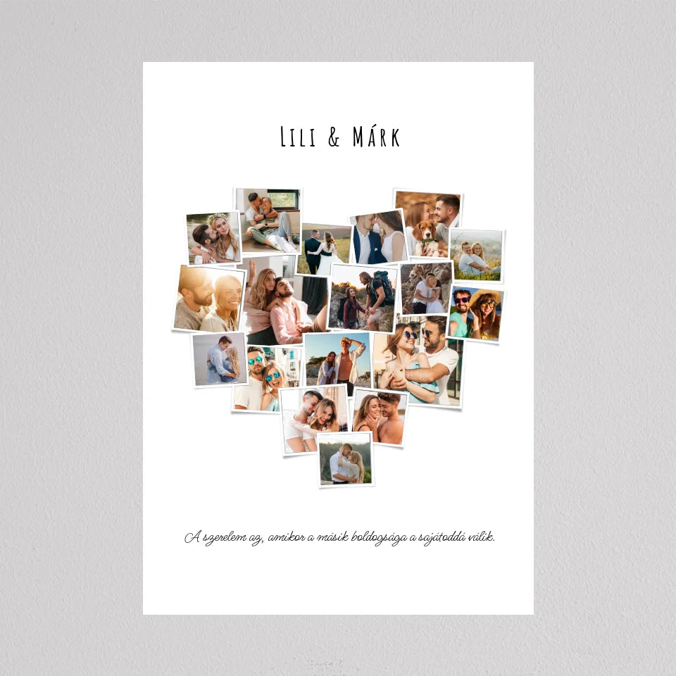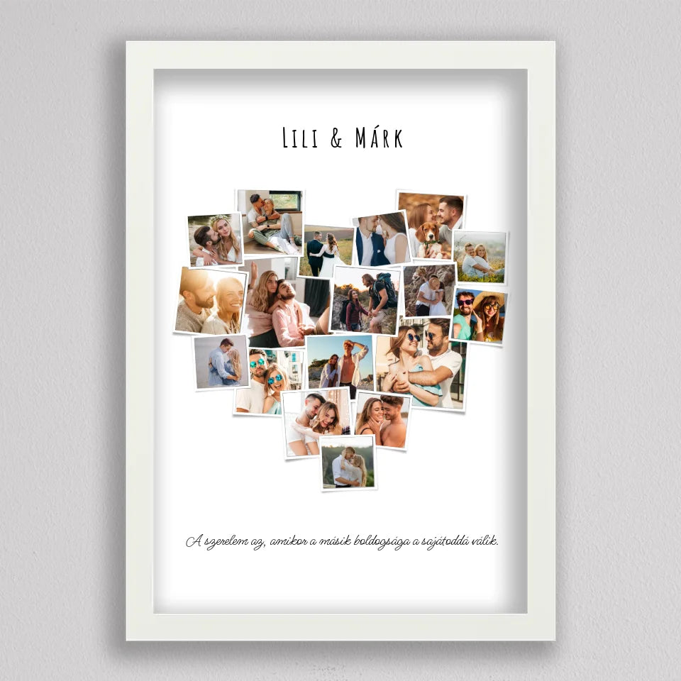 A Polaroid képes szív alakú fotó kollázs egyedi módja annak, hogy szerelmes pillanataitok minden részletét megörökítsétek. Az ikonikus Polaroid-stílusú fotók egy szív formájában rendeződnek, amely szimbolizálja az érzelmi köteléket, és így tökéletes ajándék lehet évfordulóra, születésnapra vagy Valentin-napra. Az egyedi kollázs kialakításnak köszönhetően, minden részlet személyre szabható, a fotóktól egészen az üzenetig, így egy igazán személyes és időtálló dekoráció készíthető. Az esztétikus nyomtatás és prémium minőségű anyagok biztosítják, hogy a kollázs méltó helyet kapjon otthonotok falán. Ideális választás azoknak, akik egy különleges ajándékkal szeretnék kifejezni érzéseiket.