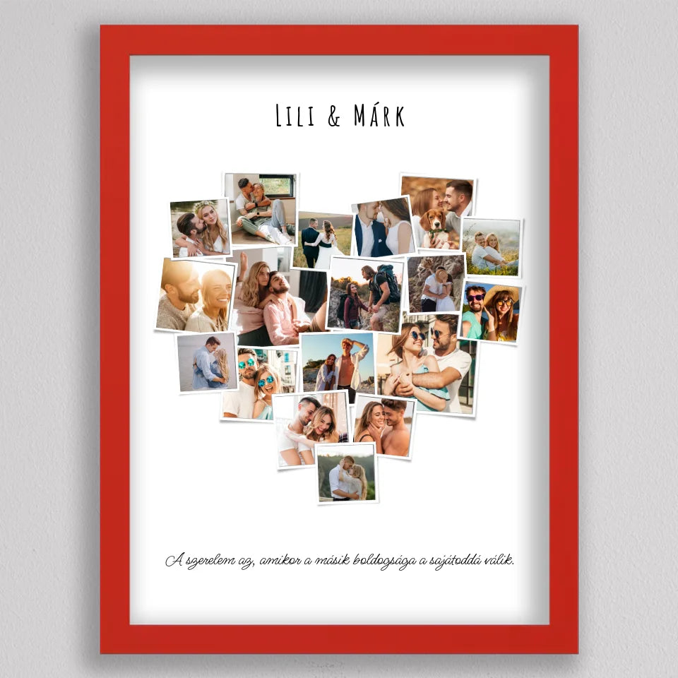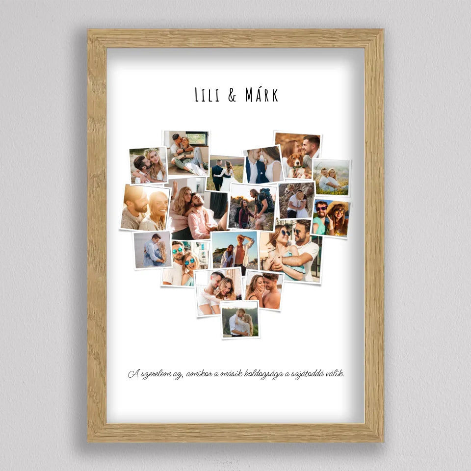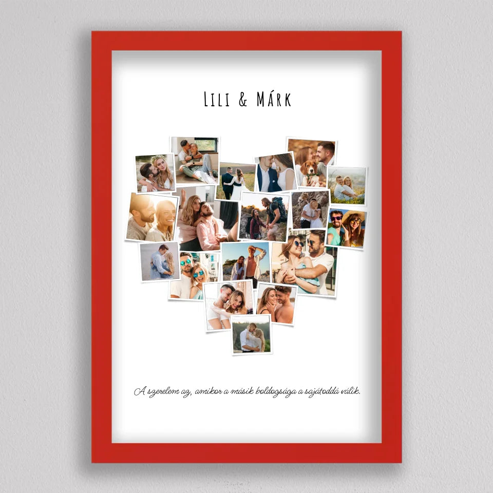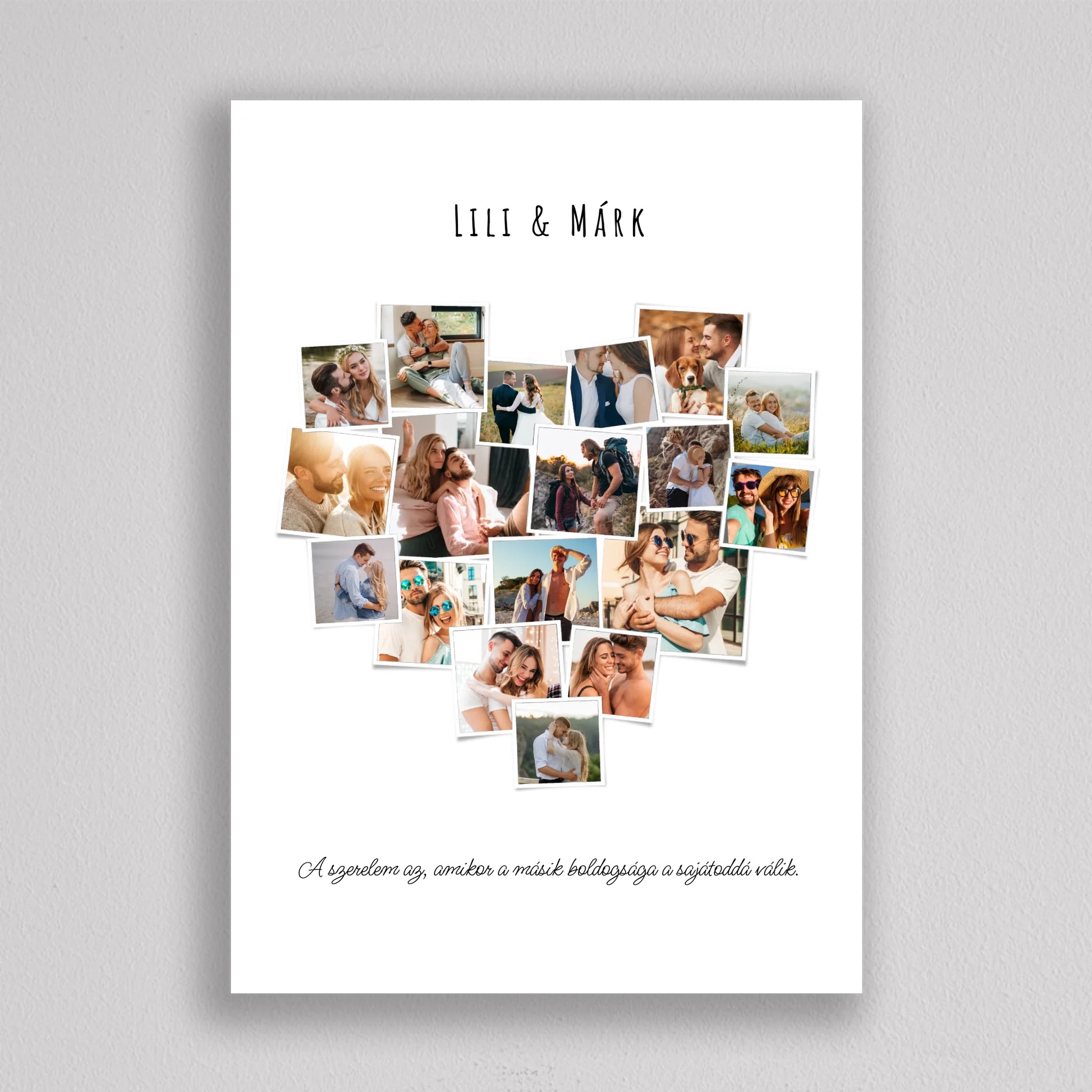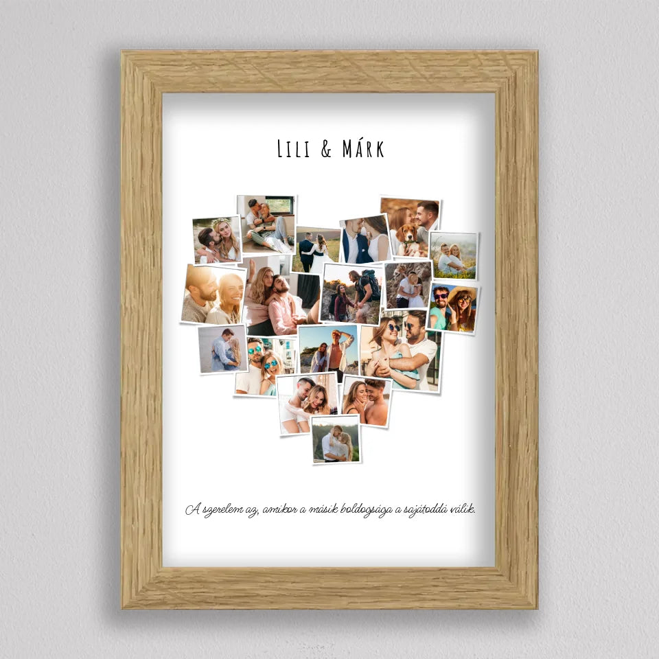 A Polaroid képes szív alakú fotó kollázs egyedi módja annak, hogy szerelmes pillanataitok minden részletét megörökítsétek. Az ikonikus Polaroid-stílusú fotók egy szív formájában rendeződnek, amely szimbolizálja az érzelmi köteléket, és így tökéletes ajándék lehet évfordulóra, születésnapra vagy Valentin-napra. Az egyedi kollázs kialakításnak köszönhetően, minden részlet személyre szabható, a fotóktól egészen az üzenetig, így egy igazán személyes és időtálló dekoráció készíthető. Az esztétikus nyomtatás és prémium minőségű anyagok biztosítják, hogy a kollázs méltó helyet kapjon otthonotok falán. Ideális választás azoknak, akik egy különleges ajándékkal szeretnék kifejezni érzéseiket.