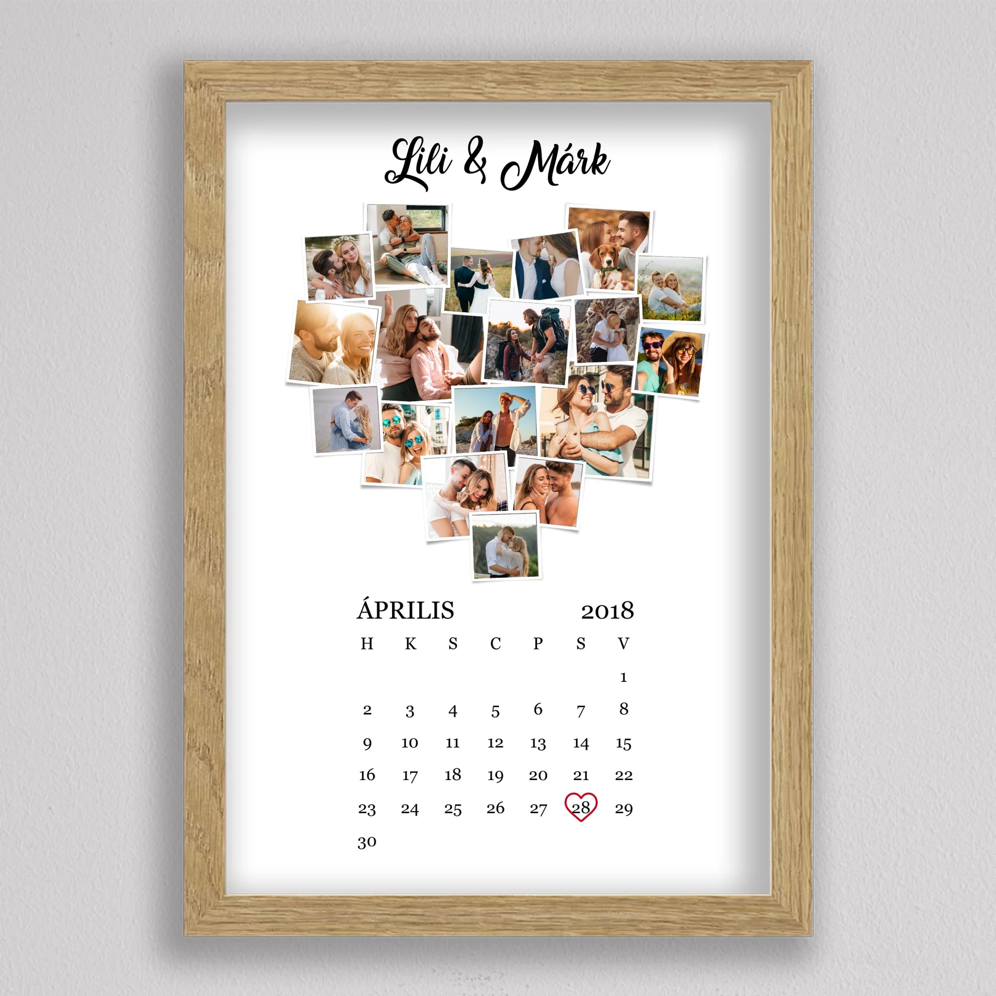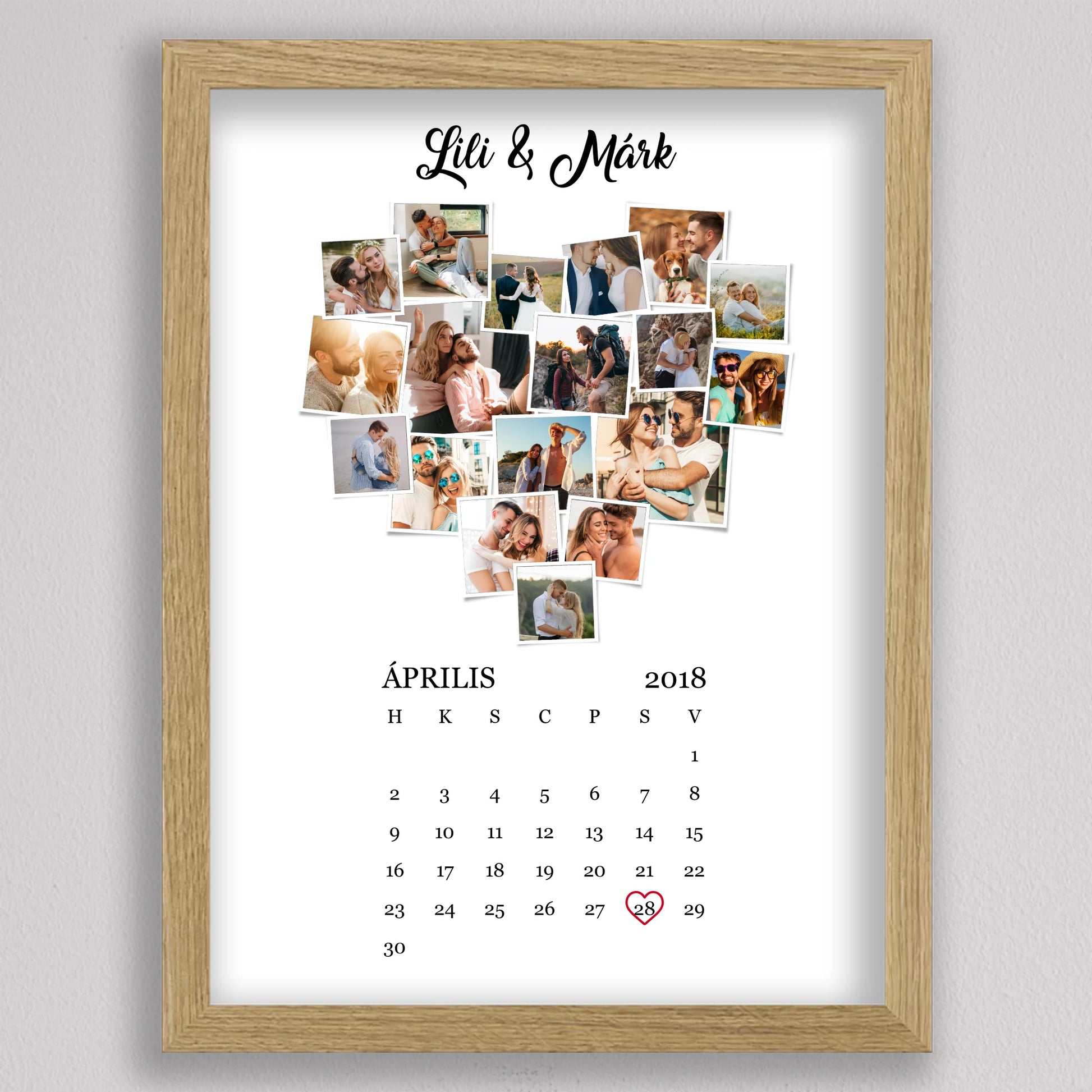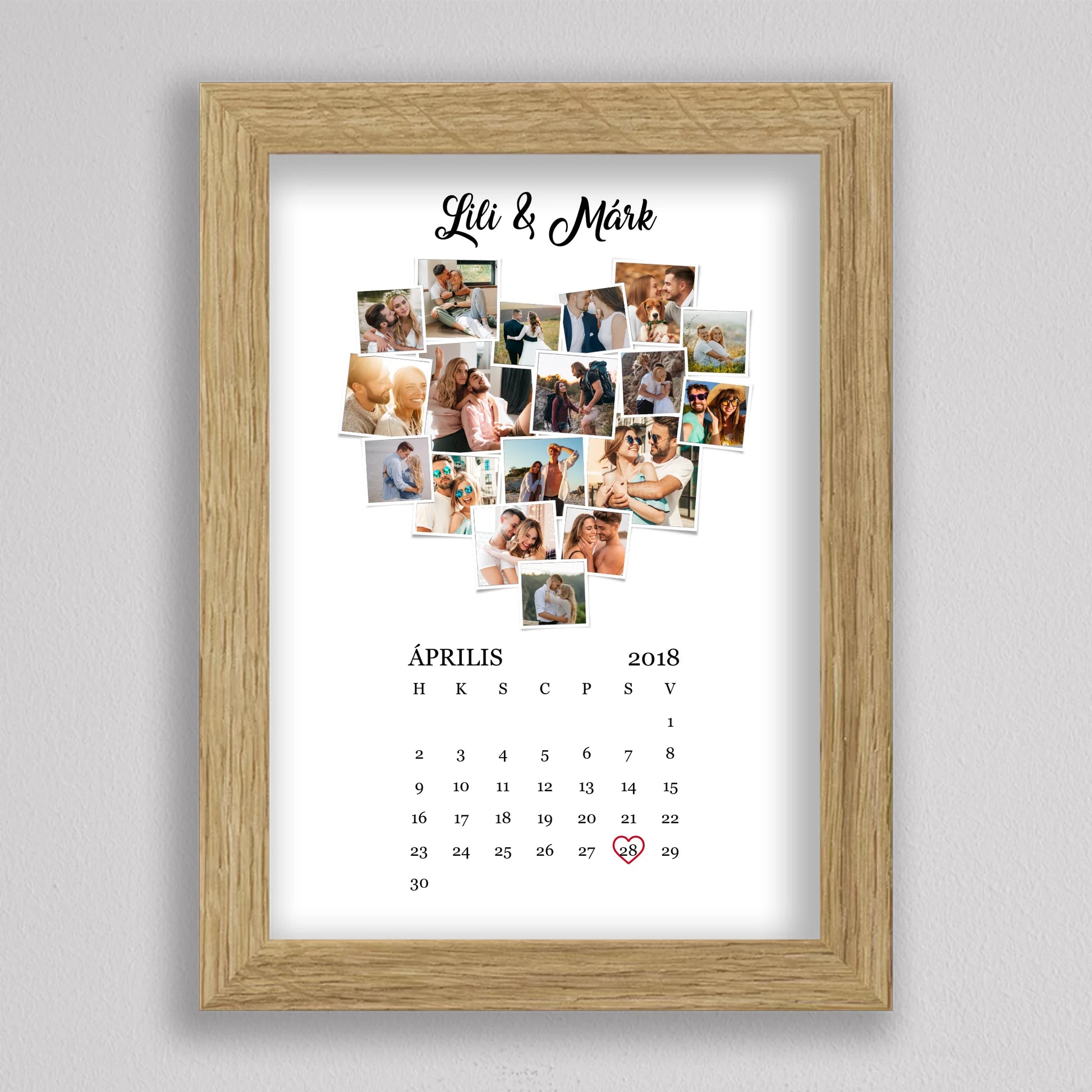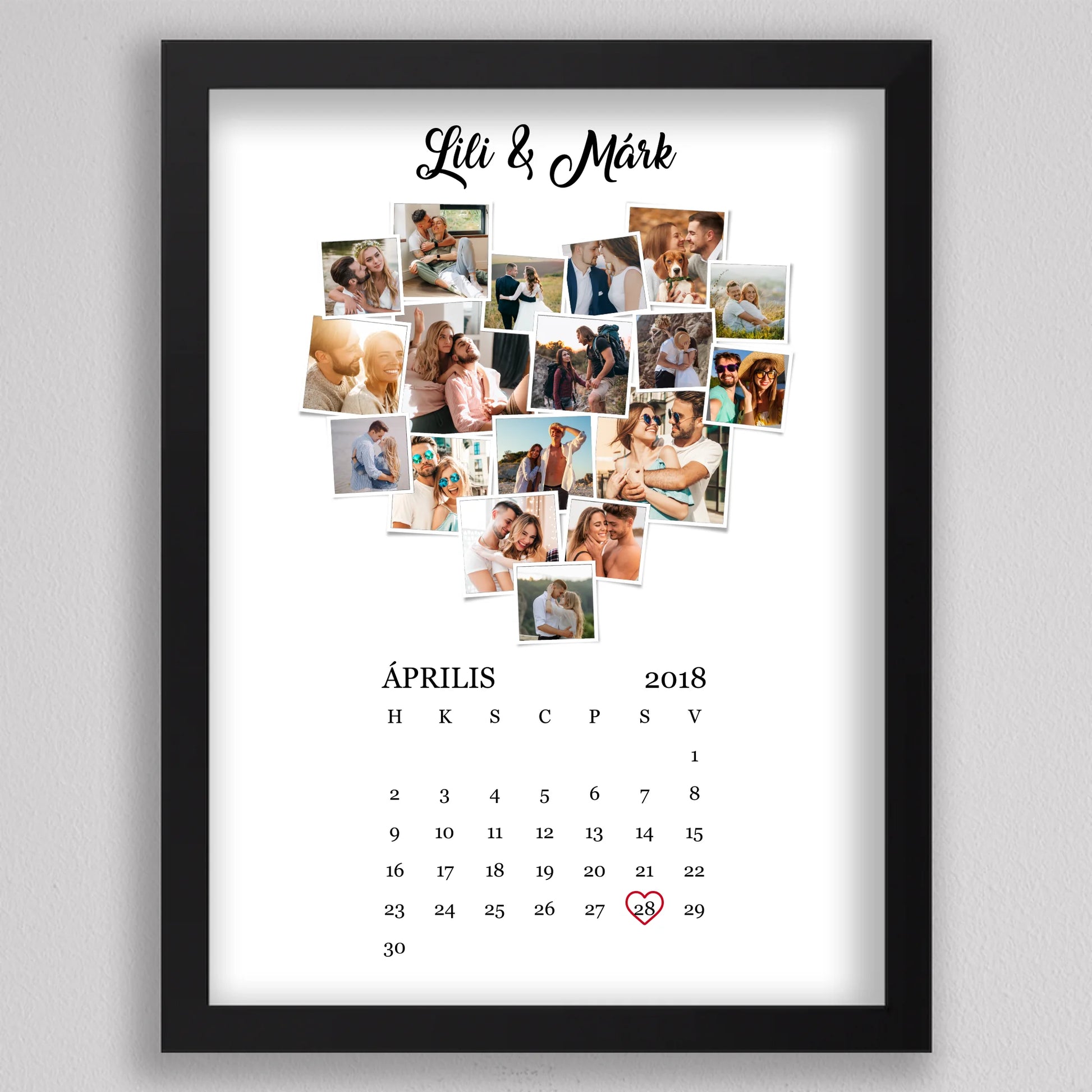 A Szerelmes emlékek naptárral – Polaroid stílusban egy különleges, szív alakú fotókollázs, amelyben életetek legmeghatóbb pillanatai elevenednek meg. A vintage hatású polaroid képek játékos, mégis elegáns megjelenést kölcsönöznek a poszternek, amelyet nevetekkel és egy fontos dátummal – például évfordulótokkal – személyre szabva készítünk el. A letisztult naptárrészlet egy szívecskével jelöli meg azt a napot, ami örökre összeköt benneteket. Tökéletes ajándék lehet szerelmeseknek évfordulóra, Valentin-napra vagy esküvői meglepetésként. Dekoratív, időtálló és érzelmileg gazdag alkotás, ami bármely otthon dísze lehet.